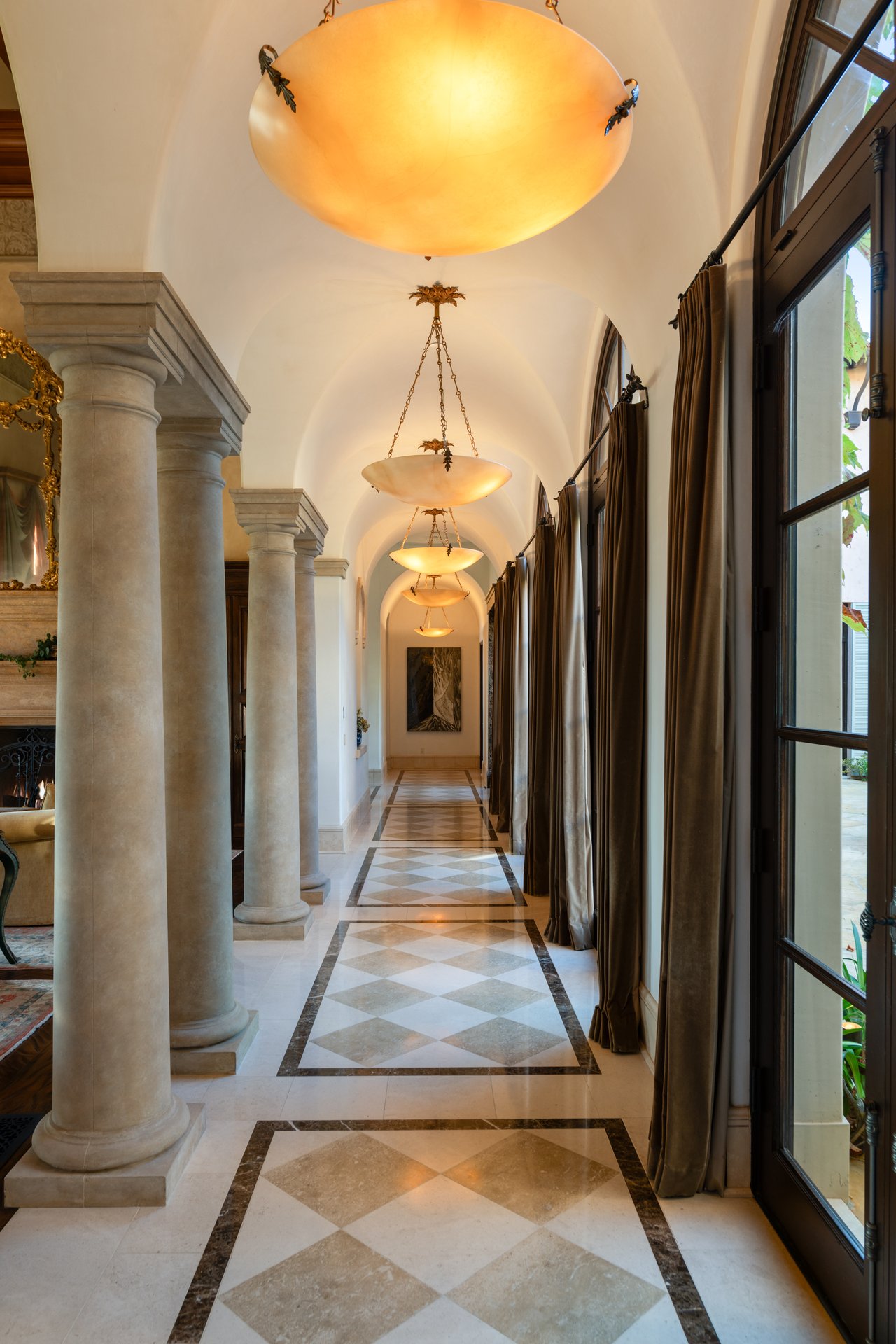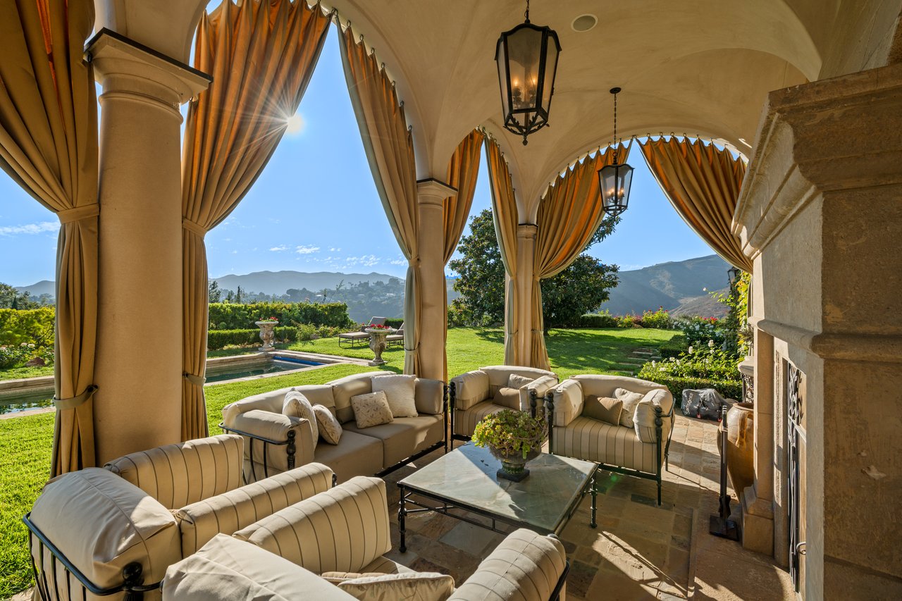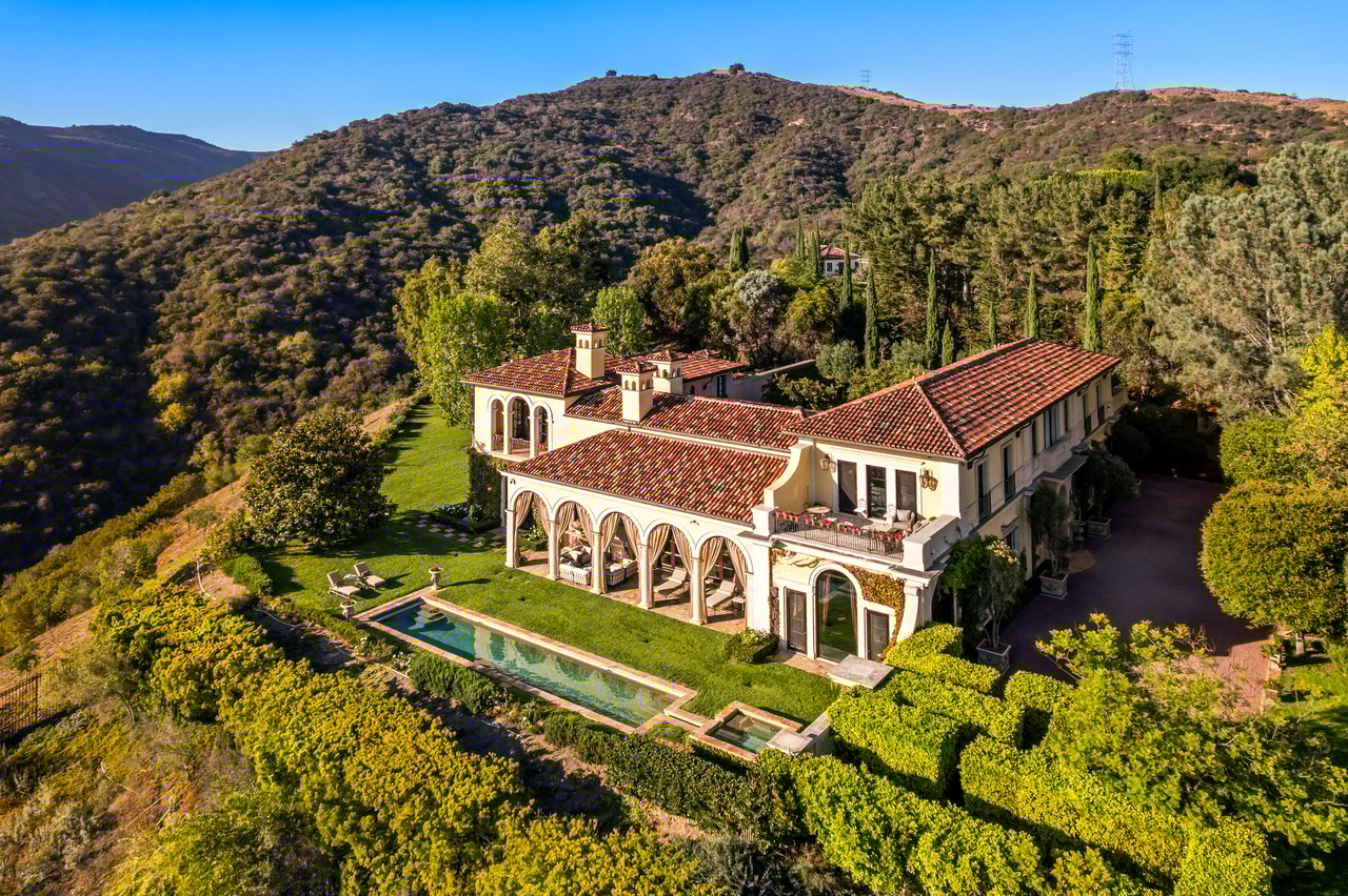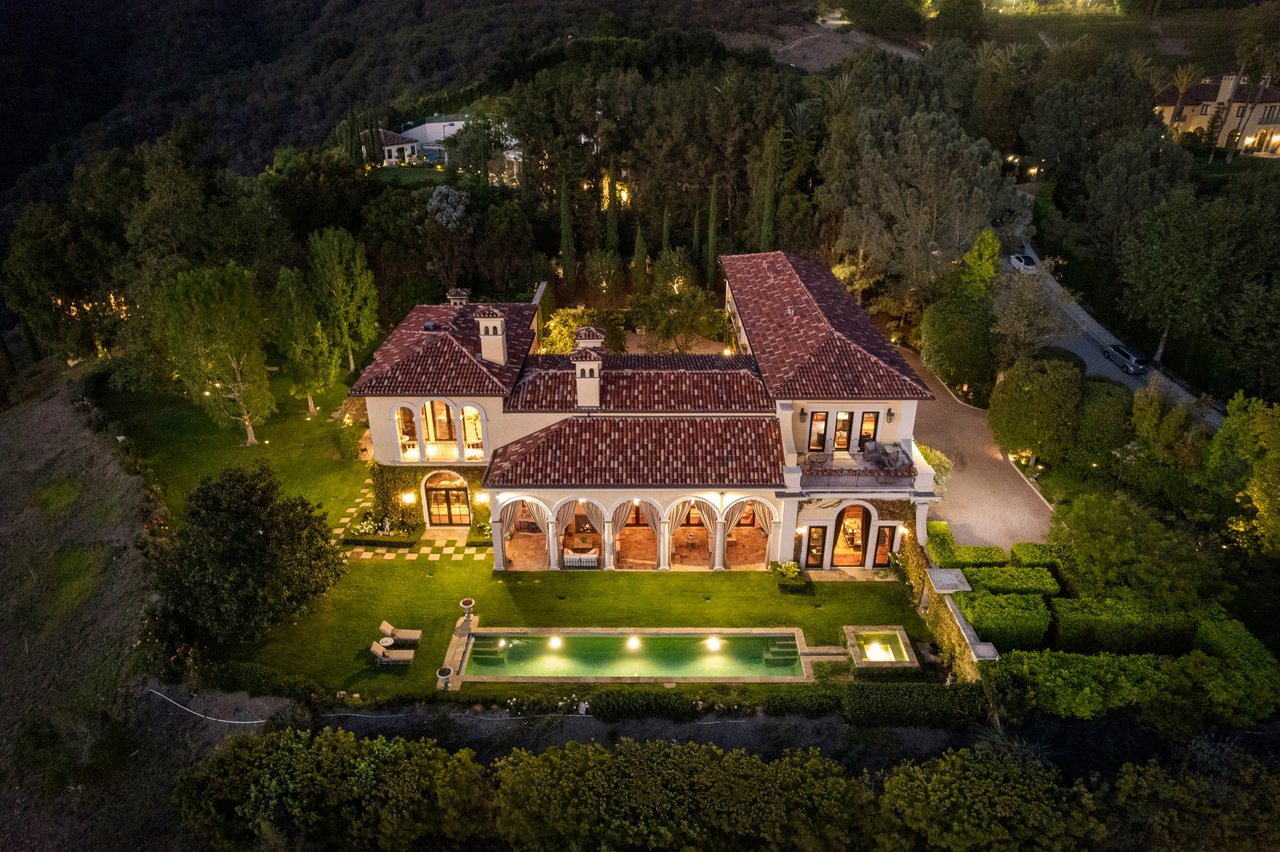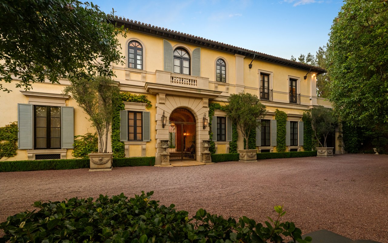 Set within the ultra-exclusive enclave of Brentwood Country Estates, a guard-gated community of just thirteen residences celebrated for 24/7 security, privacy, and sweeping vistas, this remarkable estate evokes the timeless romance of a European chateau. Encompassing approximately 9,400 square feet of living space on an expansive 6.13 acre lot, the property offers a rare combination of seclusion, scale, and architectural elegance. A private gate opens to a stately gravel motor court, instantly transporting you to the Tuscan countryside. Beyond an arched entry, a central courtyard unfolds, where vined walls, manicured gardens, a serene fountain, and flagstone pathways create an atmosphere of refined tranquility. Inside, the residence reveals exceptional craftsmanship throughout, featuring intricate marble floors, soaring ceilings, and the classic proportions of a true European manor. A dramatic two-story formal living room with stone fireplace and coffered, beamed ceilings flows seamlessly into an elegant formal dining room. The chef's country kitchen is anchored by a substantial center island, professional-grade appliances, and opens to both a charming breakfast room and an inviting family room with fireplace. A richly appointed wood-paneled office and library, two powder rooms, a guest suite, a generous playroom or bonus room, and a large, dedicated storage space thoughtfully positioned between levels enhance the functionality of the main residence. Upstairs, the primary suite serves as a private sanctuary, offering a fireplace, walls of French doors opening to a romantic terrace, dual custom walk-in closets, and a luxurious spa-like bath. A dedicated gym and three additional en-suite bedrooms provide comfort and flexibility. The resort-quality grounds are truly exceptional, featuring expansive lawns, covered patios, a sparkling pool and spa, and a rotunda gazebo crowning the landscape. Below the gazebo, a temperature-controlled wine cellar and tasting room accommodating approximately 1,000 bottles create an intimate setting for entertaining. From nearly every vantage point, sweeping canyon and ocean views stretch endlessly, forming a breathtaking natural backdrop. A rare offering of grace, grandeur, and security, 12721 Chalon Road is a world-class European retreat nestled in the heart of Brentwood.