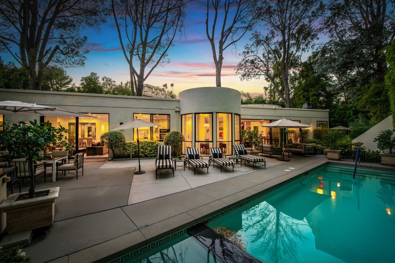 Fabulous two-story, custom remodeled Contemporary in prime location just above Beverly Hills Hotel, apx. 1.5 miles North of Sunset Blvd and minutes away from the Beverly Hills City Center. Gated and private with large front motor court and 2 car garage. Approximately 18,601 sq.ft. lot with grassy backyard, patios, and outdoor fireplace. Light and bright with open floor plan, great indoor/outdoor flow, and wonderful space for entertaining. Large living room with fireplace and family room with walls of doors that open onto the lovely backyard. Gorgeous remodeled kitchen with professional appliances, center island, and adjoining breakfast area or den with fireplace. Master suite and guest bedroom suite downstairs and 3 bedroom suites upstairs, each with luxurious baths. Laundry room upstairs. Available long term, furnished or unfurnished.