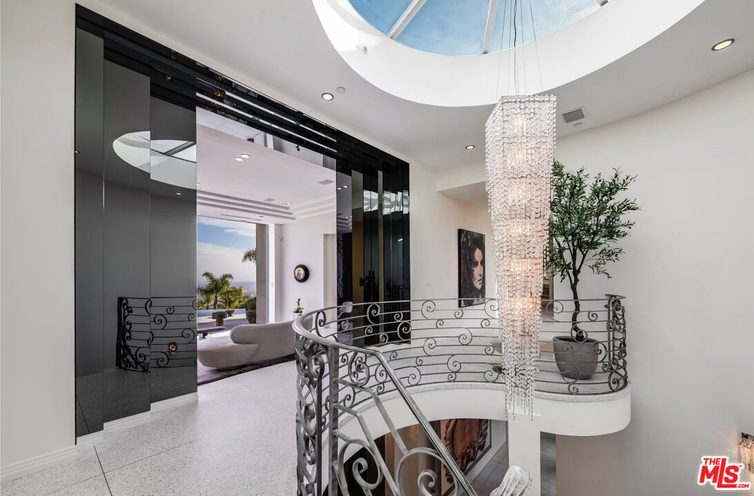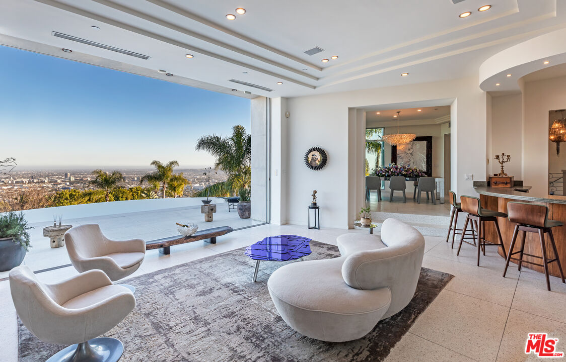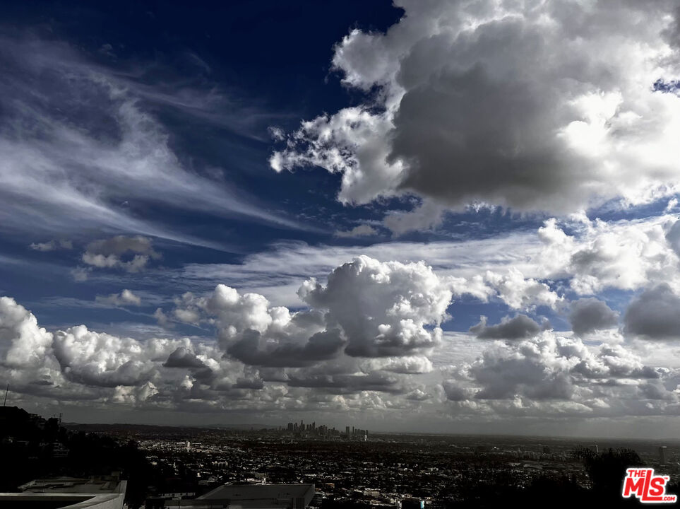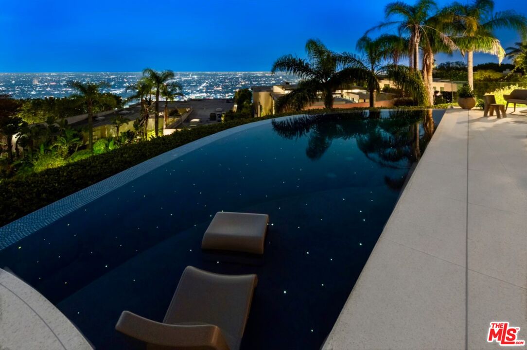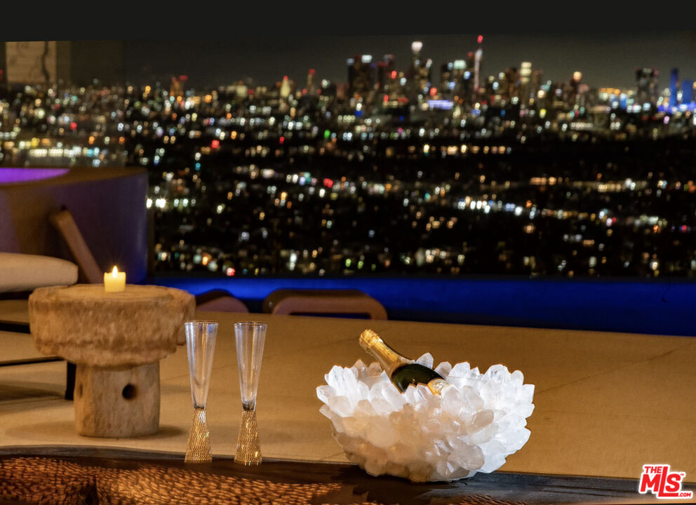 Inspired by some of the greatest Art Deco landmarks of our city, this rarified contemporary residence sits commandingly at the end of a gated private driveway flanked by an avenue of palm trees. The two-story entrance hall with its curving staircase leads to a sunken great room with disappearing walls of glass, a sanctuary for your senses, where an infinity edged pool spills into astonishing views from the San Gabriel Mountains to the Pacific Ocean. The full downtown skyline is the dramatic focal point, other times it's the jaw-dropping colors of the sky, shape-shifting clouds, or exceptional soaring hawks that grace the sky as you lounge on the pool deck.With a total of three bedroom suites, each with its own bath and unique stone floors, the primary bedroom stands out due to its romantic fireplace, boutique-worthy closet and dreamy panoramic views from your pillow. Just a few steps away, open the Fleetwood pocket doors to the pool terrace and indulge in the bubbling spa and outdoor shower. The saltwater pool and spa allow you to create the perfect mood with LED lighting in a variety of colors, as well as starry sky fiber optic lights embedded in the pool's surface, all controlled remotely. A rooftop gobo light connected to an indoor switch displays your logo or message in the pool, or on the deck, when entertaining special guests. Your gourmet kitchen boasts top-of-the-line Miele appliances including a built-in espresso machine, dual sinks, and a center island with marble counters. All graciously flow to the circular breakfast nook and dining room featuring floor to ceiling windows that flood the space with sunlight and stellar views. On the lower floor, enjoy a professionally-sized screening room that's tucked away next to a river rock outdoor atrium where palm trees, a symbol of Hollywood dreams, reach to the sky.A variety of beautiful materials, including hardwood floors in the bedroom suites and walk-in closets, are used throughout. Art Deco flourishes are seen in the custom iron work and classic mosaic bath tiling, as well as in the architectural detailing inside and out. The terrazzo floors are custom built to last using old world Italian craftsmanship. Like the beautiful and stylish architectural treasures that inspired its creation and design, this estate is unique, significant and evolutional.