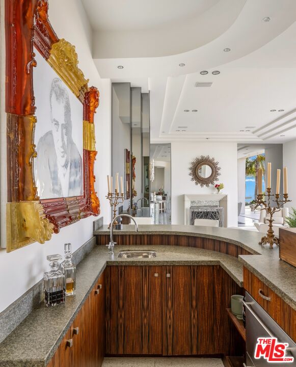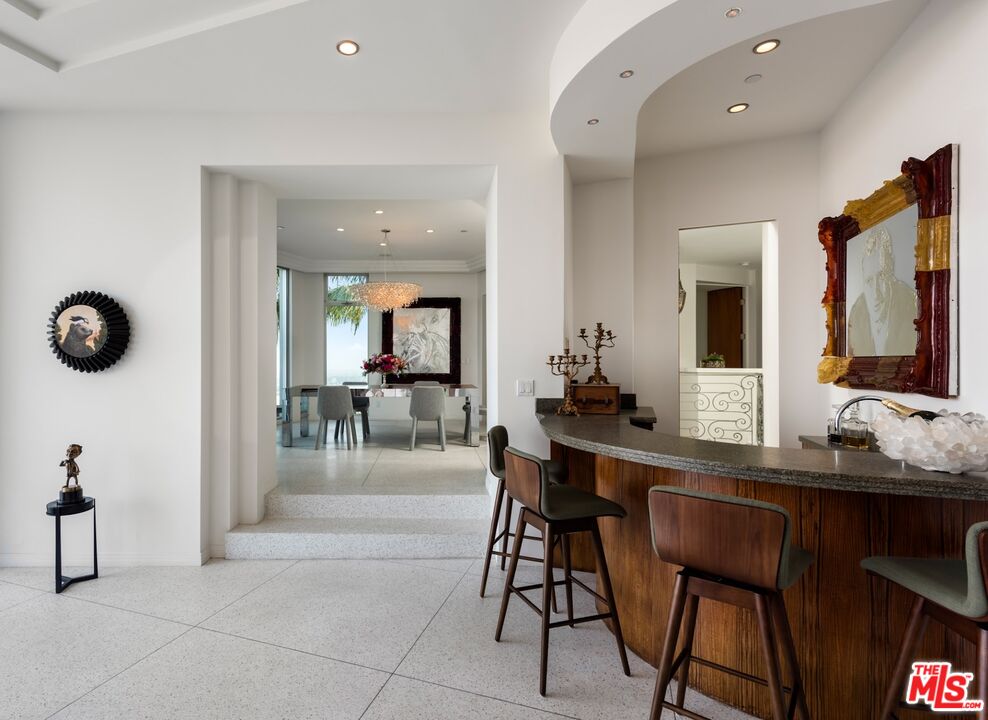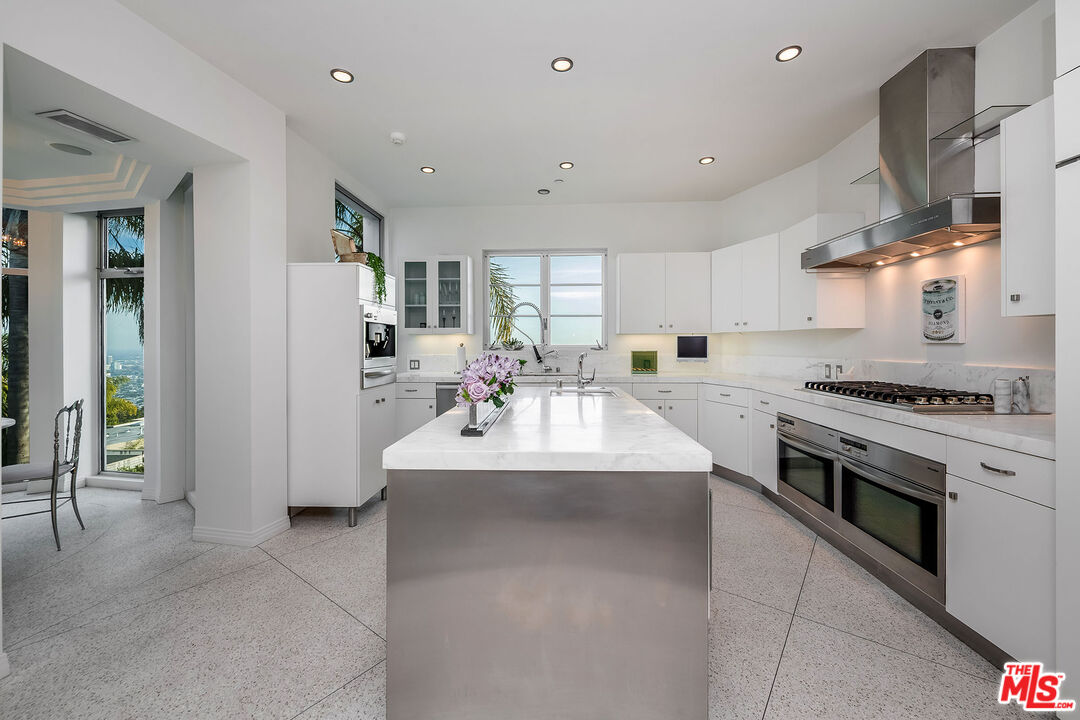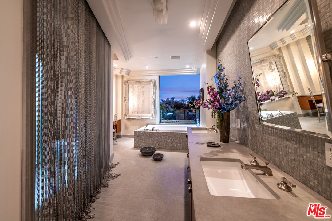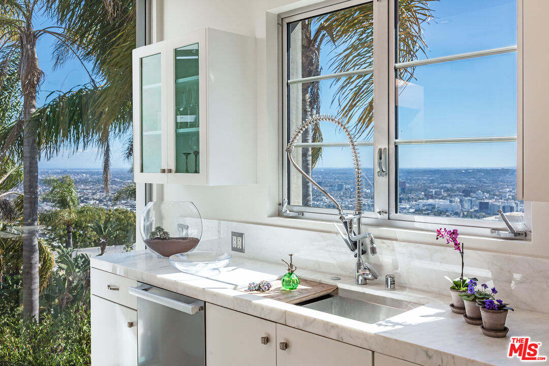 Inspired by some of the greatest Art Deco landmarks of our city, this rarified contemporary residence sits commandingly at the end of a gated private driveway flanked by an avenue of palm trees. The two-story entrance hall with its curving staircase leads to a sunken great room with disappearing walls of glass, a sanctuary for your senses, where an infinity edged pool spills into astonishing views from the San Gabriel Mountains to the Pacific Ocean. The full downtown skyline is the dramatic focal point, other times it's the jaw-dropping colors of the sky, shape-shifting clouds, or exceptional soaring hawks that grace the sky as you lounge on the pool deck.With a total of three bedroom suites, each with its own bath and unique stone floors, the primary bedroom stands out due to its romantic fireplace, boutique-worthy closet and dreamy panoramic views from your pillow. Just a few steps away, open the Fleetwood pocket doors to the pool terrace and indulge in the bubbling spa and outdoor shower. The saltwater pool and spa allow you to create the perfect mood with LED lighting in a variety of colors, as well as starry sky fiber optic lights embedded in the pool's surface, all controlled remotely. A rooftop gobo light connected to an indoor switch displays your logo or message in the pool, or on the deck, when entertaining special guests. Your gourmet kitchen boasts top-of-the-line Miele appliances including a built-in espresso machine, dual sinks, and a center island with marble counters. All graciously flow to the circular breakfast nook and dining room featuring floor to ceiling windows that flood the space with sunlight and stellar views. On the lower floor, enjoy a professionally-sized screening room that's tucked away next to a river rock outdoor atrium where palm trees, a symbol of Hollywood dreams, reach to the sky.A variety of beautiful materials, including hardwood floors in the bedroom suites and walk-in closets, are used throughout. Art Deco flourishes are seen in the custom iron work and classic mosaic bath tiling, as well as in the architectural detailing inside and out. The terrazzo floors are custom built to last using old world Italian craftsmanship. Like the beautiful and stylish architectural treasures that inspired its creation and design, this estate is unique, significant and evolutional.
