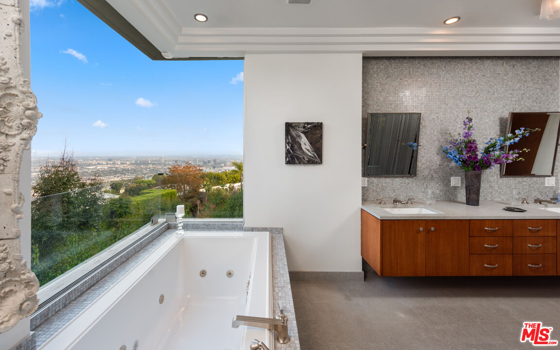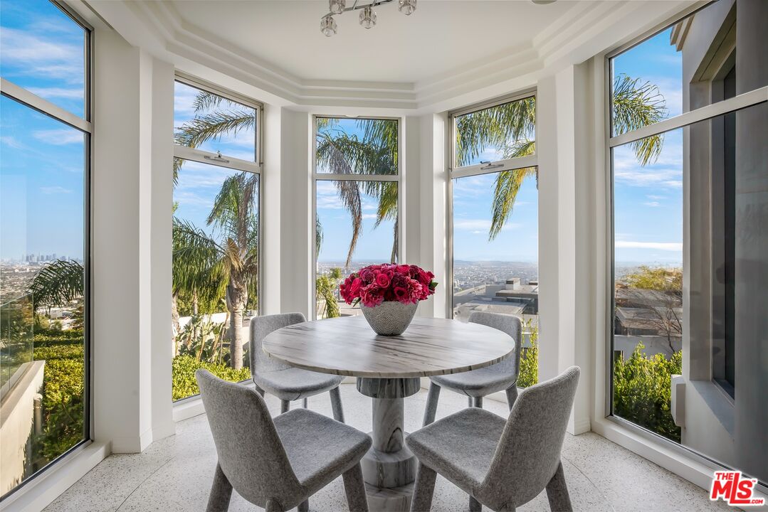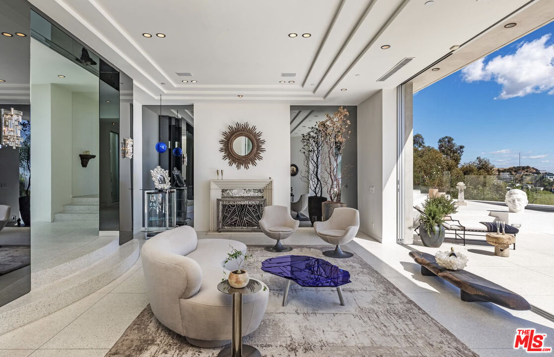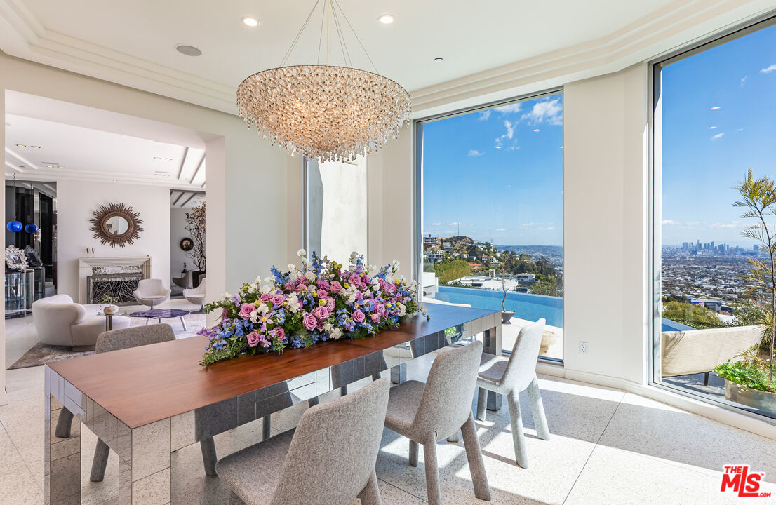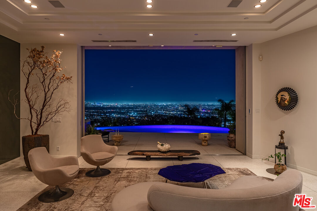 LEASE TERM TO BE FOR NO LESS THAN ONE YEAR + ONE DAY. AVAILABLE FURNISHED OR UNFURNISHED. Inspired by some of the greatest Art Deco landmarks of our city, this rarified contemporary residence sits commandingly at the end of a gated private driveway flanked by an avenue of palm trees. The two-story entrance hall with its curving staircase leads to a sunken great room with disappearing walls of glass, a sanctuary for your senses, where an infinity edged pool spills into astonishing views from the San Gabriel Mountains to the Pacific Ocean. The full downtown skyline is the dramatic focal point, other times it's the jaw-dropping colors of the sky, shape-shifting clouds, or exceptional soaring hawks that grace the sky as you lounge on the pool deck.With a total of three bedroom suites, each with its own bath and unique stone floors, the primary bedroom stands out due to its romantic fireplace, boutique-worthy closet and dreamy panoramic views from your pillow. Just a few steps away, open the Fleetwood pocket doors to the pool terrace and indulge in the bubbling spa and outdoor shower. The saltwater pool and spa allow you to create the perfect mood with LED lighting in a variety of colors, as well as starry sky fiber optic lights embedded in the pool's surface, all controlled remotely. A rooftop gobo light connected to an indoor switch displays your logo or message in the pool, or on the deck, when entertaining special guests. Your gourmet kitchen boasts top-of-the-line Miele appliances including a built-in espresso machine, dual sinks, and a center island with marble counters. All graciously flow to the circular breakfast nook and dining room featuring floor to ceiling windows that flood the space with sunlight and stellar views. On the lower floor, enjoy a professionally-sized screening room that's tucked away next to a river rock outdoor atrium where palm trees, a symbol of Hollywood dreams, reach to the sky.A variety of beautiful materials, including hardwood floors in the bedroom suites and walk-in closets, are used throughout. Art Deco flourishes are seen in the custom iron work and classic mosaic bath tiling, as well as in the architectural detailing inside and out. The terrazzo floors are custom built to last using old world Italian craftsmanship. Like the beautiful and stylish architectural treasures that inspired its creation and design, this estate is unique, significant and evolutional.