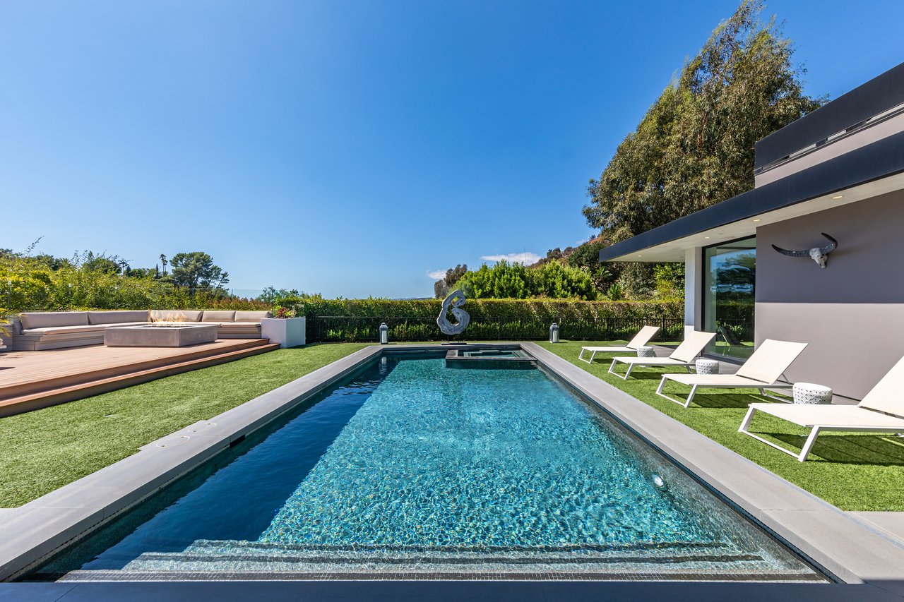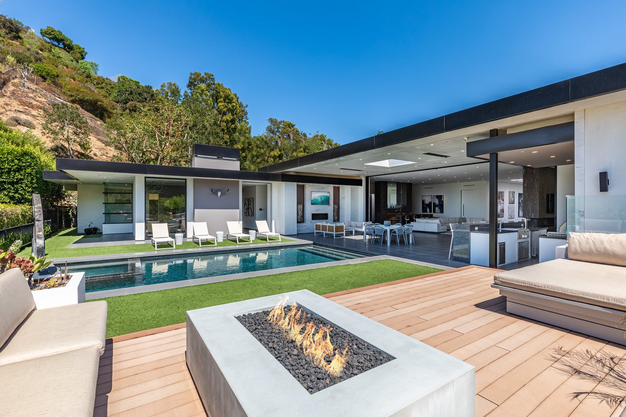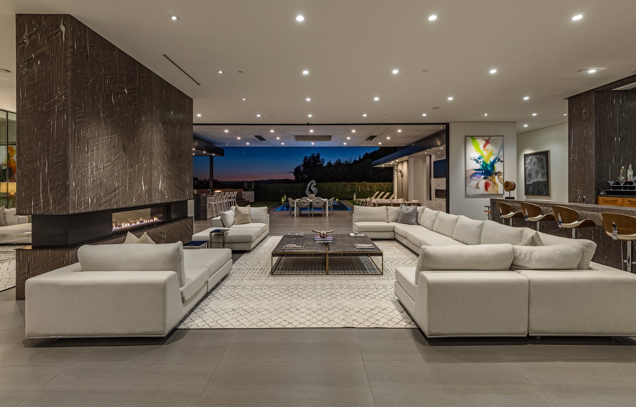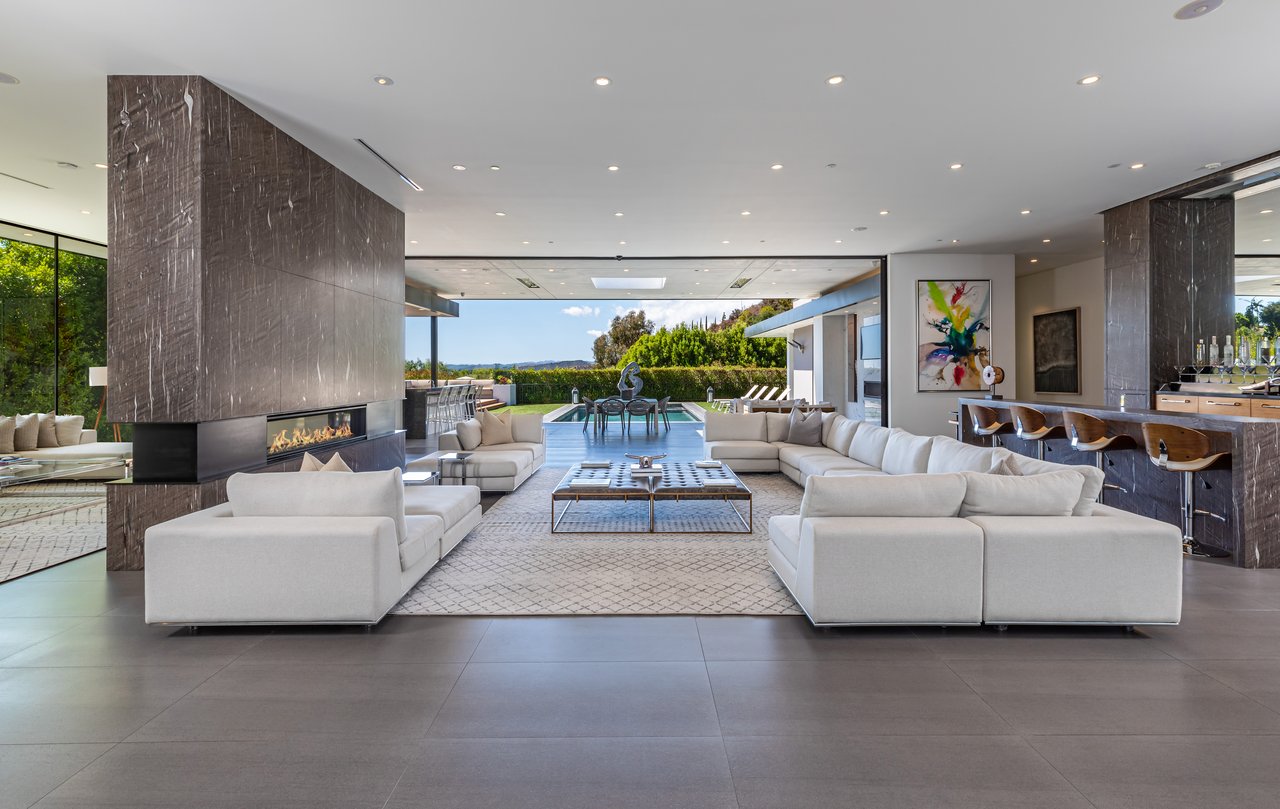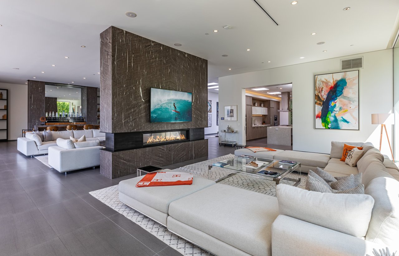 A rare opportunity in one of Los Angeles' most coveted enclaves, this residence represents, arguably, one of the most compelling values in Trousdale Estates, with a motivated seller and the added benefit of potential seller financing. Set on an expansive over 37,000 sq.ft. lot in the prestigious Trousdale Estates, this striking contemporary residence offers exceptional privacy, scale, and sweeping canyon vistas. Discreetly positioned behind a 200-foot private gated drive off Loma Vista Drive, the property occupies the former site of Dean Martin's residence and presents a refined interpretation of modern luxury, completed in 2017. Spanning over 10,000 sq.ft., the home is thoughtfully designed as a single-story estate with no basement, delivering effortless, uninterrupted living throughout. Grand proportions define the interiors, with 12-foot ceilings and walls of glass that flood the space with natural light. A dramatic floating entry introduces a gallery-style foyer, ideal for curated art displays, leading into an expansive great room with living, family, and bar areas. Fleetwood doors create a seamless transition to the outdoors, where a resort-like setting unfolds with a spacious patio, fireplace, pool, and a fully equipped outdoor kitchen with 48-inch barbecue, all framed by tranquil canyon views. The formal dining room is complemented by a 300-bottle wine display and connects to a custom kitchen appointed with Miele appliances. The primary suite serves as a private retreat, complete with fireplace, dual walk-in closets, and a spa-caliber bath. An office and four additional bedroom suites, each with private patios, offer comfort and privacy for family or guests. Additional amenities include a theater, gym, and spa, while a motor court accommodating 20+ vehicles and a three-car garage complete the offering.
