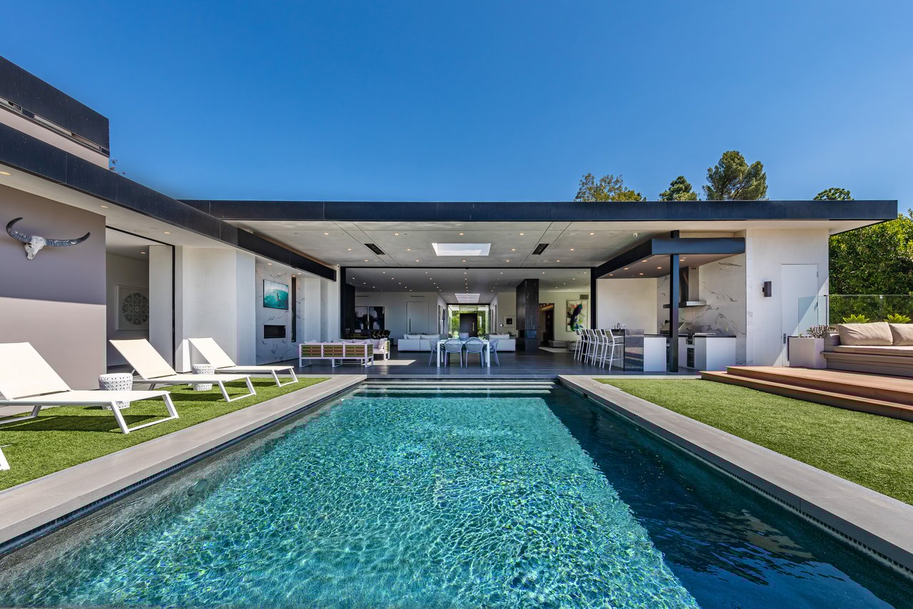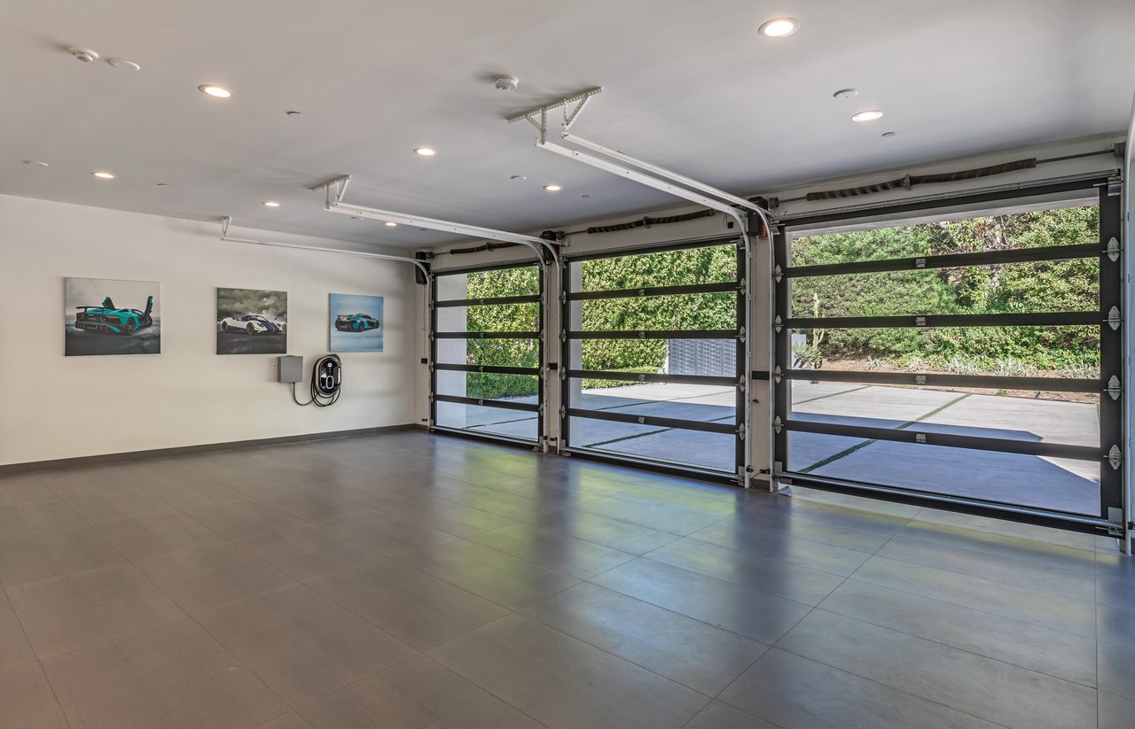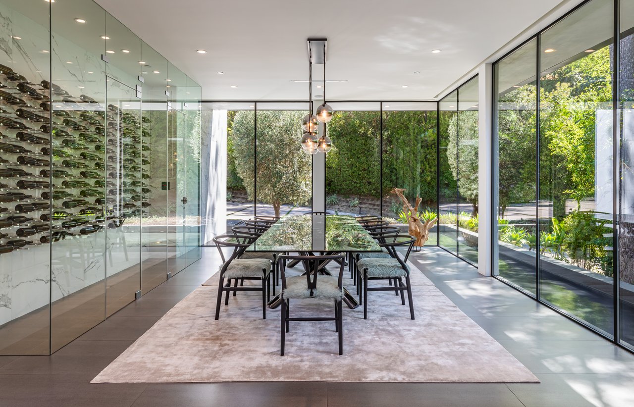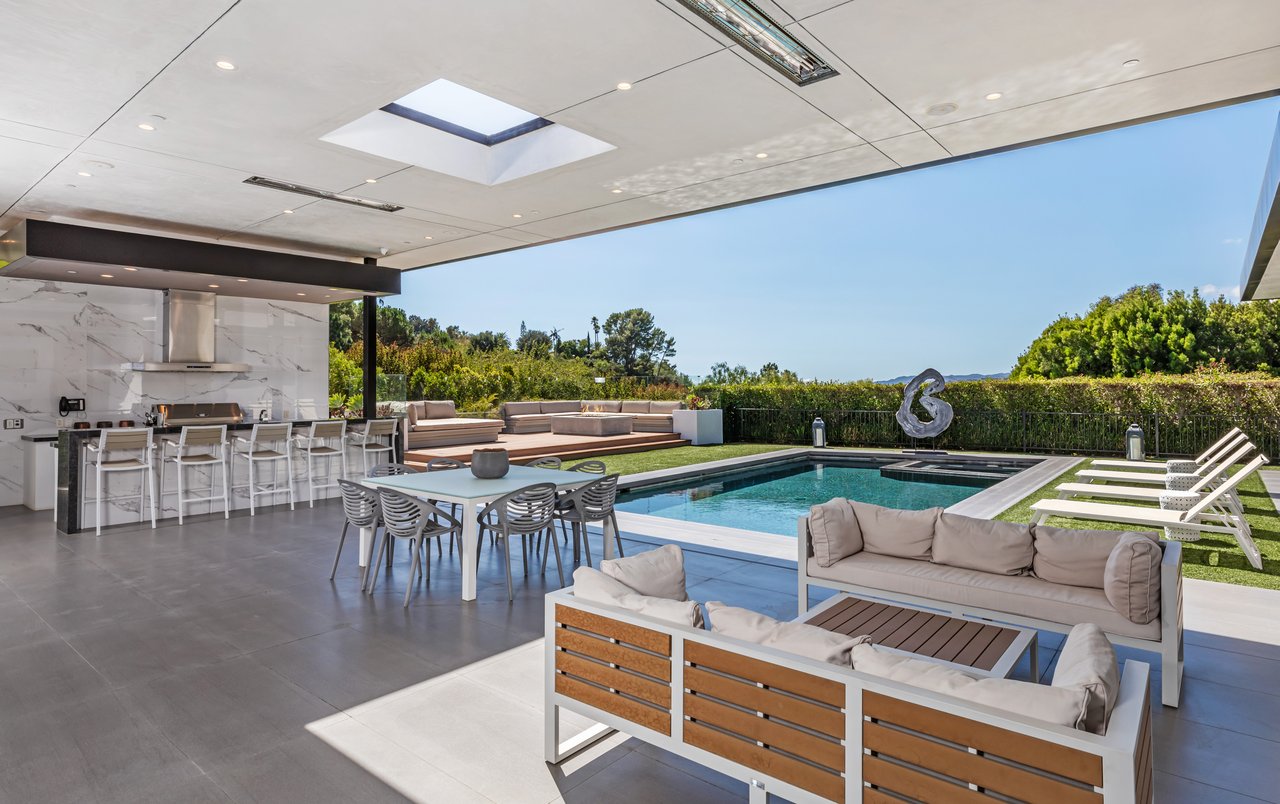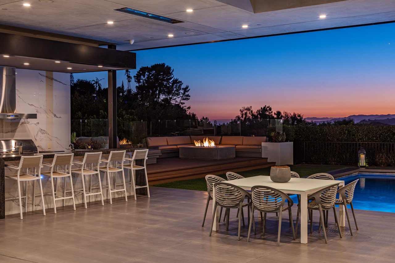 A rare opportunity in one of Los Angeles' most coveted enclaves, this residence represents, arguably, one of the most compelling values in Trousdale Estates, with a motivated seller and the added benefit of potential seller financing. Set on an expansive over 37,000 sq.ft. lot in the prestigious Trousdale Estates, this striking contemporary residence offers exceptional privacy, scale, and sweeping canyon vistas. Discreetly positioned behind a 200-foot private gated drive off Loma Vista Drive, the property occupies the former site of Dean Martin's residence and presents a refined interpretation of modern luxury, completed in 2017. Spanning over 10,000 sq.ft., the home is thoughtfully designed as a single-story estate with no basement, delivering effortless, uninterrupted living throughout. Grand proportions define the interiors, with 12-foot ceilings and walls of glass that flood the space with natural light. A dramatic floating entry introduces a gallery-style foyer, ideal for curated art displays, leading into an expansive great room with living, family, and bar areas. Fleetwood doors create a seamless transition to the outdoors, where a resort-like setting unfolds with a spacious patio, fireplace, pool, and a fully equipped outdoor kitchen with 48-inch barbecue, all framed by tranquil canyon views. The formal dining room is complemented by a 300-bottle wine display and connects to a custom kitchen appointed with Miele appliances. The primary suite serves as a private retreat, complete with fireplace, dual walk-in closets, and a spa-caliber bath. An office and four additional bedroom suites, each with private patios, offer comfort and privacy for family or guests. Additional amenities include a theater, gym, and spa, while a motor court accommodating 20+ vehicles and a three-car garage complete the offering.