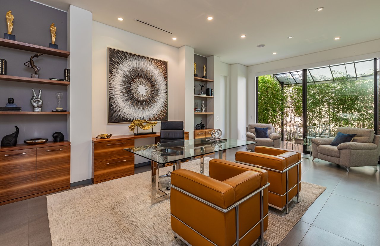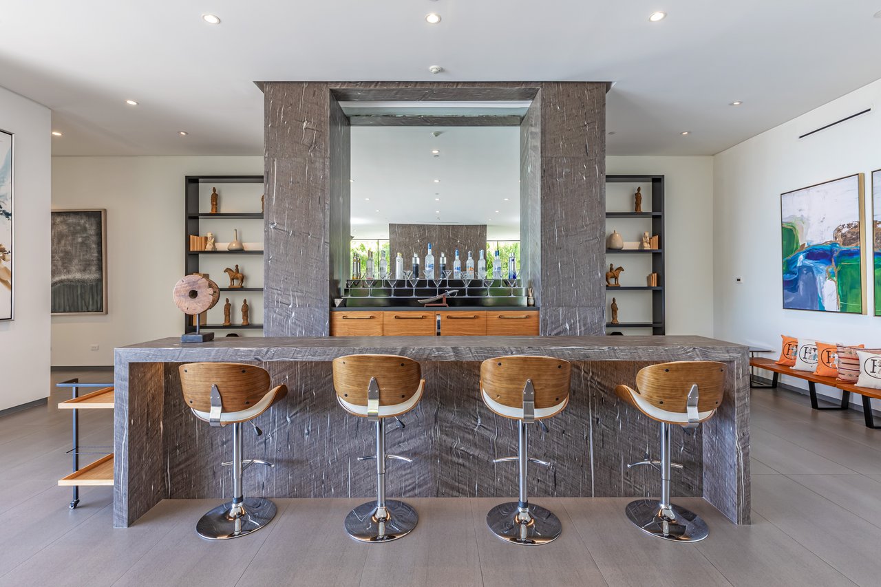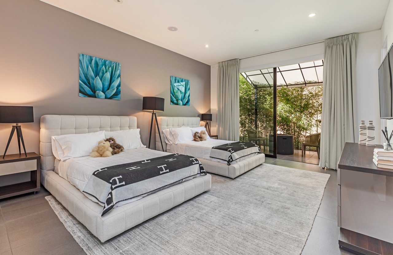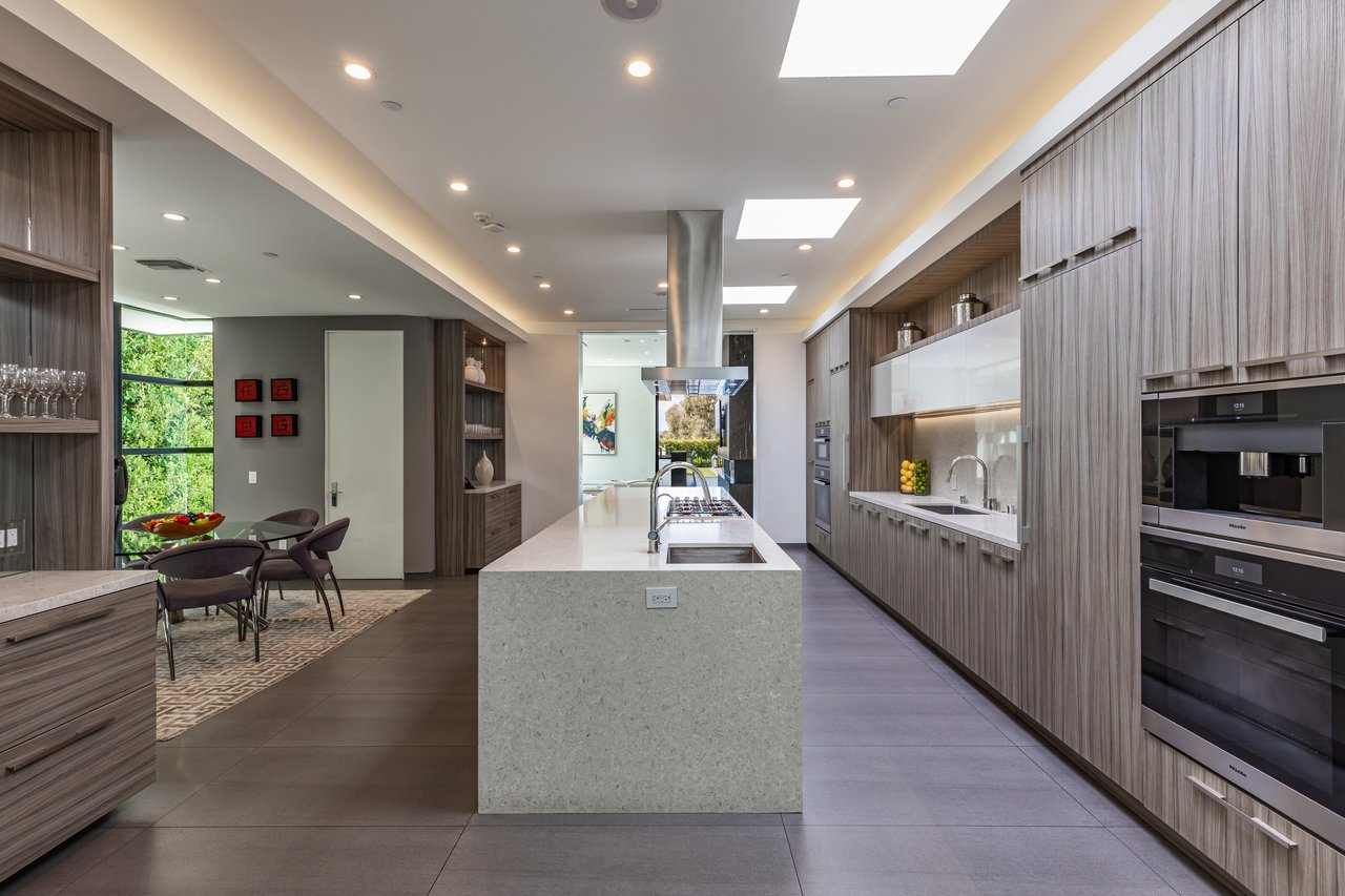 A rare opportunity in one of Los Angeles' most coveted enclaves, this residence represents, arguably, one of the most compelling values in Trousdale Estates, with a motivated seller and the added benefit of potential seller financing. Set on an expansive over 37,000 sq.ft. lot in the prestigious Trousdale Estates, this striking contemporary residence offers exceptional privacy, scale, and sweeping canyon vistas. Discreetly positioned behind a 200-foot private gated drive off Loma Vista Drive, the property occupies the former site of Dean Martin's residence and presents a refined interpretation of modern luxury, completed in 2017. Spanning over 10,000 sq.ft., the home is thoughtfully designed as a single-story estate with no basement, delivering effortless, uninterrupted living throughout. Grand proportions define the interiors, with 12-foot ceilings and walls of glass that flood the space with natural light. A dramatic floating entry introduces a gallery-style foyer, ideal for curated art displays, leading into an expansive great room with living, family, and bar areas. Fleetwood doors create a seamless transition to the outdoors, where a resort-like setting unfolds with a spacious patio, fireplace, pool, and a fully equipped outdoor kitchen with 48-inch barbecue, all framed by tranquil canyon views. The formal dining room is complemented by a 300-bottle wine display and connects to a custom kitchen appointed with Miele appliances. The primary suite serves as a private retreat, complete with fireplace, dual walk-in closets, and a spa-caliber bath. An office and four additional bedroom suites, each with private patios, offer comfort and privacy for family or guests. Additional amenities include a theater, gym, and spa, while a motor court accommodating 20+ vehicles and a three-car garage complete the offering.