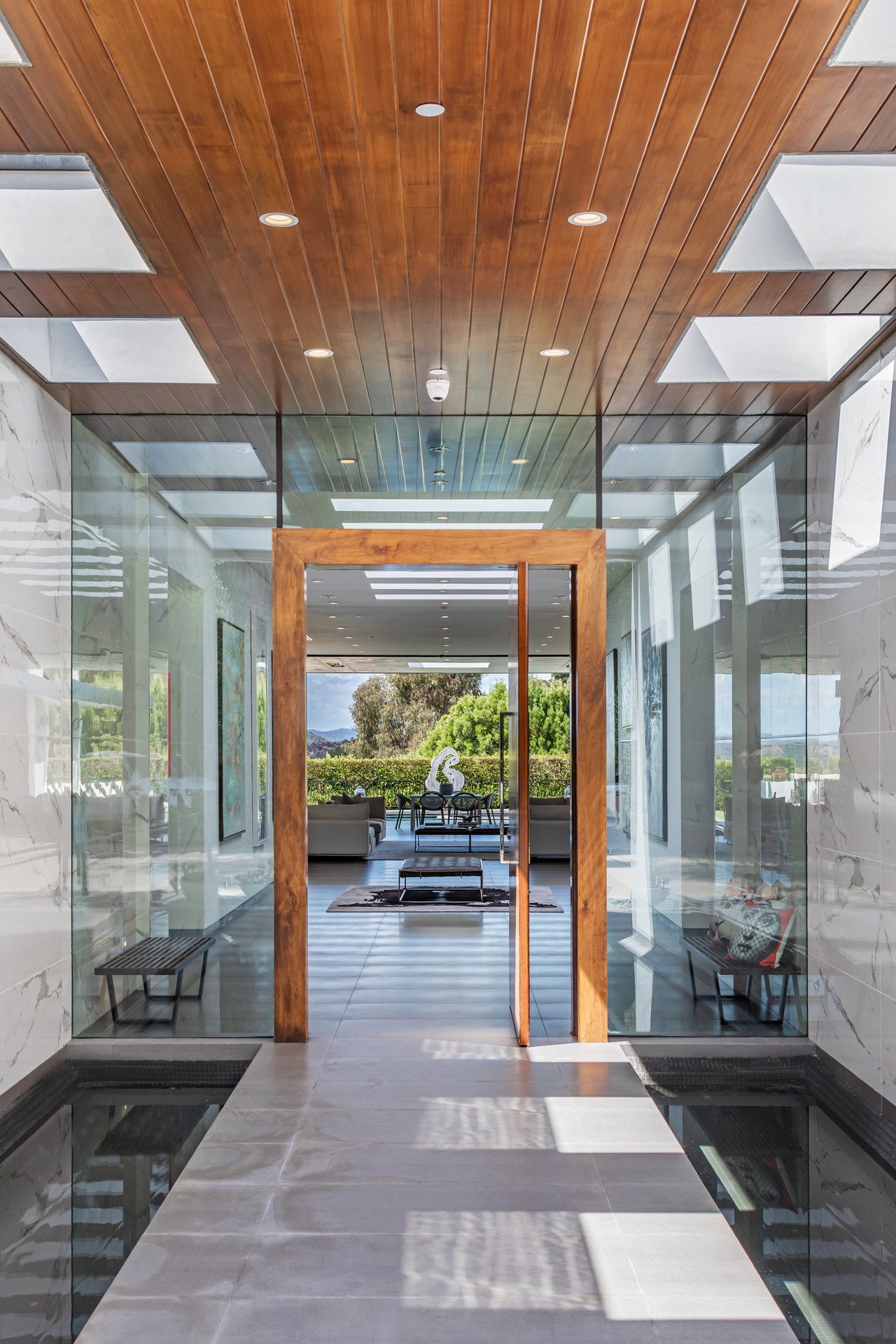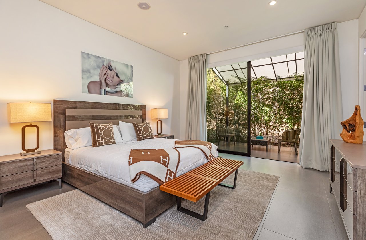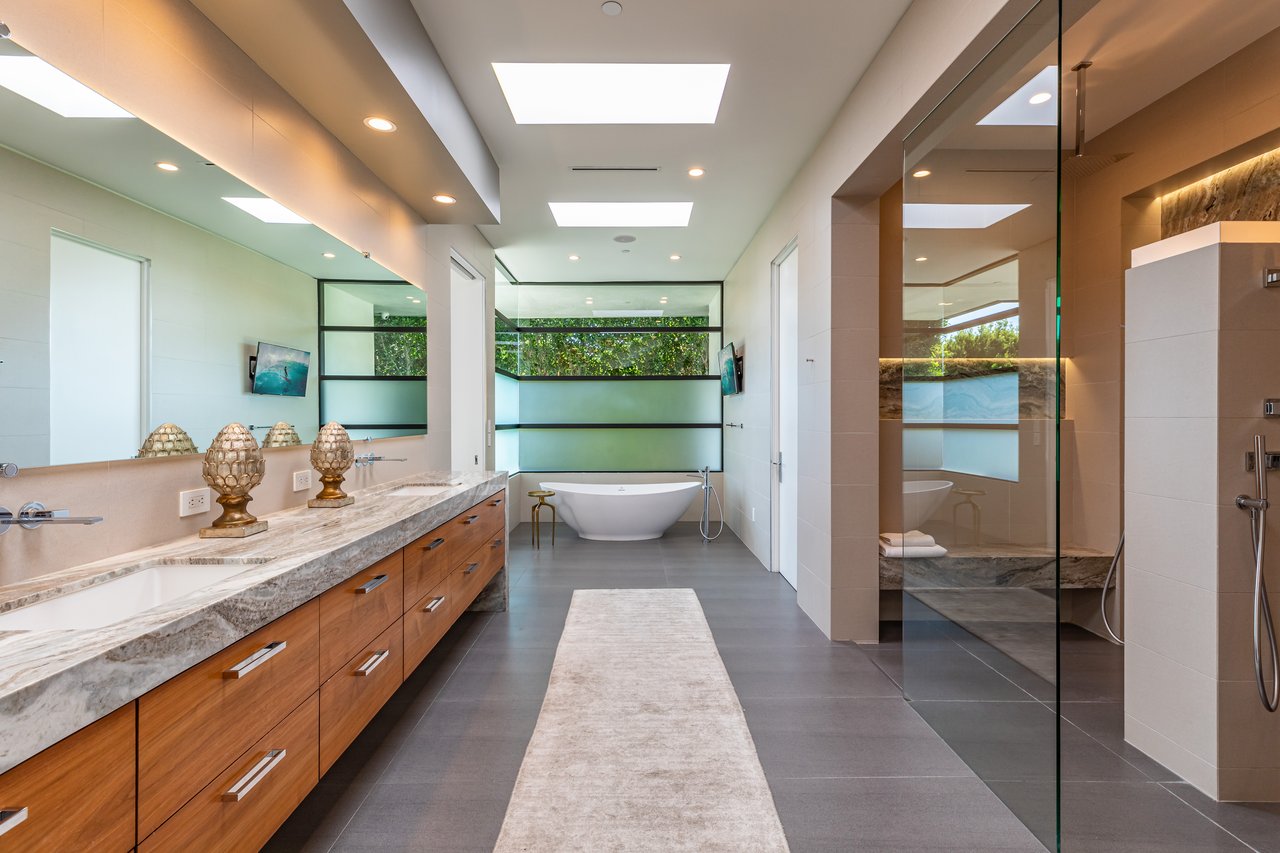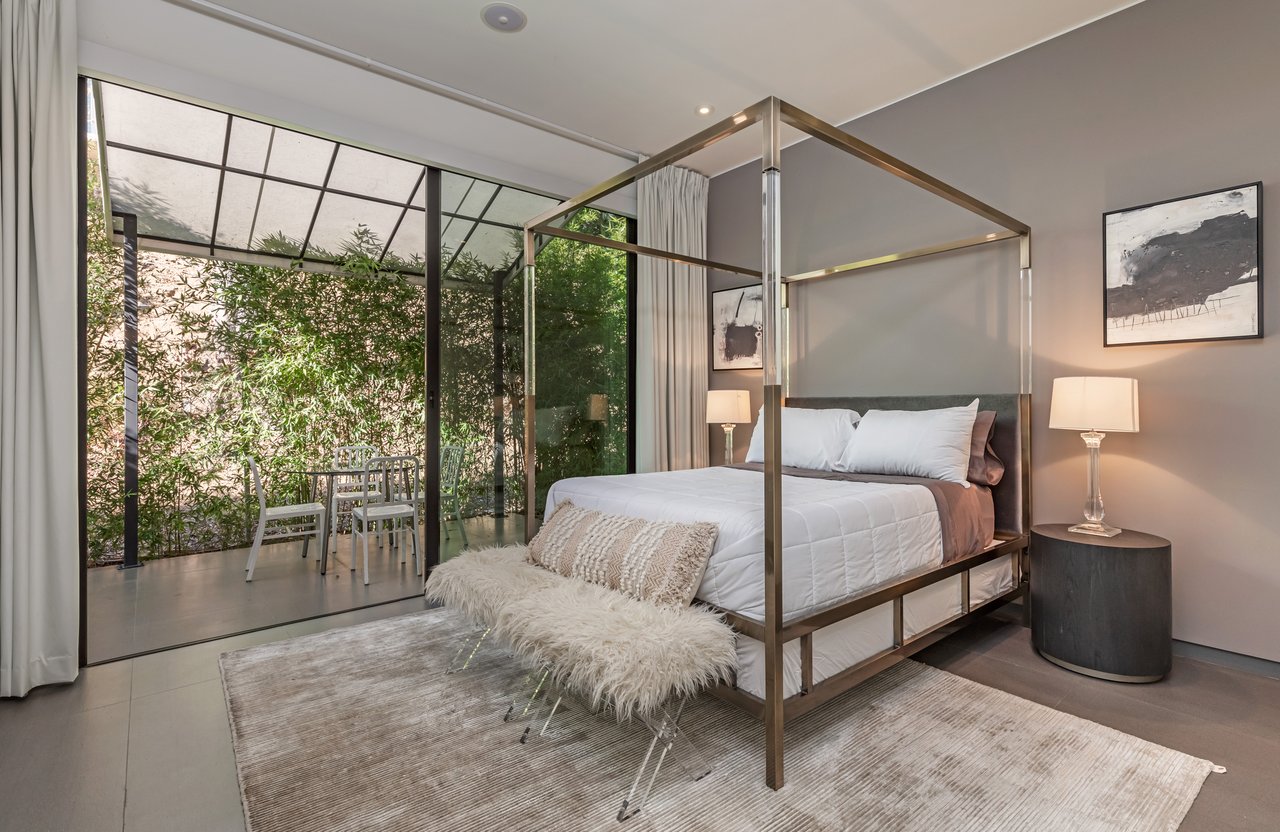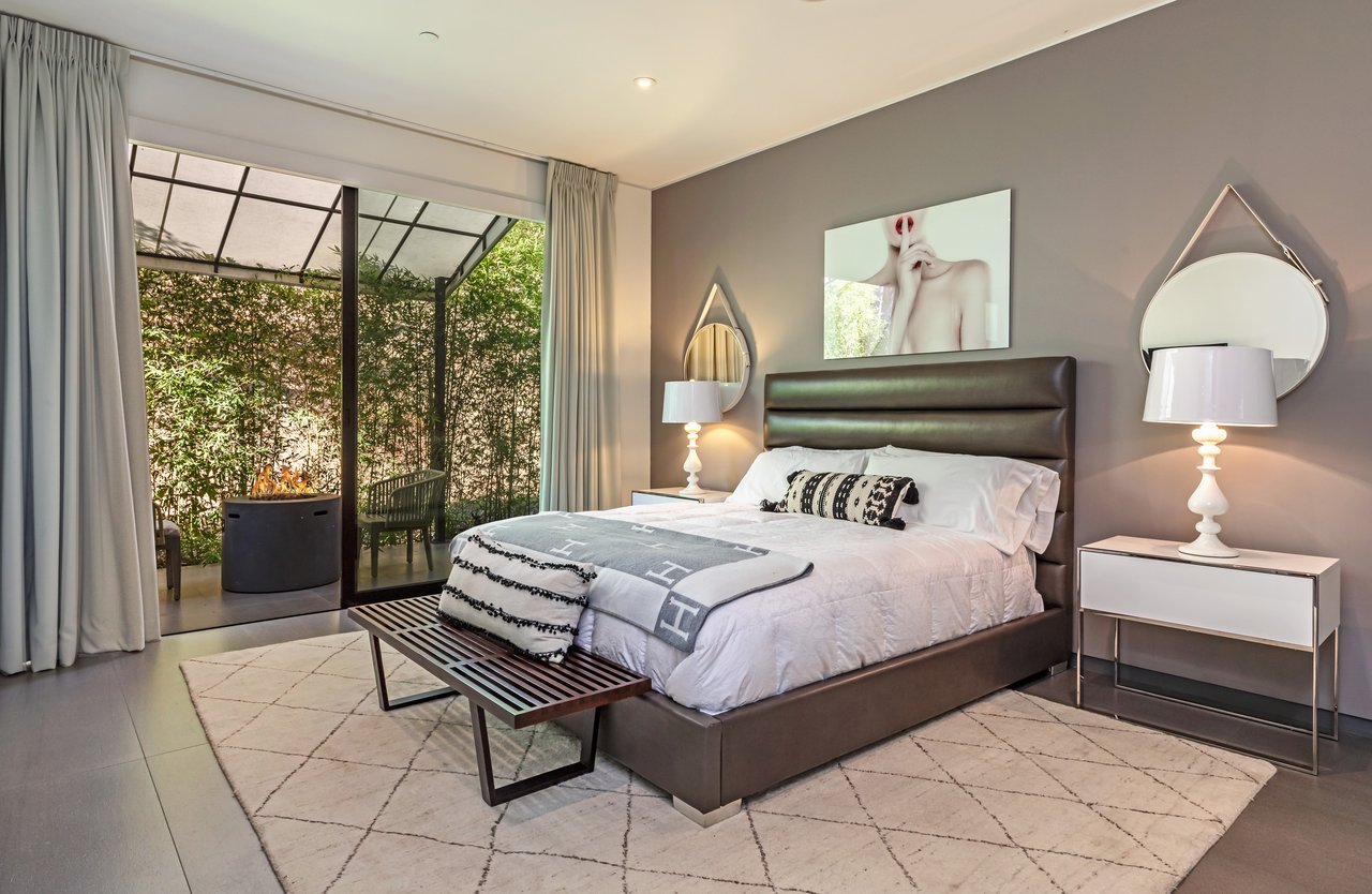 A rare opportunity in one of Los Angeles' most coveted enclaves, this residence represents, arguably, one of the most compelling values in Trousdale Estates, with a motivated seller and the added benefit of potential seller financing. Set on an expansive over 37,000 sq.ft. lot in the prestigious Trousdale Estates, this striking contemporary residence offers exceptional privacy, scale, and sweeping canyon vistas. Discreetly positioned behind a 200-foot private gated drive off Loma Vista Drive, the property occupies the former site of Dean Martin's residence and presents a refined interpretation of modern luxury, completed in 2017. Spanning over 10,000 sq.ft., the home is thoughtfully designed as a single-story estate with no basement, delivering effortless, uninterrupted living throughout. Grand proportions define the interiors, with 12-foot ceilings and walls of glass that flood the space with natural light. A dramatic floating entry introduces a gallery-style foyer, ideal for curated art displays, leading into an expansive great room with living, family, and bar areas. Fleetwood doors create a seamless transition to the outdoors, where a resort-like setting unfolds with a spacious patio, fireplace, pool, and a fully equipped outdoor kitchen with 48-inch barbecue, all framed by tranquil canyon views. The formal dining room is complemented by a 300-bottle wine display and connects to a custom kitchen appointed with Miele appliances. The primary suite serves as a private retreat, complete with fireplace, dual walk-in closets, and a spa-caliber bath. An office and four additional bedroom suites, each with private patios, offer comfort and privacy for family or guests. Additional amenities include a theater, gym, and spa, while a motor court accommodating 20+ vehicles and a three-car garage complete the offering.