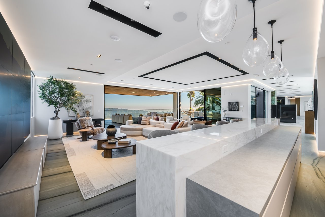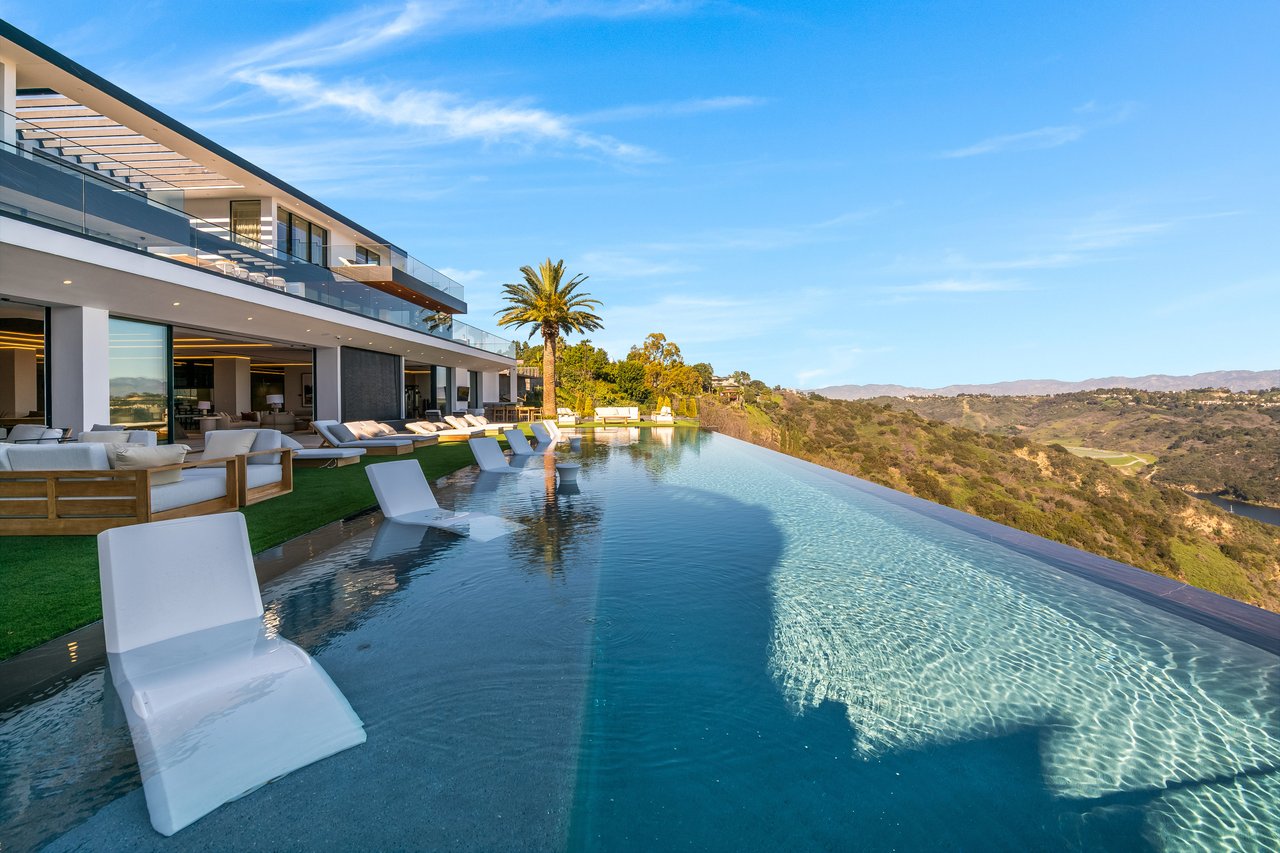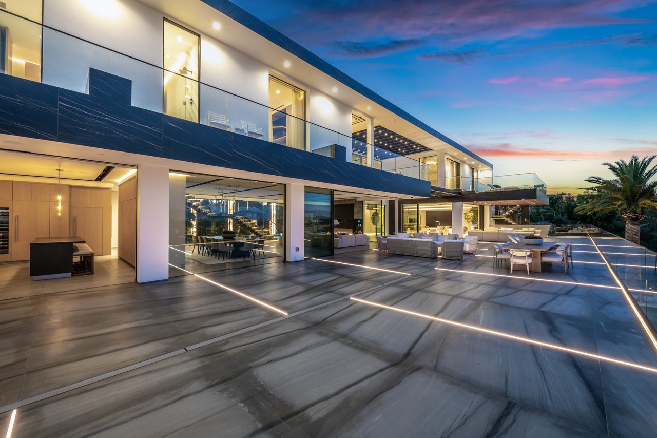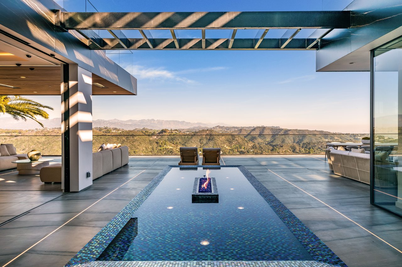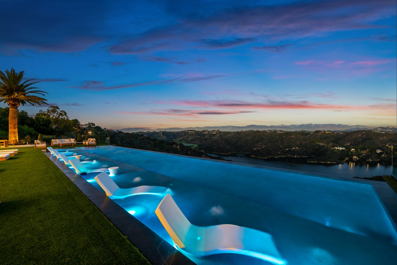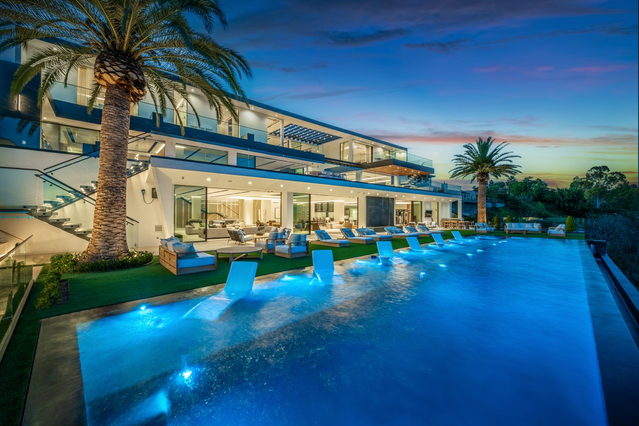 Poised above Bel Air with sweeping city, canyon, and reservoir views, this contemporary architectural estate is defined by luminous design, sculptural form, and a refined connection to nature. Approached through a double-gated entry and expansive motor court, the residence reveals a striking facade enhanced by custom illumination and serene reflecting water features anchored by mature olive trees. Backlit onyx columns frame the entrance, setting a tone of quiet sophistication.The main living pavilion offers an open, radiant flow for dining and relaxation, surrounded by full-height automatic glass doors, refined stone surfaces, warm wood tones, and breathtaking views throughout. A floating green onyx staircase connects each level, thoughtfully designed to inspire and maximize light across the home.A chef's culinary haven, the residence features four kitchens designed for entertaining, professional preparation, and seamless service. The main level kitchen is equipped with dual oversized islands, a full suite of Gaggenau appliances, European cabinetry, and a walk-in industrial stainless-steel refrigeration room. A separate restaurant-grade chef's kitchen with stainless-steel finishes and Miele appliances supports large-scale culinary preparation, complemented by a dedicated butler's kitchen and an outdoor kitchen with pizza oven for catered events at scale.The entertainment level is a world unto itself, featuring a private two-lane bowling alley, cinema-grade theater, sophisticated lounge and bar, and a temperature-controlled wine cellar. A full private wellness retreat includes a Turkish hammam with dry sauna, steam room, cold plunge, hot tub, massage tables, hair and nail salon, juice bar, and a glass-enclosed fitness studio oriented toward expansive views.The upper level hosts the primary suite, a private sanctuary with panoramic vistas, dual walk-in closets, and dual bathrooms finished in marble and onyx, each appointed with TOTO smart systems. Three additional ensuite bedrooms feature floor-to-ceiling glass, custom closets, and serene natural finishes.Outdoor living is highlighted by an infinity-edge pool blending into the horizon, expansive stone terraces, fire features, softly illuminated landscaping, and a private hillside vineyard that enhances the home's sense of retreat. A refined contemporary estate, this tour de force embodies elegance, innovation, and tranquility in one of Bel Air's most elevated settings.
