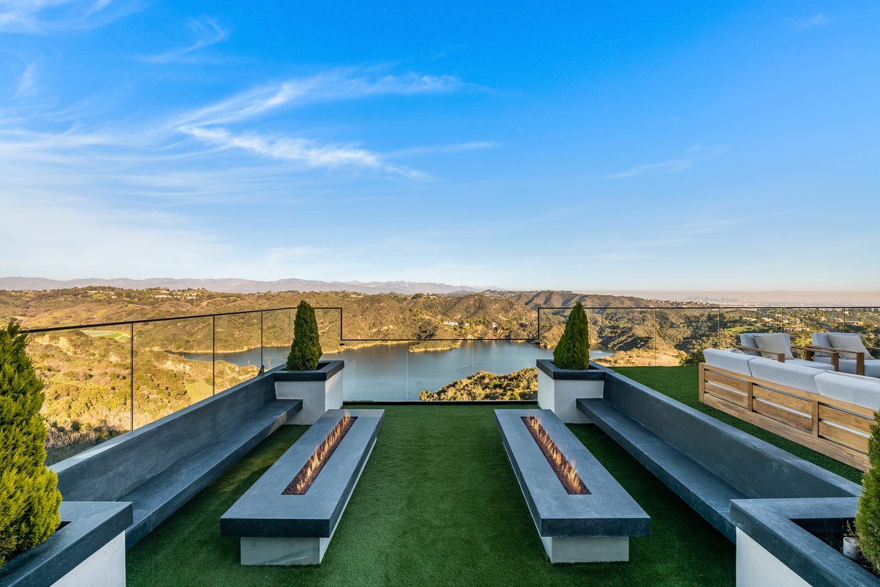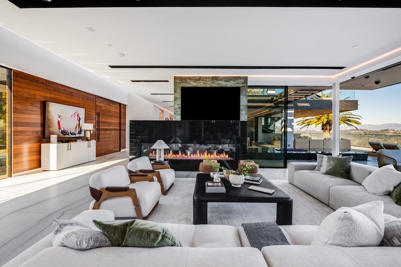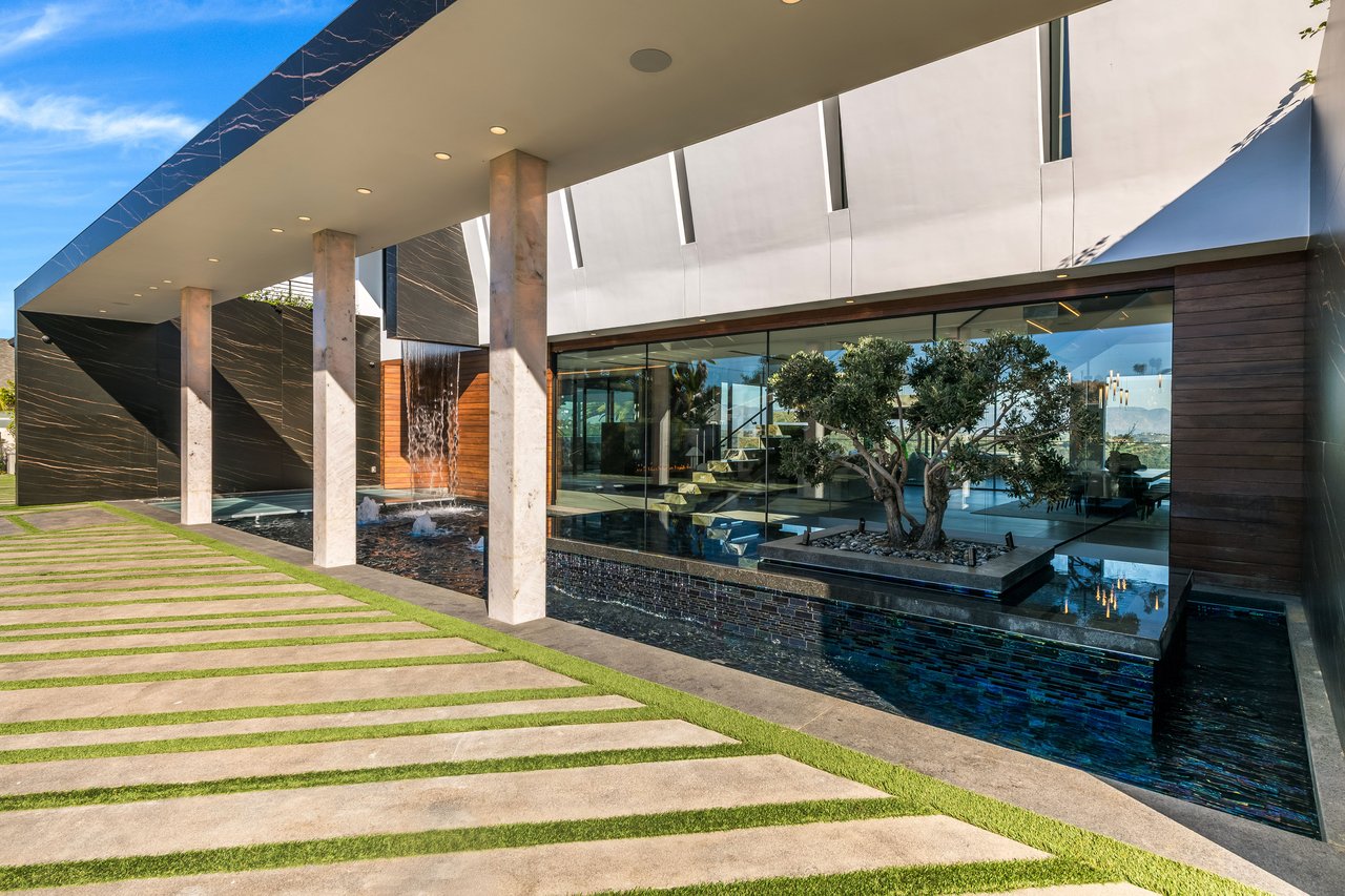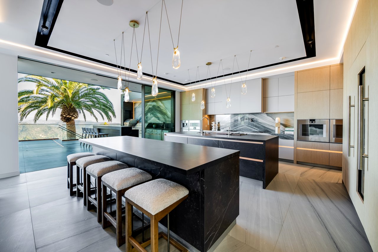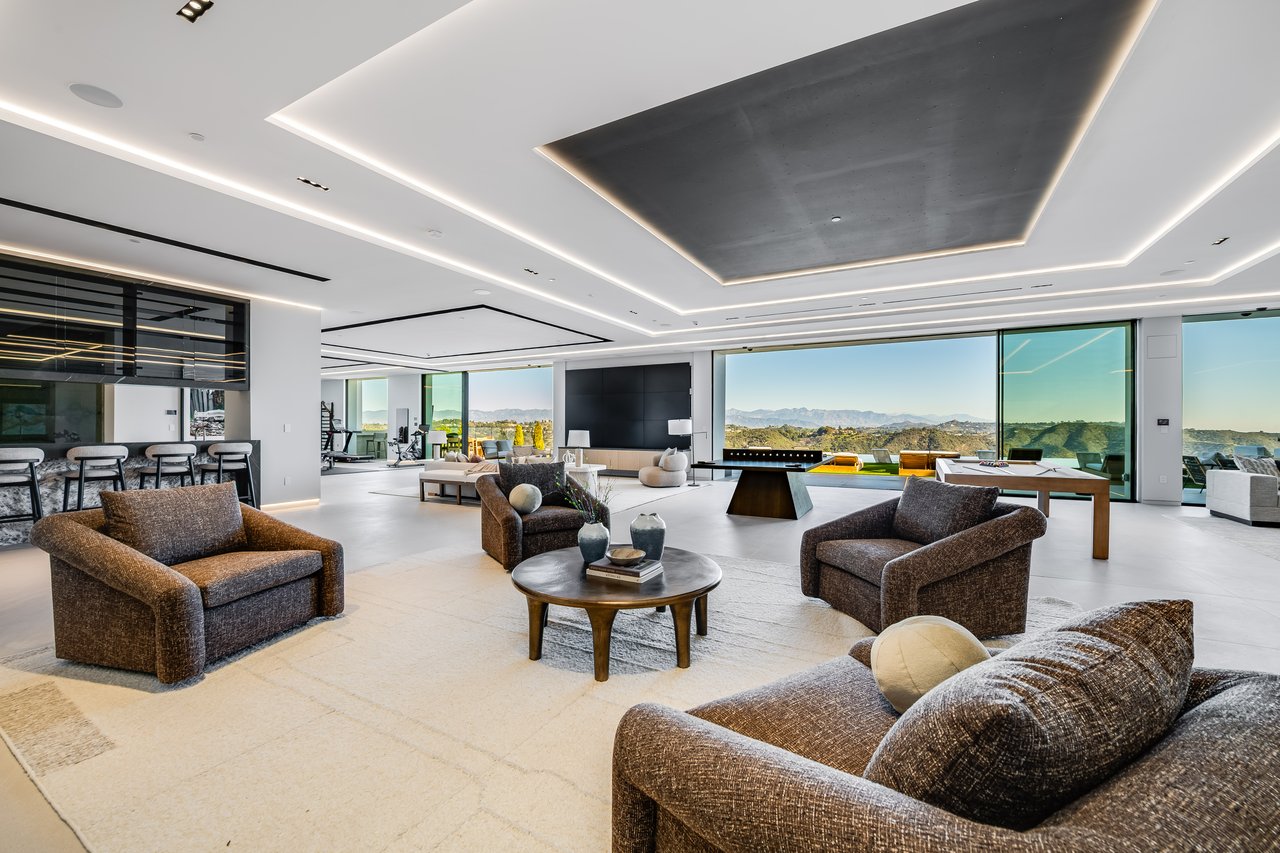 Poised above Bel Air with sweeping city, canyon, and reservoir views, this contemporary architectural estate is defined by luminous design, sculptural form, and a refined connection to nature. Approached through a double-gated entry and expansive motor court, the residence reveals a striking facade enhanced by custom illumination and serene reflecting water features anchored by mature olive trees. Backlit onyx columns frame the entrance, setting a tone of quiet sophistication.The main living pavilion offers an open, radiant flow for dining and relaxation, surrounded by full-height automatic glass doors, refined stone surfaces, warm wood tones, and breathtaking views throughout. A floating green onyx staircase connects each level, thoughtfully designed to inspire and maximize light across the home.A chef's culinary haven, the residence features four kitchens designed for entertaining, professional preparation, and seamless service. The main level kitchen is equipped with dual oversized islands, a full suite of Gaggenau appliances, European cabinetry, and a walk-in industrial stainless-steel refrigeration room. A separate restaurant-grade chef's kitchen with stainless-steel finishes and Miele appliances supports large-scale culinary preparation, complemented by a dedicated butler's kitchen and an outdoor kitchen with pizza oven for catered events at scale.The entertainment level is a world unto itself, featuring a private two-lane bowling alley, cinema-grade theater, sophisticated lounge and bar, and a temperature-controlled wine cellar. A full private wellness retreat includes a Turkish hammam with dry sauna, steam room, cold plunge, hot tub, massage tables, hair and nail salon, juice bar, and a glass-enclosed fitness studio oriented toward expansive views.The upper level hosts the primary suite, a private sanctuary with panoramic vistas, dual walk-in closets, and dual bathrooms finished in marble and onyx, each appointed with TOTO smart systems. Three additional ensuite bedrooms feature floor-to-ceiling glass, custom closets, and serene natural finishes.Outdoor living is highlighted by an infinity-edge pool blending into the horizon, expansive stone terraces, fire features, softly illuminated landscaping, and a private hillside vineyard that enhances the home's sense of retreat. A refined contemporary estate, this tour de force embodies elegance, innovation, and tranquility in one of Bel Air's most elevated settings.