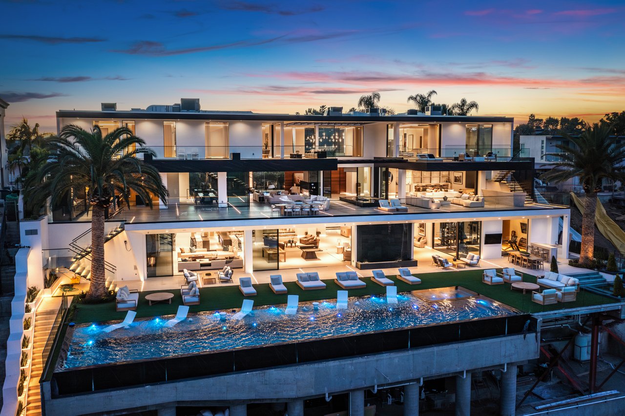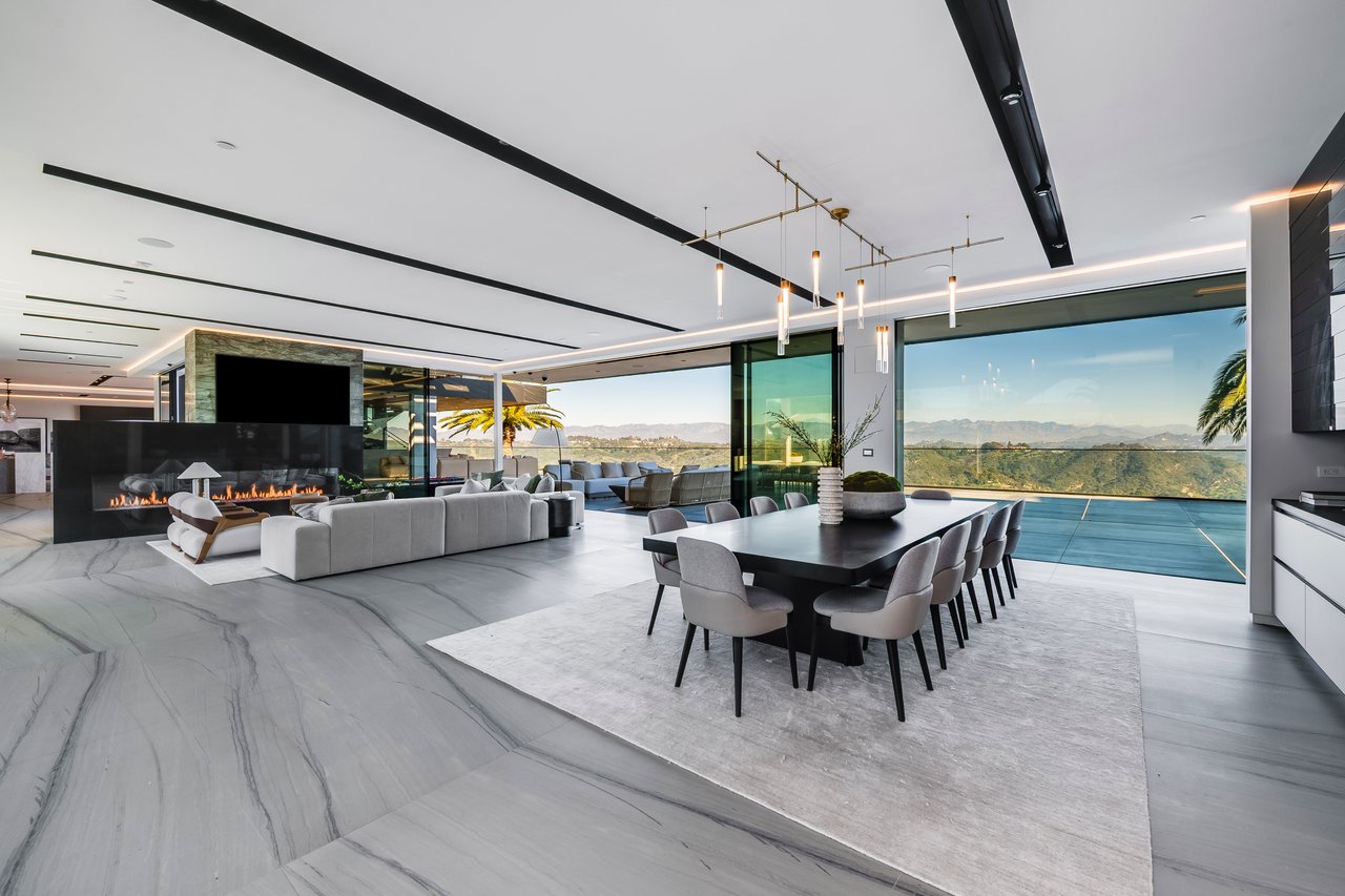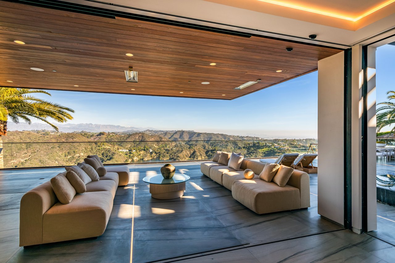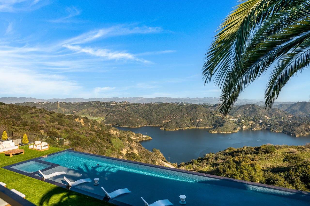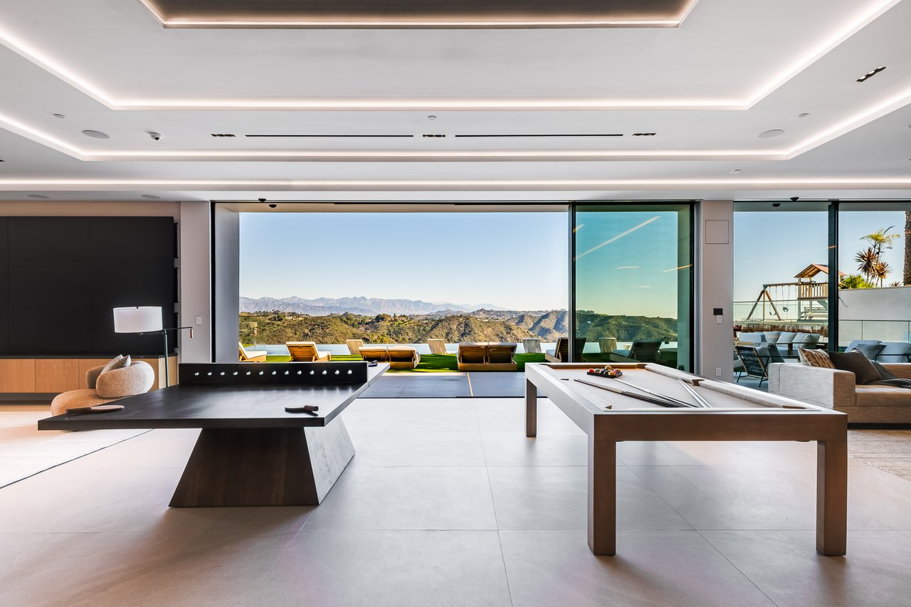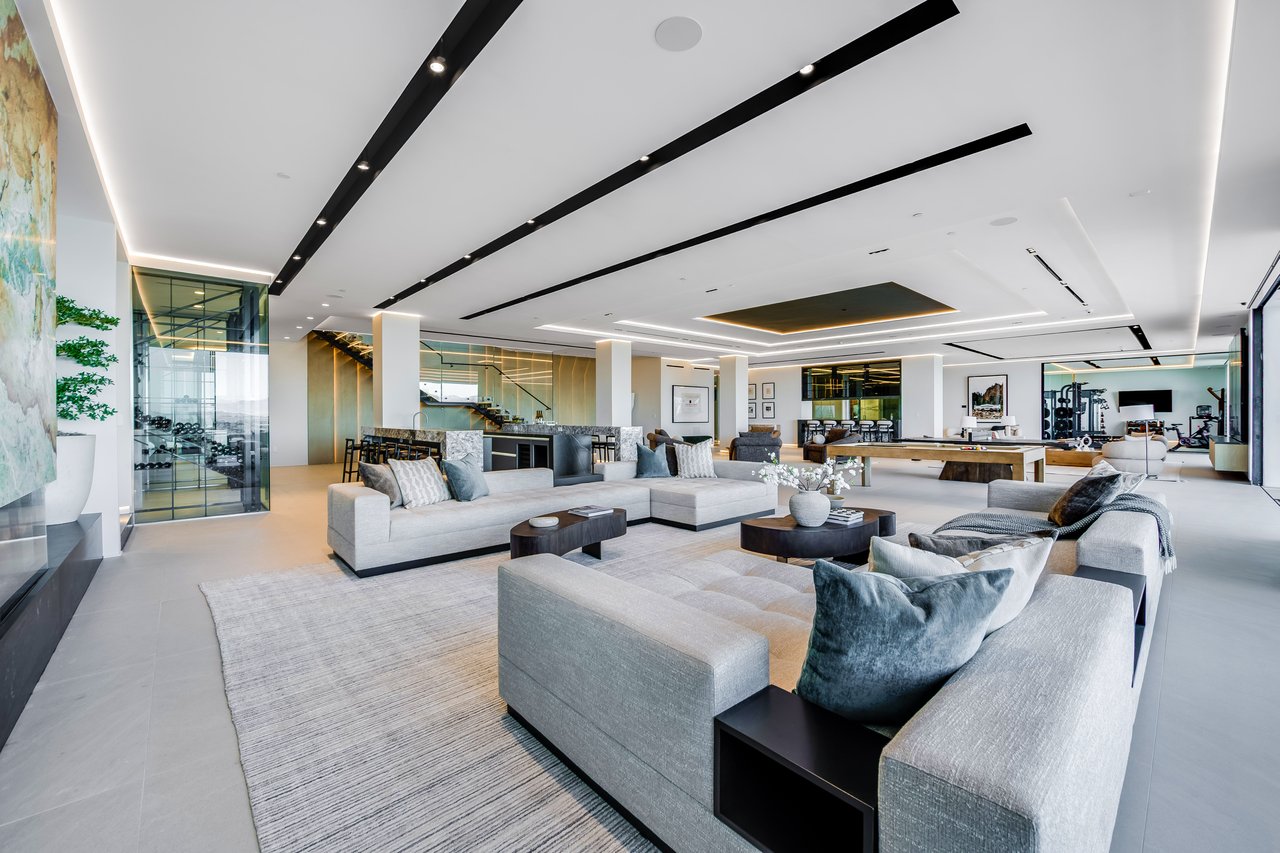 Poised above Bel Air with sweeping city, canyon, and reservoir views, this contemporary architectural estate is defined by luminous design, sculptural form, and a refined connection to nature. Approached through a double-gated entry and expansive motor court, the residence reveals a striking facade enhanced by custom illumination and serene reflecting water features anchored by mature olive trees. Backlit onyx columns frame the entrance, setting a tone of quiet sophistication.The main living pavilion offers an open, radiant flow for dining and relaxation, surrounded by full-height automatic glass doors, refined stone surfaces, warm wood tones, and breathtaking views throughout. A floating green onyx staircase connects each level, thoughtfully designed to inspire and maximize light across the home.A chef's culinary haven, the residence features four kitchens designed for entertaining, professional preparation, and seamless service. The main level kitchen is equipped with dual oversized islands, a full suite of Gaggenau appliances, European cabinetry, and a walk-in industrial stainless-steel refrigeration room. A separate restaurant-grade chef's kitchen with stainless-steel finishes and Miele appliances supports large-scale culinary preparation, complemented by a dedicated butler's kitchen and an outdoor kitchen with pizza oven for catered events at scale.The entertainment level is a world unto itself, featuring a private two-lane bowling alley, cinema-grade theater, sophisticated lounge and bar, and a temperature-controlled wine cellar. A full private wellness retreat includes a Turkish hammam with dry sauna, steam room, cold plunge, hot tub, massage tables, hair and nail salon, juice bar, and a glass-enclosed fitness studio oriented toward expansive views.The upper level hosts the primary suite, a private sanctuary with panoramic vistas, dual walk-in closets, and dual bathrooms finished in marble and onyx, each appointed with TOTO smart systems. Three additional ensuite bedrooms feature floor-to-ceiling glass, custom closets, and serene natural finishes.Outdoor living is highlighted by an infinity-edge pool blending into the horizon, expansive stone terraces, fire features, softly illuminated landscaping, and a private hillside vineyard that enhances the home's sense of retreat. A refined contemporary estate, this tour de force embodies elegance, innovation, and tranquility in one of Bel Air's most elevated settings.