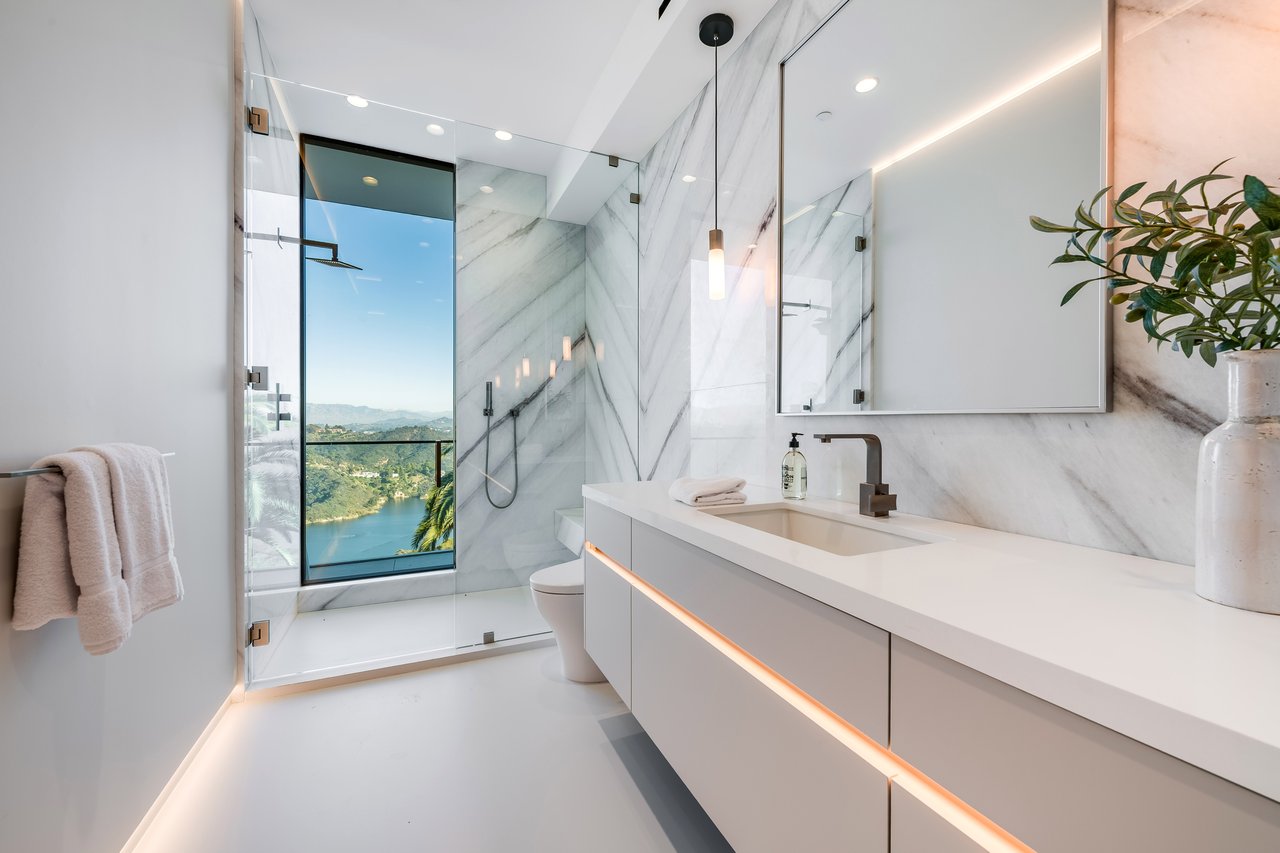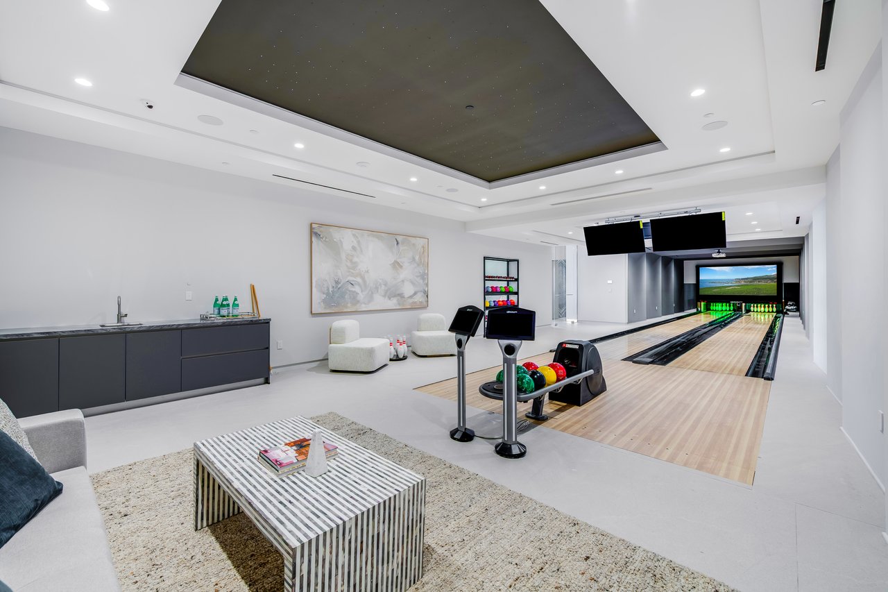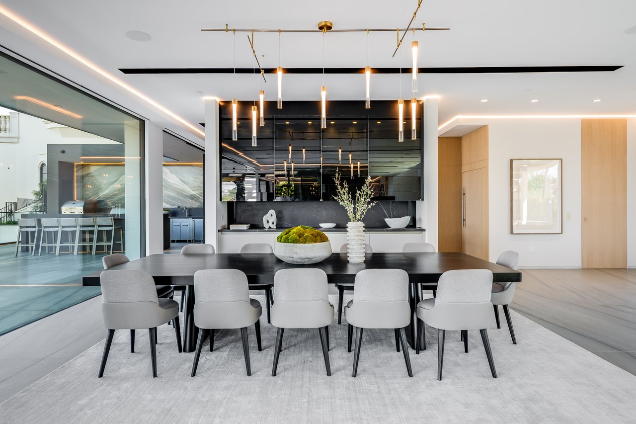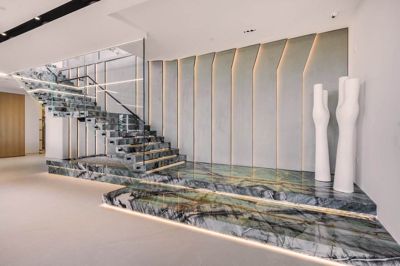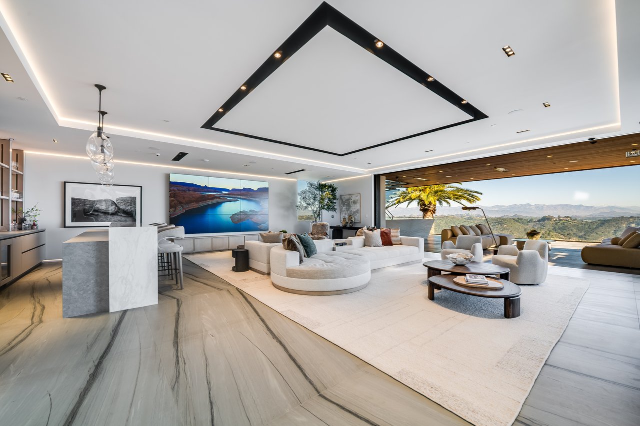 Poised above Bel Air with sweeping city, canyon, and reservoir views, this contemporary architectural estate is defined by luminous design, sculptural form, and a refined connection to nature. Approached through a double-gated entry and expansive motor court, the residence reveals a striking facade enhanced by custom illumination and serene reflecting water features anchored by mature olive trees. Backlit onyx columns frame the entrance, setting a tone of quiet sophistication.The main living pavilion offers an open, radiant flow for dining and relaxation, surrounded by full-height automatic glass doors, refined stone surfaces, warm wood tones, and breathtaking views throughout. A floating green onyx staircase connects each level, thoughtfully designed to inspire and maximize light across the home.A chef's culinary haven, the residence features four kitchens designed for entertaining, professional preparation, and seamless service. The main level kitchen is equipped with dual oversized islands, a full suite of Gaggenau appliances, European cabinetry, and a walk-in industrial stainless-steel refrigeration room. A separate restaurant-grade chef's kitchen with stainless-steel finishes and Miele appliances supports large-scale culinary preparation, complemented by a dedicated butler's kitchen and an outdoor kitchen with pizza oven for catered events at scale.The entertainment level is a world unto itself, featuring a private two-lane bowling alley, cinema-grade theater, sophisticated lounge and bar, and a temperature-controlled wine cellar. A full private wellness retreat includes a Turkish hammam with dry sauna, steam room, cold plunge, hot tub, massage tables, hair and nail salon, juice bar, and a glass-enclosed fitness studio oriented toward expansive views.The upper level hosts the primary suite, a private sanctuary with panoramic vistas, dual walk-in closets, and dual bathrooms finished in marble and onyx, each appointed with TOTO smart systems. Three additional ensuite bedrooms feature floor-to-ceiling glass, custom closets, and serene natural finishes.Outdoor living is highlighted by an infinity-edge pool blending into the horizon, expansive stone terraces, fire features, softly illuminated landscaping, and a private hillside vineyard that enhances the home's sense of retreat. A refined contemporary estate, this tour de force embodies elegance, innovation, and tranquility in one of Bel Air's most elevated settings.