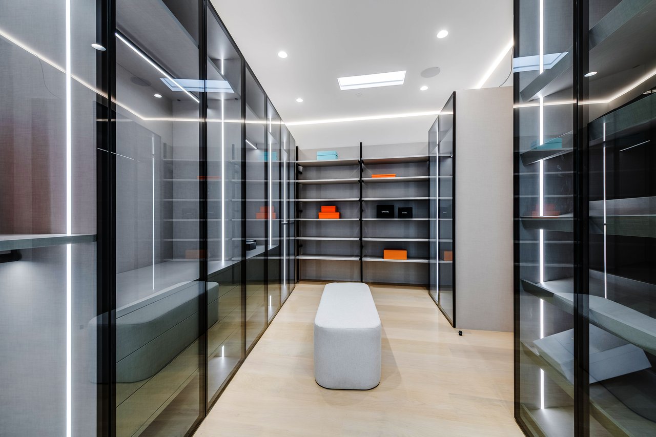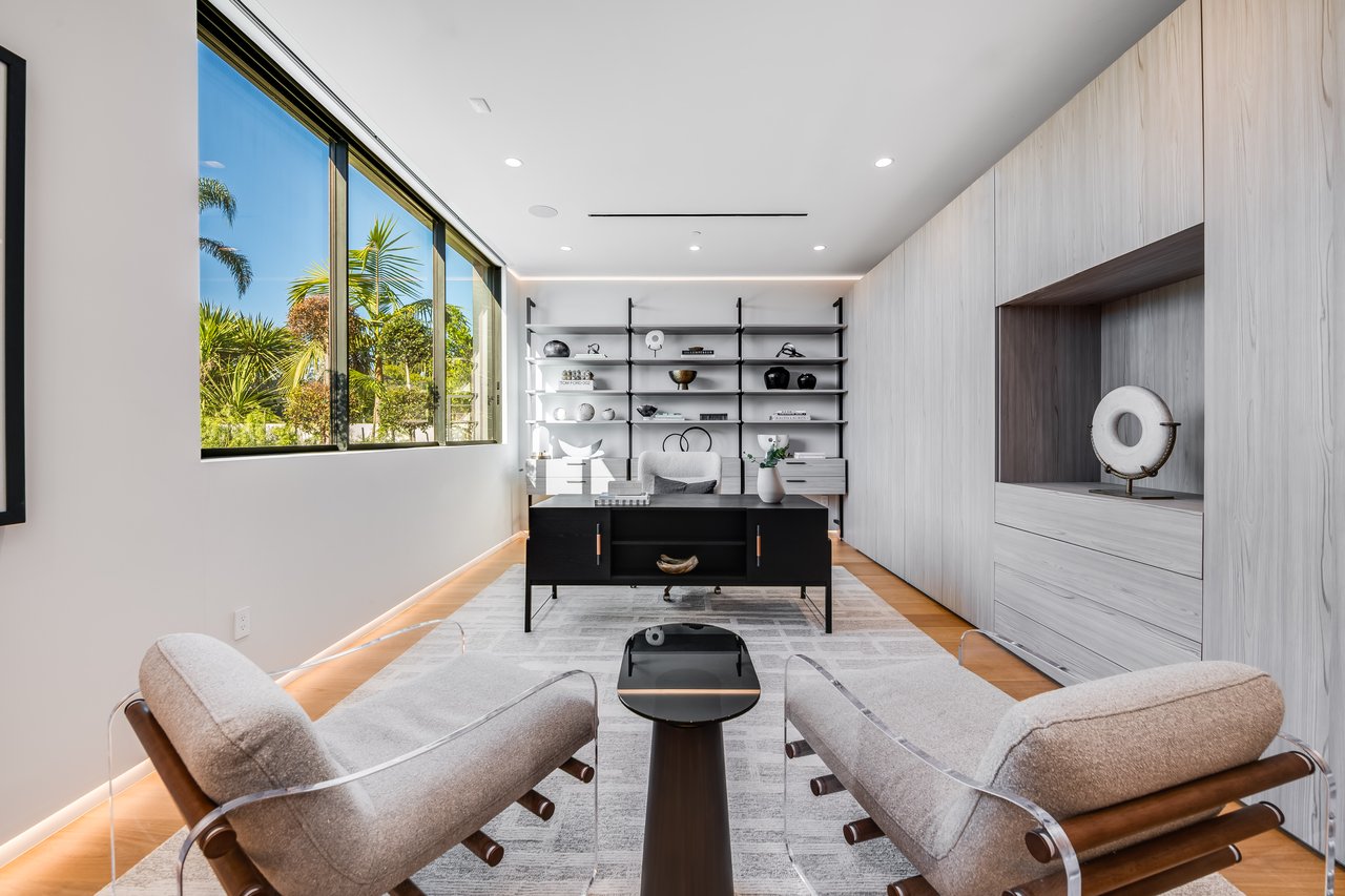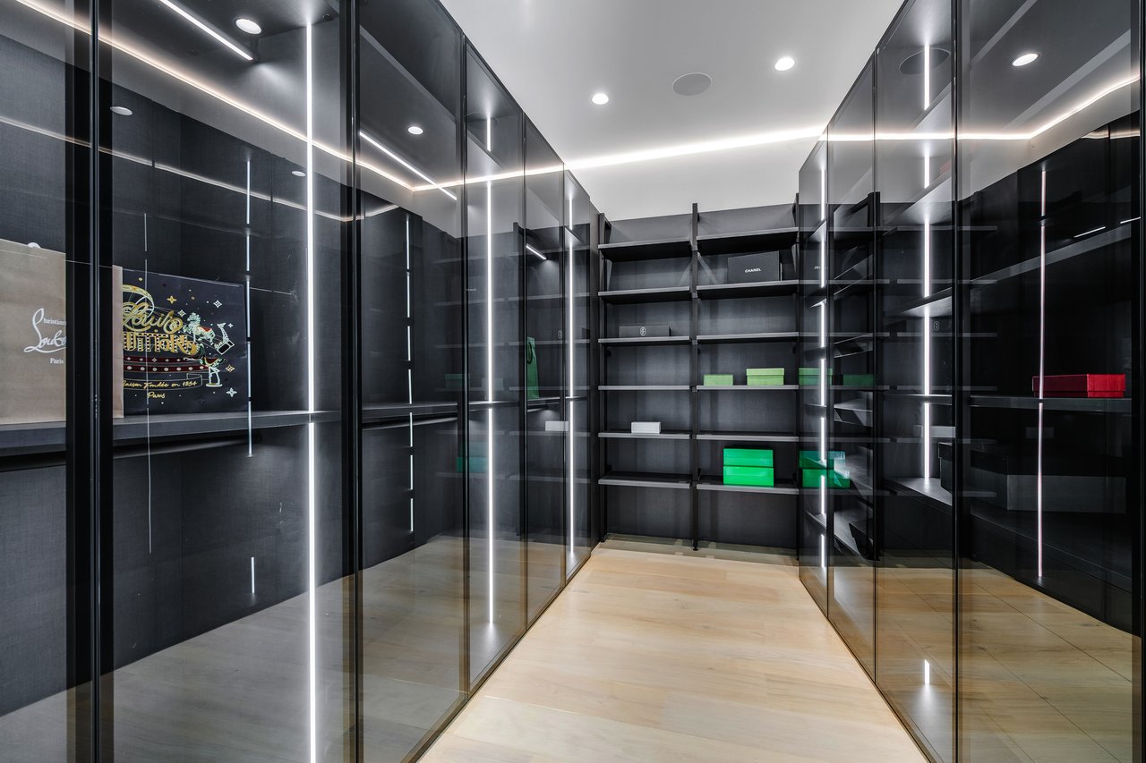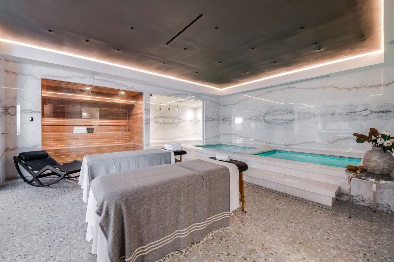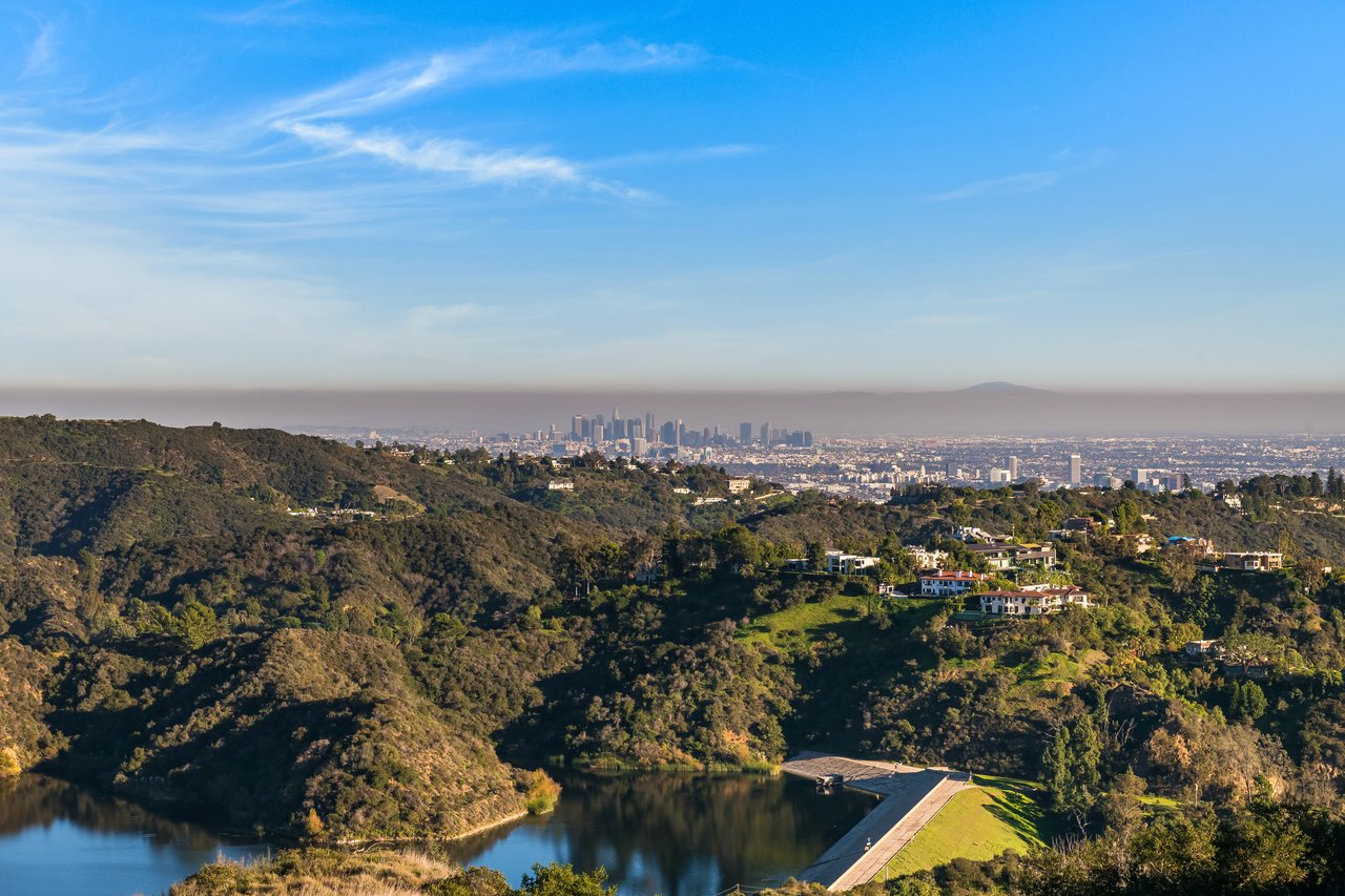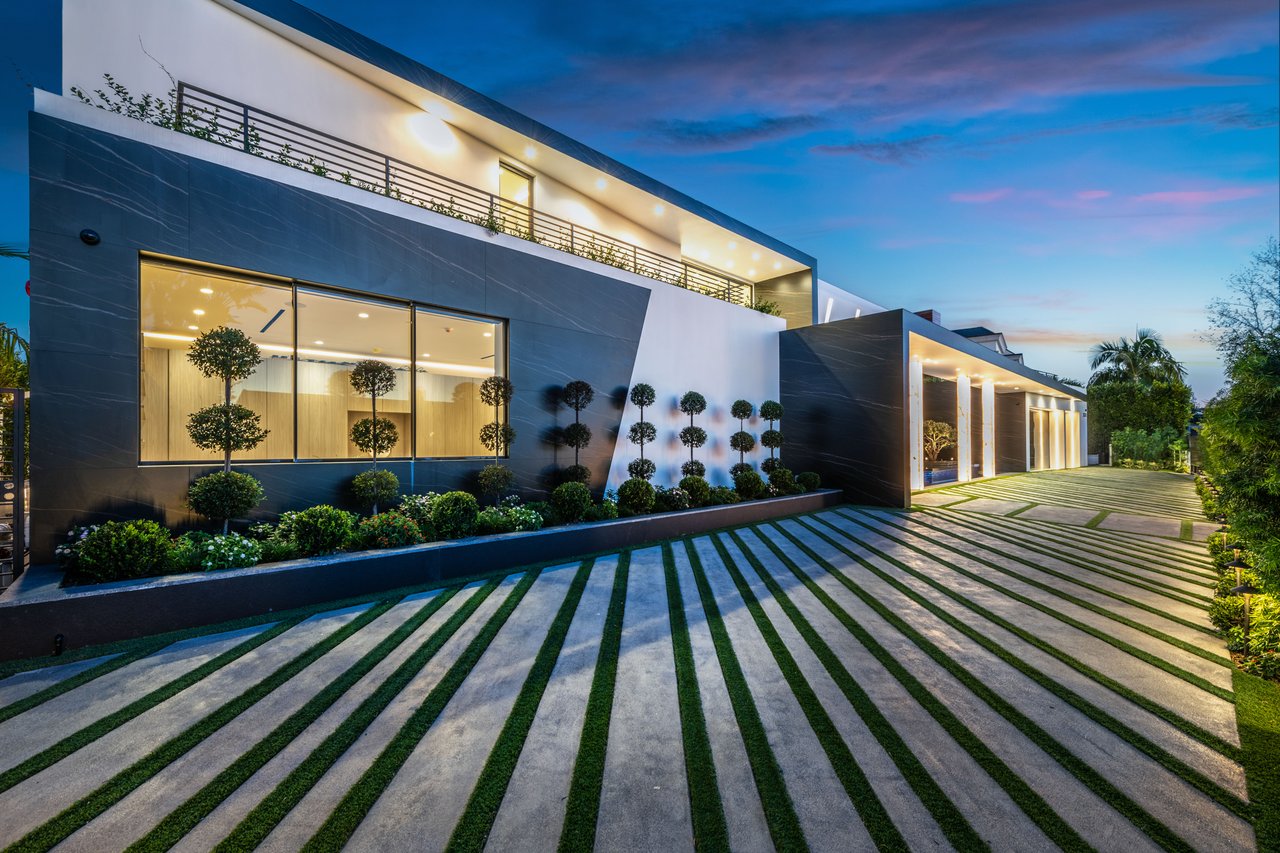 Poised above Bel Air with sweeping city, canyon, and reservoir views, this contemporary architectural estate is defined by luminous design, sculptural form, and a refined connection to nature. Approached through a double-gated entry and expansive motor court, the residence reveals a striking facade enhanced by custom illumination and serene reflecting water features anchored by mature olive trees. Backlit onyx columns frame the entrance, setting a tone of quiet sophistication.The main living pavilion offers an open, radiant flow for dining and relaxation, surrounded by full-height automatic glass doors, refined stone surfaces, warm wood tones, and breathtaking views throughout. A floating green onyx staircase connects each level, thoughtfully designed to inspire and maximize light across the home.A chef's culinary haven, the residence features four kitchens designed for entertaining, professional preparation, and seamless service. The main level kitchen is equipped with dual oversized islands, a full suite of Gaggenau appliances, European cabinetry, and a walk-in industrial stainless-steel refrigeration room. A separate restaurant-grade chef's kitchen with stainless-steel finishes and Miele appliances supports large-scale culinary preparation, complemented by a dedicated butler's kitchen and an outdoor kitchen with pizza oven for catered events at scale.The entertainment level is a world unto itself, featuring a private two-lane bowling alley, cinema-grade theater, sophisticated lounge and bar, and a temperature-controlled wine cellar. A full private wellness retreat includes a Turkish hammam with dry sauna, steam room, cold plunge, hot tub, massage tables, hair and nail salon, juice bar, and a glass-enclosed fitness studio oriented toward expansive views.The upper level hosts the primary suite, a private sanctuary with panoramic vistas, dual walk-in closets, and dual bathrooms finished in marble and onyx, each appointed with TOTO smart systems. Three additional ensuite bedrooms feature floor-to-ceiling glass, custom closets, and serene natural finishes.Outdoor living is highlighted by an infinity-edge pool blending into the horizon, expansive stone terraces, fire features, softly illuminated landscaping, and a private hillside vineyard that enhances the home's sense of retreat. A refined contemporary estate, this tour de force embodies elegance, innovation, and tranquility in one of Bel Air's most elevated settings.