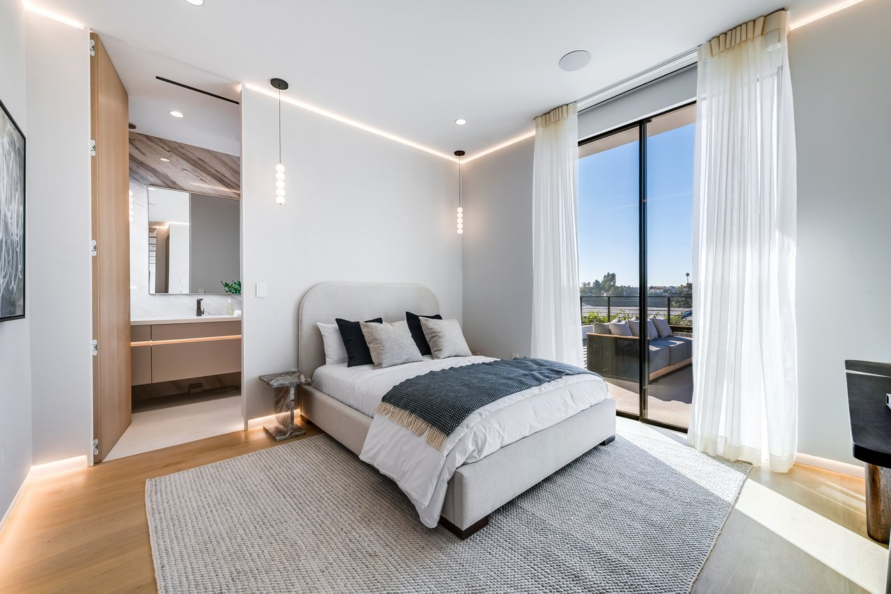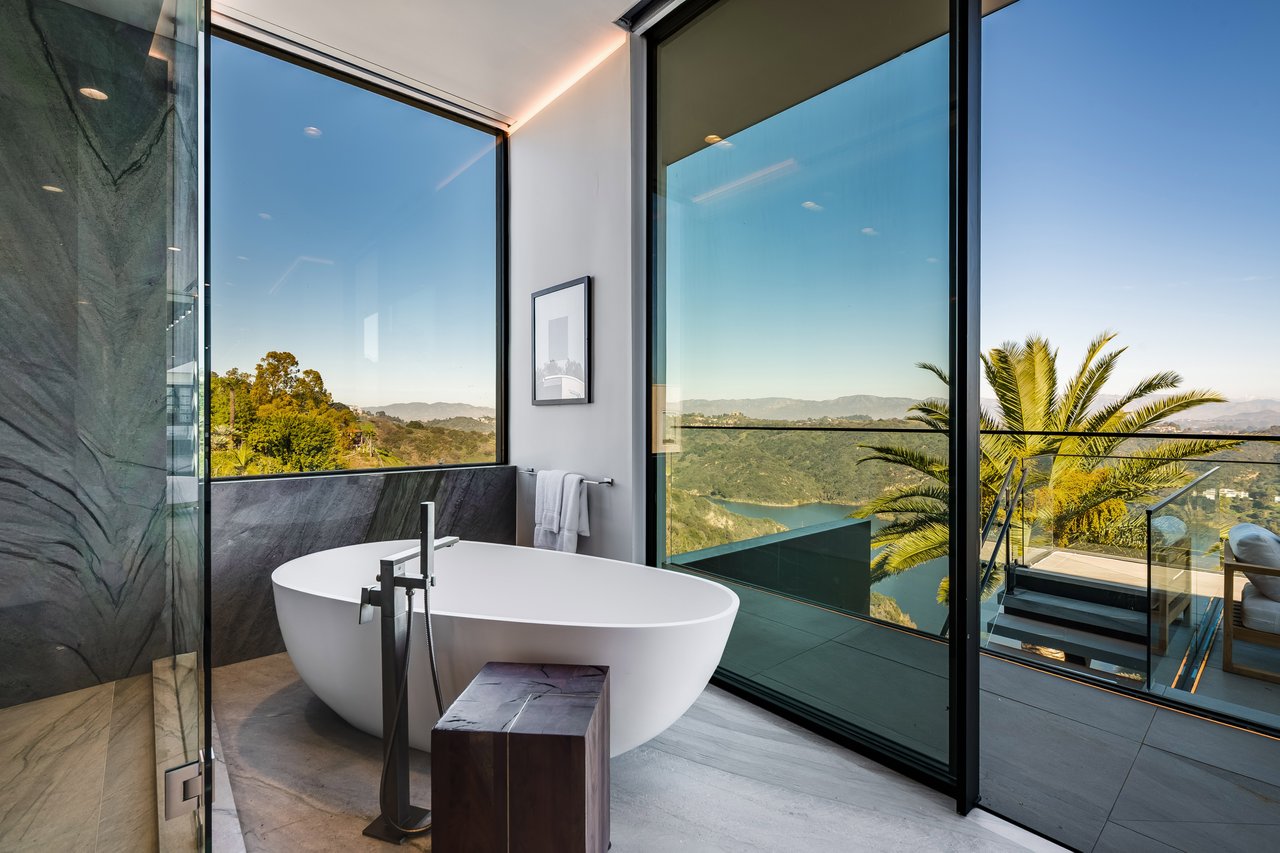 Poised above Bel Air with sweeping city, canyon, and reservoir views, this contemporary architectural estate is defined by luminous design, sculptural form, and a refined connection to nature. Approached through a double-gated entry and expansive motor court, the residence reveals a striking faca...