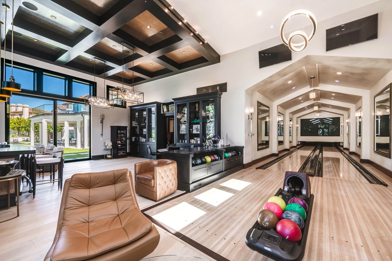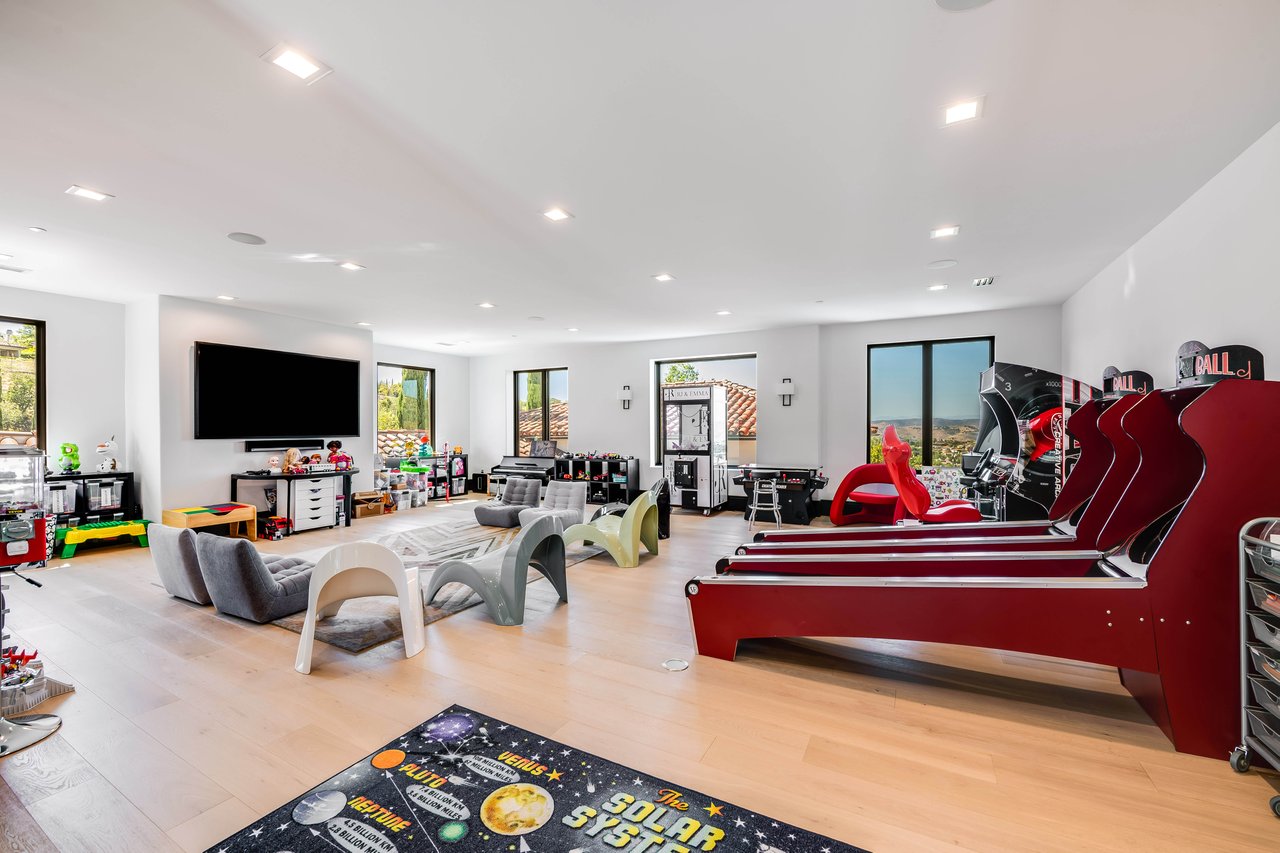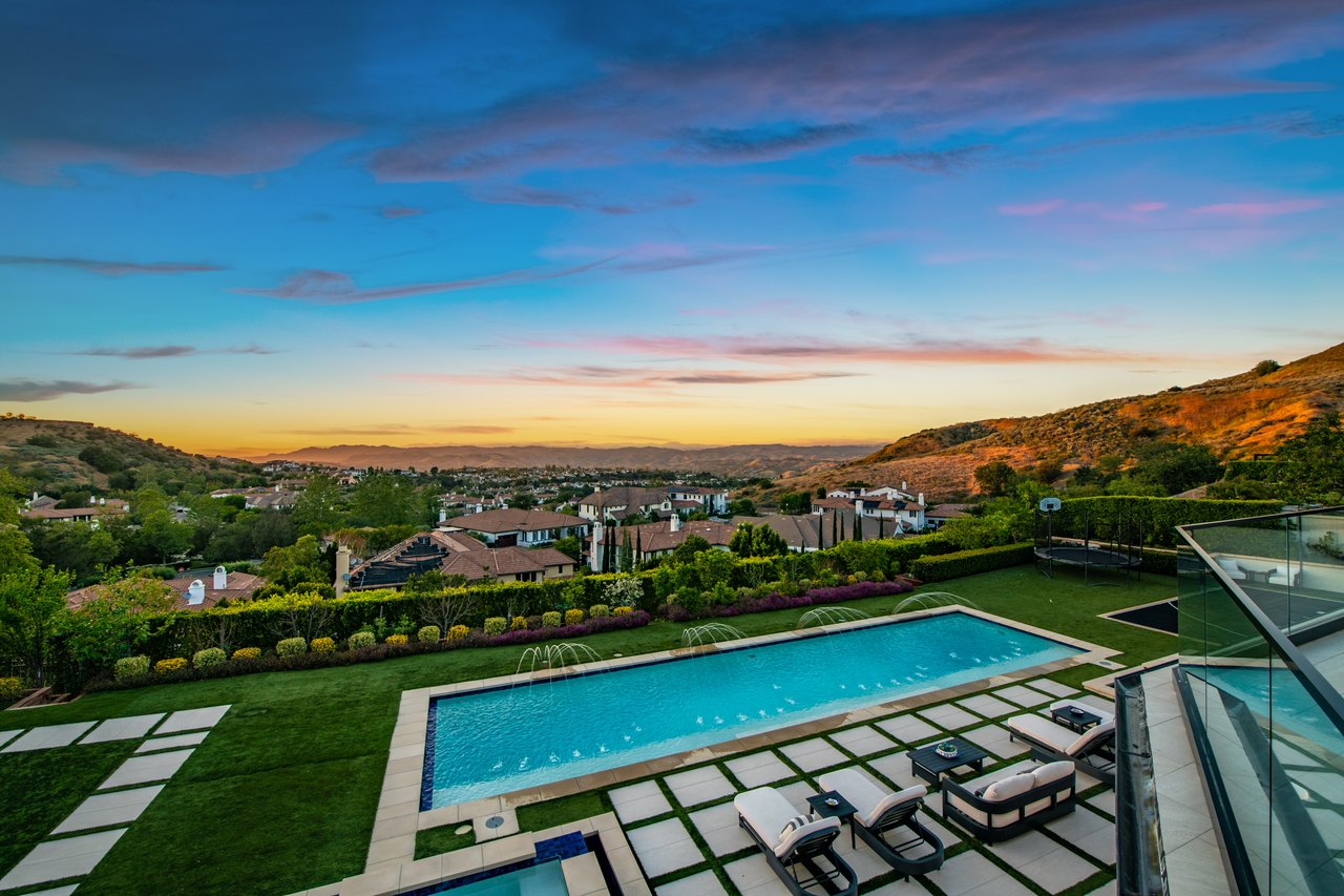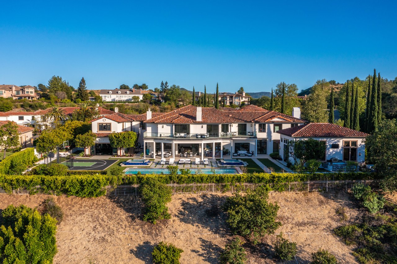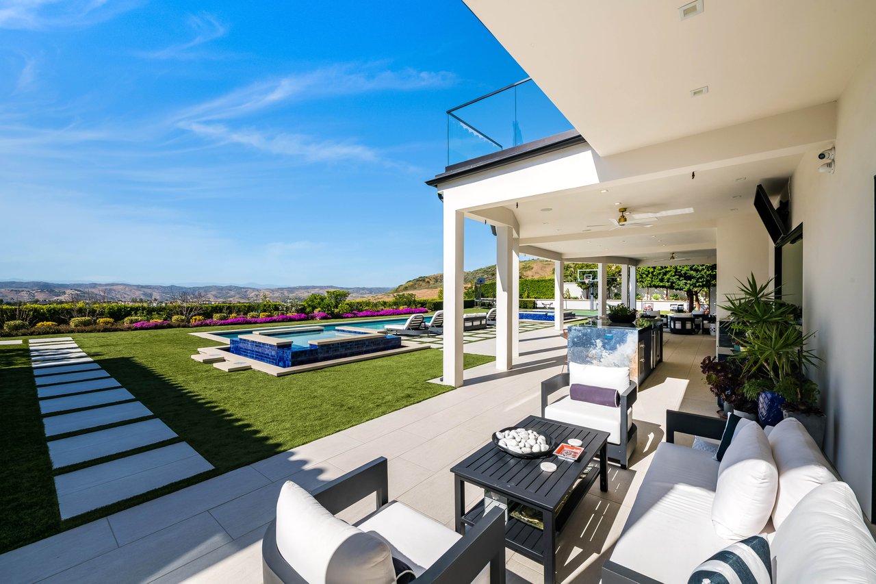 Tucked behind double gates with sweeping sunset views and 24-hour security, "The Estates at The Oaks" is an exceptionally exclusive enclave of approximately 50 homes. This remarkable warm Modern Villa presents a compelling blend of architectural scale, refined materials, and seamless indoor-outdoor living. Set on nearly an acre and spanning approx. 16,100 sq.ft., the home has been tastefully re-constructed to deliver a clean modern aesthetic with an emphasis on comfort, elegance, entertaining and energetic vibrance. 8 on-suite bedrooms and 12 bathrooms are thoughtfully distributed throughout the property providing ample space and privacy yet warm and family oriented. A private 2-bedroom guest residence complete with its own kitchen and living space, well suited for extended stays, staff quarters, or a separate work environment. The interiors are both expansive and inviting. A dramatic entry introduces the home's scale, leading to a series of open yet defined living spaces. The main gathering areas are anchored by a refined great room, where a linear fireplace, custom millwork, and expansive glass doors create a seamless transition to the outdoors. The kitchen was designed with zero expense spared & so much attention to detail on the finishes providing beauty, function and convenience consisting of custom cabinetry, a substantial stone island, integrated appliances, and a fully equipped secondary prep kitchen discreetly positioned for entertaining. A temperature-controlled glass wine display adds a sculptural & visually artistic element to the space. Amenities throughout the home are curated for both relaxation and recreation. A private theater with tiered seating, a two-lane bowling alley which includes a great space for entertaining and or lounging with friends and family, a dedicated bar with entertaining area, and a full gym with direct outdoor access all contribute to the home's conveniently accessible floor plan. A private elevator connects each level with ease. The primary suite offers a quiet retreat, complete with a sitting area, massage room, built-in coffee bar, and dual dressing rooms. The primary bath was finished with a spa-like palette featuring a soaking tub, floating vanities, and a very generous walk-in shower surrounded by the finest stone. Walls of glass throughout the home capture wide-ranging views of the surrounding hills with direct sunset views nightly bringing in natural light and reinforcing the home's connection to nature and the outdoors. The property is designed to function as a private resort. A zero-edge pool with integrated audio, two separate spas, multiple lounge areas, and a fully equipped outdoor kitchen including pizza oven and built-in grill, create an ideal setting for both large-scale entertaining and everyday enjoyment. A professional-grade sports court further enhances the grounds. Advanced systems, including Lutron lighting and Crestron automation, provide intuitive control over lighting, climate, security, and entertainment. This pristine estate was well executed with both design and livability in mind and offers a one-of-a-kind residential living experience within one of Calabasas' most sought-after guard-gated communities.