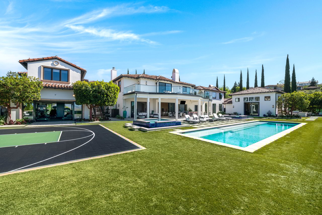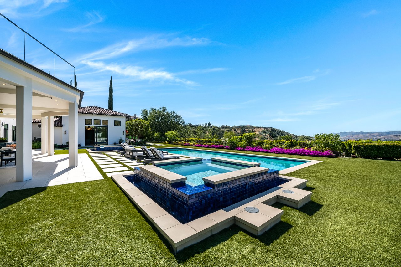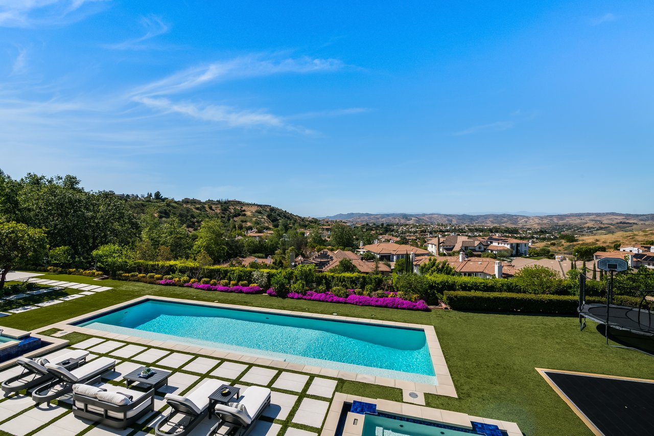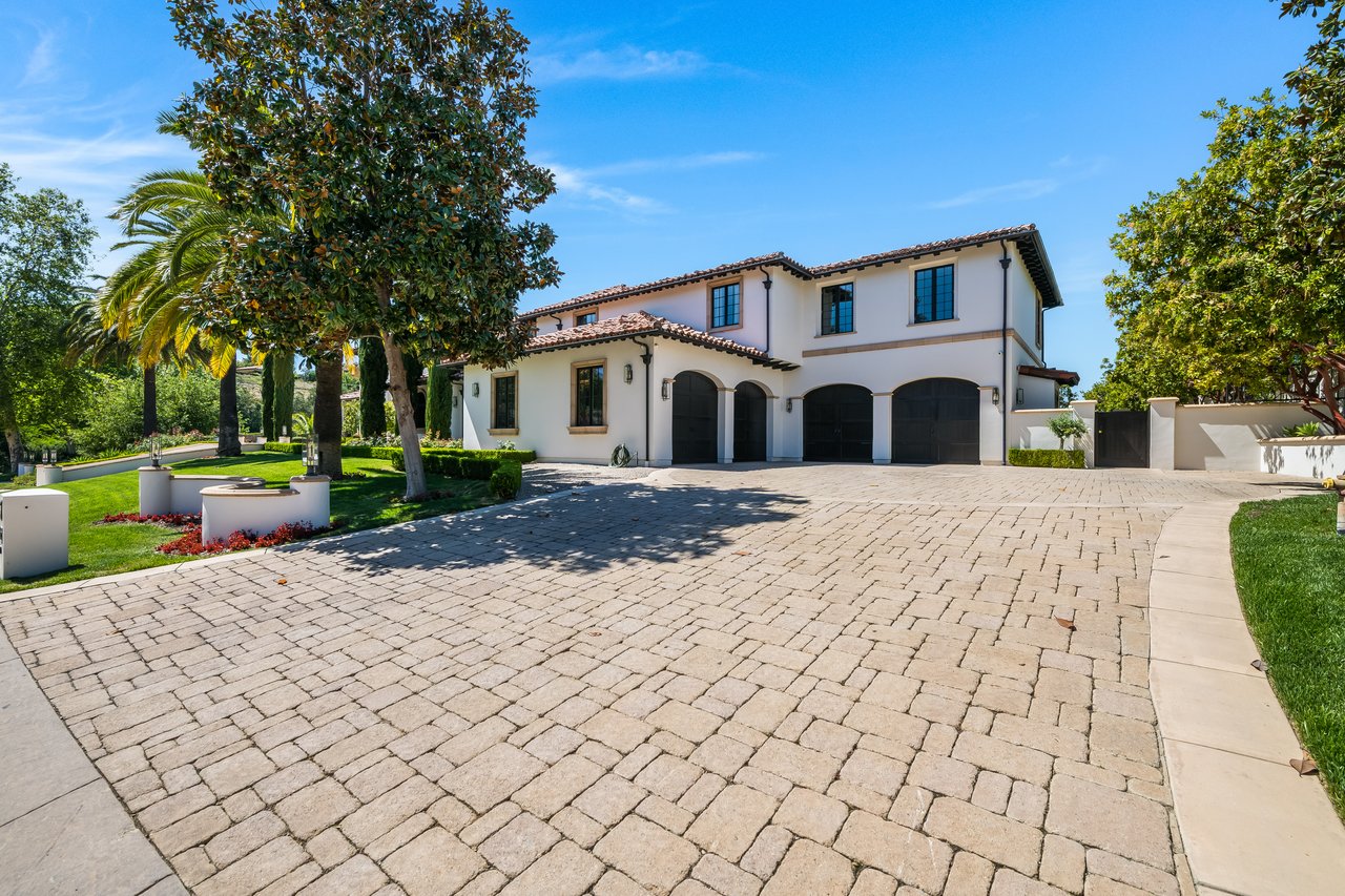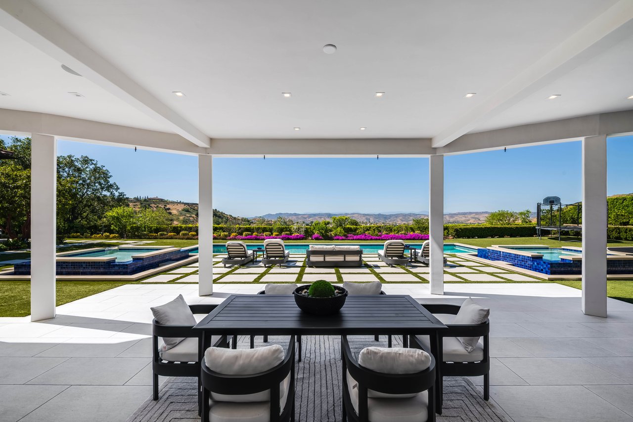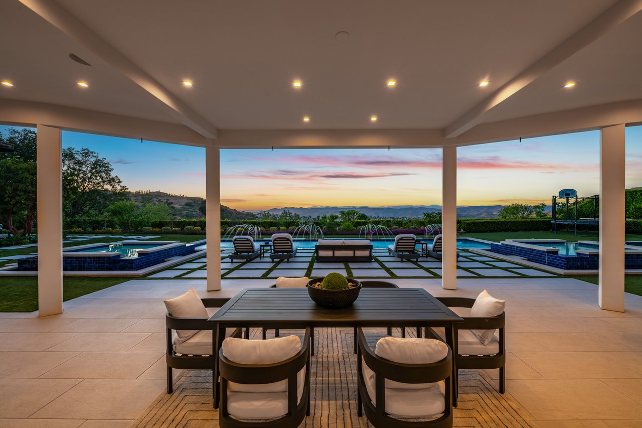 Tucked behind double gates with sweeping sunset views and 24-hour security, "The Estates at The Oaks" is an exceptionally exclusive enclave of approximately 50 homes. This remarkable warm Modern Villa presents a compelling blend of architectural scale, refined materials, and seamless indoor-outdoor living. Set on nearly an acre and spanning approx. 16,100 sq.ft., the home has been tastefully re-constructed to deliver a clean modern aesthetic with an emphasis on comfort, elegance, entertaining and energetic vibrance. 8 on-suite bedrooms and 12 bathrooms are thoughtfully distributed throughout the property providing ample space and privacy yet warm and family oriented. A private 2-bedroom guest residence complete with its own kitchen and living space, well suited for extended stays, staff quarters, or a separate work environment. The interiors are both expansive and inviting. A dramatic entry introduces the home's scale, leading to a series of open yet defined living spaces. The main gathering areas are anchored by a refined great room, where a linear fireplace, custom millwork, and expansive glass doors create a seamless transition to the outdoors. The kitchen was designed with zero expense spared & so much attention to detail on the finishes providing beauty, function and convenience consisting of custom cabinetry, a substantial stone island, integrated appliances, and a fully equipped secondary prep kitchen discreetly positioned for entertaining. A temperature-controlled glass wine display adds a sculptural & visually artistic element to the space. Amenities throughout the home are curated for both relaxation and recreation. A private theater with tiered seating, a two-lane bowling alley which includes a great space for entertaining and or lounging with friends and family, a dedicated bar with entertaining area, and a full gym with direct outdoor access all contribute to the home's conveniently accessible floor plan. A private elevator connects each level with ease. The primary suite offers a quiet retreat, complete with a sitting area, massage room, built-in coffee bar, and dual dressing rooms. The primary bath was finished with a spa-like palette featuring a soaking tub, floating vanities, and a very generous walk-in shower surrounded by the finest stone. Walls of glass throughout the home capture wide-ranging views of the surrounding hills with direct sunset views nightly bringing in natural light and reinforcing the home's connection to nature and the outdoors. The property is designed to function as a private resort. A zero-edge pool with integrated audio, two separate spas, multiple lounge areas, and a fully equipped outdoor kitchen including pizza oven and built-in grill, create an ideal setting for both large-scale entertaining and everyday enjoyment. A professional-grade sports court further enhances the grounds. Advanced systems, including Lutron lighting and Crestron automation, provide intuitive control over lighting, climate, security, and entertainment. This pristine estate was well executed with both design and livability in mind and offers a one-of-a-kind residential living experience within one of Calabasas' most sought-after guard-gated communities.