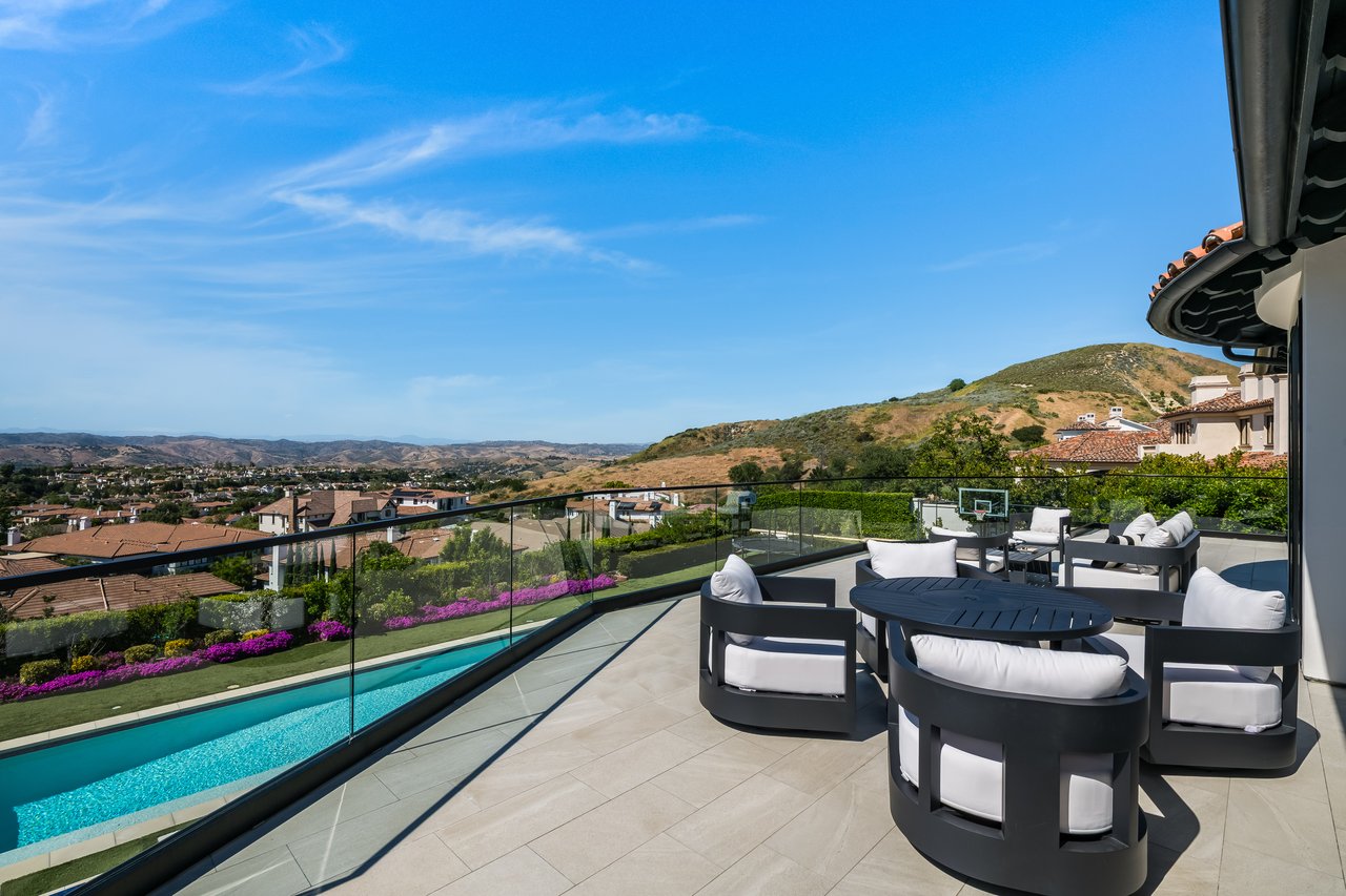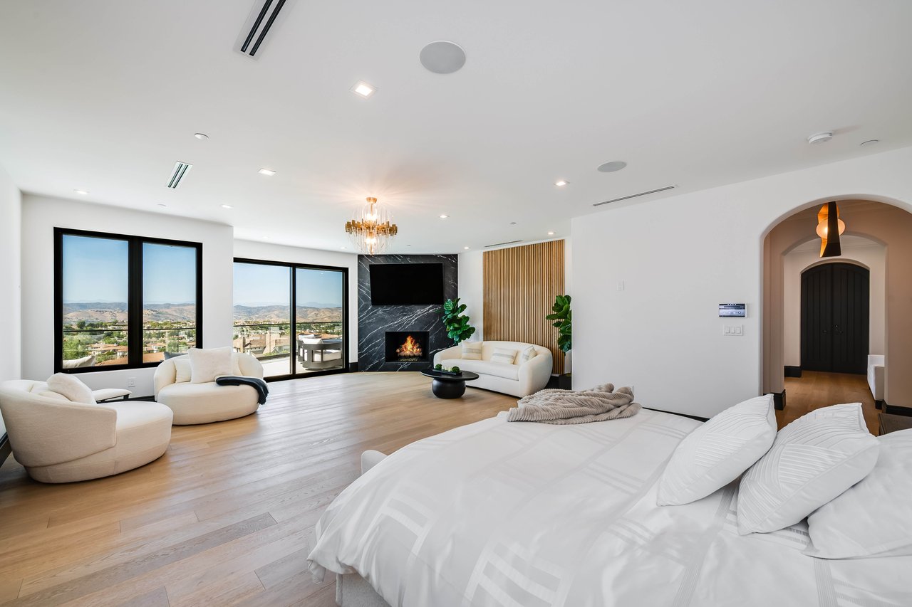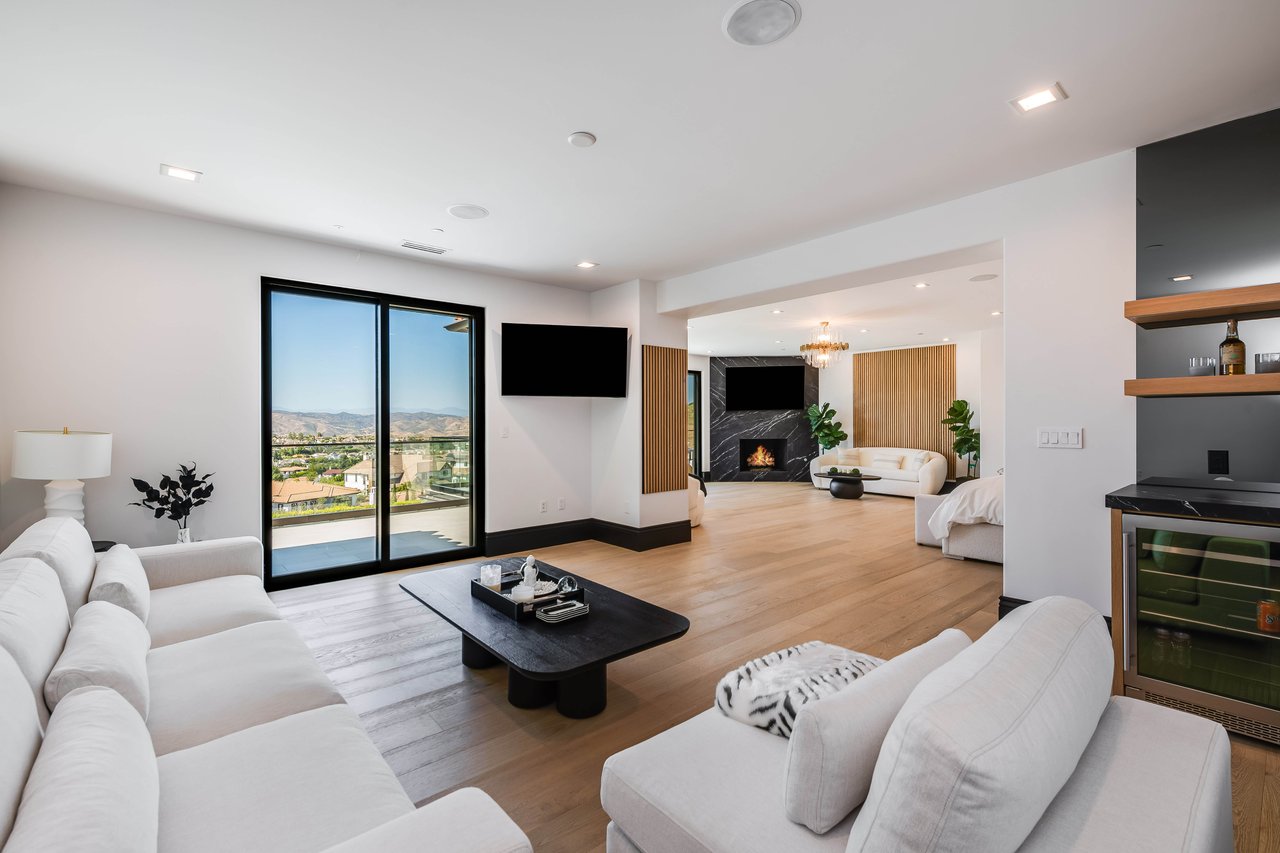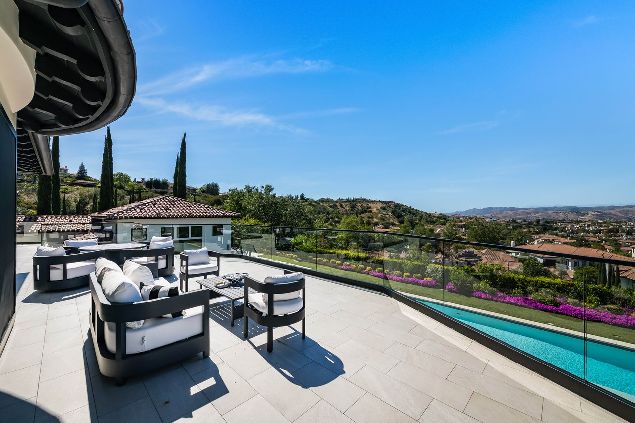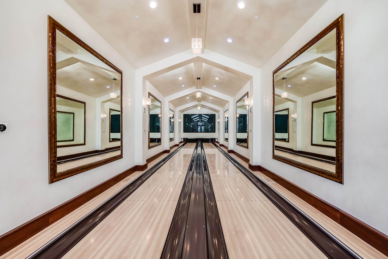 Tucked behind double gates with sweeping sunset views and 24-hour security, "The Estates at The Oaks" is an exceptionally exclusive enclave of approximately 50 homes. This remarkable warm Modern Villa presents a compelling blend of architectural scale, refined materials, and seamless indoor-outdoor living. Set on nearly an acre and spanning approx. 16,100 sq.ft., the home has been tastefully re-constructed to deliver a clean modern aesthetic with an emphasis on comfort, elegance, entertaining and energetic vibrance. 8 on-suite bedrooms and 12 bathrooms are thoughtfully distributed throughout the property providing ample space and privacy yet warm and family oriented. A private 2-bedroom guest residence complete with its own kitchen and living space, well suited for extended stays, staff quarters, or a separate work environment. The interiors are both expansive and inviting. A dramatic entry introduces the home's scale, leading to a series of open yet defined living spaces. The main gathering areas are anchored by a refined great room, where a linear fireplace, custom millwork, and expansive glass doors create a seamless transition to the outdoors. The kitchen was designed with zero expense spared & so much attention to detail on the finishes providing beauty, function and convenience consisting of custom cabinetry, a substantial stone island, integrated appliances, and a fully equipped secondary prep kitchen discreetly positioned for entertaining. A temperature-controlled glass wine display adds a sculptural & visually artistic element to the space. Amenities throughout the home are curated for both relaxation and recreation. A private theater with tiered seating, a two-lane bowling alley which includes a great space for entertaining and or lounging with friends and family, a dedicated bar with entertaining area, and a full gym with direct outdoor access all contribute to the home's conveniently accessible floor plan. A private elevator connects each level with ease. The primary suite offers a quiet retreat, complete with a sitting area, massage room, built-in coffee bar, and dual dressing rooms. The primary bath was finished with a spa-like palette featuring a soaking tub, floating vanities, and a very generous walk-in shower surrounded by the finest stone. Walls of glass throughout the home capture wide-ranging views of the surrounding hills with direct sunset views nightly bringing in natural light and reinforcing the home's connection to nature and the outdoors. The property is designed to function as a private resort. A zero-edge pool with integrated audio, two separate spas, multiple lounge areas, and a fully equipped outdoor kitchen including pizza oven and built-in grill, create an ideal setting for both large-scale entertaining and everyday enjoyment. A professional-grade sports court further enhances the grounds. Advanced systems, including Lutron lighting and Crestron automation, provide intuitive control over lighting, climate, security, and entertainment. This pristine estate was well executed with both design and livability in mind and offers a one-of-a-kind residential living experience within one of Calabasas' most sought-after guard-gated communities.