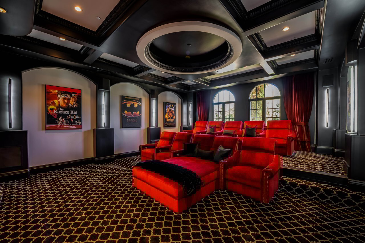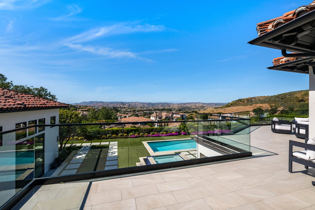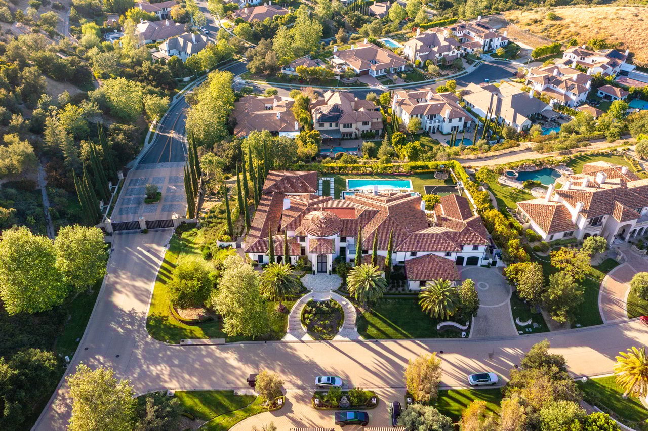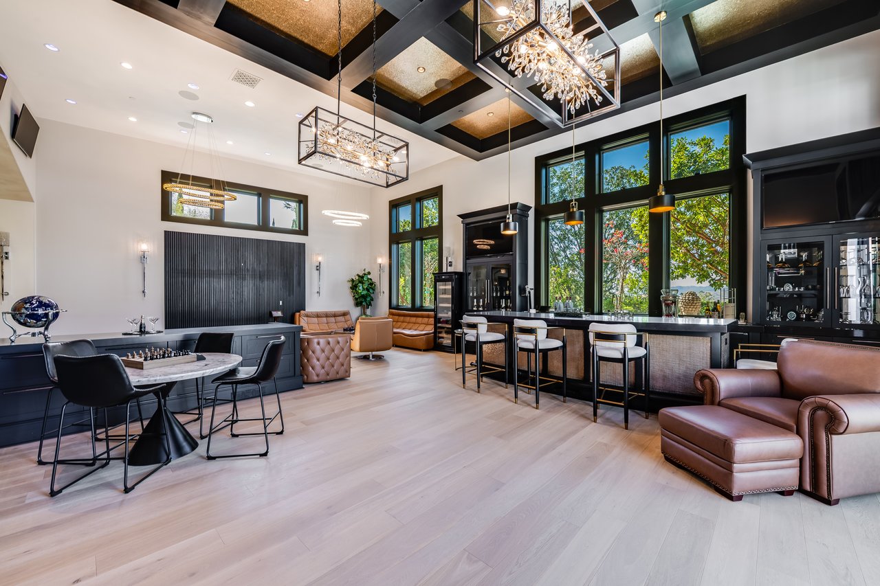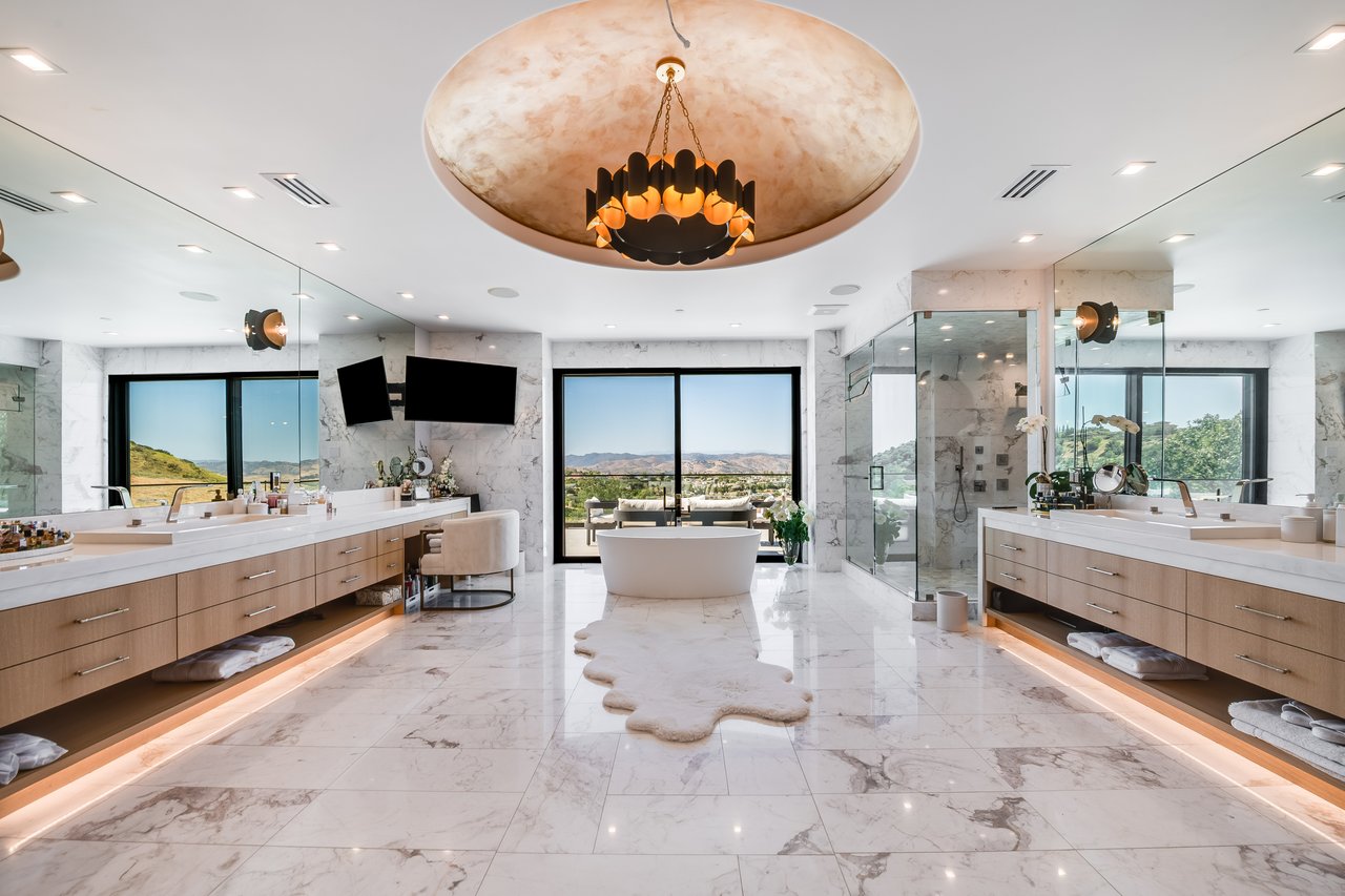 Tucked behind double gates with sweeping sunset views and 24-hour security, "The Estates at The Oaks" is an exceptionally exclusive enclave of approximately 50 homes. This remarkable warm Modern Villa presents a compelling blend of architectural scale, refined materials, and seamless indoor-outdoor living. Set on nearly an acre and spanning approx. 16,100 sq.ft., the home has been tastefully re-constructed to deliver a clean modern aesthetic with an emphasis on comfort, elegance, entertaining and energetic vibrance. 8 on-suite bedrooms and 12 bathrooms are thoughtfully distributed throughout the property providing ample space and privacy yet warm and family oriented. A private 2-bedroom guest residence complete with its own kitchen and living space, well suited for extended stays, staff quarters, or a separate work environment. The interiors are both expansive and inviting. A dramatic entry introduces the home's scale, leading to a series of open yet defined living spaces. The main gathering areas are anchored by a refined great room, where a linear fireplace, custom millwork, and expansive glass doors create a seamless transition to the outdoors. The kitchen was designed with zero expense spared & so much attention to detail on the finishes providing beauty, function and convenience consisting of custom cabinetry, a substantial stone island, integrated appliances, and a fully equipped secondary prep kitchen discreetly positioned for entertaining. A temperature-controlled glass wine display adds a sculptural & visually artistic element to the space. Amenities throughout the home are curated for both relaxation and recreation. A private theater with tiered seating, a two-lane bowling alley which includes a great space for entertaining and or lounging with friends and family, a dedicated bar with entertaining area, and a full gym with direct outdoor access all contribute to the home's conveniently accessible floor plan. A private elevator connects each level with ease. The primary suite offers a quiet retreat, complete with a sitting area, massage room, built-in coffee bar, and dual dressing rooms. The primary bath was finished with a spa-like palette featuring a soaking tub, floating vanities, and a very generous walk-in shower surrounded by the finest stone. Walls of glass throughout the home capture wide-ranging views of the surrounding hills with direct sunset views nightly bringing in natural light and reinforcing the home's connection to nature and the outdoors. The property is designed to function as a private resort. A zero-edge pool with integrated audio, two separate spas, multiple lounge areas, and a fully equipped outdoor kitchen including pizza oven and built-in grill, create an ideal setting for both large-scale entertaining and everyday enjoyment. A professional-grade sports court further enhances the grounds. Advanced systems, including Lutron lighting and Crestron automation, provide intuitive control over lighting, climate, security, and entertainment. This pristine estate was well executed with both design and livability in mind and offers a one-of-a-kind residential living experience within one of Calabasas' most sought-after guard-gated communities.