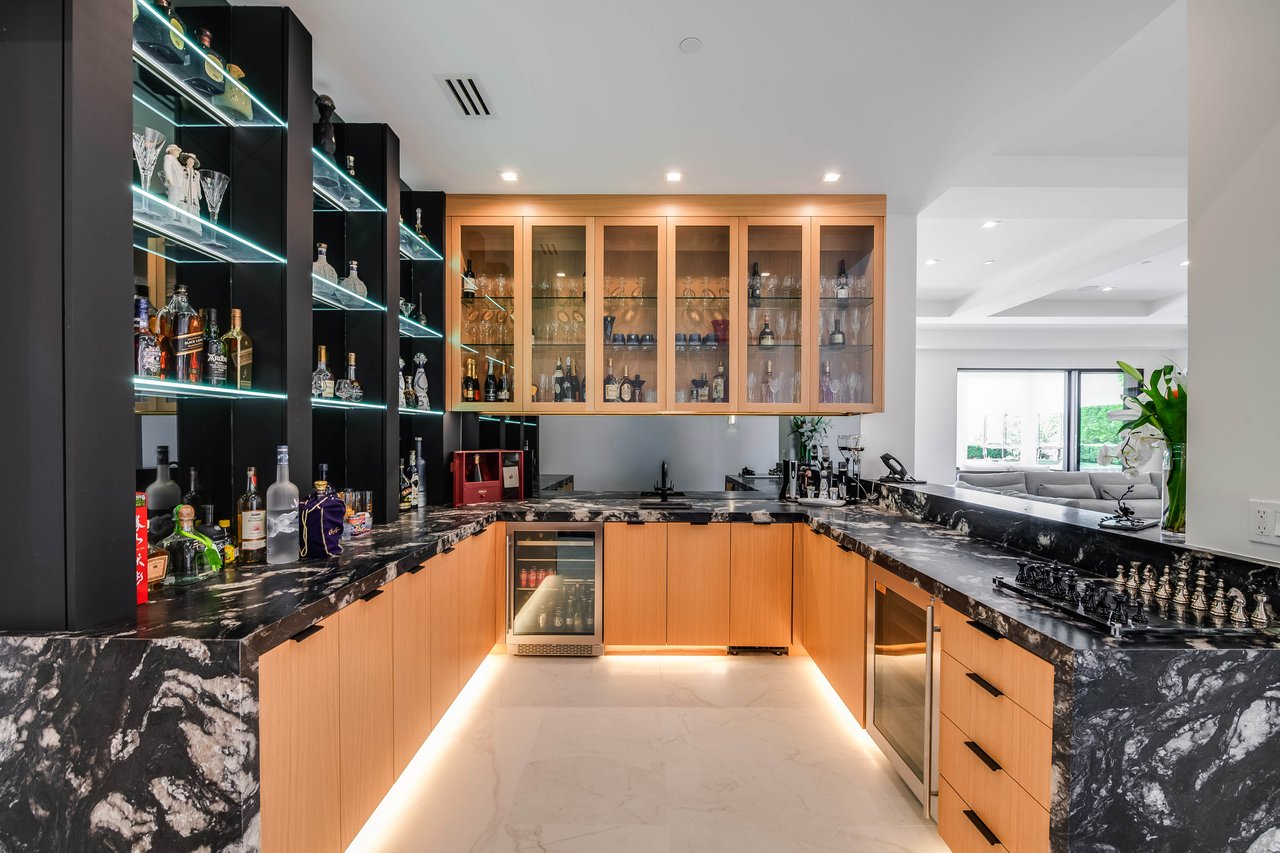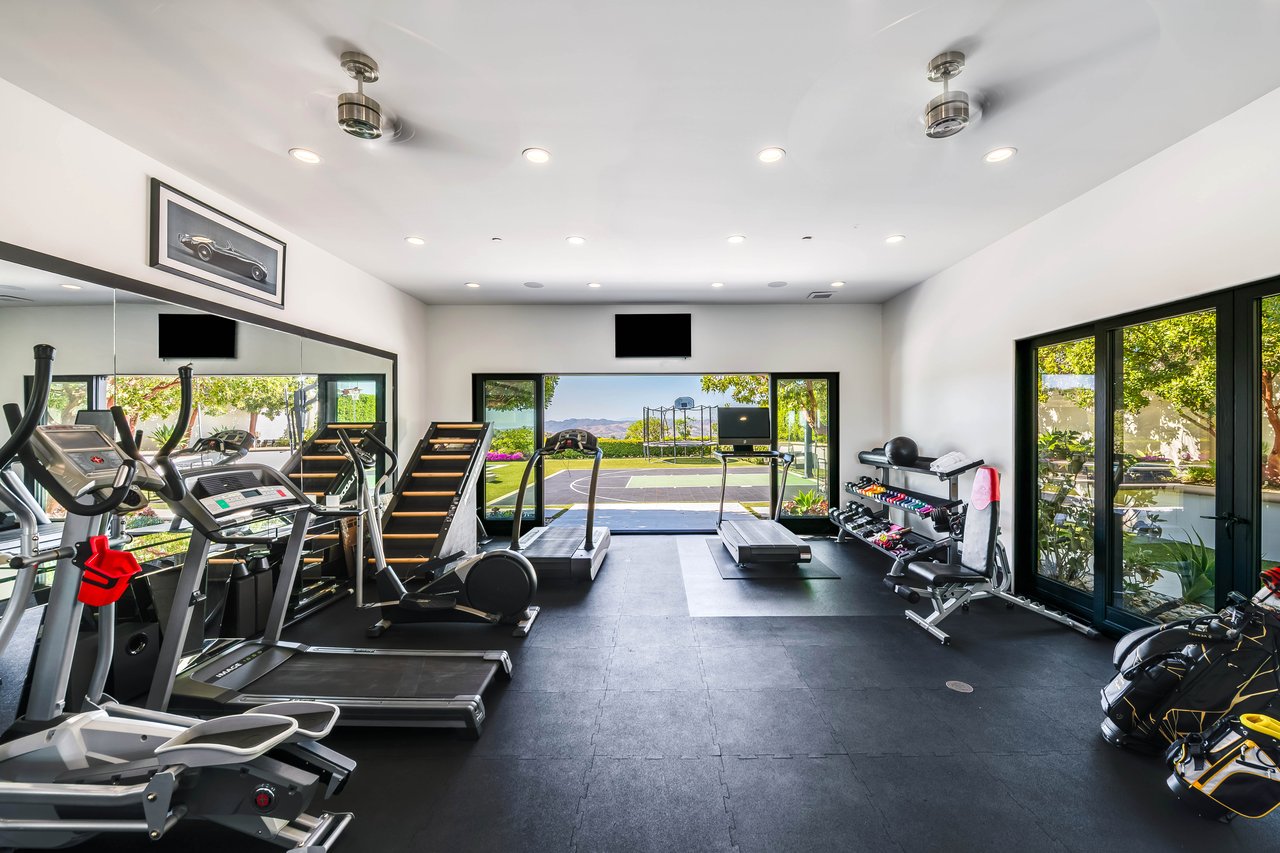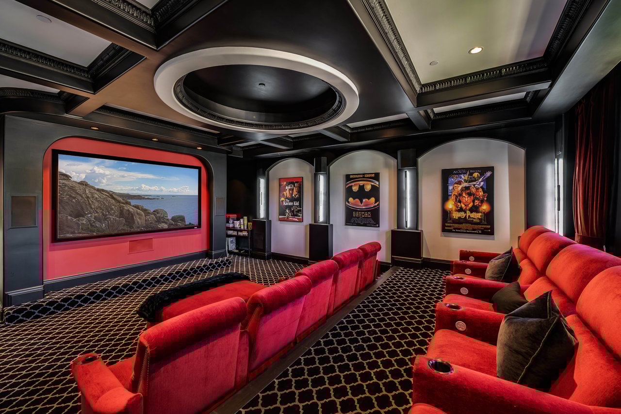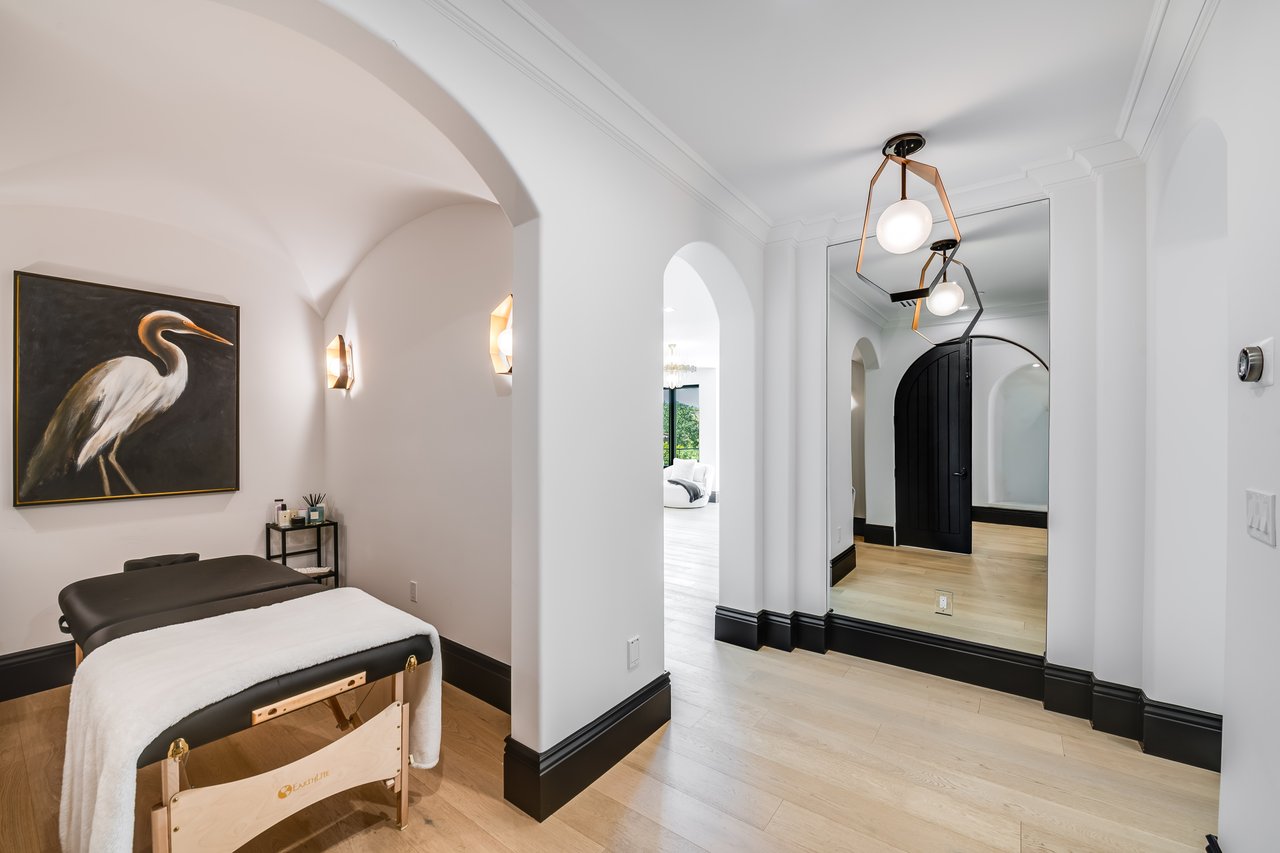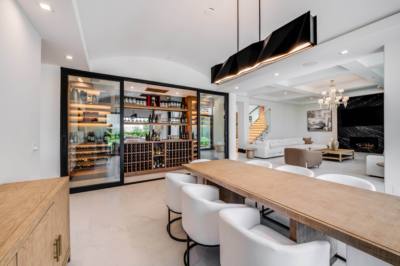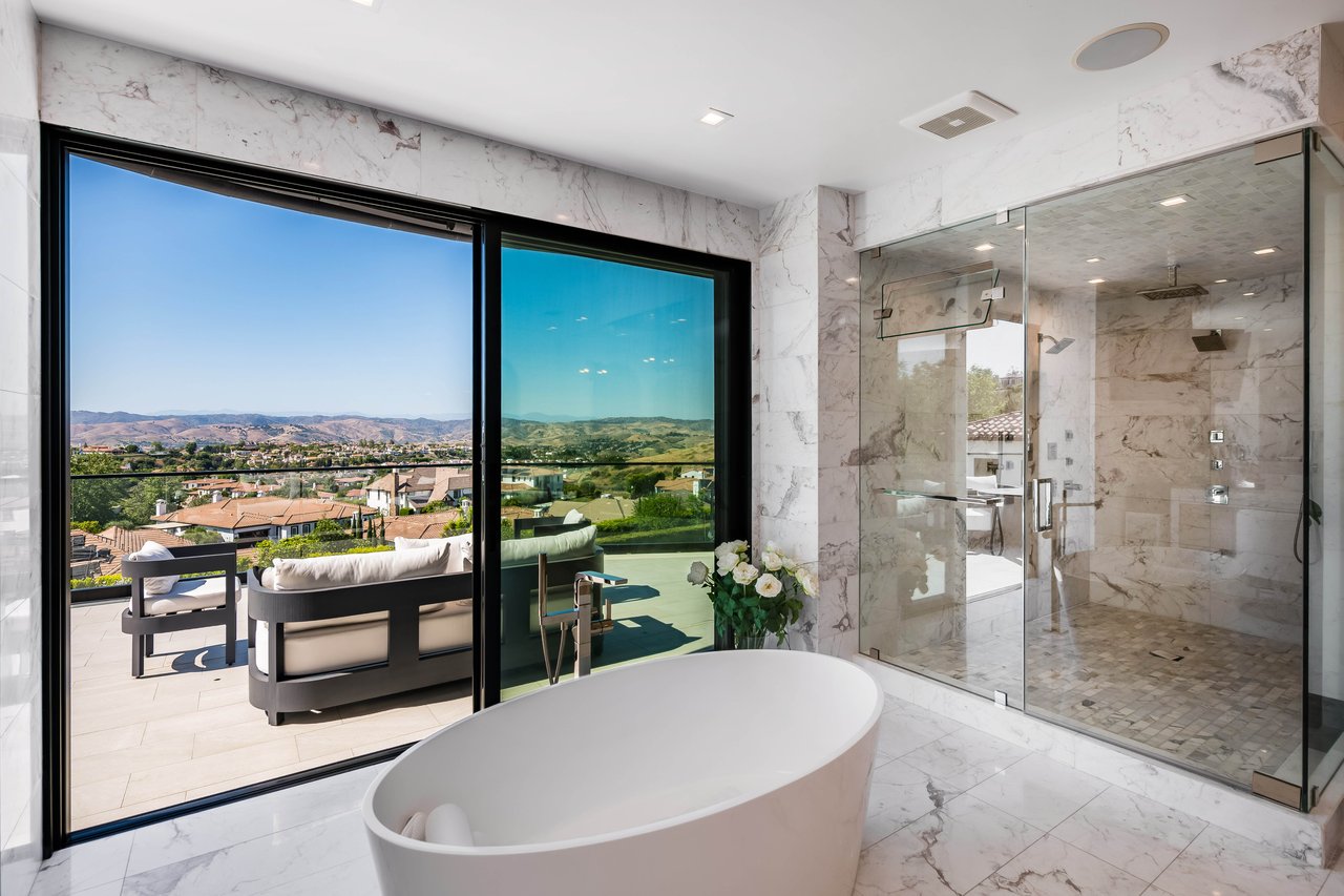 Tucked behind double gates with sweeping sunset views and 24-hour security, "The Estates at The Oaks" is an exceptionally exclusive enclave of approximately 50 homes. This remarkable warm Modern Villa presents a compelling blend of architectural scale, refined materials, and seamless indoor-outdoor living. Set on nearly an acre and spanning approx. 16,100 sq.ft., the home has been tastefully re-constructed to deliver a clean modern aesthetic with an emphasis on comfort, elegance, entertaining and energetic vibrance. 8 on-suite bedrooms and 12 bathrooms are thoughtfully distributed throughout the property providing ample space and privacy yet warm and family oriented. A private 2-bedroom guest residence complete with its own kitchen and living space, well suited for extended stays, staff quarters, or a separate work environment. The interiors are both expansive and inviting. A dramatic entry introduces the home's scale, leading to a series of open yet defined living spaces. The main gathering areas are anchored by a refined great room, where a linear fireplace, custom millwork, and expansive glass doors create a seamless transition to the outdoors. The kitchen was designed with zero expense spared & so much attention to detail on the finishes providing beauty, function and convenience consisting of custom cabinetry, a substantial stone island, integrated appliances, and a fully equipped secondary prep kitchen discreetly positioned for entertaining. A temperature-controlled glass wine display adds a sculptural & visually artistic element to the space. Amenities throughout the home are curated for both relaxation and recreation. A private theater with tiered seating, a two-lane bowling alley which includes a great space for entertaining and or lounging with friends and family, a dedicated bar with entertaining area, and a full gym with direct outdoor access all contribute to the home's conveniently accessible floor plan. A private elevator connects each level with ease. The primary suite offers a quiet retreat, complete with a sitting area, massage room, built-in coffee bar, and dual dressing rooms. The primary bath was finished with a spa-like palette featuring a soaking tub, floating vanities, and a very generous walk-in shower surrounded by the finest stone. Walls of glass throughout the home capture wide-ranging views of the surrounding hills with direct sunset views nightly bringing in natural light and reinforcing the home's connection to nature and the outdoors. The property is designed to function as a private resort. A zero-edge pool with integrated audio, two separate spas, multiple lounge areas, and a fully equipped outdoor kitchen including pizza oven and built-in grill, create an ideal setting for both large-scale entertaining and everyday enjoyment. A professional-grade sports court further enhances the grounds. Advanced systems, including Lutron lighting and Crestron automation, provide intuitive control over lighting, climate, security, and entertainment. This pristine estate was well executed with both design and livability in mind and offers a one-of-a-kind residential living experience within one of Calabasas' most sought-after guard-gated communities.