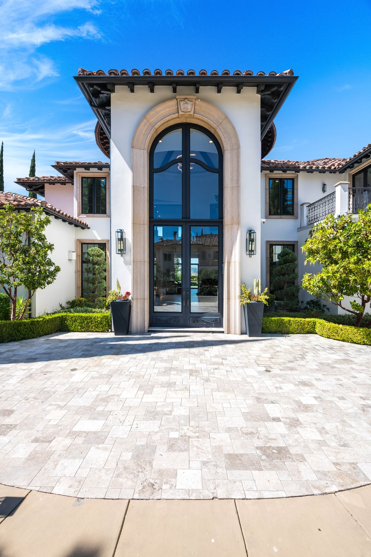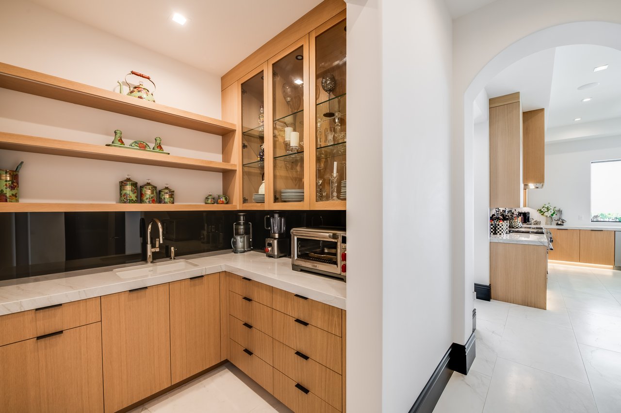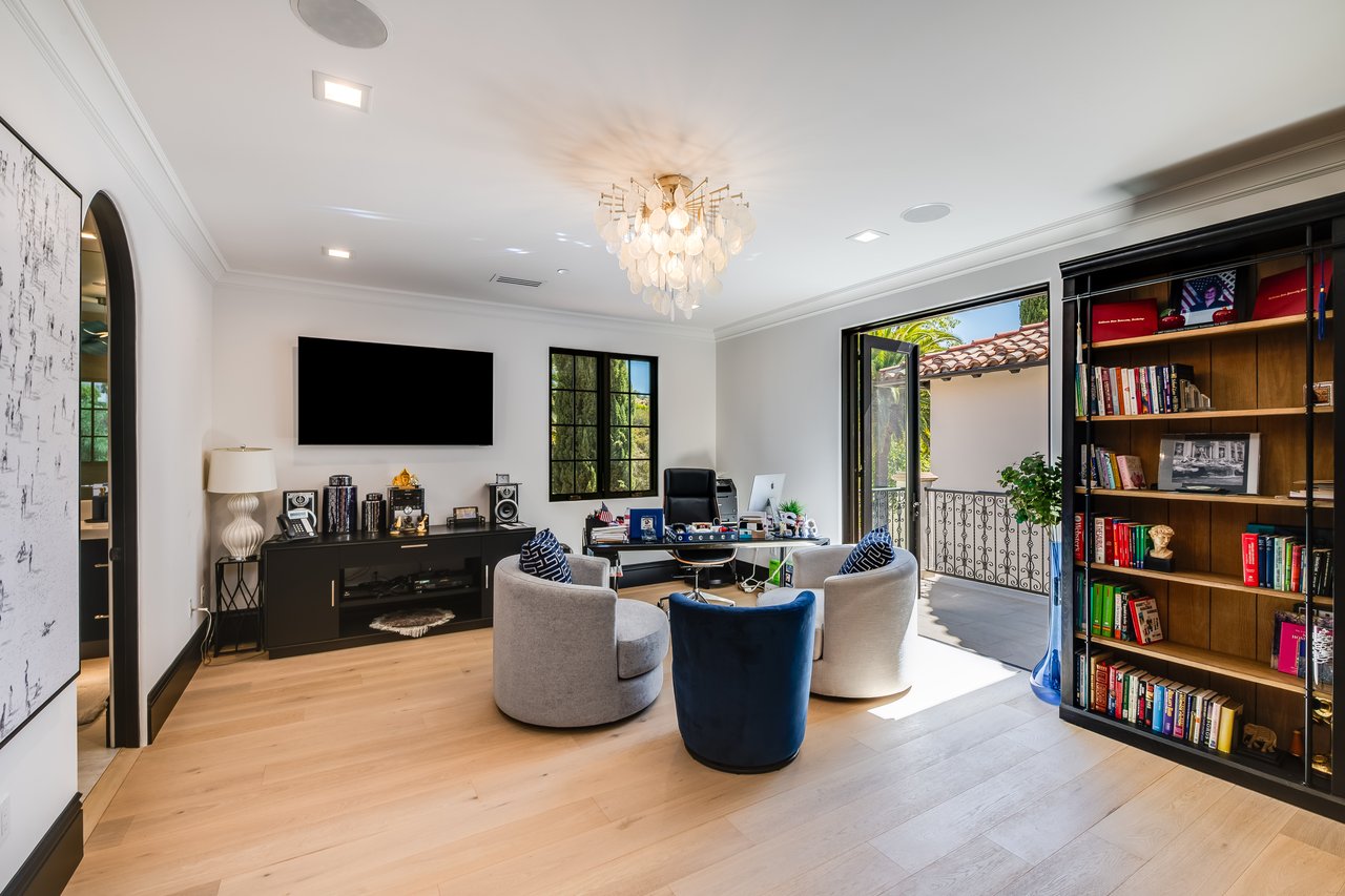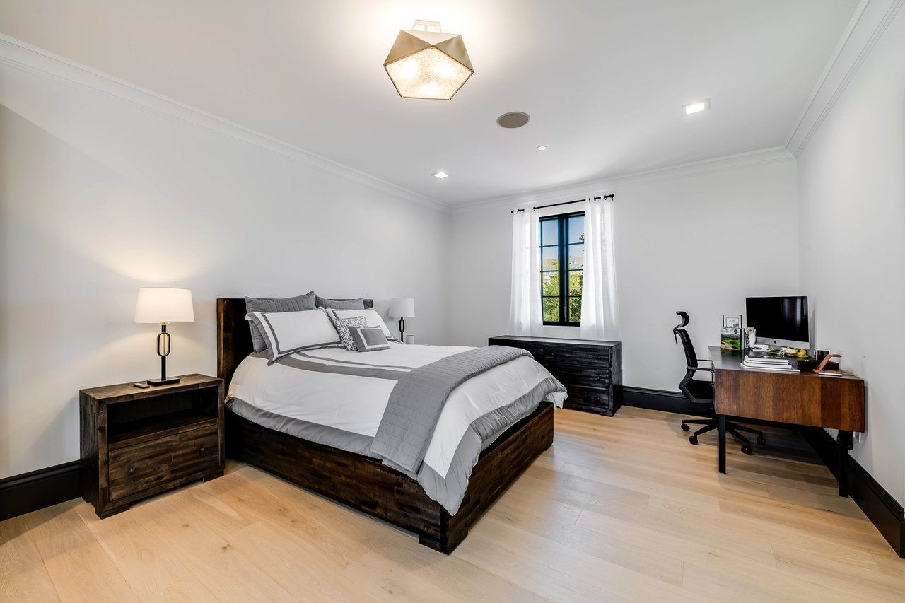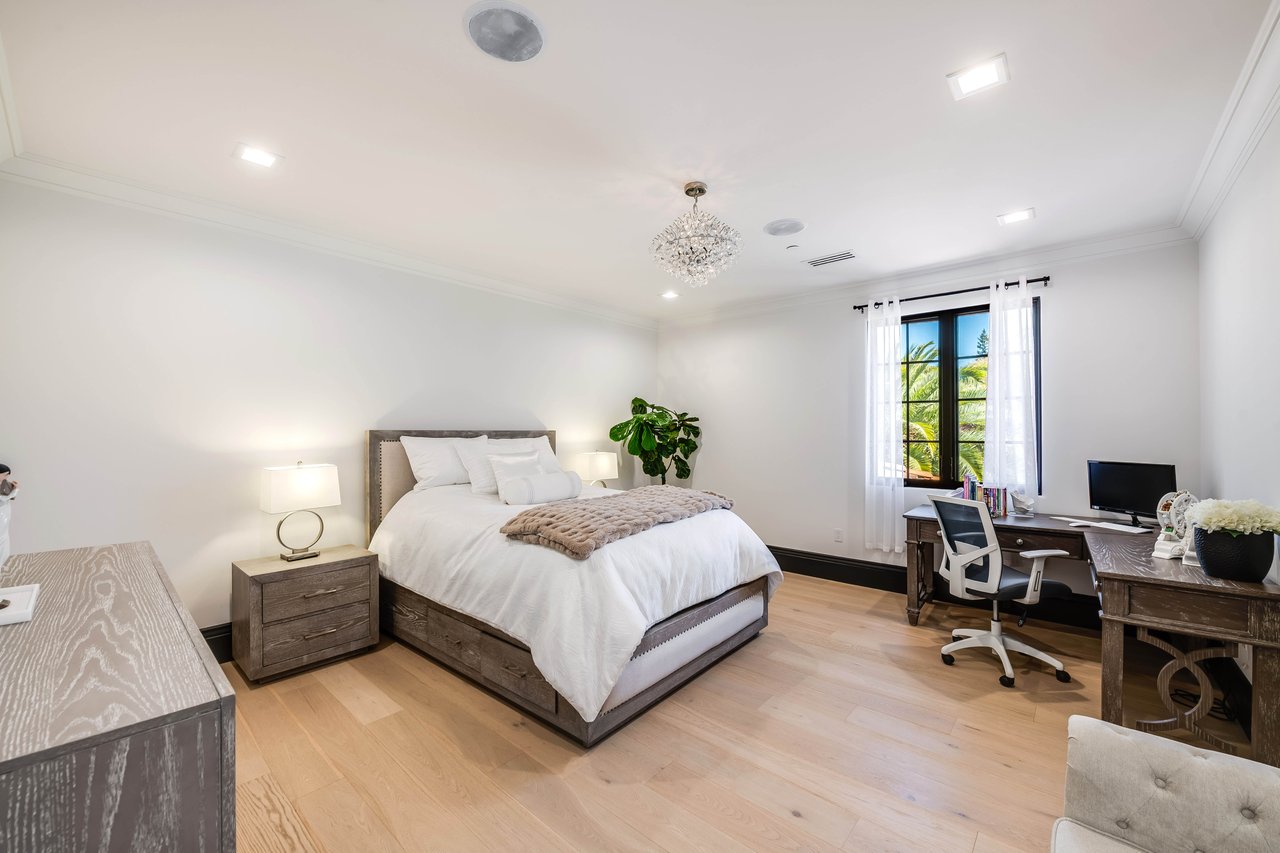 Tucked behind double gates with sweeping sunset views and 24-hour security, "The Estates at The Oaks" is an exceptionally exclusive enclave of approximately 50 homes. This remarkable warm Modern Villa presents a compelling blend of architectural scale, refined materials, and seamless indoor-outdoor living. Set on nearly an acre and spanning approx. 16,100 sq.ft., the home has been tastefully re-constructed to deliver a clean modern aesthetic with an emphasis on comfort, elegance, entertaining and energetic vibrance. 8 on-suite bedrooms and 12 bathrooms are thoughtfully distributed throughout the property providing ample space and privacy yet warm and family oriented. A private 2-bedroom guest residence complete with its own kitchen and living space, well suited for extended stays, staff quarters, or a separate work environment. The interiors are both expansive and inviting. A dramatic entry introduces the home's scale, leading to a series of open yet defined living spaces. The main gathering areas are anchored by a refined great room, where a linear fireplace, custom millwork, and expansive glass doors create a seamless transition to the outdoors. The kitchen was designed with zero expense spared & so much attention to detail on the finishes providing beauty, function and convenience consisting of custom cabinetry, a substantial stone island, integrated appliances, and a fully equipped secondary prep kitchen discreetly positioned for entertaining. A temperature-controlled glass wine display adds a sculptural & visually artistic element to the space. Amenities throughout the home are curated for both relaxation and recreation. A private theater with tiered seating, a two-lane bowling alley which includes a great space for entertaining and or lounging with friends and family, a dedicated bar with entertaining area, and a full gym with direct outdoor access all contribute to the home's conveniently accessible floor plan. A private elevator connects each level with ease. The primary suite offers a quiet retreat, complete with a sitting area, massage room, built-in coffee bar, and dual dressing rooms. The primary bath was finished with a spa-like palette featuring a soaking tub, floating vanities, and a very generous walk-in shower surrounded by the finest stone. Walls of glass throughout the home capture wide-ranging views of the surrounding hills with direct sunset views nightly bringing in natural light and reinforcing the home's connection to nature and the outdoors. The property is designed to function as a private resort. A zero-edge pool with integrated audio, two separate spas, multiple lounge areas, and a fully equipped outdoor kitchen including pizza oven and built-in grill, create an ideal setting for both large-scale entertaining and everyday enjoyment. A professional-grade sports court further enhances the grounds. Advanced systems, including Lutron lighting and Crestron automation, provide intuitive control over lighting, climate, security, and entertainment. This pristine estate was well executed with both design and livability in mind and offers a one-of-a-kind residential living experience within one of Calabasas' most sought-after guard-gated communities.