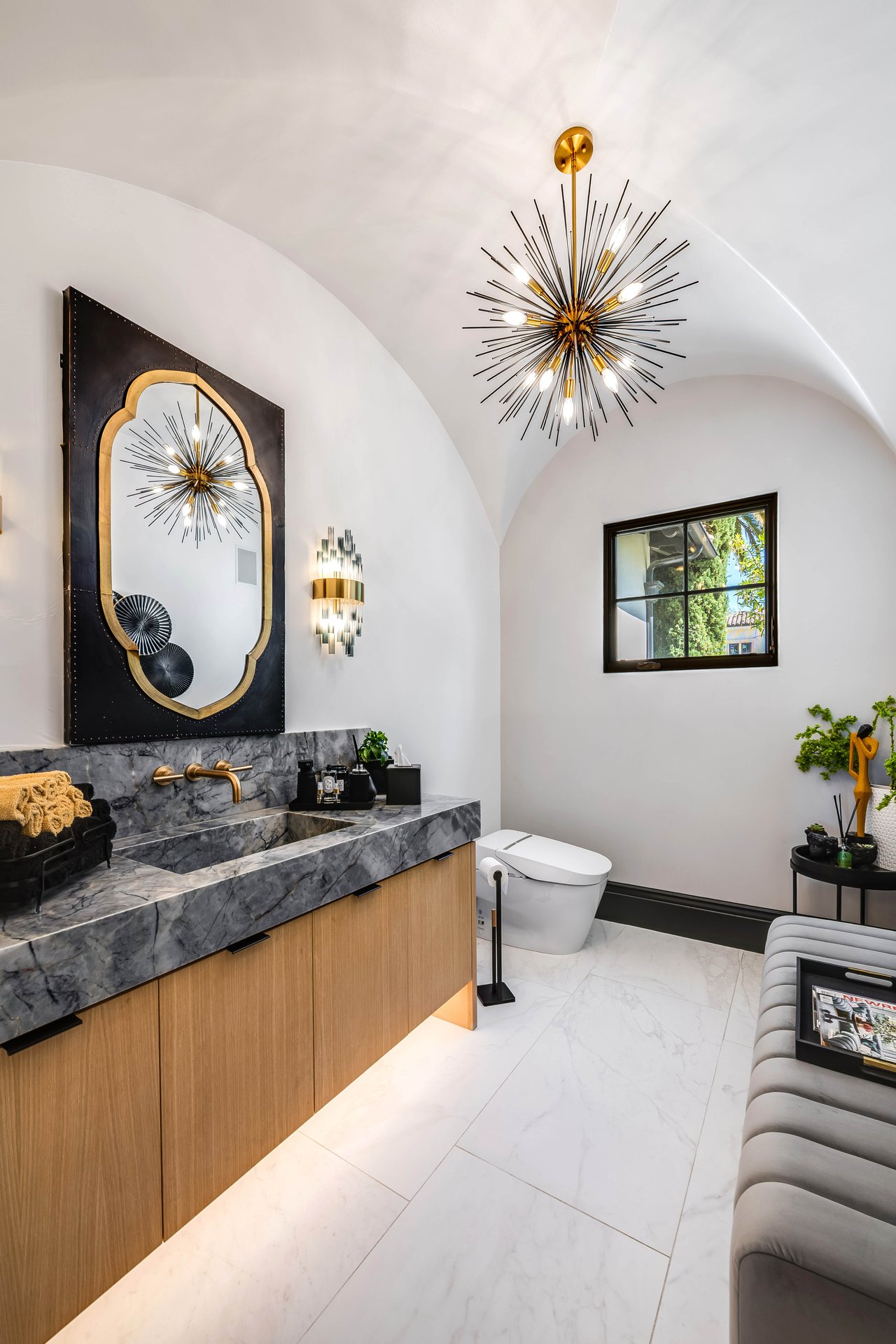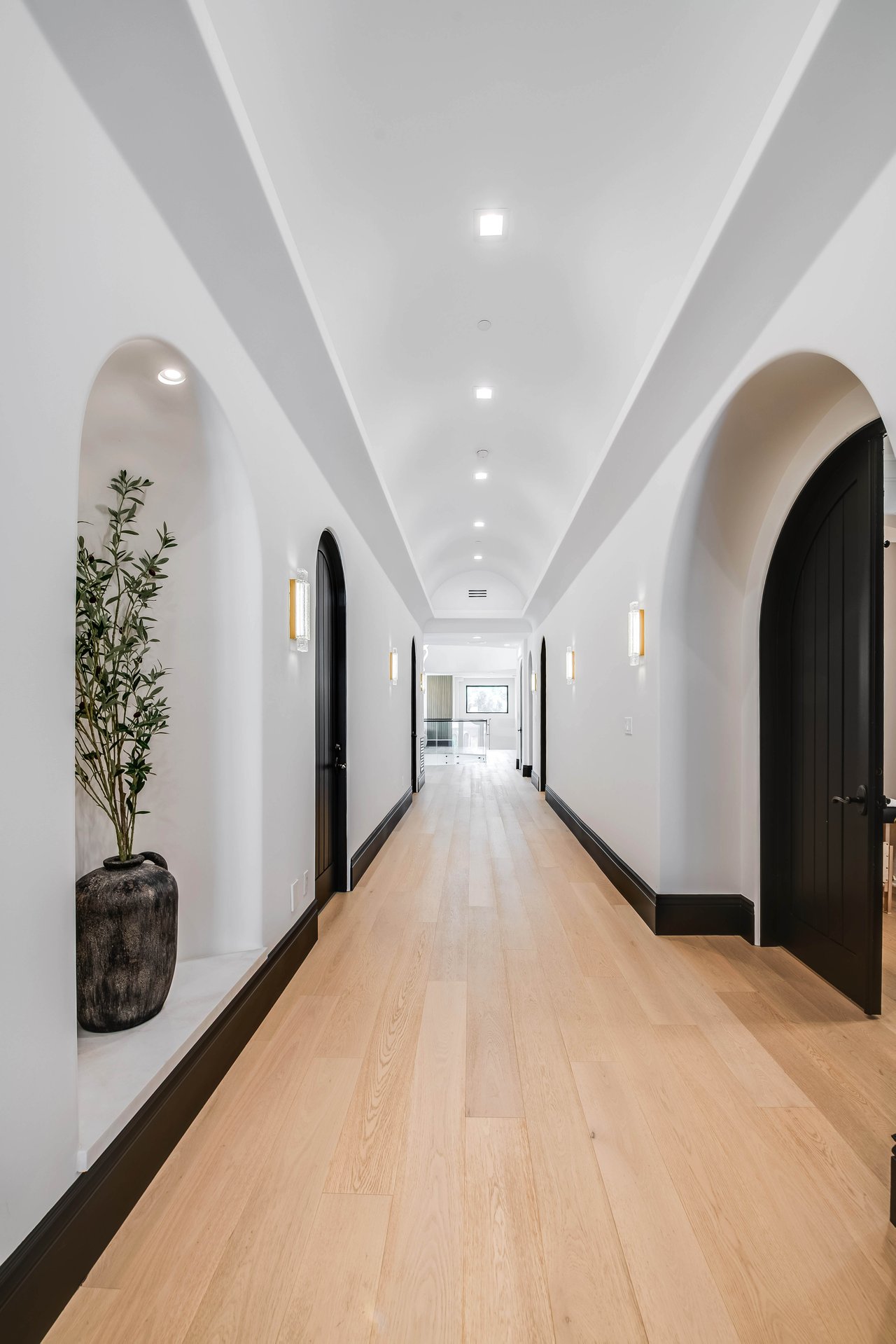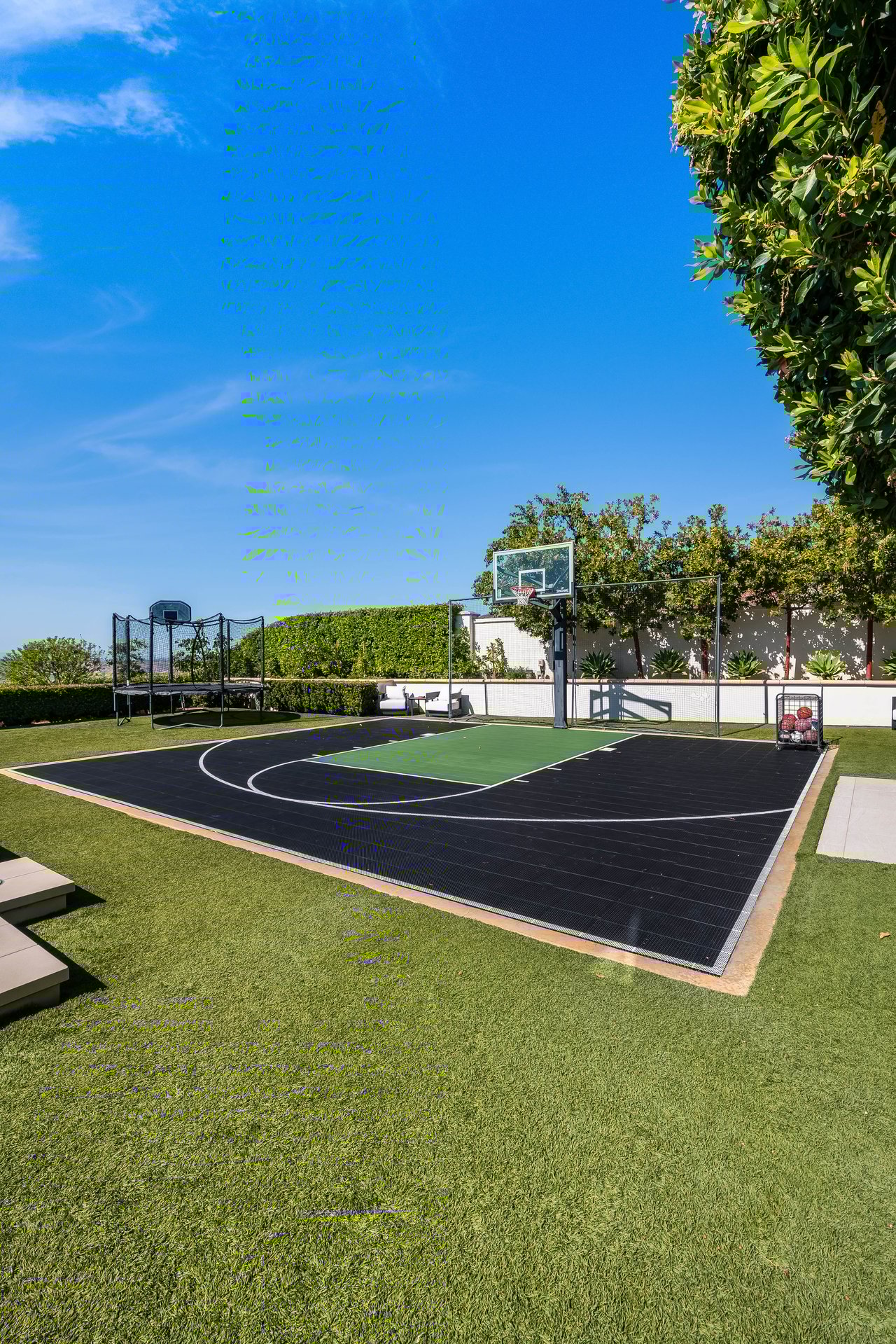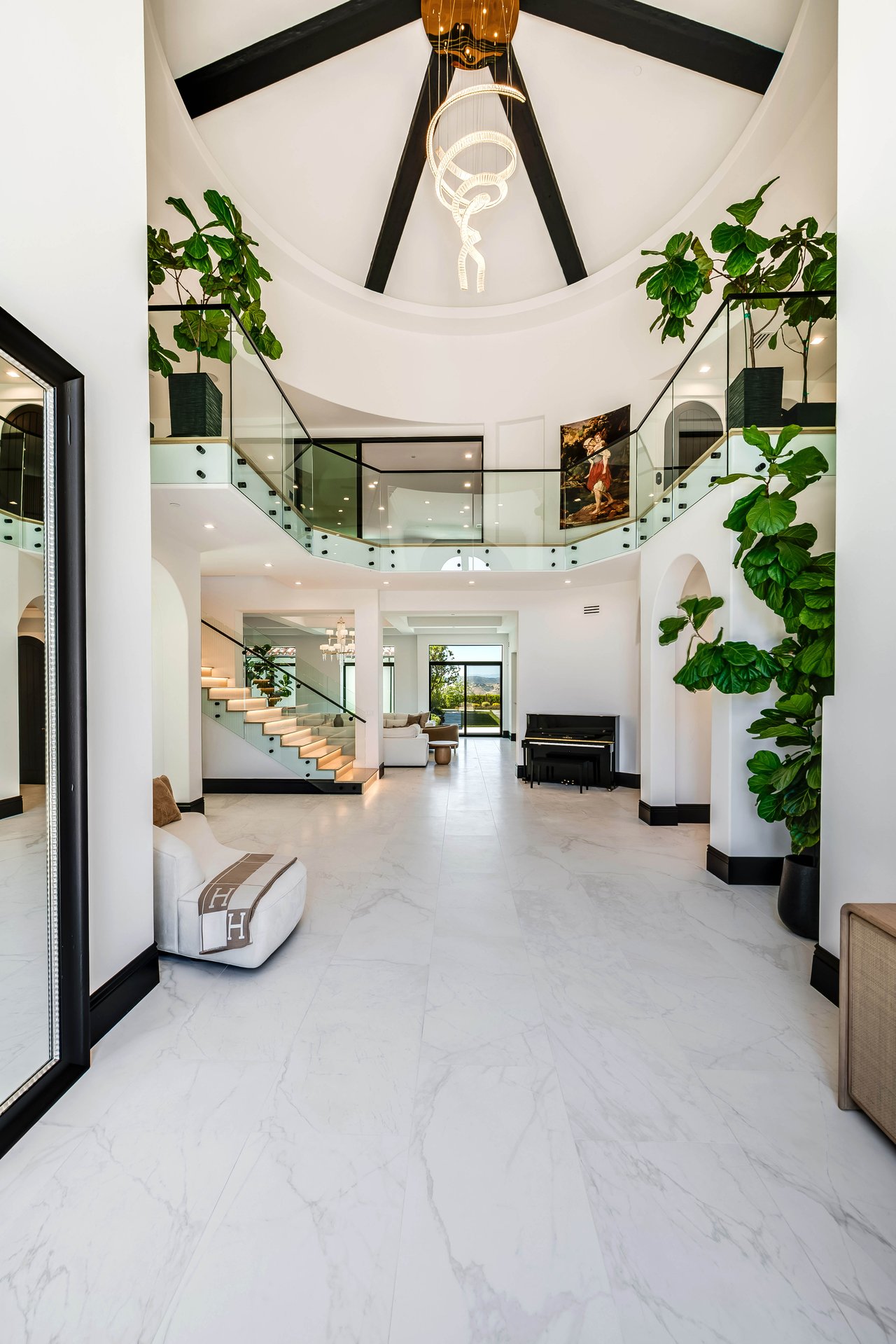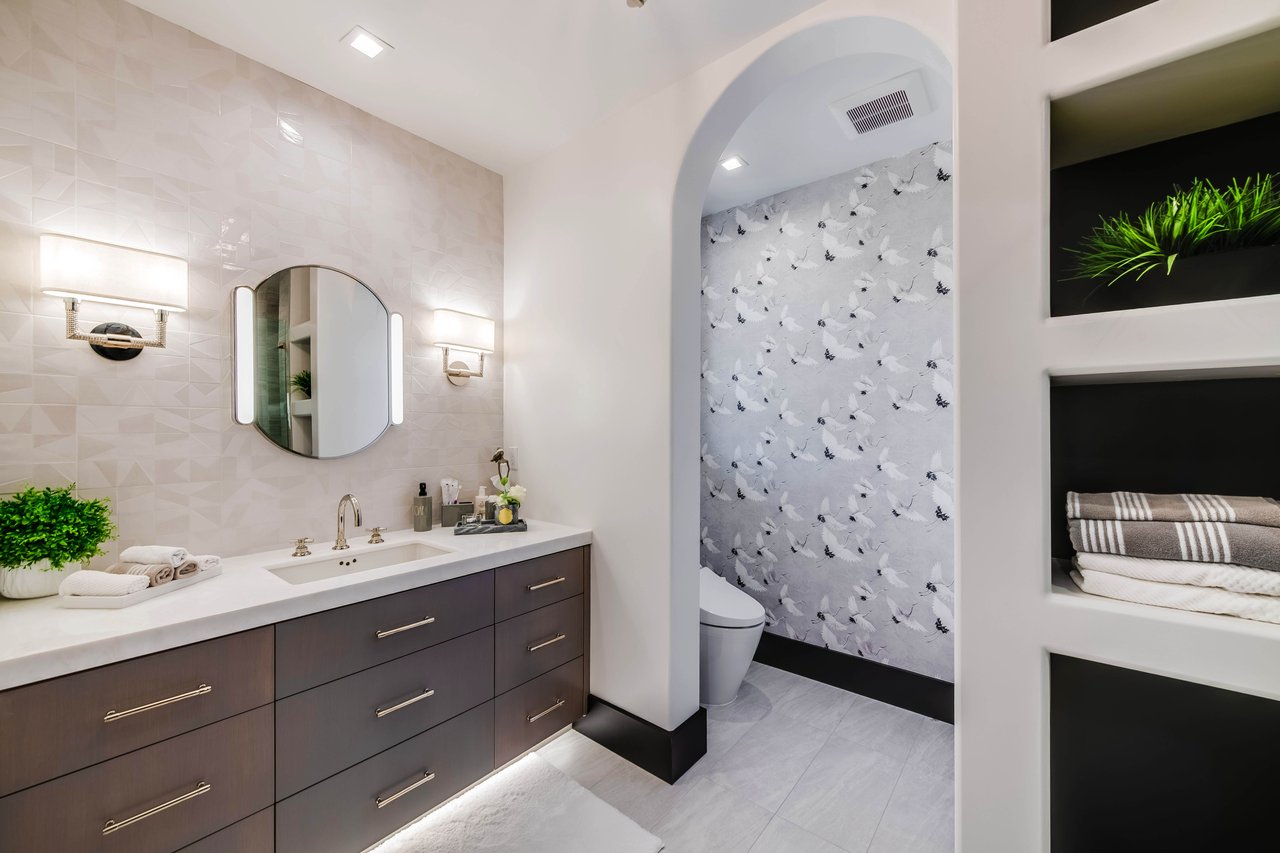 Tucked behind double gates with sweeping sunset views and 24-hour security, "The Estates at The Oaks" is an exceptionally exclusive enclave of approximately 50 homes. This remarkable warm Modern Villa presents a compelling blend of architectural scale, refined materials, and seamless indoor-outdoor living. Set on nearly an acre and spanning approx. 16,100 sq.ft., the home has been tastefully re-constructed to deliver a clean modern aesthetic with an emphasis on comfort, elegance, entertaining and energetic vibrance. 8 on-suite bedrooms and 12 bathrooms are thoughtfully distributed throughout the property providing ample space and privacy yet warm and family oriented. A private 2-bedroom guest residence complete with its own kitchen and living space, well suited for extended stays, staff quarters, or a separate work environment. The interiors are both expansive and inviting. A dramatic entry introduces the home's scale, leading to a series of open yet defined living spaces. The main gathering areas are anchored by a refined great room, where a linear fireplace, custom millwork, and expansive glass doors create a seamless transition to the outdoors. The kitchen was designed with zero expense spared & so much attention to detail on the finishes providing beauty, function and convenience consisting of custom cabinetry, a substantial stone island, integrated appliances, and a fully equipped secondary prep kitchen discreetly positioned for entertaining. A temperature-controlled glass wine display adds a sculptural & visually artistic element to the space. Amenities throughout the home are curated for both relaxation and recreation. A private theater with tiered seating, a two-lane bowling alley which includes a great space for entertaining and or lounging with friends and family, a dedicated bar with entertaining area, and a full gym with direct outdoor access all contribute to the home's conveniently accessible floor plan. A private elevator connects each level with ease. The primary suite offers a quiet retreat, complete with a sitting area, massage room, built-in coffee bar, and dual dressing rooms. The primary bath was finished with a spa-like palette featuring a soaking tub, floating vanities, and a very generous walk-in shower surrounded by the finest stone. Walls of glass throughout the home capture wide-ranging views of the surrounding hills with direct sunset views nightly bringing in natural light and reinforcing the home's connection to nature and the outdoors. The property is designed to function as a private resort. A zero-edge pool with integrated audio, two separate spas, multiple lounge areas, and a fully equipped outdoor kitchen including pizza oven and built-in grill, create an ideal setting for both large-scale entertaining and everyday enjoyment. A professional-grade sports court further enhances the grounds. Advanced systems, including Lutron lighting and Crestron automation, provide intuitive control over lighting, climate, security, and entertainment. This pristine estate was well executed with both design and livability in mind and offers a one-of-a-kind residential living experience within one of Calabasas' most sought-after guard-gated communities.