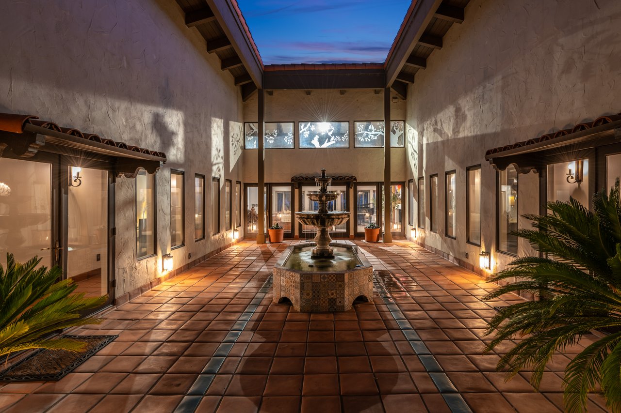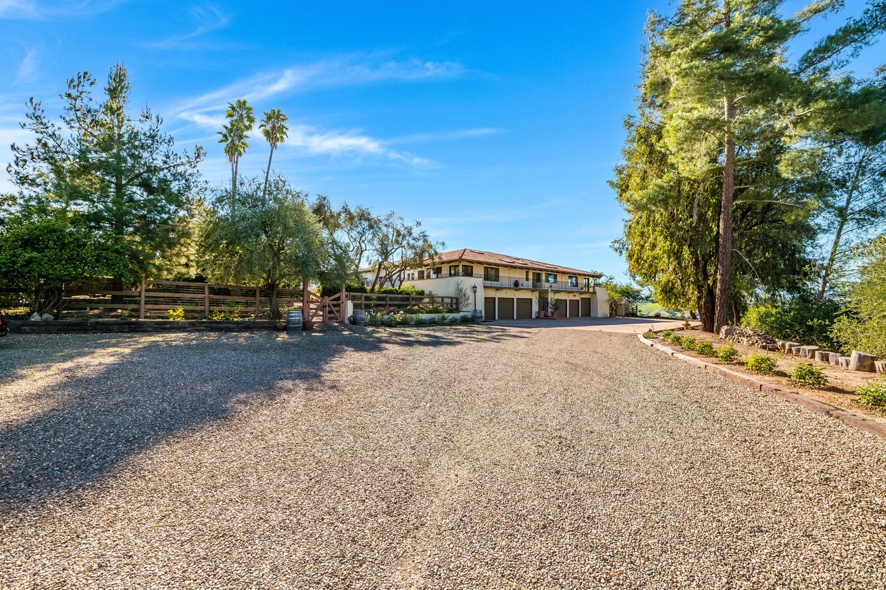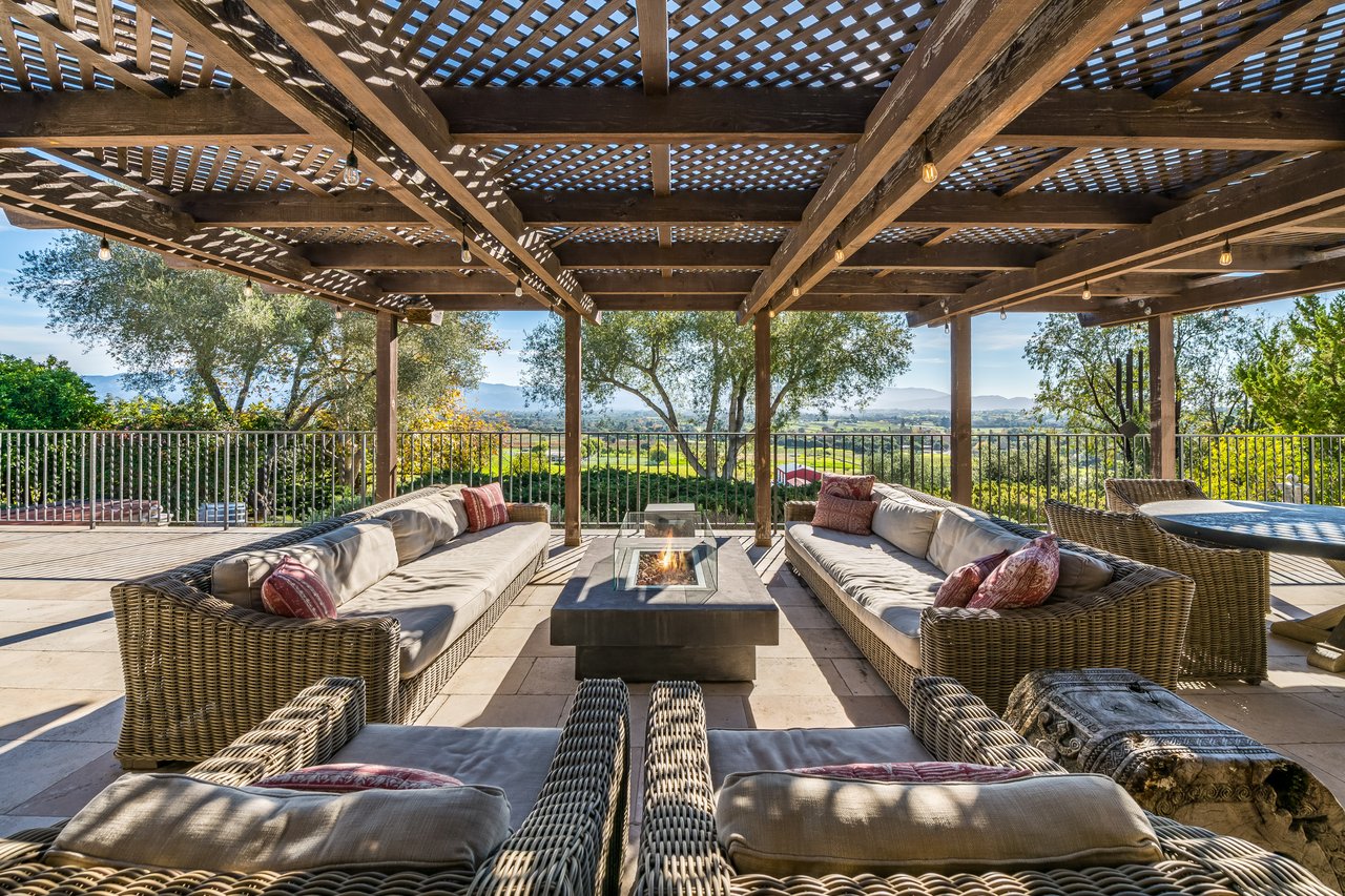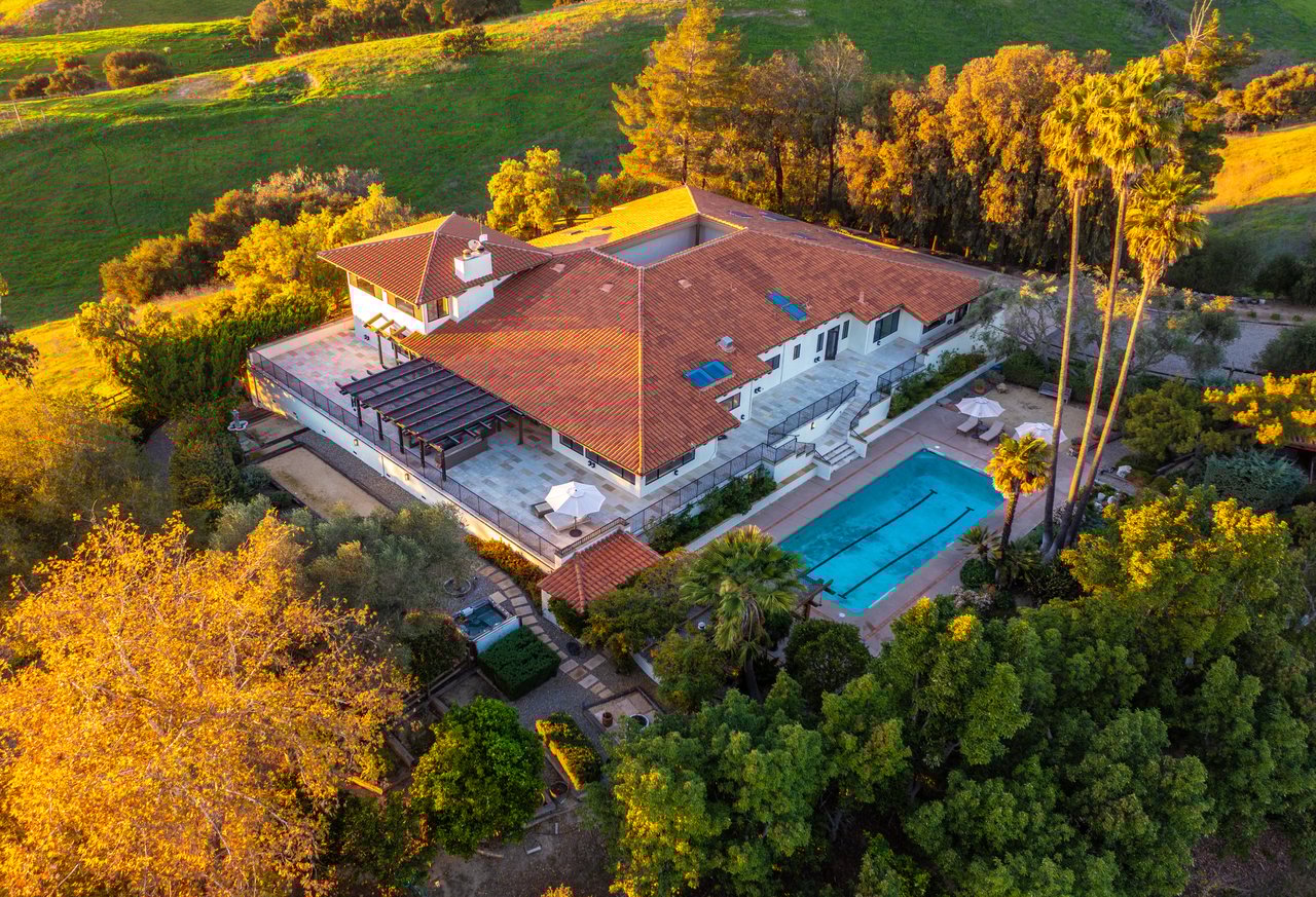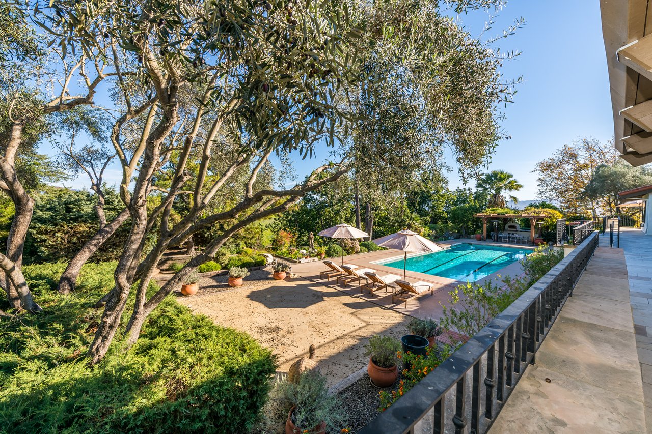 Privately gated and approached by a long, winding country road, this commanding hilltop estate is set within the prestigious enclave of Rancho Ynecita, encompassing approximately 19.5 acres with sweeping, unobstructed panoramic views across the Santa Ynez Valley and surrounding mountains. A dramatic arrival culminates at six garage bays with individual overhead doors at driveway level, including select double-deep spaces, RV accommodation, a dedicated garage workspace with wraparound workbench and built-in storage, extensive under-house storage, and elevator access from the garage to the main living level. The residence is primarily single-level in living, thoughtfully organized around a tranquil central courtyard that serves as the architectural heart of the home. Five French doorsthree from the living room and two from interior hallwaysopen to the courtyard, allowing the soothing sound of the fountain water feature to resonate throughout the interiors and establishing a refined indoor-outdoor dialogue. Recently and extensively remodeled, the home seamlessly blends timeless Spanish character with contemporary refinement, showcasing beautiful hardwood floors, soaring open-beam ceilings with oversized timbers, skylights, expansive windows, and walls of glass that invite abundant natural light. At the center of the home, the reimagined kitchen is both a statement and a gathering space. Italian marble surfaces define the room, anchored by an oversized waterfall island designed for entertaining, a dramatic 60-inch wrapped hood, and a full suite of Miele appliances. Four sets of French doors from the kitchen and living areas open directly onto a spectacular wraparound deck of approximately 1,000 square feet, finished in French limestone and offering true 360-degree-style vantage points over the vineyards and valley beyond. The floor plan is exceptionally well considered, offering dual true primary suites positioned on opposite wings for maximum privacy. Each primary suite features a sitting area and a spa-like bath, including one with a steam shower. Every bedroom is graced with large windows and double French doors opening directly onto the wraparound deck, reinforcing the home's connection to its setting. In total, the residence offers 6 bedrooms and 6.5 baths, including a half bath on the upper level and an additional full bath in the garage, ideal for service and pool use. Outdoor living is equally compelling. A lap-length swimming pool anchors the lower entertaining terrace, complemented by an outdoor kitchen with pizza oven, grill, trellis, and dedicated dining area. Approximately five acres of enclosed gardens surround the home, enriched by a rare microclimate that supports an exceptional orchard with roughly 30 mature, fruit-bearing avocado trees, along with lemon, orange, tangerine, apple, and Asian pear trees. Ancient oak trees and mature olive trees further define the landscape, while additional partially graded land offers flexibility for a tennis or paddle court, equestrian use, or other recreational pursuits. The property includes both a pool and garden work shed, as well as a separate work shed with running water and electricity, suitable for conversion to an office, art studio, or in-law unit. A second homesite, already equipped with water and electricity, is shovel-ready relative to typical parcels, offering a rare opportunity for future expansion. Located within the highly regarded Los Olivos Elementary School District and just minutes from the charming towns of Los Olivos and Santa Ynez, this exceptional estate combines privacy, scale, and refined country living with a lifestyle defined by walkability, serenity, and enduring natural beauty.