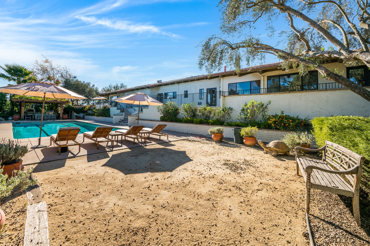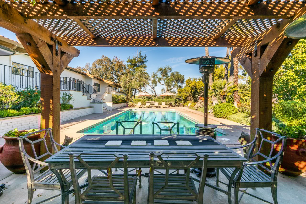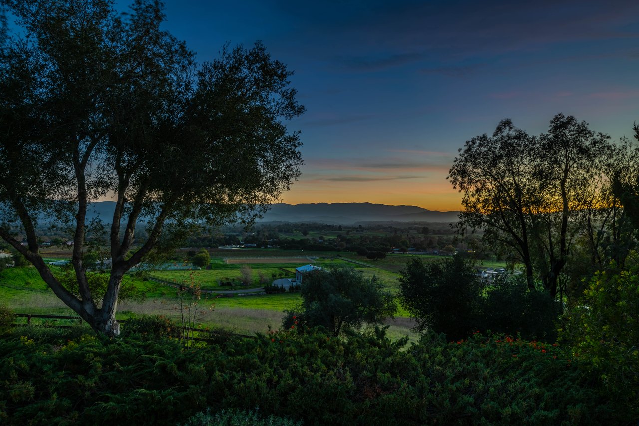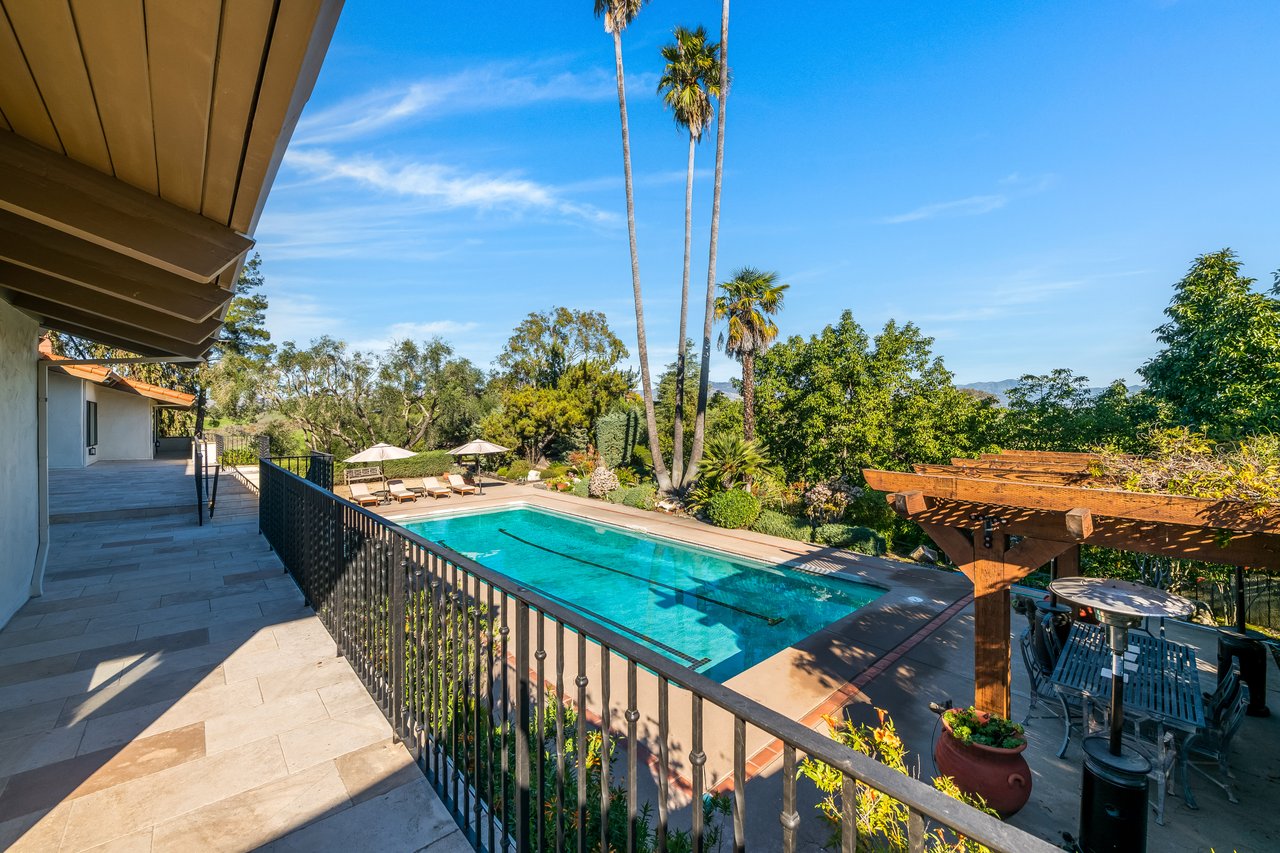 Privately gated and approached by a long, winding country road, this commanding hilltop estate is set within the prestigious enclave of Rancho Ynecita, encompassing approximately 19.5 acres with sweeping, unobstructed panoramic views across the Santa Ynez Valley and surrounding mountains. A dramatic arrival culminates at six garage bays with individual overhead doors at driveway level, including select double-deep spaces, RV accommodation, a dedicated garage workspace with wraparound workbench and built-in storage, extensive under-house storage, and elevator access from the garage to the main living level. The residence is primarily single-level in living, thoughtfully organized around a tranquil central courtyard that serves as the architectural heart of the home. Five French doorsthree from the living room and two from interior hallwaysopen to the courtyard, allowing the soothing sound of the fountain water feature to resonate throughout the interiors and establishing a refined indoor-outdoor dialogue. Recently and extensively remodeled, the home seamlessly blends timeless Spanish character with contemporary refinement, showcasing beautiful hardwood floors, soaring open-beam ceilings with oversized timbers, skylights, expansive windows, and walls of glass that invite abundant natural light. At the center of the home, the reimagined kitchen is both a statement and a gathering space. Italian marble surfaces define the room, anchored by an oversized waterfall island designed for entertaining, a dramatic 60-inch wrapped hood, and a full suite of Miele appliances. Four sets of French doors from the kitchen and living areas open directly onto a spectacular wraparound deck of approximately 1,000 square feet, finished in French limestone and offering true 360-degree-style vantage points over the vineyards and valley beyond. The floor plan is exceptionally well considered, offering dual true primary suites positioned on opposite wings for maximum privacy. Each primary suite features a sitting area and a spa-like bath, including one with a steam shower. Every bedroom is graced with large windows and double French doors opening directly onto the wraparound deck, reinforcing the home's connection to its setting. In total, the residence offers 6 bedrooms and 6.5 baths, including a half bath on the upper level and an additional full bath in the garage, ideal for service and pool use. Outdoor living is equally compelling. A lap-length swimming pool anchors the lower entertaining terrace, complemented by an outdoor kitchen with pizza oven, grill, trellis, and dedicated dining area. Approximately five acres of enclosed gardens surround the home, enriched by a rare microclimate that supports an exceptional orchard with roughly 30 mature, fruit-bearing avocado trees, along with lemon, orange, tangerine, apple, and Asian pear trees. Ancient oak trees and mature olive trees further define the landscape, while additional partially graded land offers flexibility for a tennis or paddle court, equestrian use, or other recreational pursuits. The property includes both a pool and garden work shed, as well as a separate work shed with running water and electricity, suitable for conversion to an office, art studio, or in-law unit. A second homesite, already equipped with water and electricity, is shovel-ready relative to typical parcels, offering a rare opportunity for future expansion. Located within the highly regarded Los Olivos Elementary School District and just minutes from the charming towns of Los Olivos and Santa Ynez, this exceptional estate combines privacy, scale, and refined country living with a lifestyle defined by walkability, serenity, and enduring natural beauty.