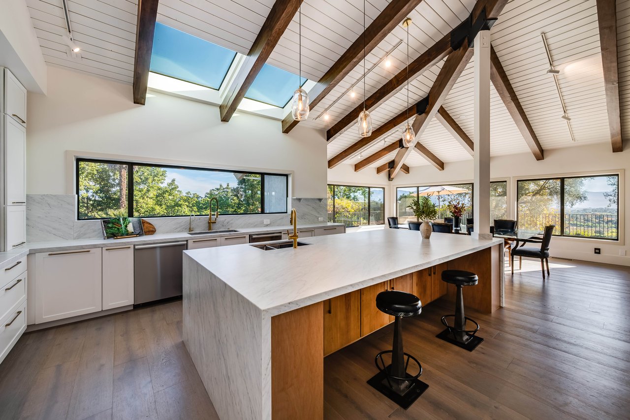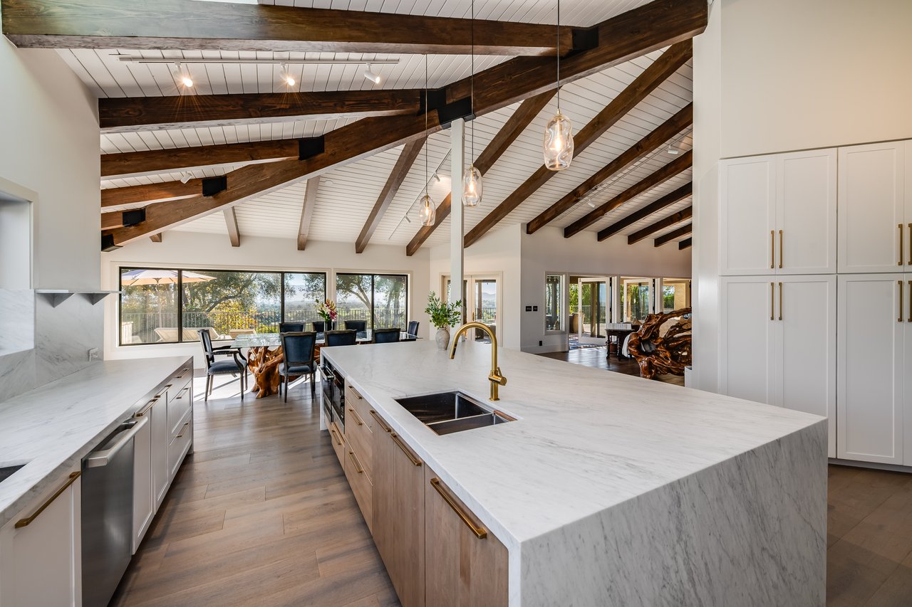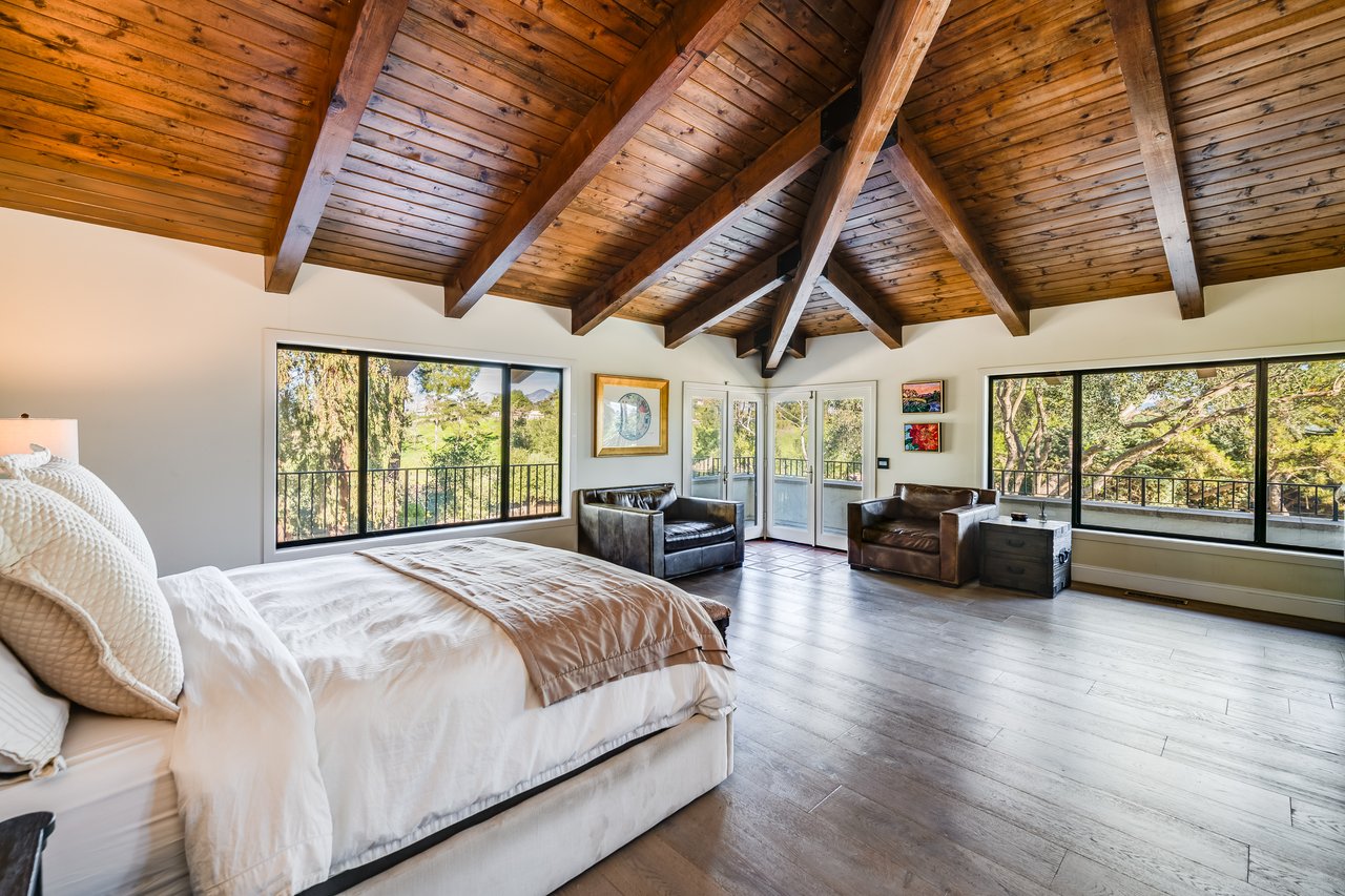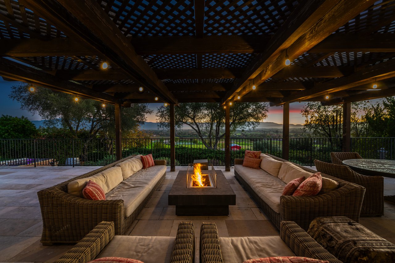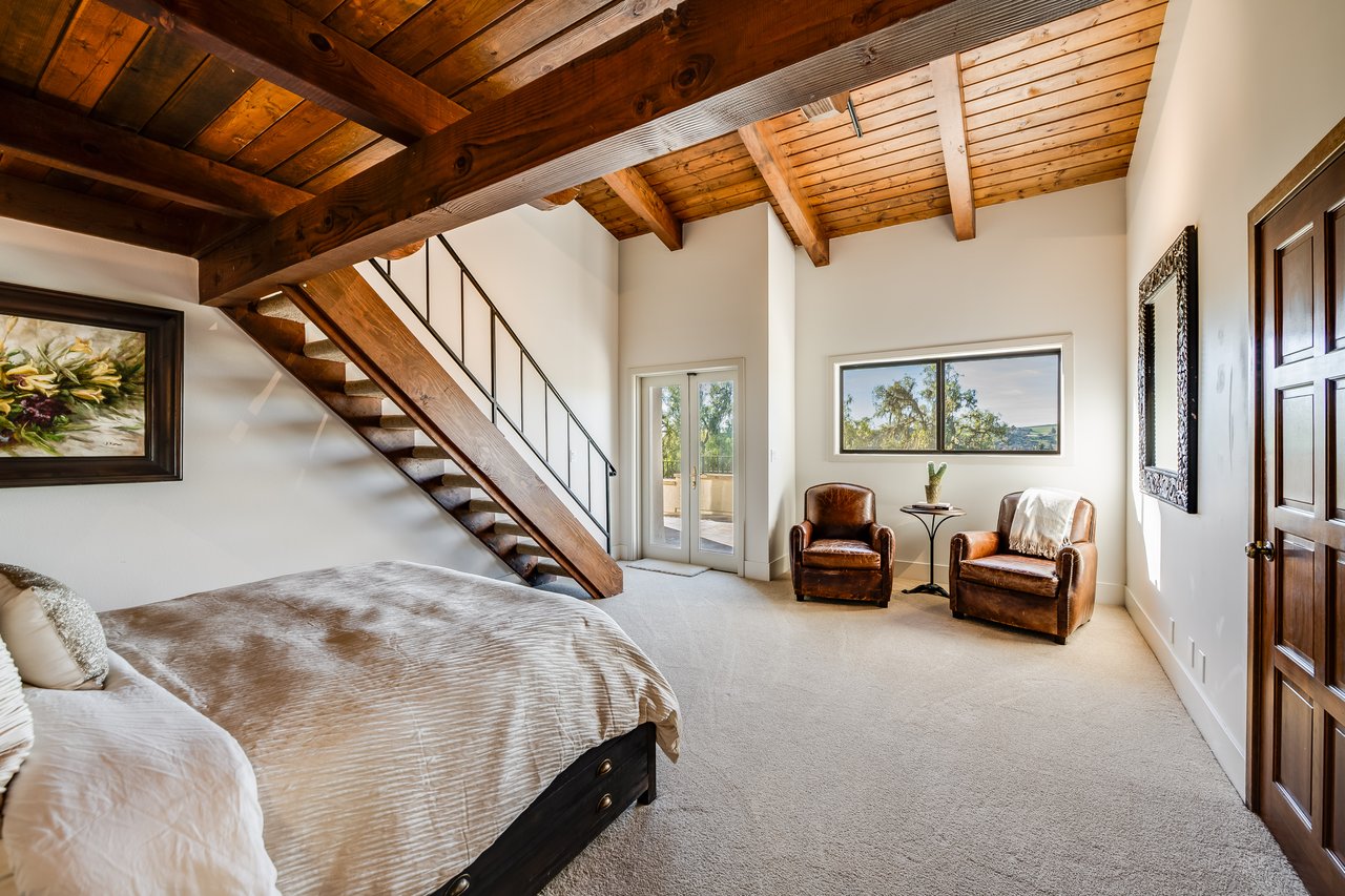 Privately gated and approached by a long, winding country road, this commanding hilltop estate is set within the prestigious enclave of Rancho Ynecita, encompassing approximately 19.5 acres with sweeping, unobstructed panoramic views across the Santa Ynez Valley and surrounding mountains. A dramatic arrival culminates at six garage bays with individual overhead doors at driveway level, including select double-deep spaces, RV accommodation, a dedicated garage workspace with wraparound workbench and built-in storage, extensive under-house storage, and elevator access from the garage to the main living level. The residence is primarily single-level in living, thoughtfully organized around a tranquil central courtyard that serves as the architectural heart of the home. Five French doorsthree from the living room and two from interior hallwaysopen to the courtyard, allowing the soothing sound of the fountain water feature to resonate throughout the interiors and establishing a refined indoor-outdoor dialogue. Recently and extensively remodeled, the home seamlessly blends timeless Spanish character with contemporary refinement, showcasing beautiful hardwood floors, soaring open-beam ceilings with oversized timbers, skylights, expansive windows, and walls of glass that invite abundant natural light. At the center of the home, the reimagined kitchen is both a statement and a gathering space. Italian marble surfaces define the room, anchored by an oversized waterfall island designed for entertaining, a dramatic 60-inch wrapped hood, and a full suite of Miele appliances. Four sets of French doors from the kitchen and living areas open directly onto a spectacular wraparound deck of approximately 1,000 square feet, finished in French limestone and offering true 360-degree-style vantage points over the vineyards and valley beyond. The floor plan is exceptionally well considered, offering dual true primary suites positioned on opposite wings for maximum privacy. Each primary suite features a sitting area and a spa-like bath, including one with a steam shower. Every bedroom is graced with large windows and double French doors opening directly onto the wraparound deck, reinforcing the home's connection to its setting. In total, the residence offers 6 bedrooms and 6.5 baths, including a half bath on the upper level and an additional full bath in the garage, ideal for service and pool use. Outdoor living is equally compelling. A lap-length swimming pool anchors the lower entertaining terrace, complemented by an outdoor kitchen with pizza oven, grill, trellis, and dedicated dining area. Approximately five acres of enclosed gardens surround the home, enriched by a rare microclimate that supports an exceptional orchard with roughly 30 mature, fruit-bearing avocado trees, along with lemon, orange, tangerine, apple, and Asian pear trees. Ancient oak trees and mature olive trees further define the landscape, while additional partially graded land offers flexibility for a tennis or paddle court, equestrian use, or other recreational pursuits. The property includes both a pool and garden work shed, as well as a separate work shed with running water and electricity, suitable for conversion to an office, art studio, or in-law unit. A second homesite, already equipped with water and electricity, is shovel-ready relative to typical parcels, offering a rare opportunity for future expansion. Located within the highly regarded Los Olivos Elementary School District and just minutes from the charming towns of Los Olivos and Santa Ynez, this exceptional estate combines privacy, scale, and refined country living with a lifestyle defined by walkability, serenity, and enduring natural beauty.