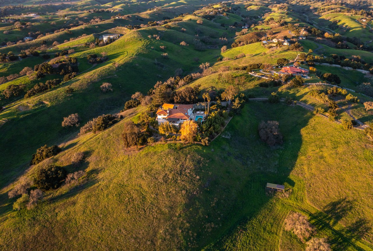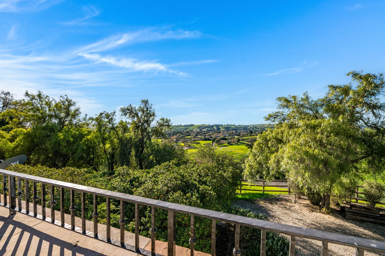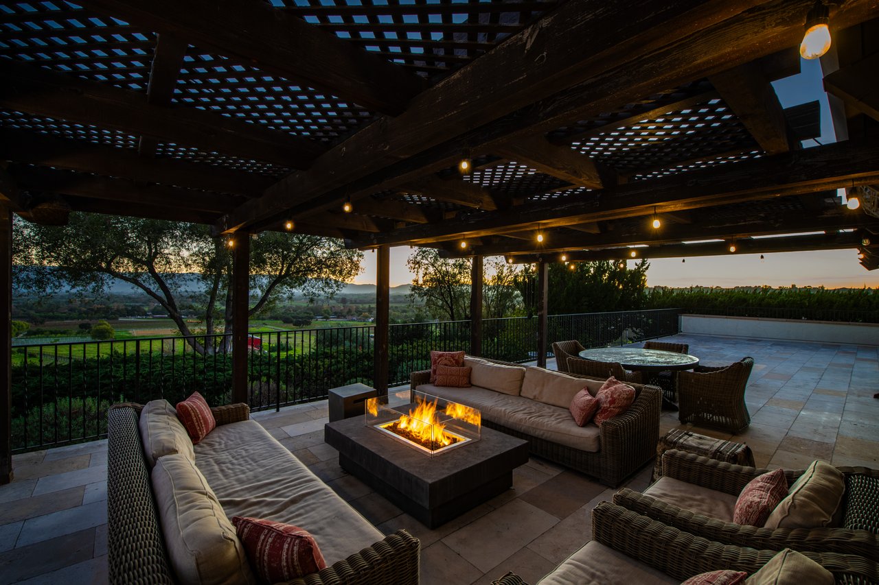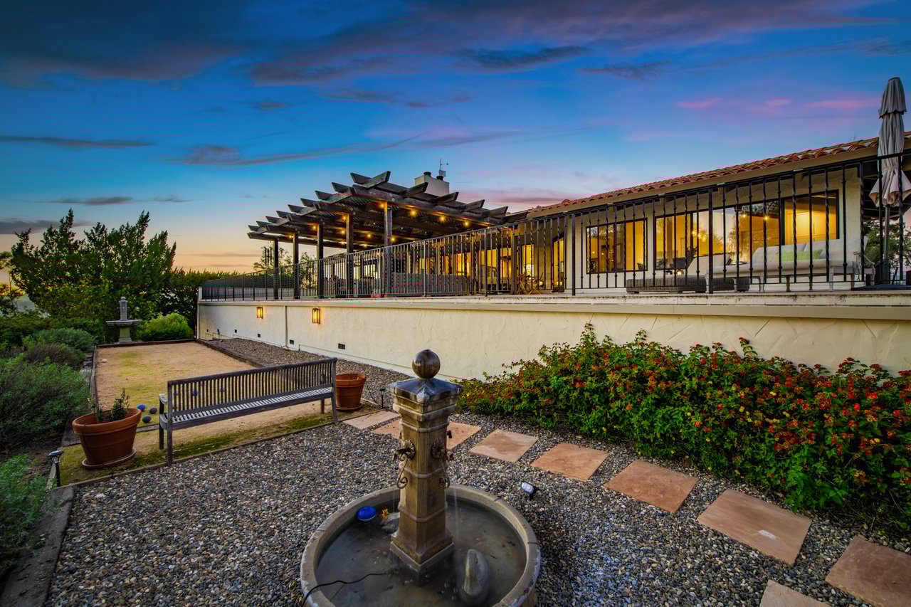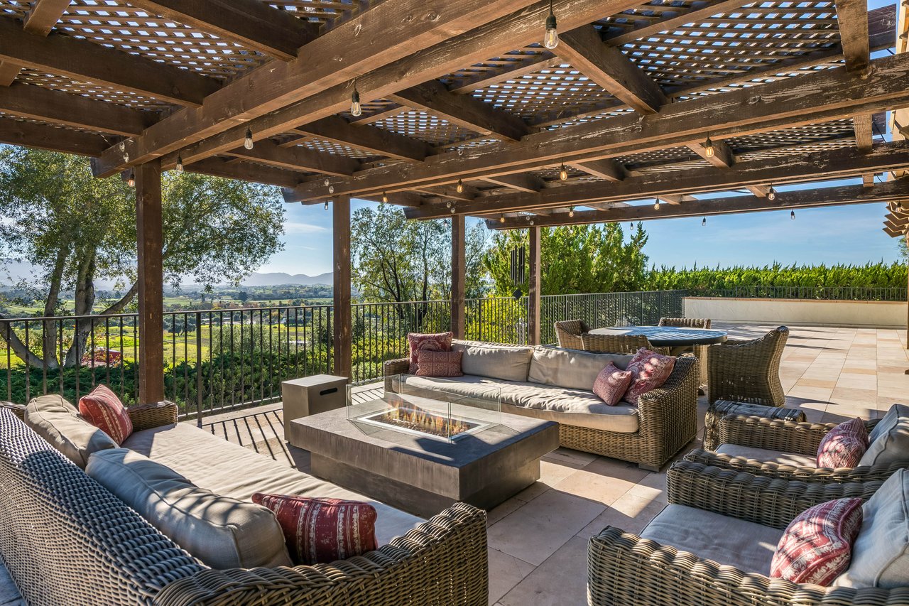 Privately gated and approached by a long, winding country road, this commanding hilltop estate is set within the prestigious enclave of Rancho Ynecita, encompassing approximately 19.5 acres with sweeping, unobstructed panoramic views across the Santa Ynez Valley and surrounding mountains. A dramatic arrival culminates at six garage bays with individual overhead doors at driveway level, including select double-deep spaces, RV accommodation, a dedicated garage workspace with wraparound workbench and built-in storage, extensive under-house storage, and elevator access from the garage to the main living level. The residence is primarily single-level in living, thoughtfully organized around a tranquil central courtyard that serves as the architectural heart of the home. Five French doorsthree from the living room and two from interior hallwaysopen to the courtyard, allowing the soothing sound of the fountain water feature to resonate throughout the interiors and establishing a refined indoor-outdoor dialogue. Recently and extensively remodeled, the home seamlessly blends timeless Spanish character with contemporary refinement, showcasing beautiful hardwood floors, soaring open-beam ceilings with oversized timbers, skylights, expansive windows, and walls of glass that invite abundant natural light. At the center of the home, the reimagined kitchen is both a statement and a gathering space. Italian marble surfaces define the room, anchored by an oversized waterfall island designed for entertaining, a dramatic 60-inch wrapped hood, and a full suite of Miele appliances. Four sets of French doors from the kitchen and living areas open directly onto a spectacular wraparound deck of approximately 1,000 square feet, finished in French limestone and offering true 360-degree-style vantage points over the vineyards and valley beyond. The floor plan is exceptionally well considered, offering dual true primary suites positioned on opposite wings for maximum privacy. Each primary suite features a sitting area and a spa-like bath, including one with a steam shower. Every bedroom is graced with large windows and double French doors opening directly onto the wraparound deck, reinforcing the home's connection to its setting. In total, the residence offers 6 bedrooms and 6.5 baths, including a half bath on the upper level and an additional full bath in the garage, ideal for service and pool use. Outdoor living is equally compelling. A lap-length swimming pool anchors the lower entertaining terrace, complemented by an outdoor kitchen with pizza oven, grill, trellis, and dedicated dining area. Approximately five acres of enclosed gardens surround the home, enriched by a rare microclimate that supports an exceptional orchard with roughly 30 mature, fruit-bearing avocado trees, along with lemon, orange, tangerine, apple, and Asian pear trees. Ancient oak trees and mature olive trees further define the landscape, while additional partially graded land offers flexibility for a tennis or paddle court, equestrian use, or other recreational pursuits. The property includes both a pool and garden work shed, as well as a separate work shed with running water and electricity, suitable for conversion to an office, art studio, or in-law unit. A second homesite, already equipped with water and electricity, is shovel-ready relative to typical parcels, offering a rare opportunity for future expansion. Located within the highly regarded Los Olivos Elementary School District and just minutes from the charming towns of Los Olivos and Santa Ynez, this exceptional estate combines privacy, scale, and refined country living with a lifestyle defined by walkability, serenity, and enduring natural beauty.