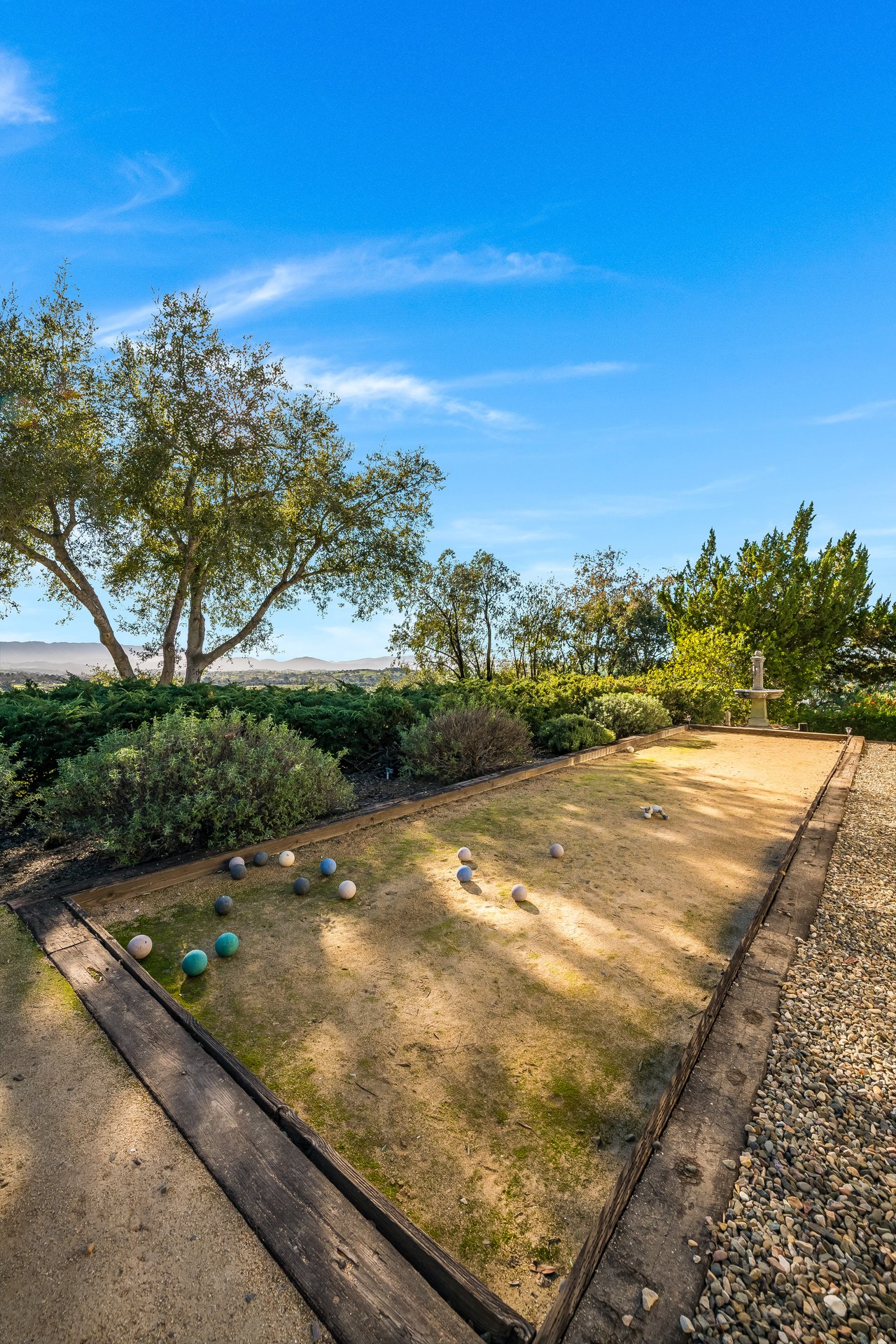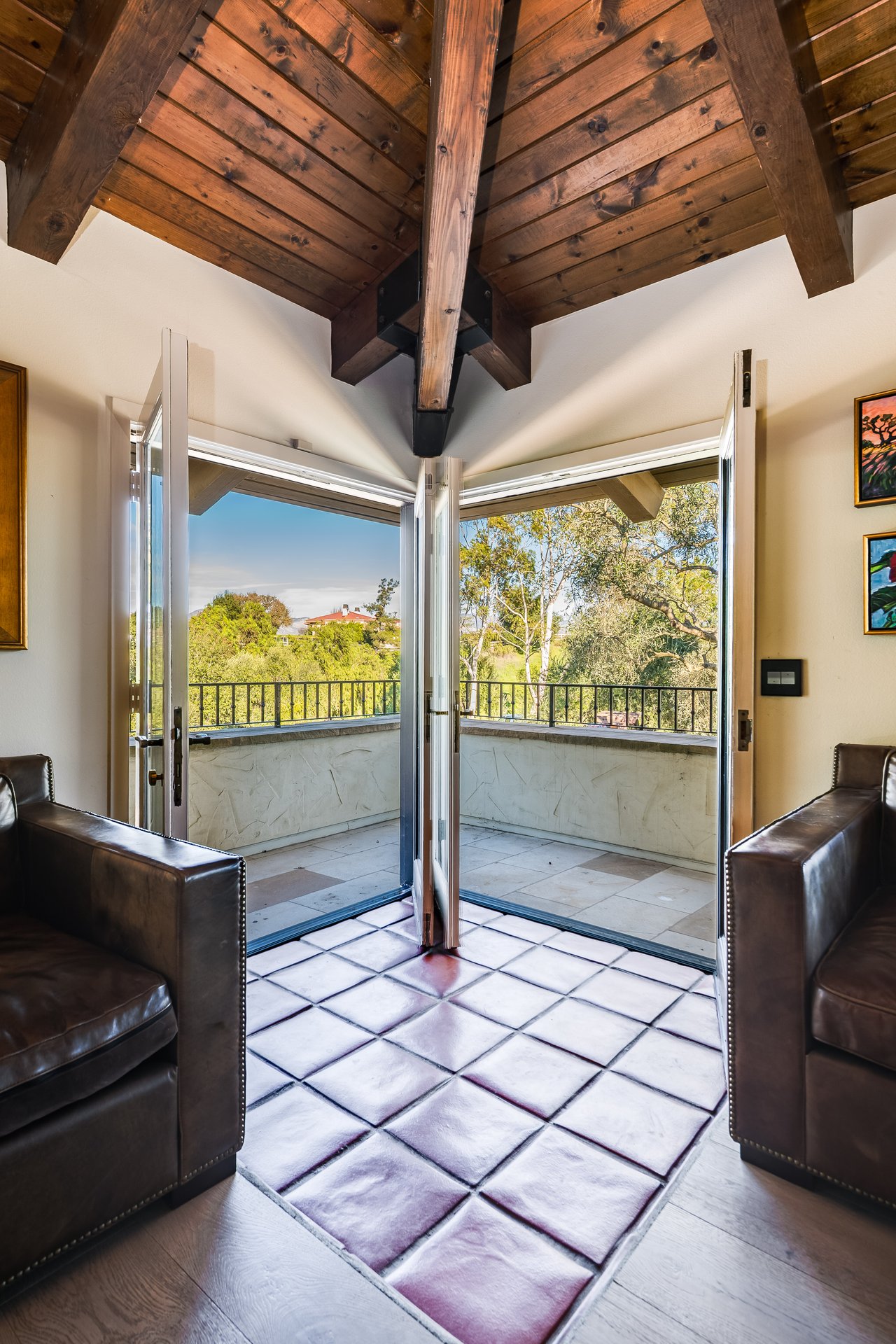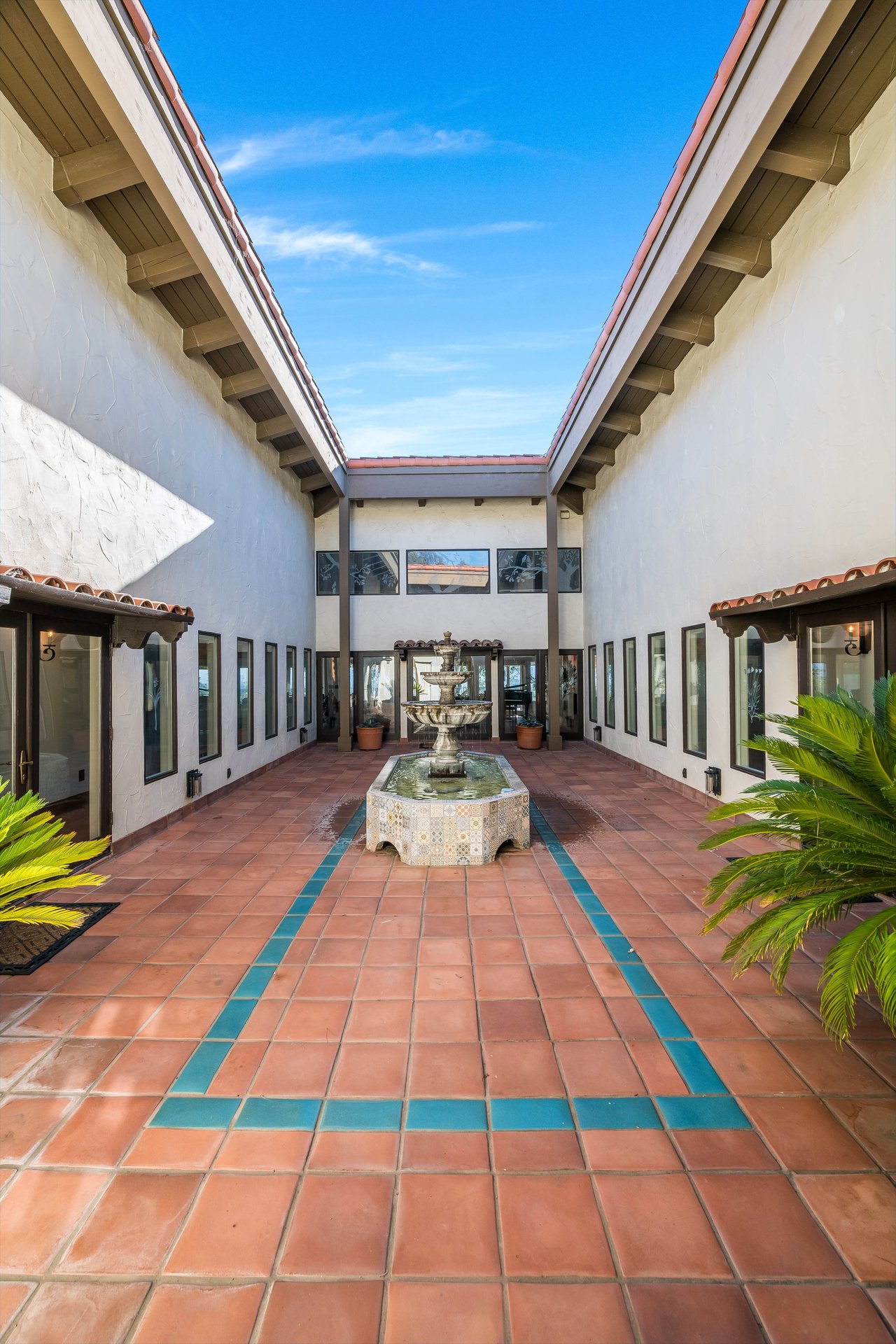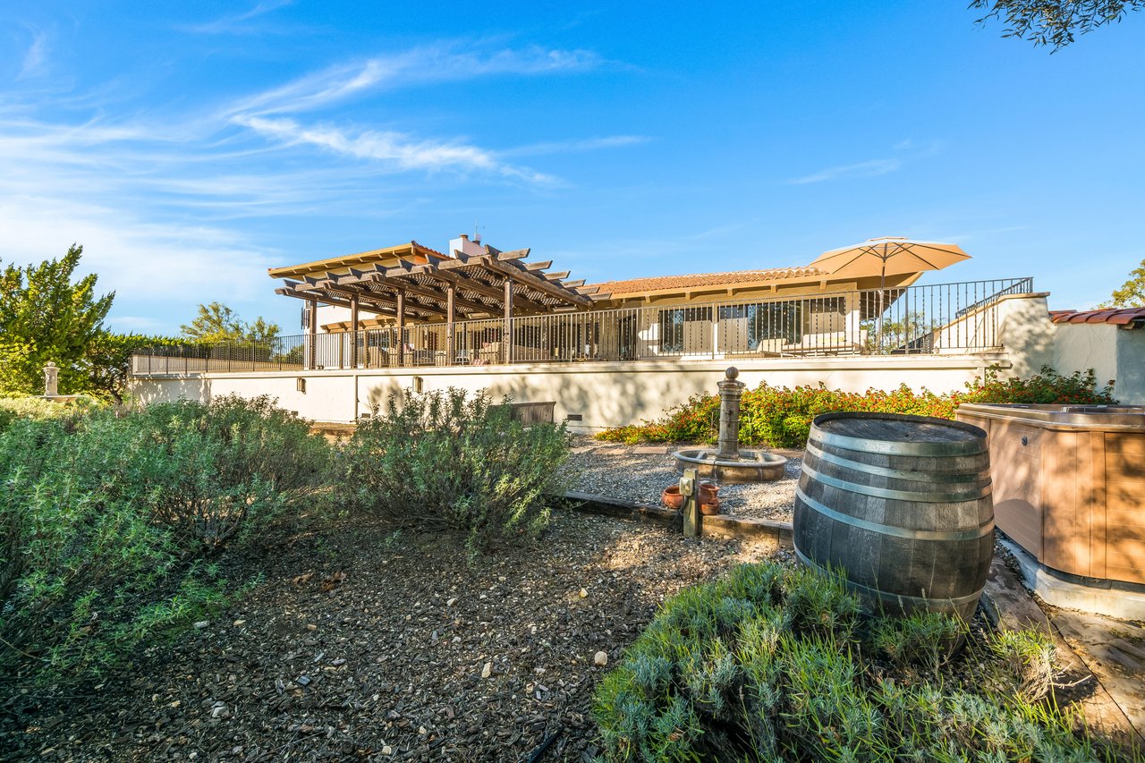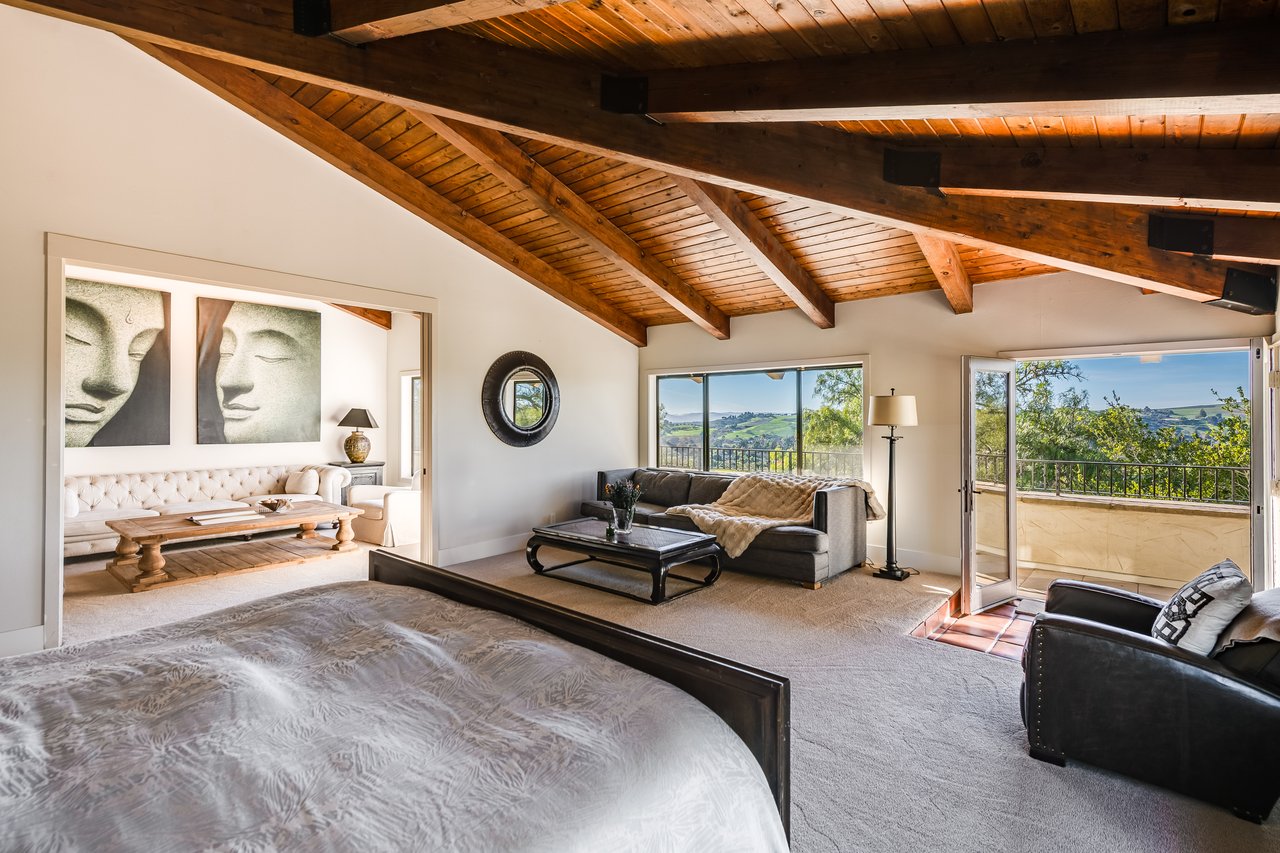 Privately gated and approached by a long, winding country road, this commanding hilltop estate is set within the prestigious enclave of Rancho Ynecita, encompassing approximately 19.5 acres with sweeping, unobstructed panoramic views across the Santa Ynez Valley and surrounding mountains. A dramatic arrival culminates at six garage bays with individual overhead doors at driveway level, including select double-deep spaces, RV accommodation, a dedicated garage workspace with wraparound workbench and built-in storage, extensive under-house storage, and elevator access from the garage to the main living level. The residence is primarily single-level in living, thoughtfully organized around a tranquil central courtyard that serves as the architectural heart of the home. Five French doorsthree from the living room and two from interior hallwaysopen to the courtyard, allowing the soothing sound of the fountain water feature to resonate throughout the interiors and establishing a refined indoor-outdoor dialogue. Recently and extensively remodeled, the home seamlessly blends timeless Spanish character with contemporary refinement, showcasing beautiful hardwood floors, soaring open-beam ceilings with oversized timbers, skylights, expansive windows, and walls of glass that invite abundant natural light. At the center of the home, the reimagined kitchen is both a statement and a gathering space. Italian marble surfaces define the room, anchored by an oversized waterfall island designed for entertaining, a dramatic 60-inch wrapped hood, and a full suite of Miele appliances. Four sets of French doors from the kitchen and living areas open directly onto a spectacular wraparound deck of approximately 1,000 square feet, finished in French limestone and offering true 360-degree-style vantage points over the vineyards and valley beyond. The floor plan is exceptionally well considered, offering dual true primary suites positioned on opposite wings for maximum privacy. Each primary suite features a sitting area and a spa-like bath, including one with a steam shower. Every bedroom is graced with large windows and double French doors opening directly onto the wraparound deck, reinforcing the home's connection to its setting. In total, the residence offers 6 bedrooms and 6.5 baths, including a half bath on the upper level and an additional full bath in the garage, ideal for service and pool use. Outdoor living is equally compelling. A lap-length swimming pool anchors the lower entertaining terrace, complemented by an outdoor kitchen with pizza oven, grill, trellis, and dedicated dining area. Approximately five acres of enclosed gardens surround the home, enriched by a rare microclimate that supports an exceptional orchard with roughly 30 mature, fruit-bearing avocado trees, along with lemon, orange, tangerine, apple, and Asian pear trees. Ancient oak trees and mature olive trees further define the landscape, while additional partially graded land offers flexibility for a tennis or paddle court, equestrian use, or other recreational pursuits. The property includes both a pool and garden work shed, as well as a separate work shed with running water and electricity, suitable for conversion to an office, art studio, or in-law unit. A second homesite, already equipped with water and electricity, is shovel-ready relative to typical parcels, offering a rare opportunity for future expansion. Located within the highly regarded Los Olivos Elementary School District and just minutes from the charming towns of Los Olivos and Santa Ynez, this exceptional estate combines privacy, scale, and refined country living with a lifestyle defined by walkability, serenity, and enduring natural beauty.