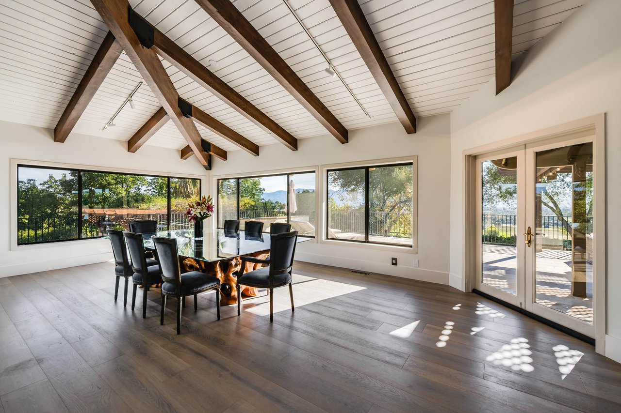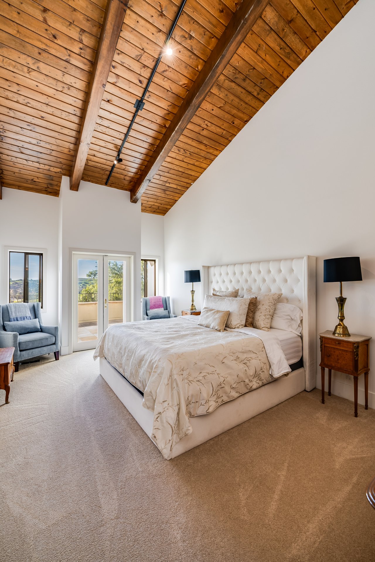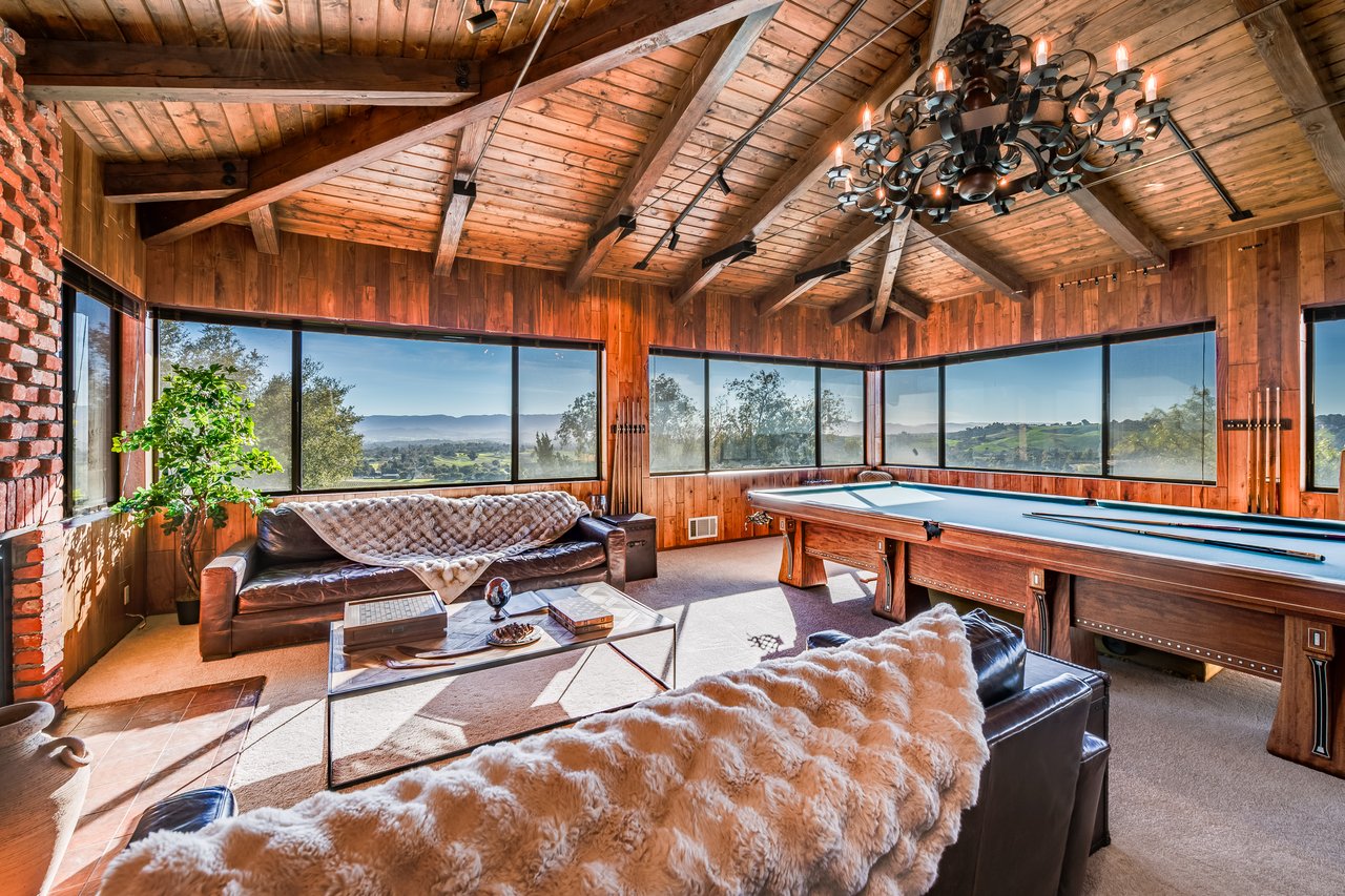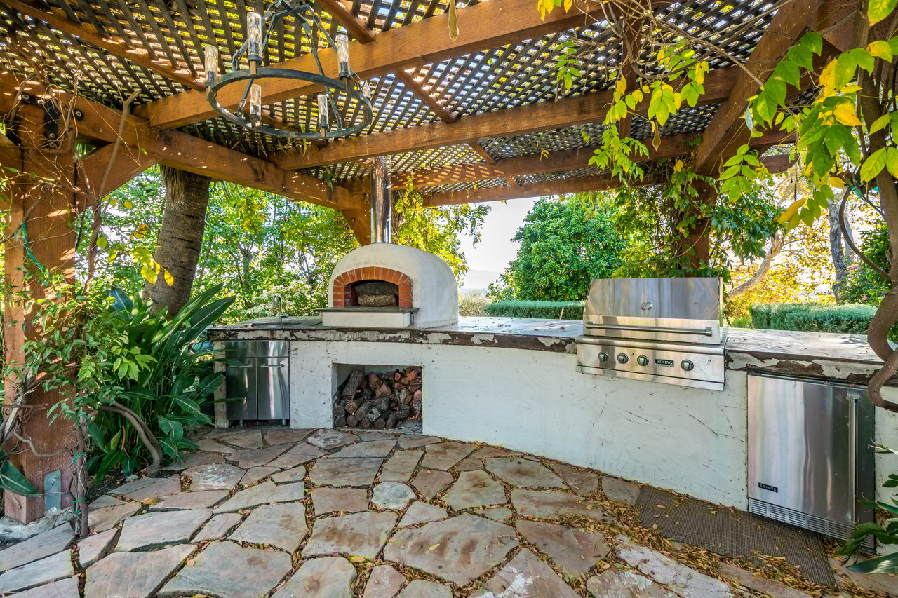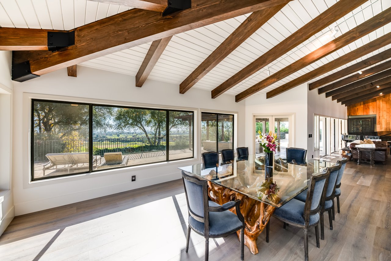 Privately gated and approached by a long, winding country road, this commanding hilltop estate is set within the prestigious enclave of Rancho Ynecita, encompassing approximately 19.5 acres with sweeping, unobstructed panoramic views across the Santa Ynez Valley and surrounding mountains. A dramatic arrival culminates at six garage bays with individual overhead doors at driveway level, including select double-deep spaces, RV accommodation, a dedicated garage workspace with wraparound workbench and built-in storage, extensive under-house storage, and elevator access from the garage to the main living level. The residence is primarily single-level in living, thoughtfully organized around a tranquil central courtyard that serves as the architectural heart of the home. Five French doorsthree from the living room and two from interior hallwaysopen to the courtyard, allowing the soothing sound of the fountain water feature to resonate throughout the interiors and establishing a refined indoor-outdoor dialogue. Recently and extensively remodeled, the home seamlessly blends timeless Spanish character with contemporary refinement, showcasing beautiful hardwood floors, soaring open-beam ceilings with oversized timbers, skylights, expansive windows, and walls of glass that invite abundant natural light. At the center of the home, the reimagined kitchen is both a statement and a gathering space. Italian marble surfaces define the room, anchored by an oversized waterfall island designed for entertaining, a dramatic 60-inch wrapped hood, and a full suite of Miele appliances. Four sets of French doors from the kitchen and living areas open directly onto a spectacular wraparound deck of approximately 1,000 square feet, finished in French limestone and offering true 360-degree-style vantage points over the vineyards and valley beyond. The floor plan is exceptionally well considered, offering dual true primary suites positioned on opposite wings for maximum privacy. Each primary suite features a sitting area and a spa-like bath, including one with a steam shower. Every bedroom is graced with large windows and double French doors opening directly onto the wraparound deck, reinforcing the home's connection to its setting. In total, the residence offers 6 bedrooms and 6.5 baths, including a half bath on the upper level and an additional full bath in the garage, ideal for service and pool use. Outdoor living is equally compelling. A lap-length swimming pool anchors the lower entertaining terrace, complemented by an outdoor kitchen with pizza oven, grill, trellis, and dedicated dining area. Approximately five acres of enclosed gardens surround the home, enriched by a rare microclimate that supports an exceptional orchard with roughly 30 mature, fruit-bearing avocado trees, along with lemon, orange, tangerine, apple, and Asian pear trees. Ancient oak trees and mature olive trees further define the landscape, while additional partially graded land offers flexibility for a tennis or paddle court, equestrian use, or other recreational pursuits. The property includes both a pool and garden work shed, as well as a separate work shed with running water and electricity, suitable for conversion to an office, art studio, or in-law unit. A second homesite, already equipped with water and electricity, is shovel-ready relative to typical parcels, offering a rare opportunity for future expansion. Located within the highly regarded Los Olivos Elementary School District and just minutes from the charming towns of Los Olivos and Santa Ynez, this exceptional estate combines privacy, scale, and refined country living with a lifestyle defined by walkability, serenity, and enduring natural beauty.