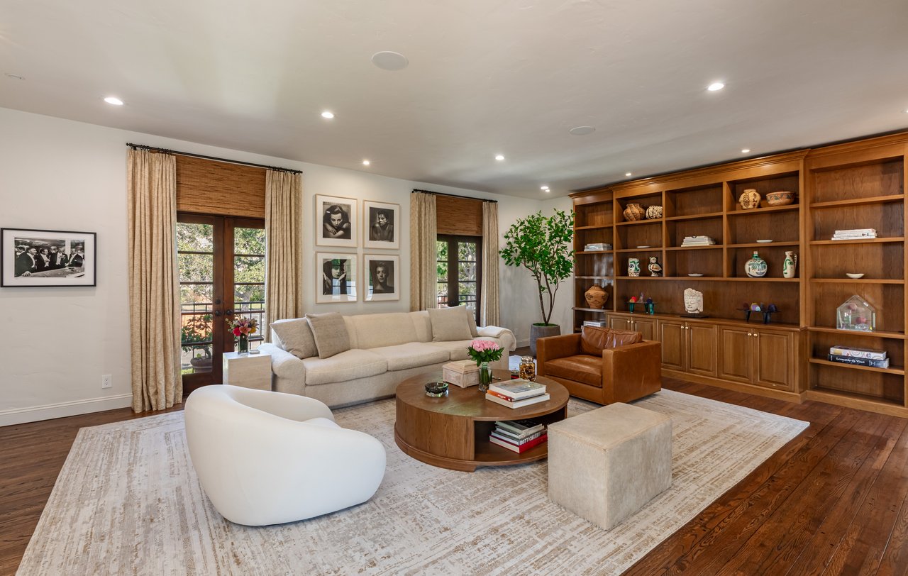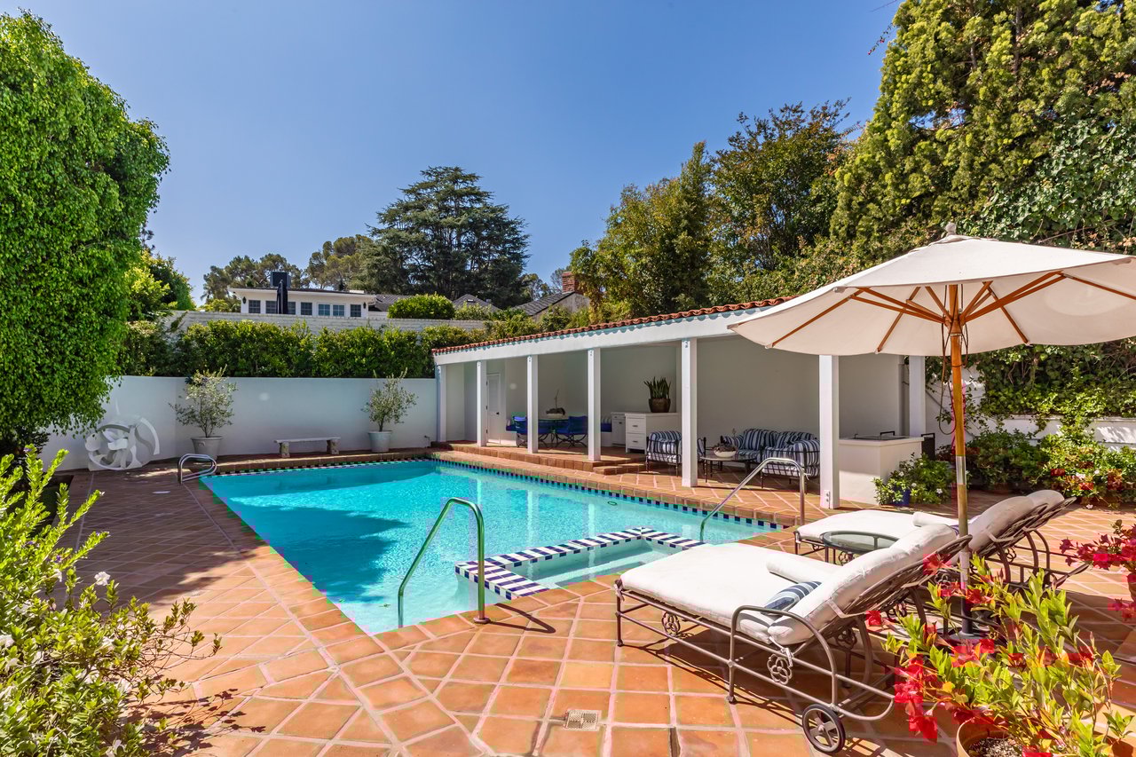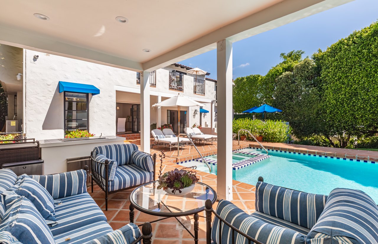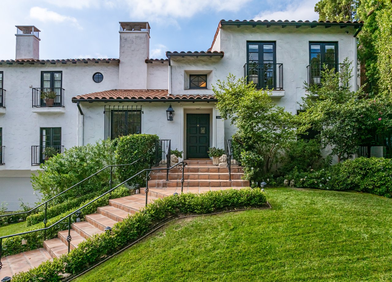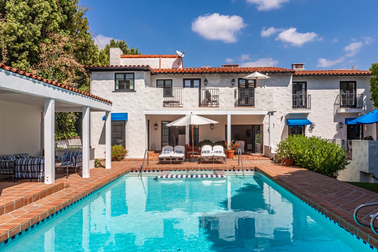 Located on prestigious Comstock Avenue in exclusive Little Holmby, this exquisite Spanish estate offers 4 bedrooms, 4 bathrooms and 2 powder rooms. Thoughtfully reimagined for modern living while preserving its architectural character, the residence celebrates timeless details with exposed wood-beamed ceilings, soft arches, wrought-iron accents and the warmth of natural materials like Saltillo tiling, wood and stone. A soaring two-story foyer with a dramatic staircase and artisan ironwork set the stage. Throughout, original elements meet elevated updates: hand-hewn beams, marble finishes and sunlit rooms. The main level features a versatile office with custom built-ins and a charming den/study with a corner fireplace. The pristine eat-in kitchen is anchored by terracotta tile floors, Calacatta marble countertops, generous storage and an adjoining breakfast room. The well-appointed, generous formal dining room, designed for entertaining, connects seamlessly to the terrace and pool through French doors, while the formal living room, framed by a grand fireplace and exposed wood beams exude sophistication. The spacious family room with soaring ceilings, Juliet balconies and dual sets of French doors creates effortless indoor-outdoor flow to expansive terraces for dining, lounging and entertaining. Upstairs, the ambient light-filled primary suite serves as a sanctuary with Juliet balconies, a fireplace, a secure custom walk-in closet with additional custom built-ins and a marble-clad bathroom featuring a soaking tub, standing shower and dual vanities. French doors open to an expansive terrace overlooking the lushly landscaped grounds. Two additional bedrooms complete the upper level, one with Juliet balconies, the other a junior suite with terrace access and bespoke storage.The lower level reveals a private guest bedroom suite with its own entrance, along with a laundry room, abundant storage, a two-car garage and a private gym with separate exterior entrance.Outdoors, towering hedges and mature trees, envelope the verdant grounds in privacy. Blooming flowers frame the sparkling swimming pool and spa, while a covered cabana with powder room, built-in barbecue and multiple alfresco dining and lounge spaces create a resort-like setting. With thoughtful modern amenities and effortless proximity to UCLA, Westwood Village, Beverly Hills, and Century City, this residence presents a rare opportunity to experience the beauty, privacy and prestige of Little Holmby living.