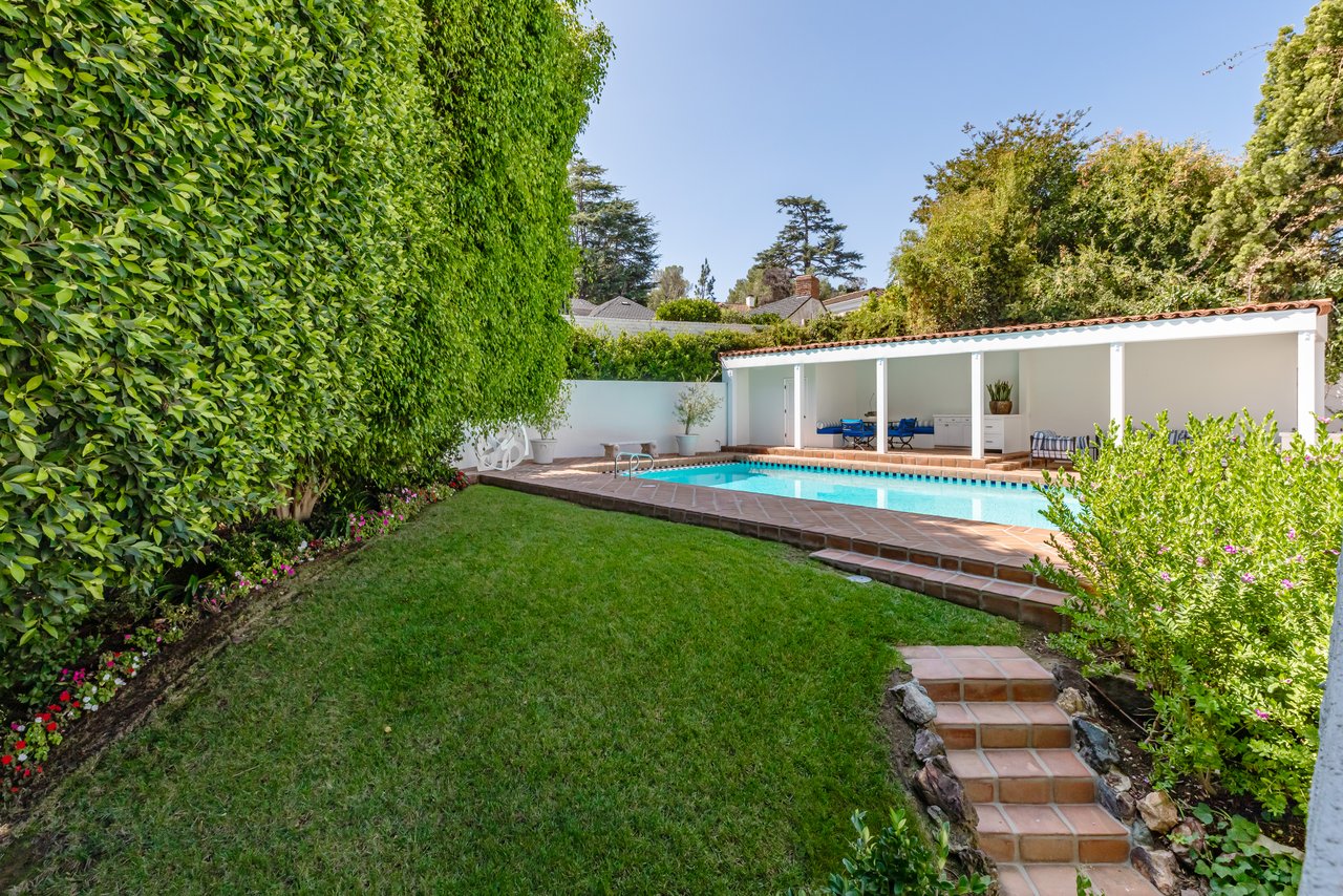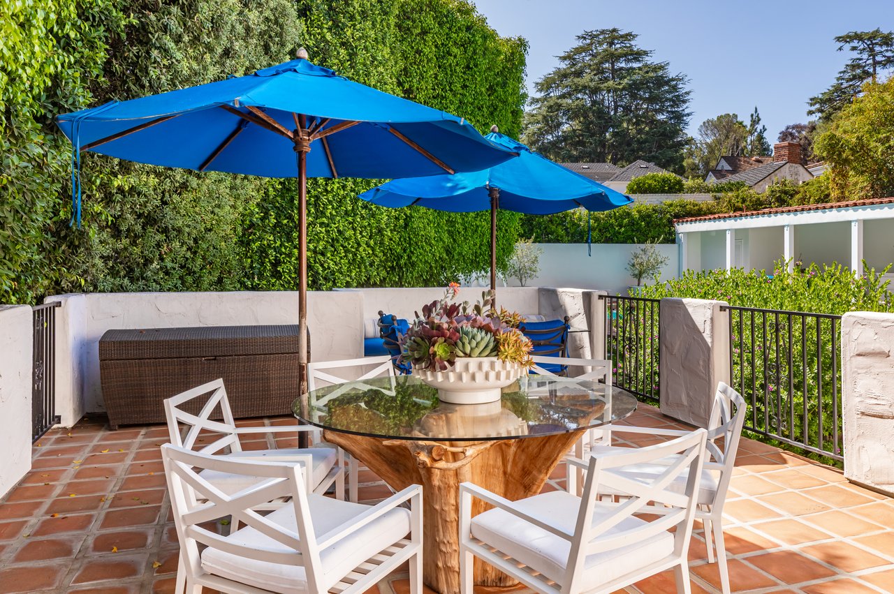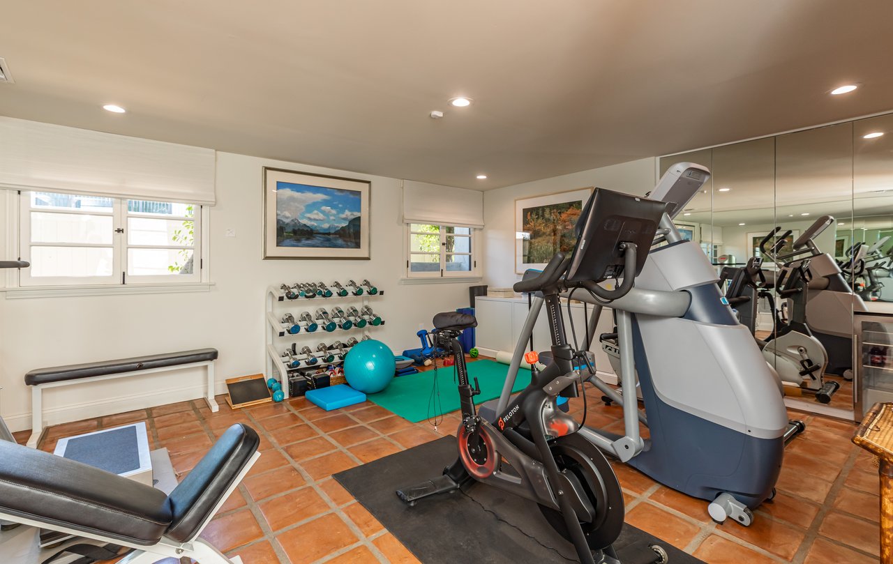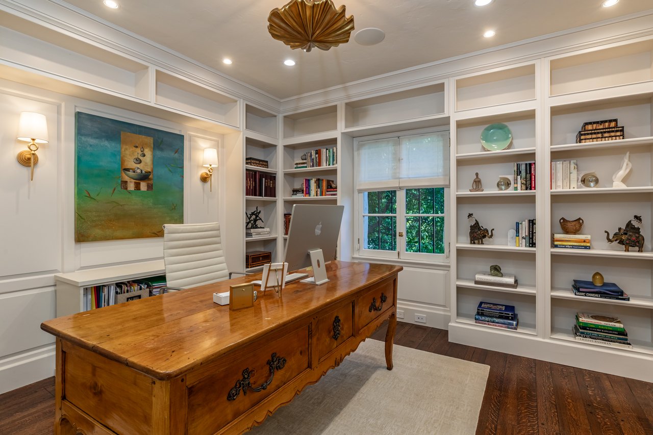 Located on prestigious Comstock Avenue in exclusive Little Holmby, this exquisite Spanish estate offers 4 bedrooms, 4 bathrooms and 2 powder rooms. Thoughtfully reimagined for modern living while preserving its architectural character, the residence celebrates timeless details with exposed wood-beamed ceilings, soft arches, wrought-iron accents and the warmth of natural materials like Saltillo tiling, wood and stone. A soaring two-story foyer with a dramatic staircase and artisan ironwork set the stage. Throughout, original elements meet elevated updates: hand-hewn beams, marble finishes and sunlit rooms. The main level features a versatile office with custom built-ins and a charming den/study with a corner fireplace. The pristine eat-in kitchen is anchored by terracotta tile floors, Calacatta marble countertops, generous storage and an adjoining breakfast room. The well-appointed, generous formal dining room, designed for entertaining, connects seamlessly to the terrace and pool through French doors, while the formal living room, framed by a grand fireplace and exposed wood beams exude sophistication. The spacious family room with soaring ceilings, Juliet balconies and dual sets of French doors creates effortless indoor-outdoor flow to expansive terraces for dining, lounging and entertaining. Upstairs, the ambient light-filled primary suite serves as a sanctuary with Juliet balconies, a fireplace, a secure custom walk-in closet with additional custom built-ins and a marble-clad bathroom featuring a soaking tub, standing shower and dual vanities. French doors open to an expansive terrace overlooking the lushly landscaped grounds. Two additional bedrooms complete the upper level, one with Juliet balconies, the other a junior suite with terrace access and bespoke storage.The lower level reveals a private guest bedroom suite with its own entrance, along with a laundry room, abundant storage, a two-car garage and a private gym with separate exterior entrance.Outdoors, towering hedges and mature trees, envelope the verdant grounds in privacy. Blooming flowers frame the sparkling swimming pool and spa, while a covered cabana with powder room, built-in barbecue and multiple alfresco dining and lounge spaces create a resort-like setting. With thoughtful modern amenities and effortless proximity to UCLA, Westwood Village, Beverly Hills, and Century City, this residence presents a rare opportunity to experience the beauty, privacy and prestige of Little Holmby living.