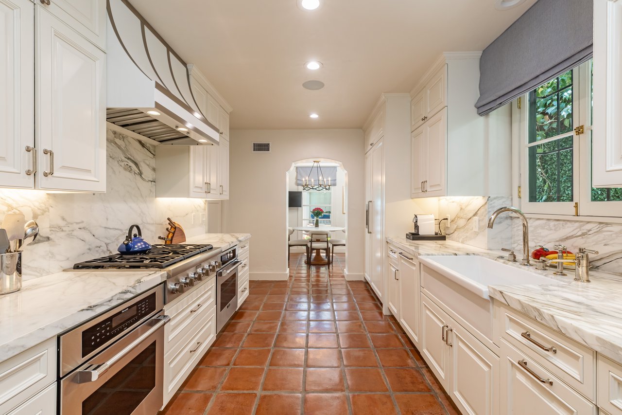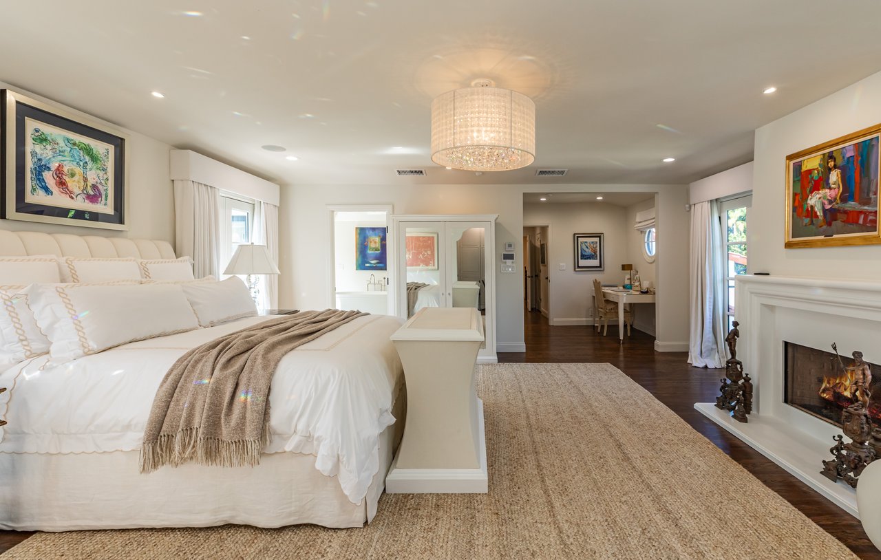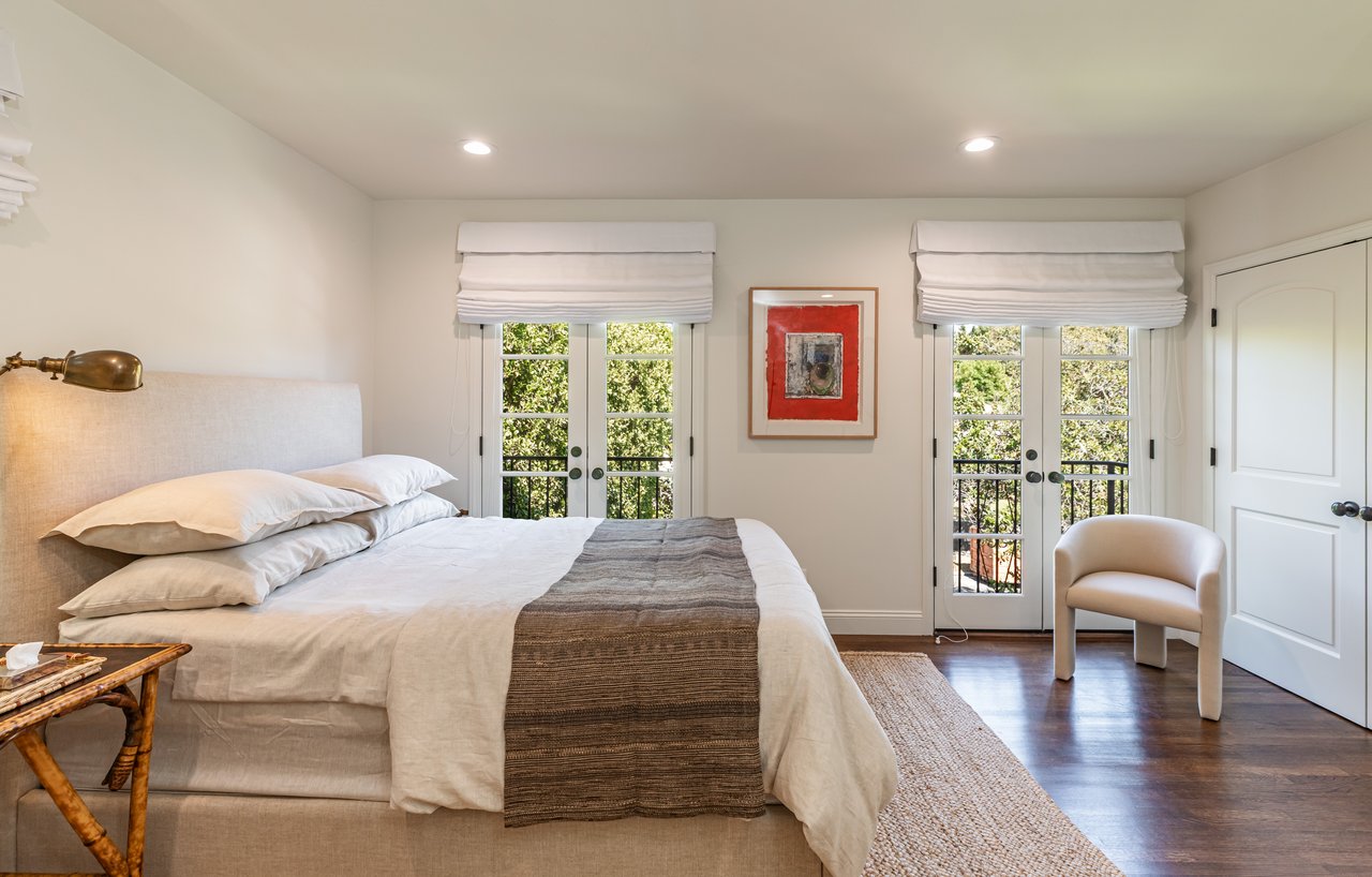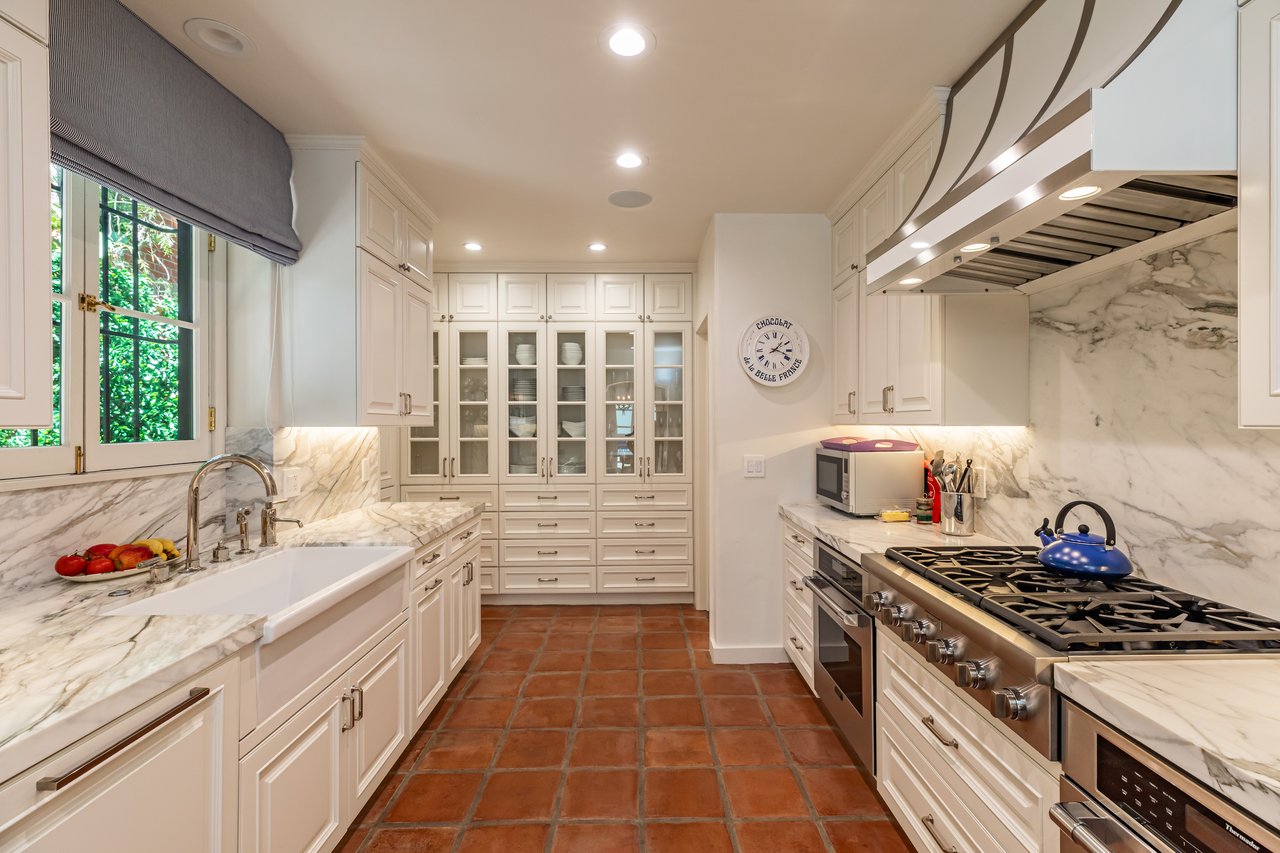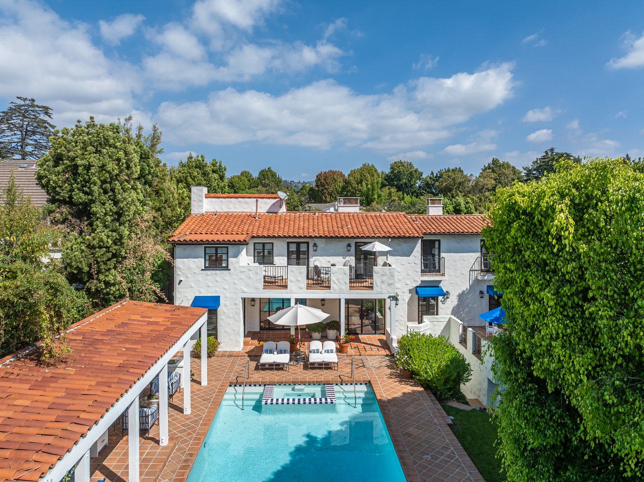 Located on prestigious Comstock Avenue in exclusive Little Holmby, this exquisite Spanish estate offers 4 bedrooms, 4 bathrooms and 2 powder rooms. Thoughtfully reimagined for modern living while preserving its architectural character, the residence celebrates timeless details with exposed wood-beamed ceilings, soft arches, wrought-iron accents and the warmth of natural materials like Saltillo tiling, wood and stone. A soaring two-story foyer with a dramatic staircase and artisan ironwork set the stage. Throughout, original elements meet elevated updates: hand-hewn beams, marble finishes and sunlit rooms. The main level features a versatile office with custom built-ins and a charming den/study with a corner fireplace. The pristine eat-in kitchen is anchored by terracotta tile floors, Calacatta marble countertops, generous storage and an adjoining breakfast room. The well-appointed, generous formal dining room, designed for entertaining, connects seamlessly to the terrace and pool through French doors, while the formal living room, framed by a grand fireplace and exposed wood beams exude sophistication. The spacious family room with soaring ceilings, Juliet balconies and dual sets of French doors creates effortless indoor-outdoor flow to expansive terraces for dining, lounging and entertaining. Upstairs, the ambient light-filled primary suite serves as a sanctuary with Juliet balconies, a fireplace, a secure custom walk-in closet with additional custom built-ins and a marble-clad bathroom featuring a soaking tub, standing shower and dual vanities. French doors open to an expansive terrace overlooking the lushly landscaped grounds. Two additional bedrooms complete the upper level, one with Juliet balconies, the other a junior suite with terrace access and bespoke storage.The lower level reveals a private guest bedroom suite with its own entrance, along with a laundry room, abundant storage, a two-car garage and a private gym with separate exterior entrance.Outdoors, towering hedges and mature trees, envelope the verdant grounds in privacy. Blooming flowers frame the sparkling swimming pool and spa, while a covered cabana with powder room, built-in barbecue and multiple alfresco dining and lounge spaces create a resort-like setting. With thoughtful modern amenities and effortless proximity to UCLA, Westwood Village, Beverly Hills, and Century City, this residence presents a rare opportunity to experience the beauty, privacy and prestige of Little Holmby living.