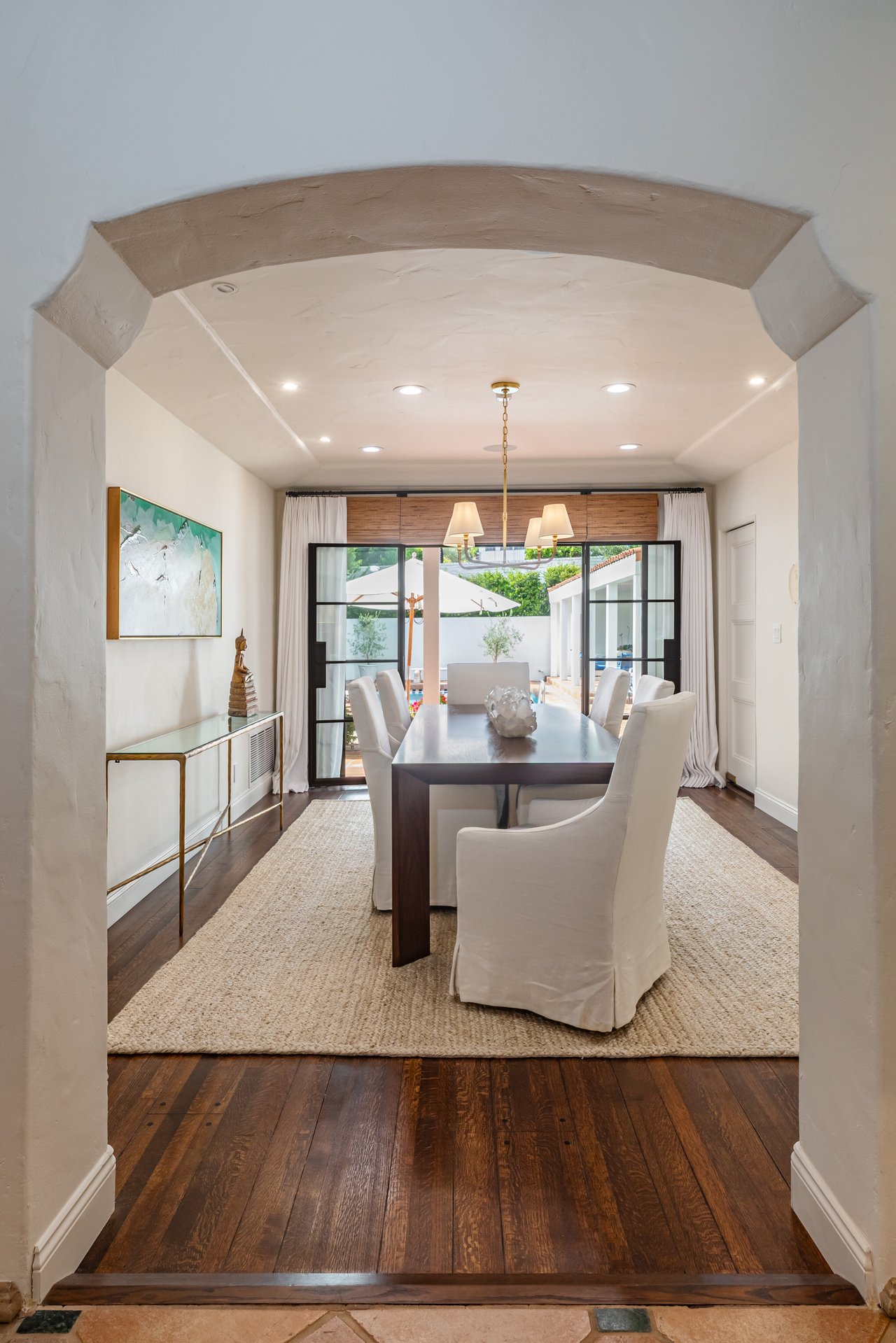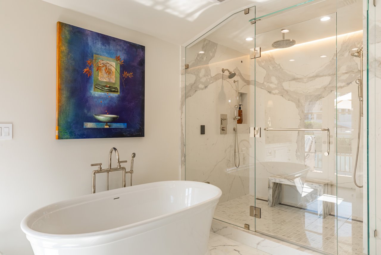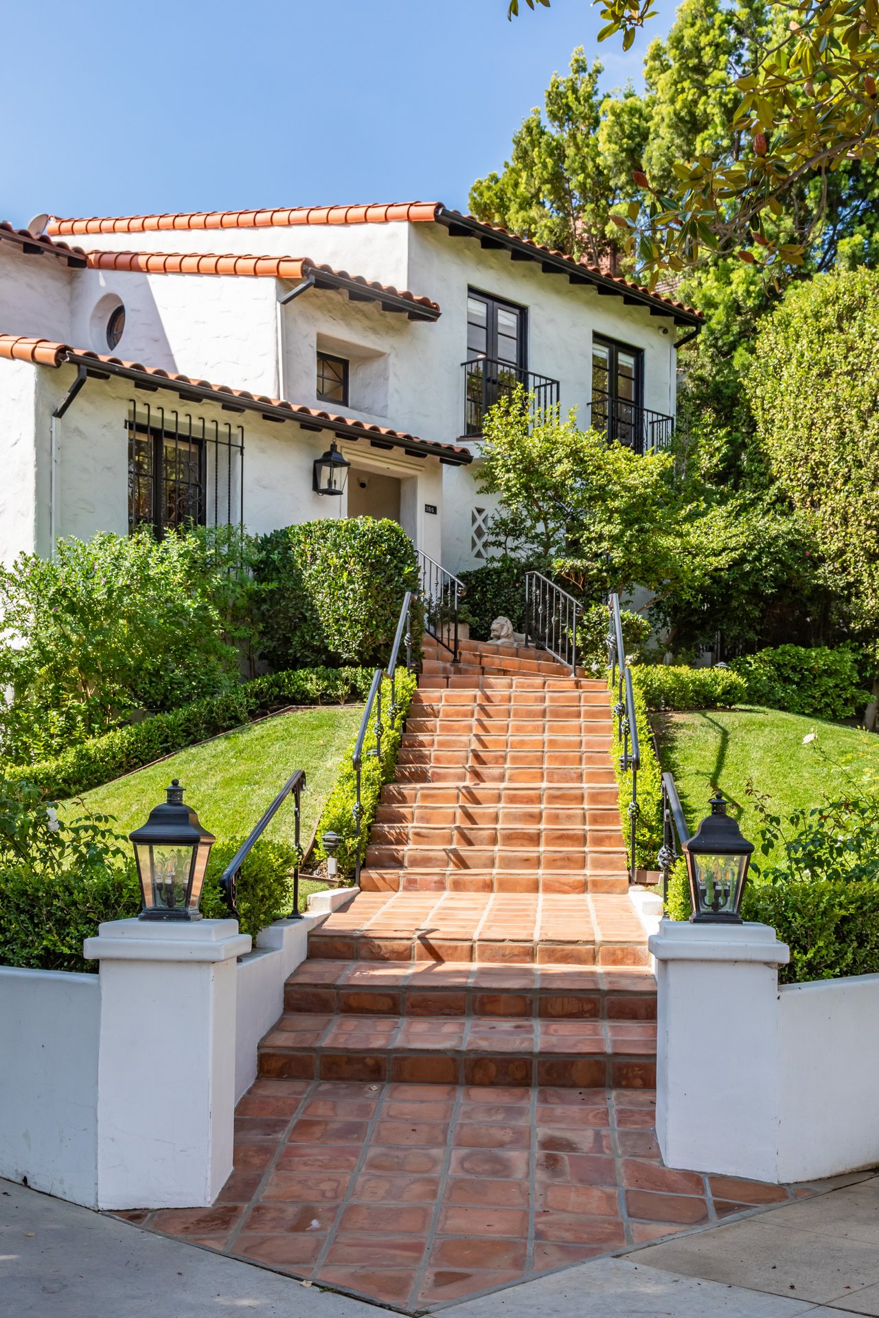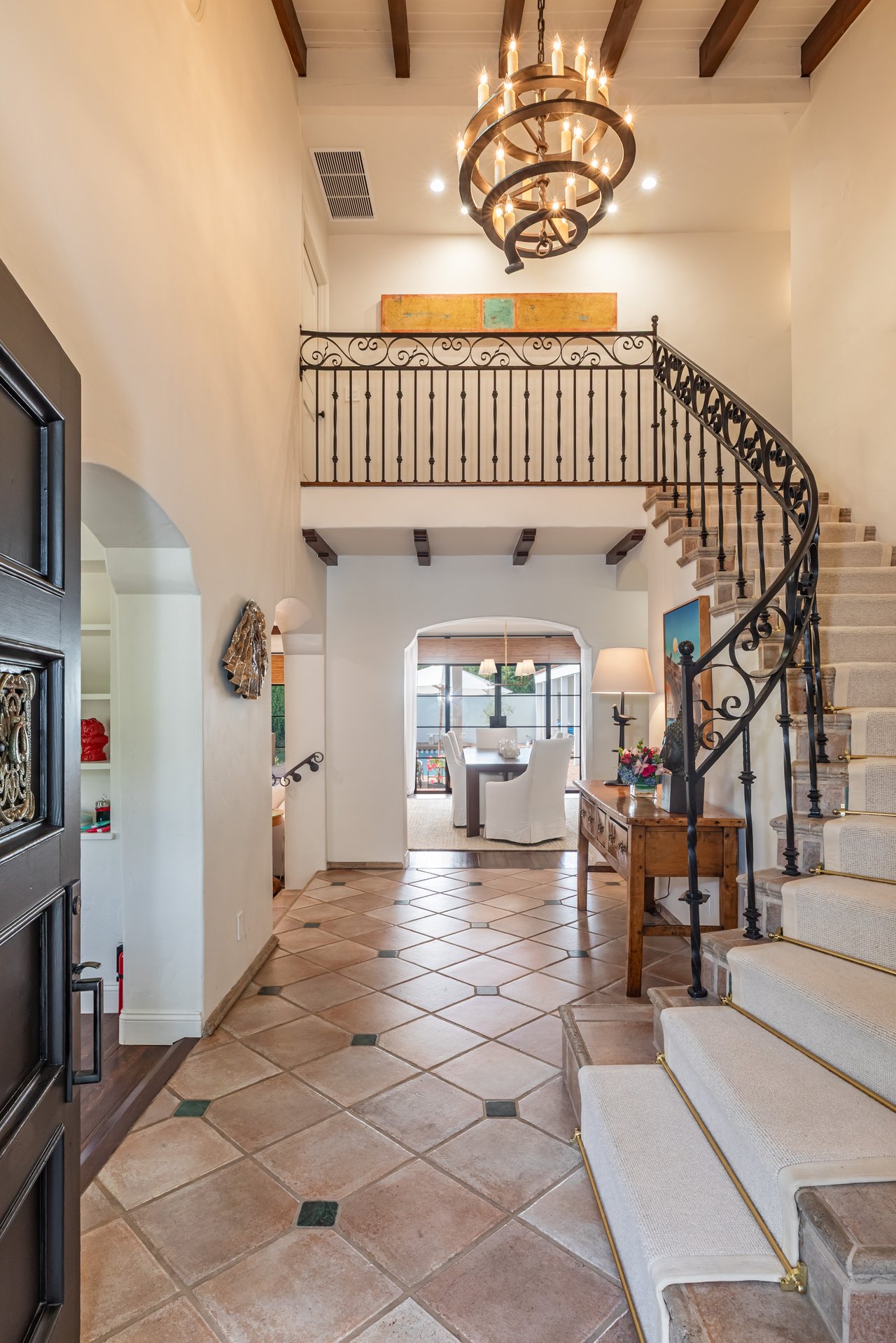 Located on prestigious Comstock Avenue in exclusive Little Holmby, this exquisite Spanish estate offers 4 bedrooms, 4 bathrooms and 2 powder rooms. Thoughtfully reimagined for modern living while preserving its architectural character, the residence celebrates timeless details with exposed wood-beamed ceilings, soft arches, wrought-iron accents and the warmth of natural materials like Saltillo tiling, wood and stone. A soaring two-story foyer with a dramatic staircase and artisan ironwork set the stage. Throughout, original elements meet elevated updates: hand-hewn beams, marble finishes and sunlit rooms. The main level features a versatile office with custom built-ins and a charming den/study with a corner fireplace. The pristine eat-in kitchen is anchored by terracotta tile floors, Calacatta marble countertops, generous storage and an adjoining breakfast room. The well-appointed, generous formal dining room, designed for entertaining, connects seamlessly to the terrace and pool through French doors, while the formal living room, framed by a grand fireplace and exposed wood beams exude sophistication. The spacious family room with soaring ceilings, Juliet balconies and dual sets of French doors creates effortless indoor-outdoor flow to expansive terraces for dining, lounging and entertaining. Upstairs, the ambient light-filled primary suite serves as a sanctuary with Juliet balconies, a fireplace, a secure custom walk-in closet with additional custom built-ins and a marble-clad bathroom featuring a soaking tub, standing shower and dual vanities. French doors open to an expansive terrace overlooking the lushly landscaped grounds. Two additional bedrooms complete the upper level, one with Juliet balconies, the other a junior suite with terrace access and bespoke storage.The lower level reveals a private guest bedroom suite with its own entrance, along with a laundry room, abundant storage, a two-car garage and a private gym with separate exterior entrance.Outdoors, towering hedges and mature trees, envelope the verdant grounds in privacy. Blooming flowers frame the sparkling swimming pool and spa, while a covered cabana with powder room, built-in barbecue and multiple alfresco dining and lounge spaces create a resort-like setting. With thoughtful modern amenities and effortless proximity to UCLA, Westwood Village, Beverly Hills, and Century City, this residence presents a rare opportunity to experience the beauty, privacy and prestige of Little Holmby living.
