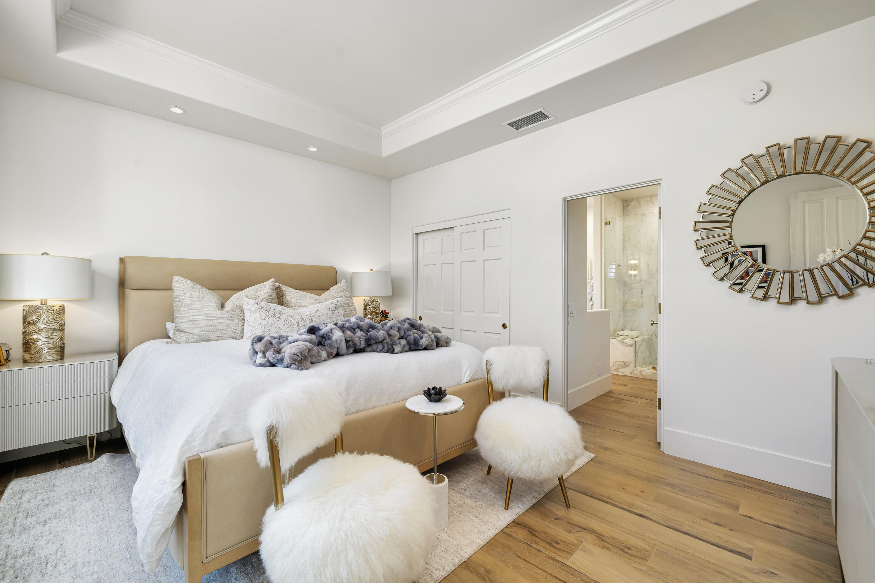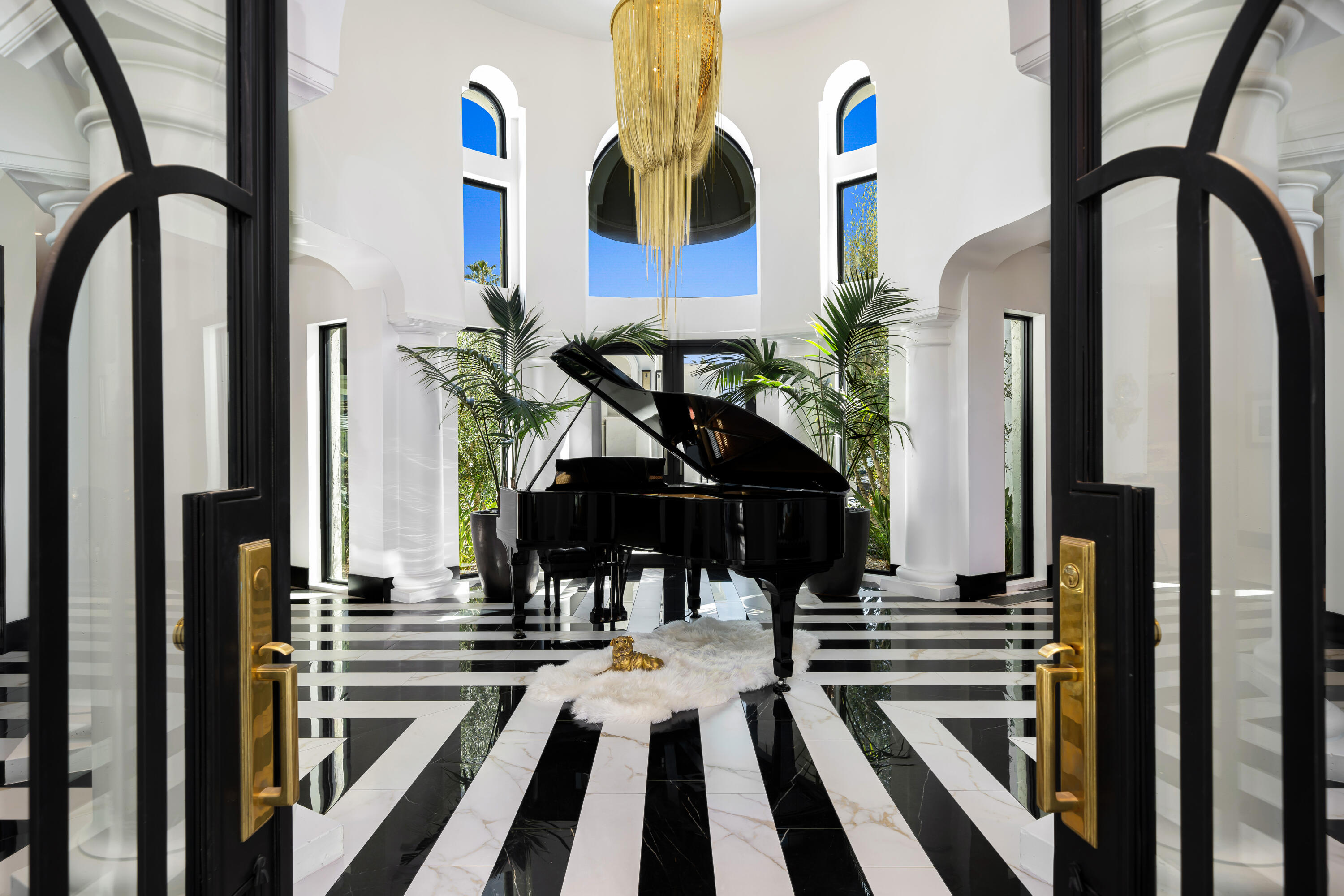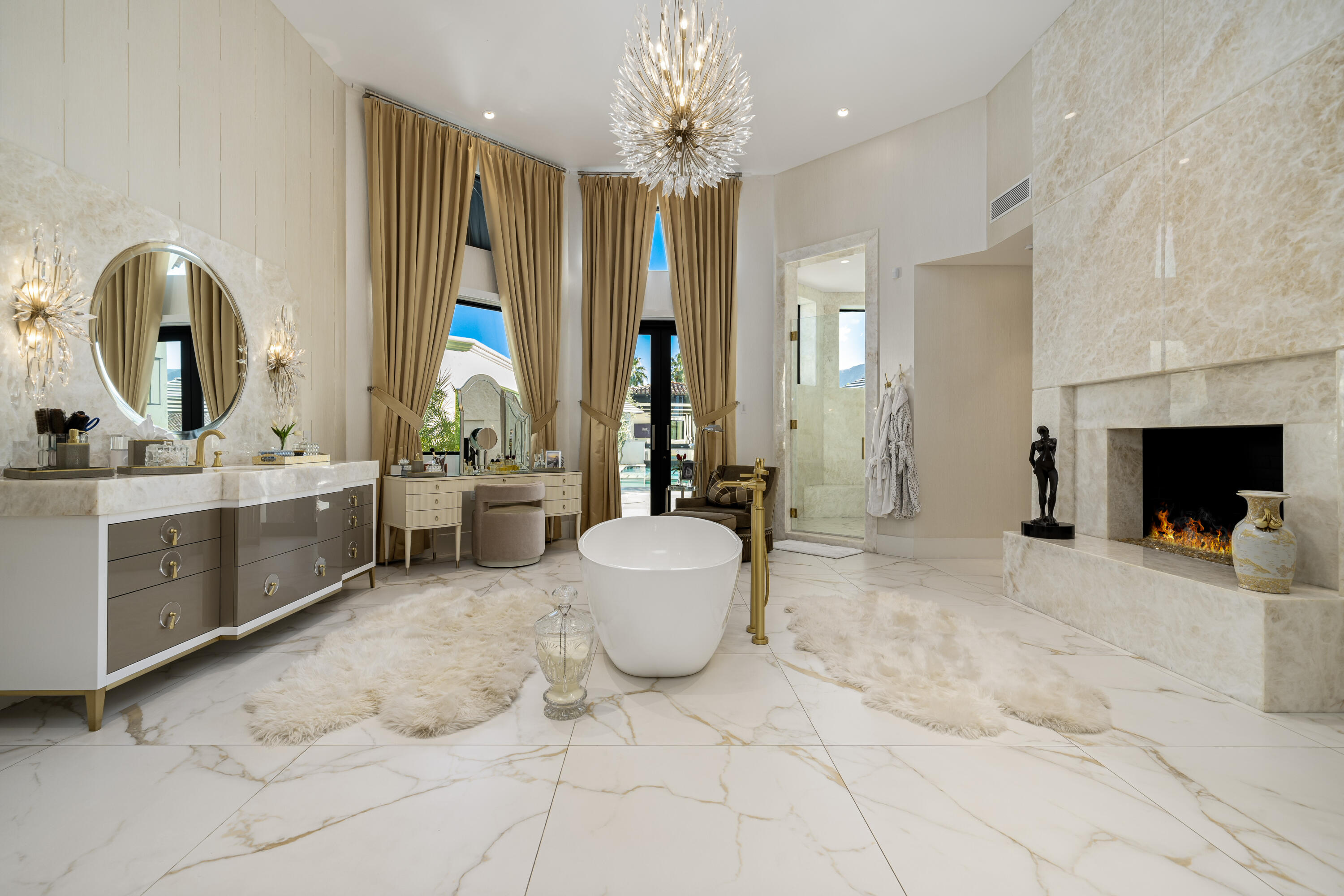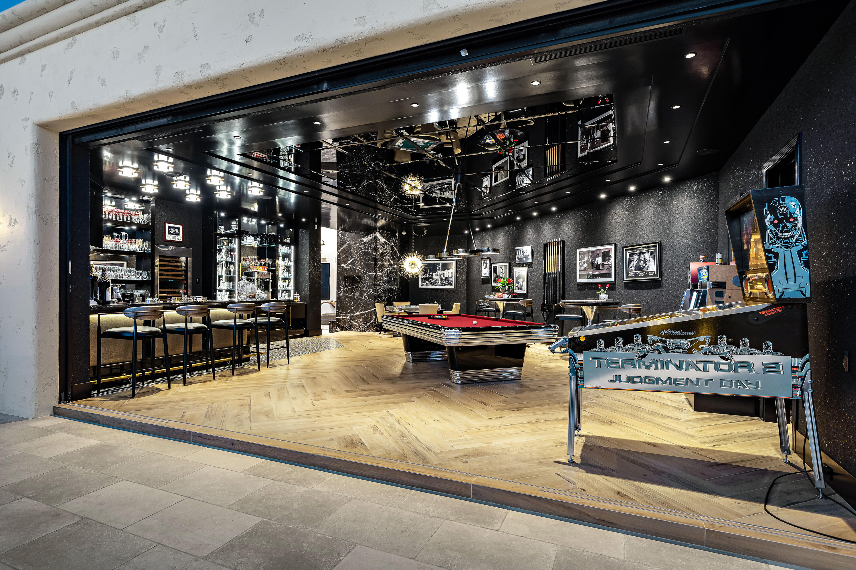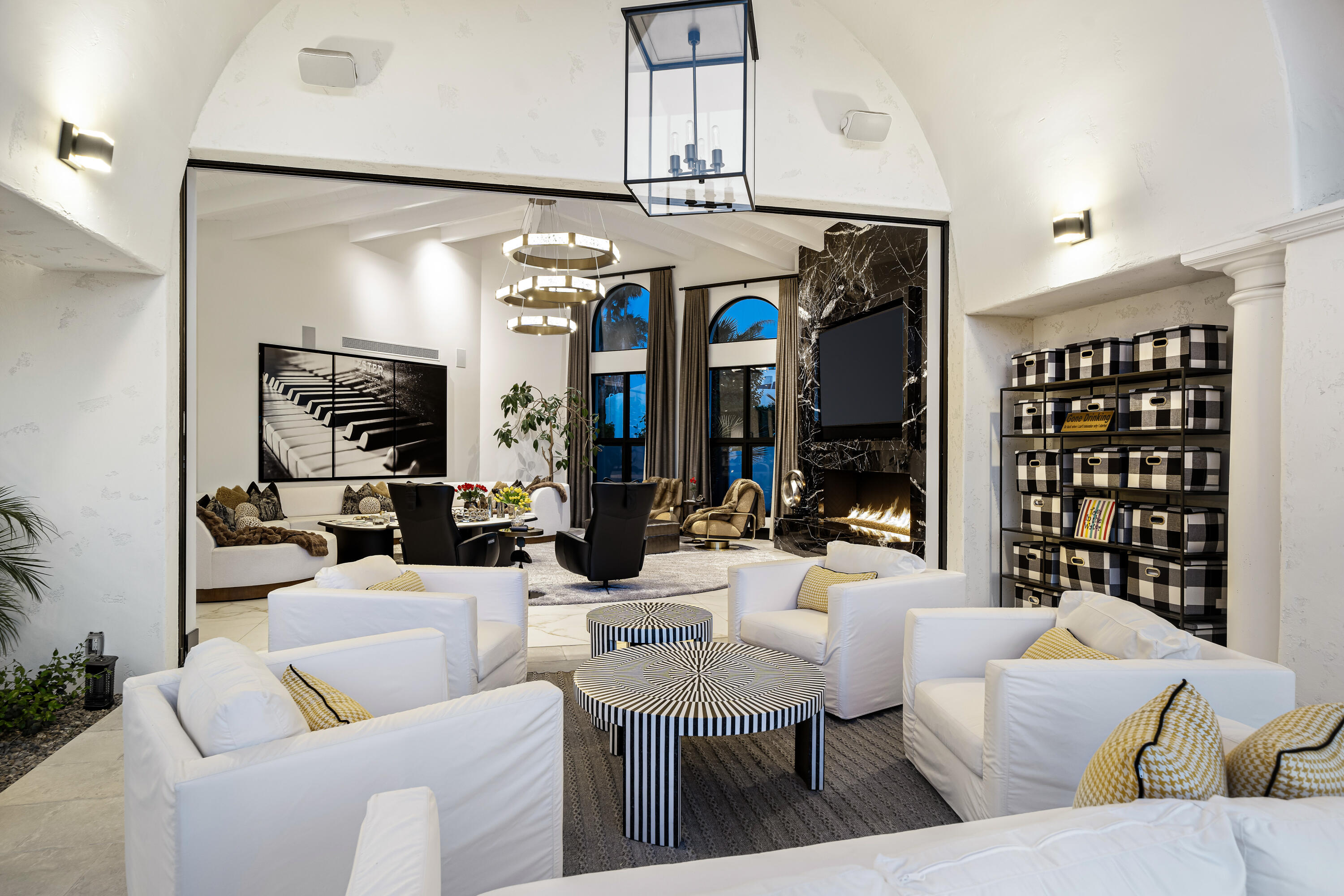 Behind the 24-hour guarded gates of Mission Ranch in Rancho Mirage, this remarkable 1.26-acre estate stands out for its unparalleled features - including a rare 10-car garage and 8 ensuite bedrooms, making it one of the desert's most unique luxury properties.The impressive garage configuration includes an 8-car tandem showcase garage - ideal for collectors - plus a separate 2-car attached garage at the main residence. For car enthusiasts or those who simply appreciate grand scale, this space is unmatched in both capacity and presentation. Thoughtfully reimagined, the nearly 9,400-square-foot residence offers refined living, timeless architecture, and resort-style amenities throughout. Designed for ultimate flexibility, the home features a combination of expansive suites and private guest quarters, ensuring comfort and privacy for all. A dramatic foyer welcomes you with soaring ceilings, intricate detailing, and a statement chandelier that sets the tone for the home's sophisticated design. Expansive living spaces flow seamlessly into a stylish game and media lounge with a restored vintage Brunswick pool table, pinball machines, and a sleek wet bar - perfect for entertaining. The chef's kitchen is a showpiece of form and function, equipped with Sub-Zero and Wolf appliances, dual dishwashers, an oversized island, and a full butler's kitchen tucked discreetly behind for catering or event prep. The primary suite evokes the tranquility of a five-star resort, featuring dual spa-inspired bathrooms and custom dressing areas. Outdoors, the estate becomes a private resort of its own - complete with a sparkling pool and spa surrounded by fire and water features, a grand pavilion with outdoor kitchen and pizza oven, and a lighted sports court that accommodates tennis, pickleball, and basketball. Residents of Mission Ranch also enjoy exclusive access to community equestrian facilities, a rare amenity for horse enthusiasts within this prestigious enclave. Located just minutes fro