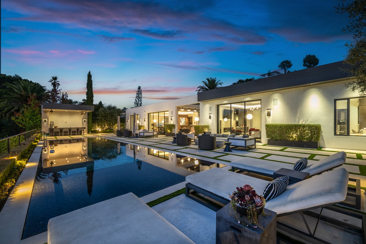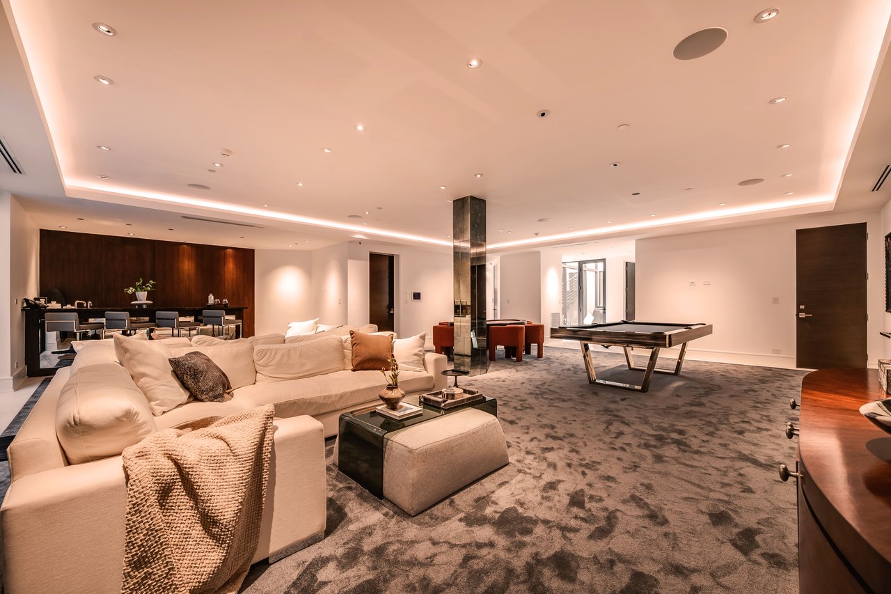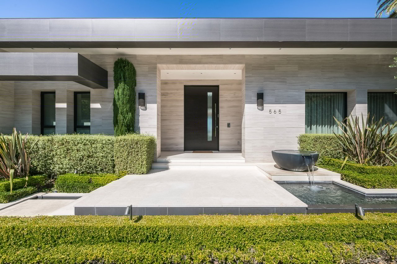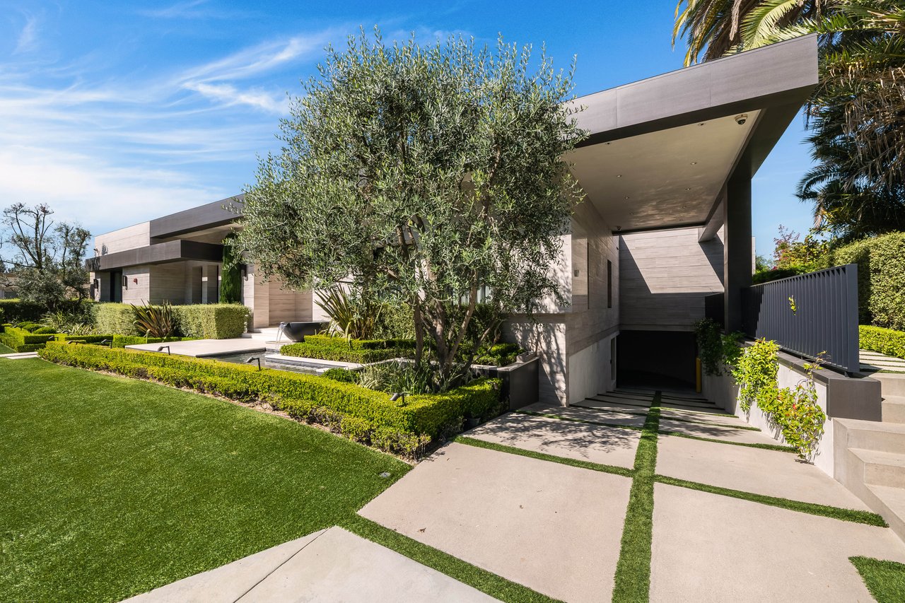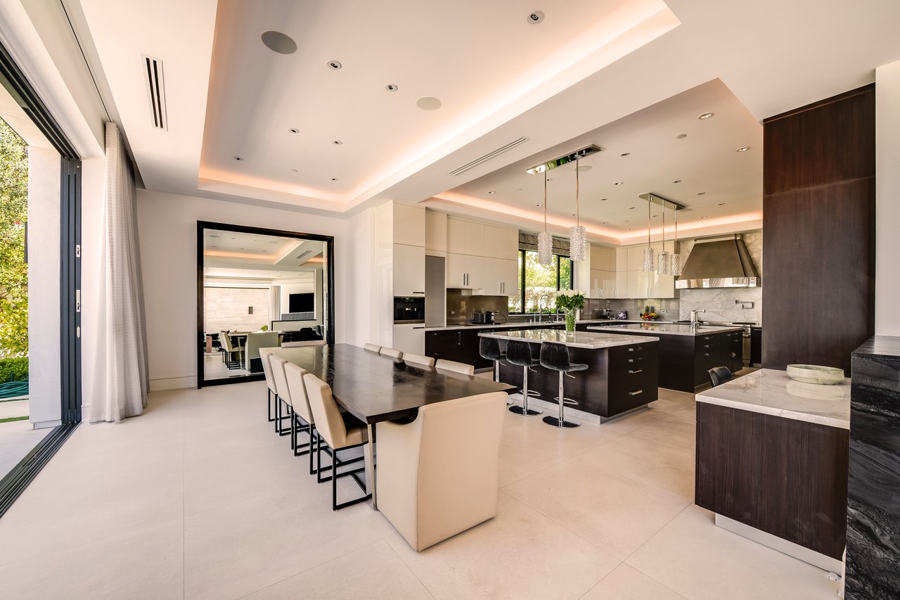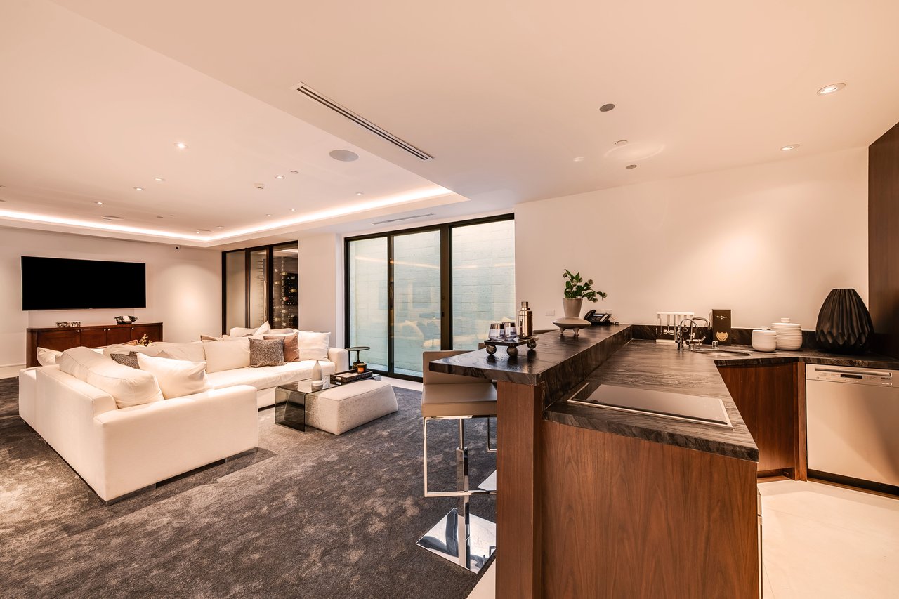 Nestled in the heart of the legendary Trousdale Estates of Beverly Hills, 565 Evelyn Place is a custom-built modern architectural triumph that fuses precision craftsmanship with warm livability. Completed in 2017, this residence was envisioned as a statement of timeless contemporary design sculpted lines, dramatic volumes, and a seamless indoor-outdoor flow that celebrates the Southern California lifestyle. From the moment you approach, the home commands attention. Expansive glass openings frame serene water features, while the landscape unfolds in a series of intimate gardens and gathering spaces. Inside, natural light pours through open volumes, highlighting a sophisticated materials palette of walnut, limestone, and custom Italian marbles. A state-of-the-art lighting program offers pre-set ambient scenes, while Conrad electric shades provide effortless privacy and control.At the center of the home is a breathtaking Poggenpohl kitchen, clad in rare Borghini Carrara marble and meticulously outfitted for both passionate cooks and professional entertaining. Two Miele dishwashers, three integrated refrigerators, a full 60-inch range with steamer oven, a built-in coffee system, and three sinks allow for seamless culinary preparation. A discreet butler's pantry and a fully equipped second kitchen downstairs support large-scale entertaining while preserving the kitchen's sculptural elegance. Every living space has been designed for both intimacy and spectacle. The home features three dramatic wet bars with ice makers, a library wrapped in hand-painted wallpaper and custom walnut millwork, and a series of lounges anchored by bespoke fireplaces some leathered marble, others sculpted from specialty stone. The floor plan opens effortlessly to lush gardens and resort-inspired outdoor living, where a full kitchen with BBQ, stovetop, and ice maker joins a fireplace, integrated heaters, and tranquil fountains. A separate courtside stone entertaining area invites long, sunlit afternoons and evenings under the stars. The primary suite is a private sanctuary, featuring walnut floors, dual steam showers, heated bathroom floors, and exquisitely detailed Italian marble baths. Thoughtful luxuries such as a dedicated suite refrigerator elevate comfort to the highest level. Throughout the home, technology quietly enhances everyday living with Crestron whole-house control of lighting, climate, sound, and security. Additional comforts include a central vacuum system, a private elevator, and a five-car garage finished with the same level of detail as the living spaces. A custom-designed gym completes the experience, while water features and curated landscaping lend a sense of tranquility and escape. Every detail of 565 Evelyn Place reflects a passion for design and an uncompromising standard of craftsmanship. This is more than a home, it is a modern estate built for those who value artistry, innovation, and the enduring prestige of one of Beverly Hills' most sought-after enclaves.