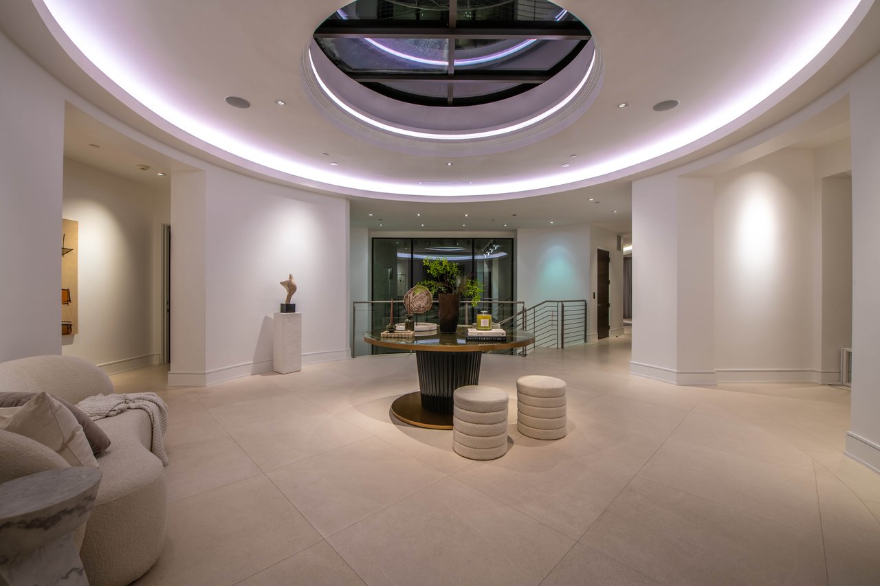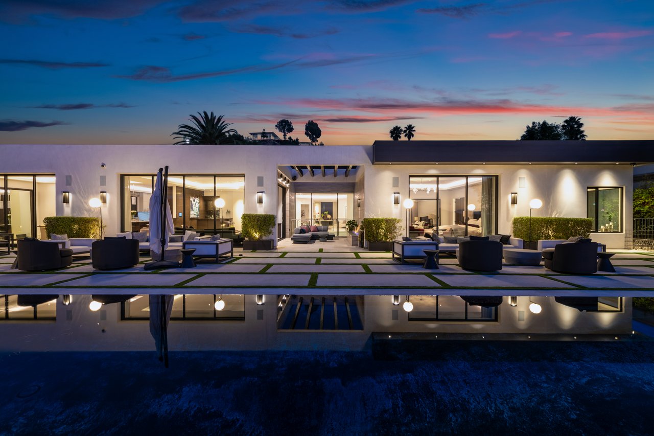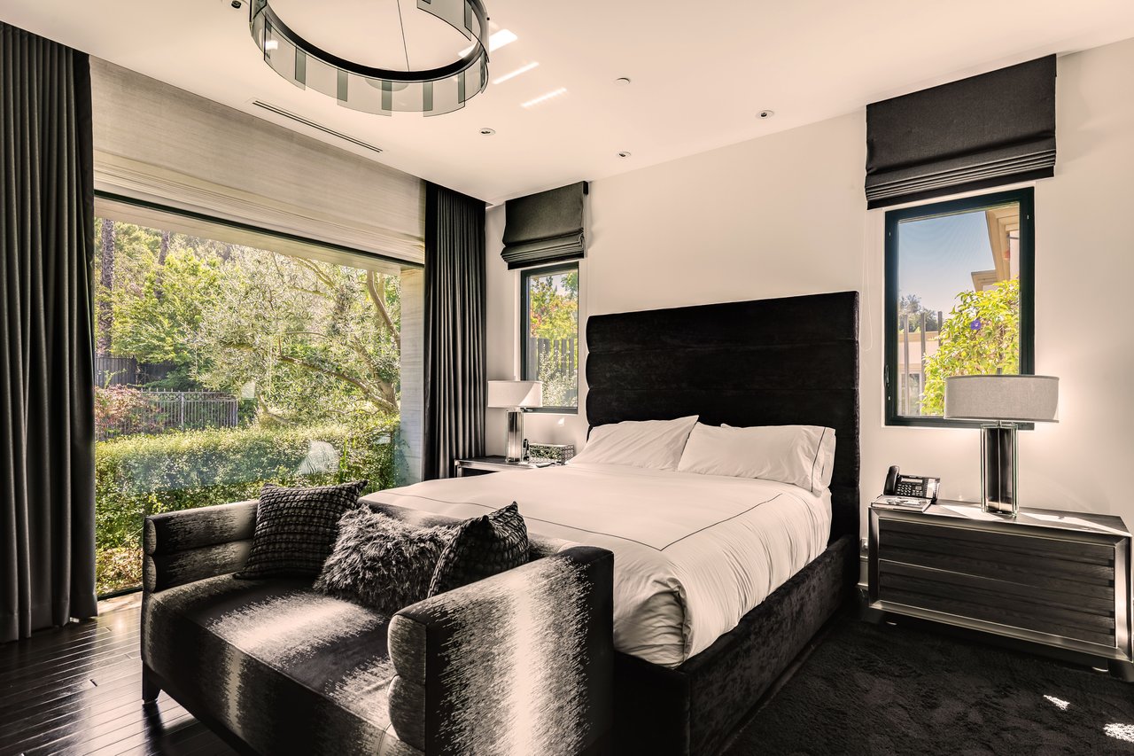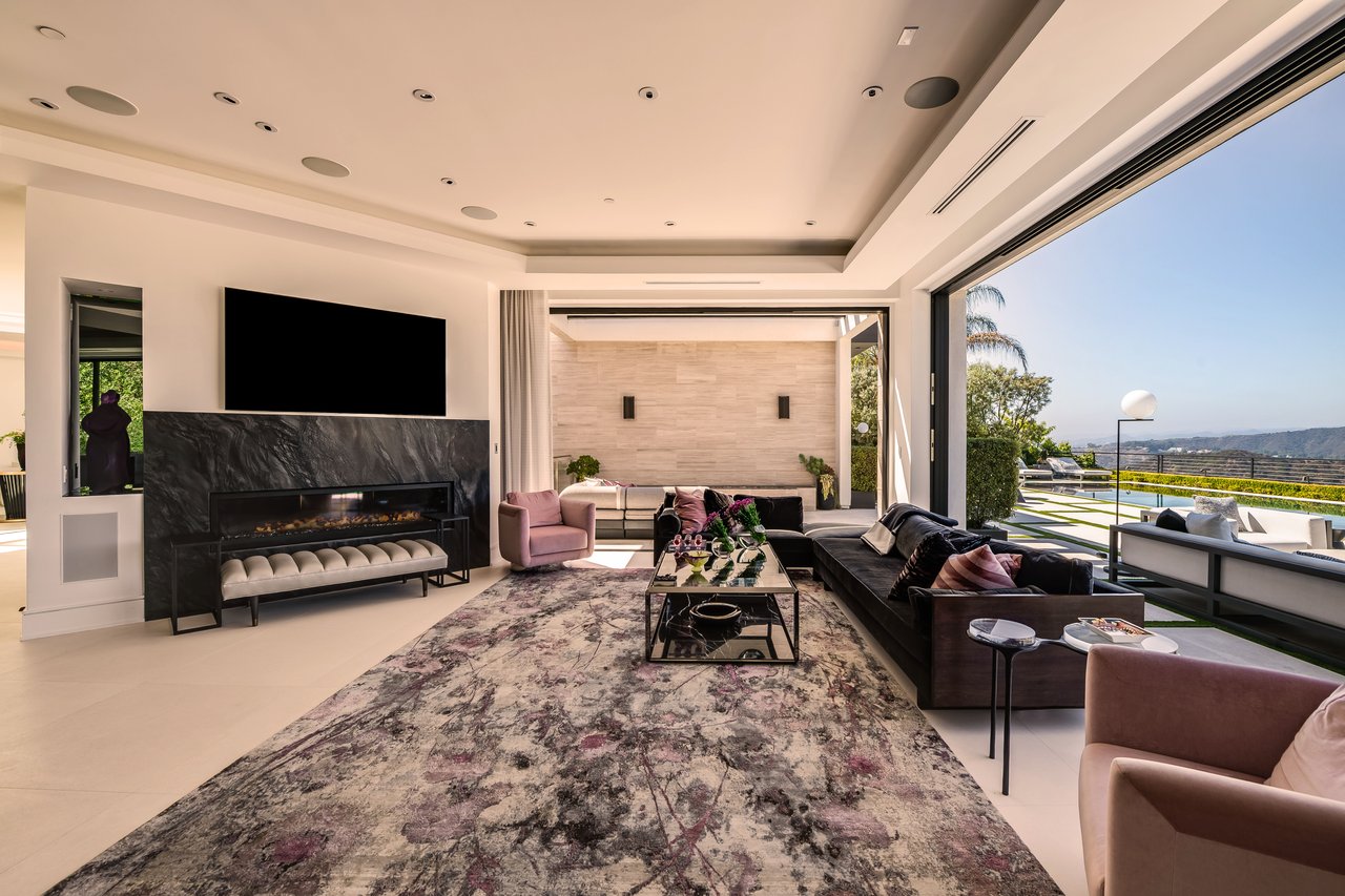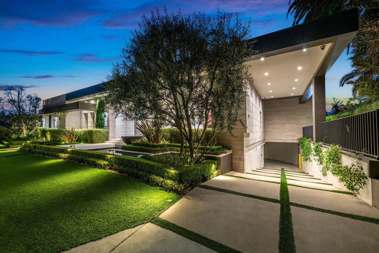 Nestled in the heart of the legendary Trousdale Estates of Beverly Hills, 565 Evelyn Place is a custom-built modern architectural triumph that fuses precision craftsmanship with warm livability. Completed in 2017, this residence was envisioned as a statement of timeless contemporary design sculpted lines, dramatic volumes, and a seamless indoor-outdoor flow that celebrates the Southern California lifestyle. From the moment you approach, the home commands attention. Expansive glass openings frame serene water features, while the landscape unfolds in a series of intimate gardens and gathering spaces. Inside, natural light pours through open volumes, highlighting a sophisticated materials palette of walnut, limestone, and custom Italian marbles. A state-of-the-art lighting program offers pre-set ambient scenes, while Conrad electric shades provide effortless privacy and control.At the center of the home is a breathtaking Poggenpohl kitchen, clad in rare Borghini Carrara marble and meticulously outfitted for both passionate cooks and professional entertaining. Two Miele dishwashers, three integrated refrigerators, a full 60-inch range with steamer oven, a built-in coffee system, and three sinks allow for seamless culinary preparation. A discreet butler's pantry and a fully equipped second kitchen downstairs support large-scale entertaining while preserving the kitchen's sculptural elegance. Every living space has been designed for both intimacy and spectacle. The home features three dramatic wet bars with ice makers, a library wrapped in hand-painted wallpaper and custom walnut millwork, and a series of lounges anchored by bespoke fireplaces some leathered marble, others sculpted from specialty stone. The floor plan opens effortlessly to lush gardens and resort-inspired outdoor living, where a full kitchen with BBQ, stovetop, and ice maker joins a fireplace, integrated heaters, and tranquil fountains. A separate courtside stone entertaining area invites long, sunlit afternoons and evenings under the stars. The primary suite is a private sanctuary, featuring walnut floors, dual steam showers, heated bathroom floors, and exquisitely detailed Italian marble baths. Thoughtful luxuries such as a dedicated suite refrigerator elevate comfort to the highest level. Throughout the home, technology quietly enhances everyday living with Crestron whole-house control of lighting, climate, sound, and security. Additional comforts include a central vacuum system, a private elevator, and a five-car garage finished with the same level of detail as the living spaces. A custom-designed gym completes the experience, while water features and curated landscaping lend a sense of tranquility and escape. Every detail of 565 Evelyn Place reflects a passion for design and an uncompromising standard of craftsmanship. This is more than a home, it is a modern estate built for those who value artistry, innovation, and the enduring prestige of one of Beverly Hills' most sought-after enclaves.