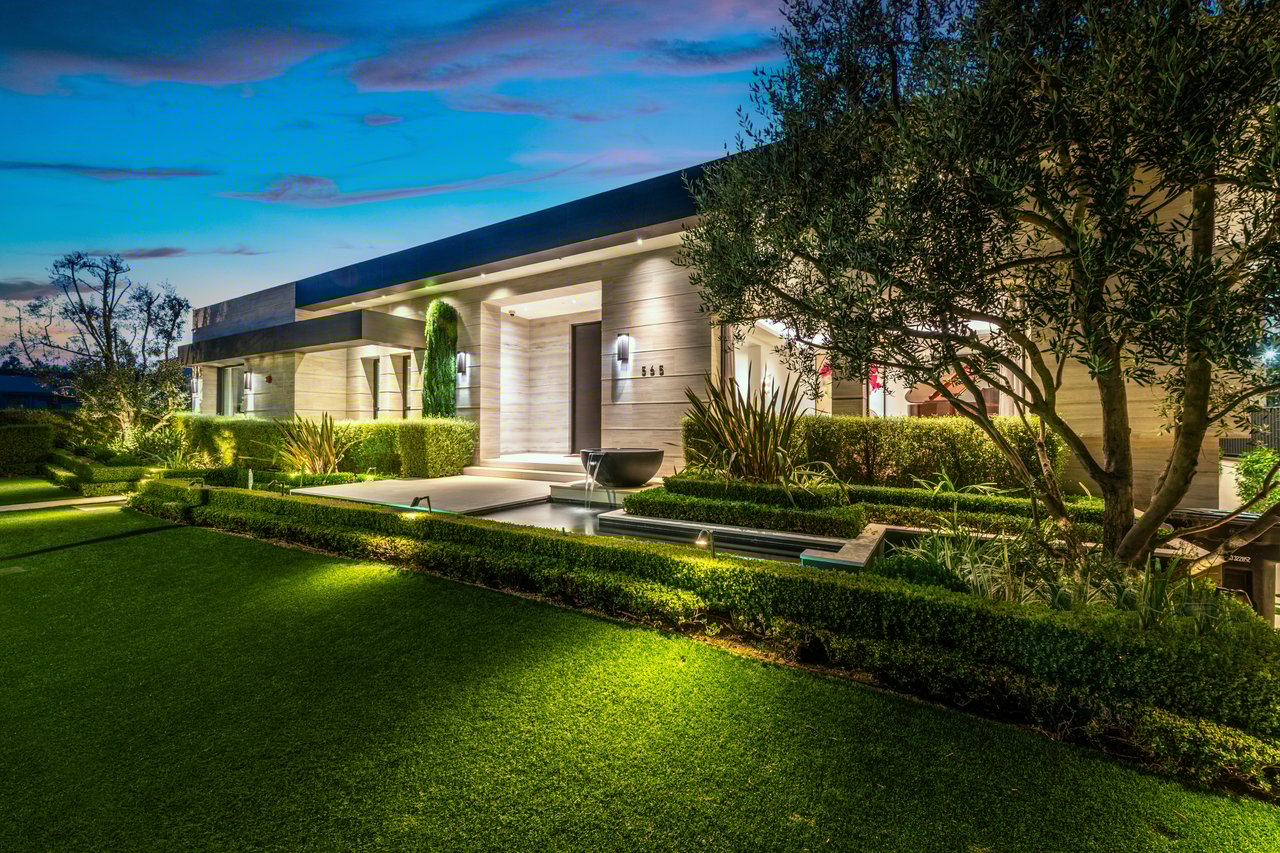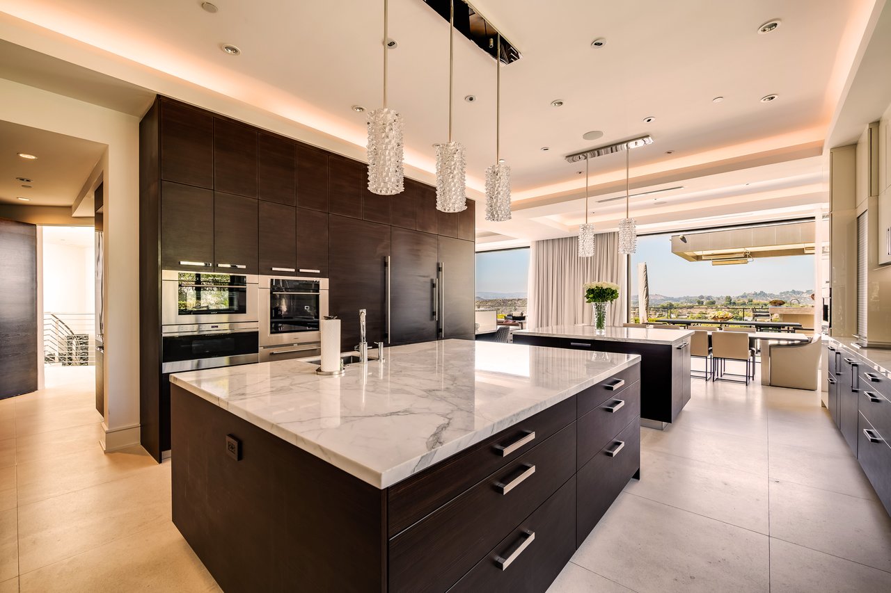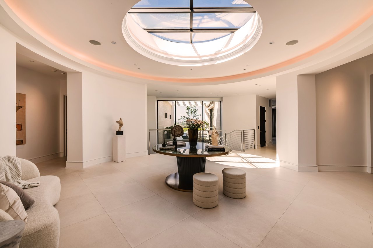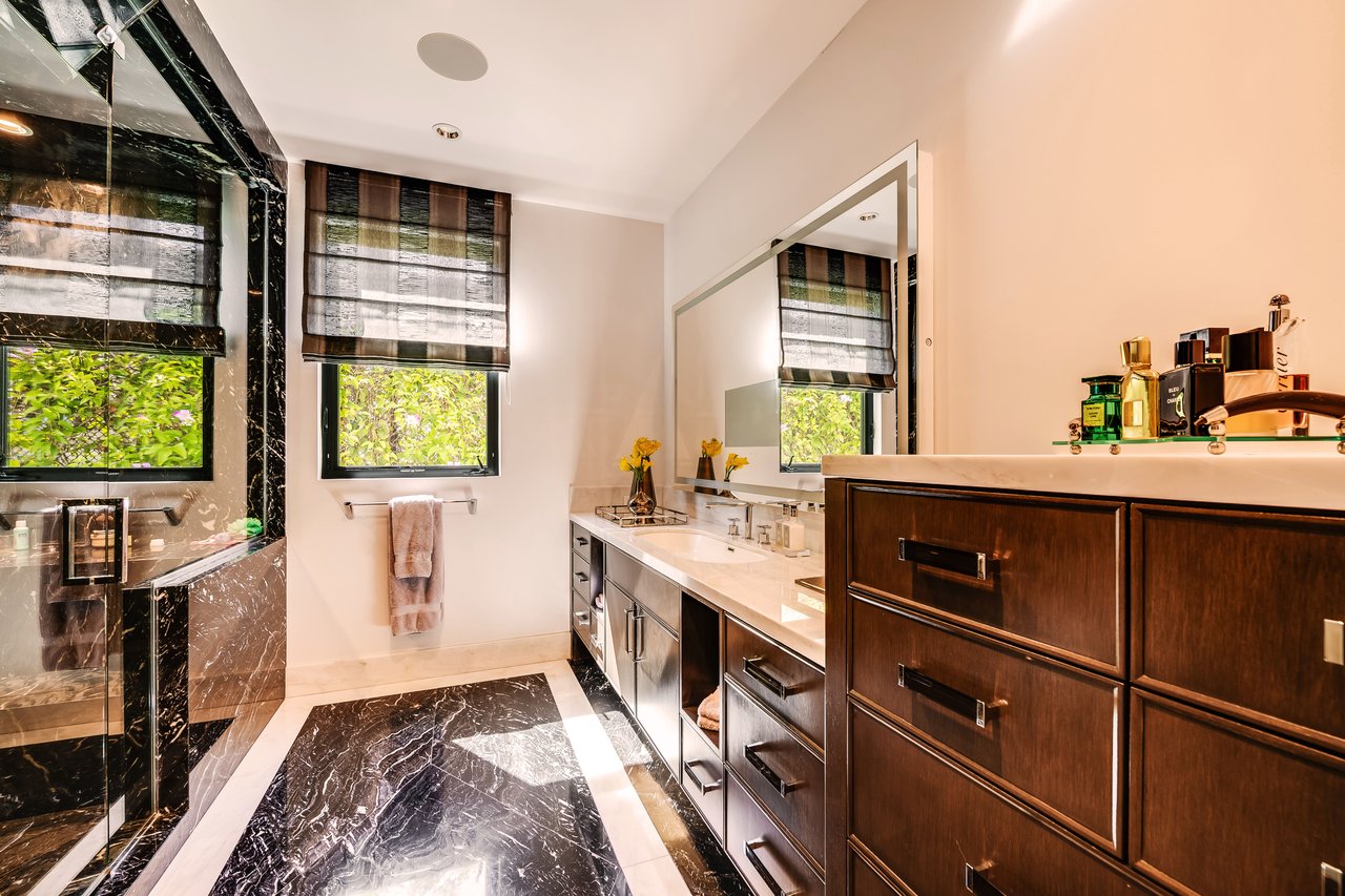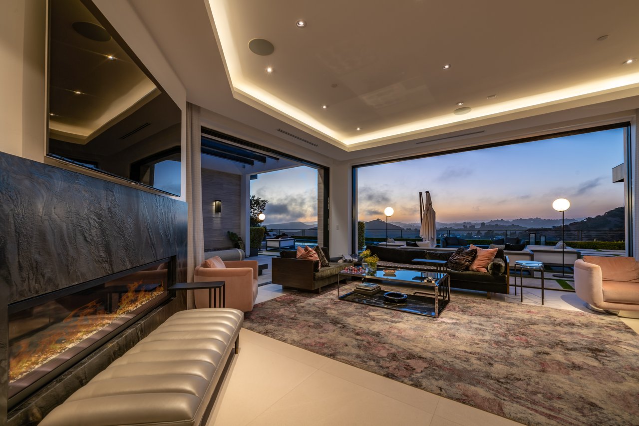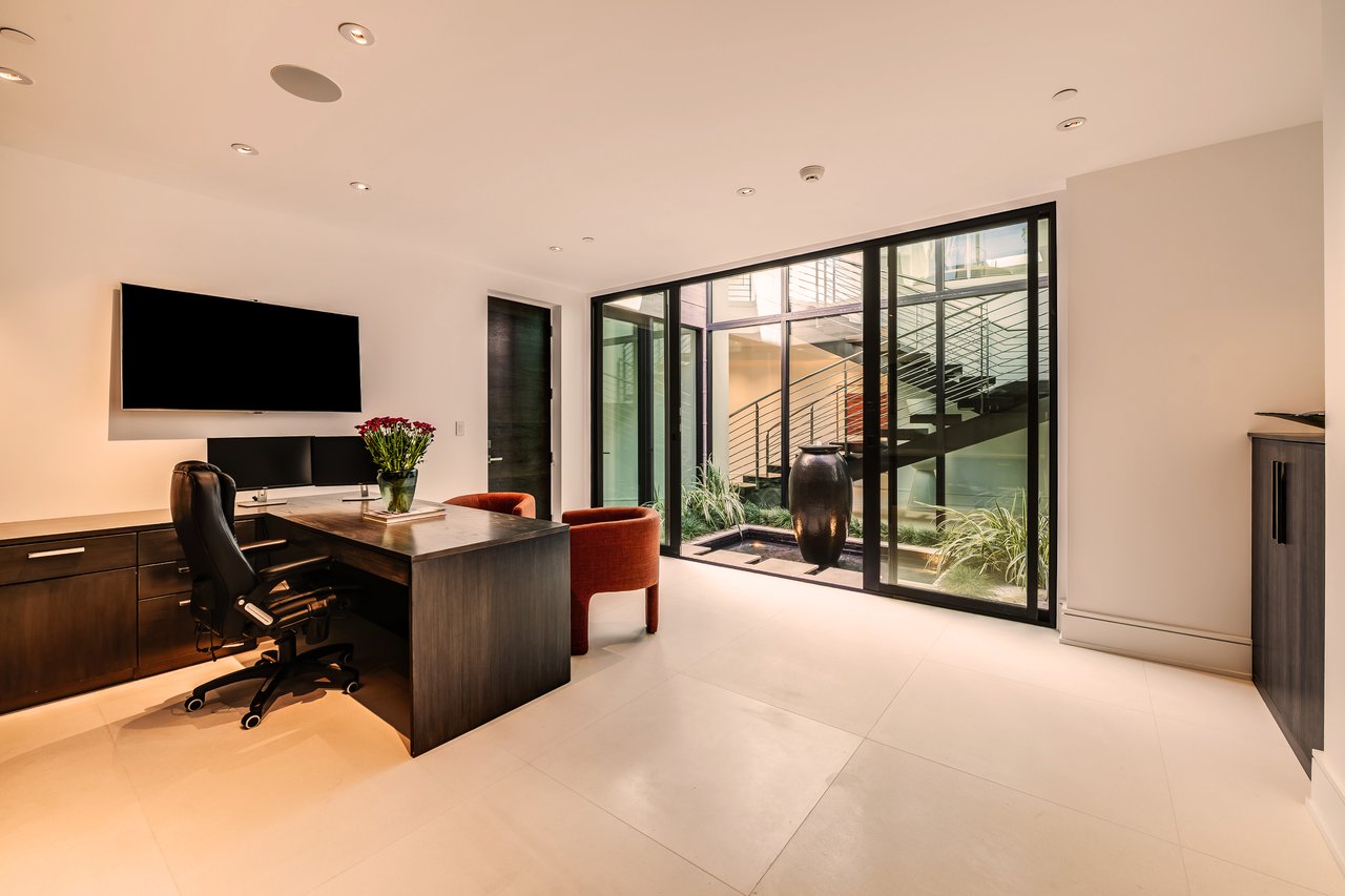 Nestled in the heart of the legendary Trousdale Estates of Beverly Hills, 565 Evelyn Place is a custom-built modern architectural triumph that fuses precision craftsmanship with warm livability. Completed in 2017, this residence was envisioned as a statement of timeless contemporary design sculpted lines, dramatic volumes, and a seamless indoor-outdoor flow that celebrates the Southern California lifestyle. From the moment you approach, the home commands attention. Expansive glass openings frame serene water features, while the landscape unfolds in a series of intimate gardens and gathering spaces. Inside, natural light pours through open volumes, highlighting a sophisticated materials palette of walnut, limestone, and custom Italian marbles. A state-of-the-art lighting program offers pre-set ambient scenes, while Conrad electric shades provide effortless privacy and control.At the center of the home is a breathtaking Poggenpohl kitchen, clad in rare Borghini Carrara marble and meticulously outfitted for both passionate cooks and professional entertaining. Two Miele dishwashers, three integrated refrigerators, a full 60-inch range with steamer oven, a built-in coffee system, and three sinks allow for seamless culinary preparation. A discreet butler's pantry and a fully equipped second kitchen downstairs support large-scale entertaining while preserving the kitchen's sculptural elegance. Every living space has been designed for both intimacy and spectacle. The home features three dramatic wet bars with ice makers, a library wrapped in hand-painted wallpaper and custom walnut millwork, and a series of lounges anchored by bespoke fireplaces some leathered marble, others sculpted from specialty stone. The floor plan opens effortlessly to lush gardens and resort-inspired outdoor living, where a full kitchen with BBQ, stovetop, and ice maker joins a fireplace, integrated heaters, and tranquil fountains. A separate courtside stone entertaining area invites long, sunlit afternoons and evenings under the stars. The primary suite is a private sanctuary, featuring walnut floors, dual steam showers, heated bathroom floors, and exquisitely detailed Italian marble baths. Thoughtful luxuries such as a dedicated suite refrigerator elevate comfort to the highest level. Throughout the home, technology quietly enhances everyday living with Crestron whole-house control of lighting, climate, sound, and security. Additional comforts include a central vacuum system, a private elevator, and a five-car garage finished with the same level of detail as the living spaces. A custom-designed gym completes the experience, while water features and curated landscaping lend a sense of tranquility and escape. Every detail of 565 Evelyn Place reflects a passion for design and an uncompromising standard of craftsmanship. This is more than a home, it is a modern estate built for those who value artistry, innovation, and the enduring prestige of one of Beverly Hills' most sought-after enclaves.