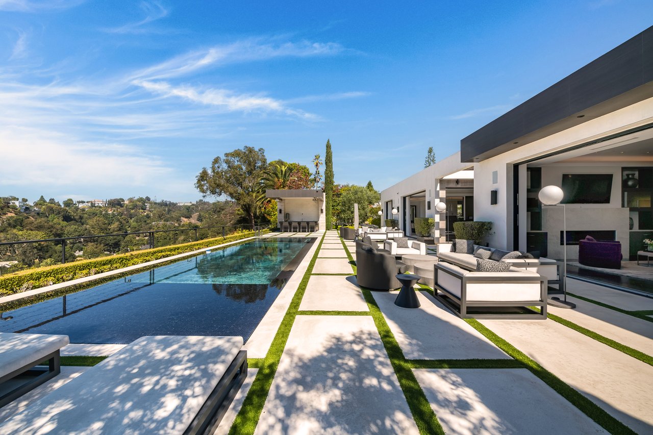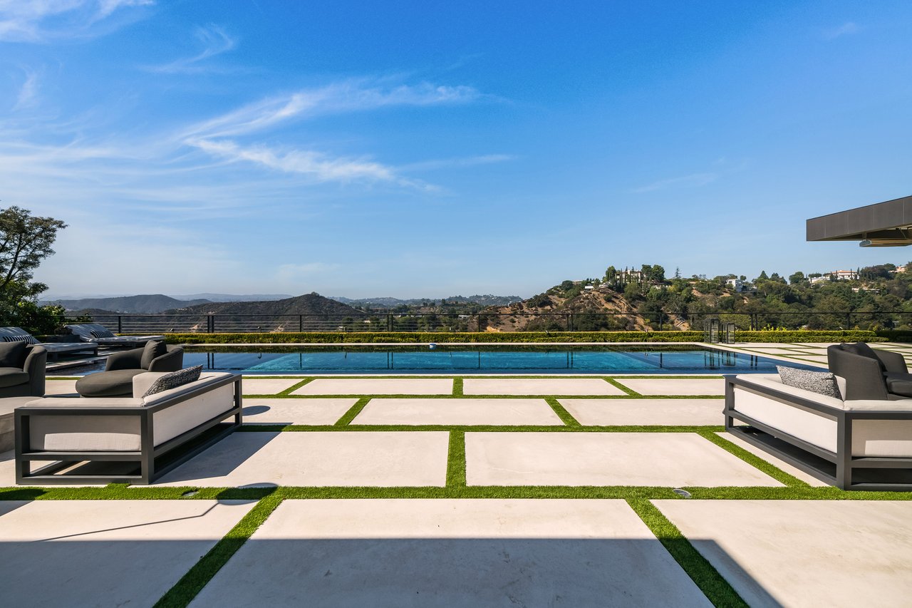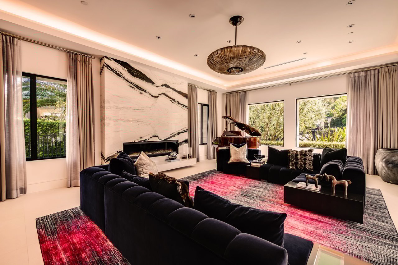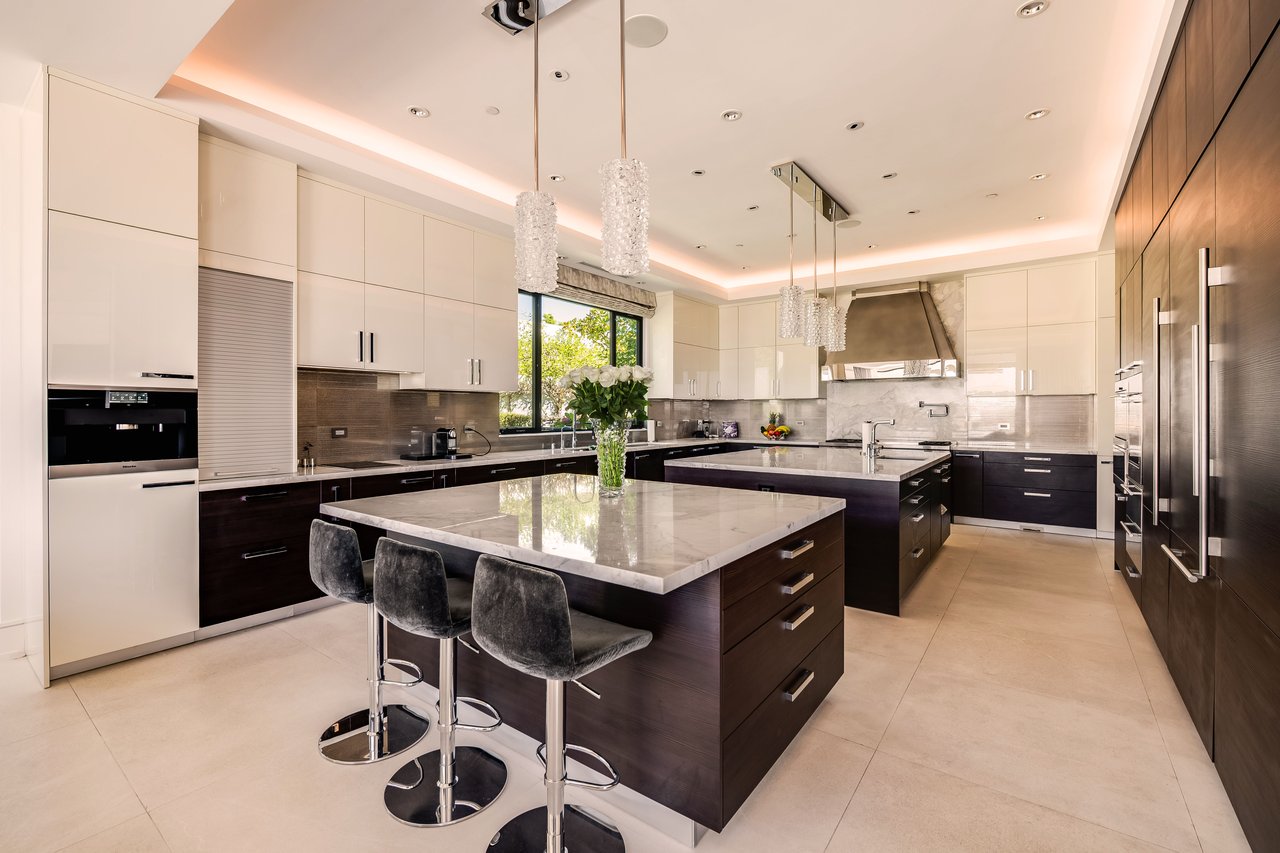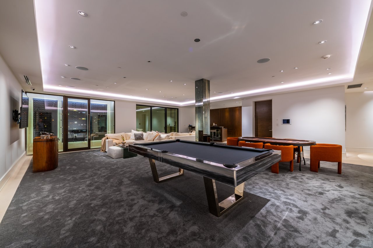 Nestled in the heart of the legendary Trousdale Estates of Beverly Hills, 565 Evelyn Place is a custom-built modern architectural triumph that fuses precision craftsmanship with warm livability. Completed in 2017, this residence was envisioned as a statement of timeless contemporary design sculpted lines, dramatic volumes, and a seamless indoor-outdoor flow that celebrates the Southern California lifestyle. From the moment you approach, the home commands attention. Expansive glass openings frame serene water features, while the landscape unfolds in a series of intimate gardens and gathering spaces. Inside, natural light pours through open volumes, highlighting a sophisticated materials palette of walnut, limestone, and custom Italian marbles. A state-of-the-art lighting program offers pre-set ambient scenes, while Conrad electric shades provide effortless privacy and control.At the center of the home is a breathtaking Poggenpohl kitchen, clad in rare Borghini Carrara marble and meticulously outfitted for both passionate cooks and professional entertaining. Two Miele dishwashers, three integrated refrigerators, a full 60-inch range with steamer oven, a built-in coffee system, and three sinks allow for seamless culinary preparation. A discreet butler's pantry and a fully equipped second kitchen downstairs support large-scale entertaining while preserving the kitchen's sculptural elegance. Every living space has been designed for both intimacy and spectacle. The home features three dramatic wet bars with ice makers, a library wrapped in hand-painted wallpaper and custom walnut millwork, and a series of lounges anchored by bespoke fireplaces some leathered marble, others sculpted from specialty stone. The floor plan opens effortlessly to lush gardens and resort-inspired outdoor living, where a full kitchen with BBQ, stovetop, and ice maker joins a fireplace, integrated heaters, and tranquil fountains. A separate courtside stone entertaining area invites long, sunlit afternoons and evenings under the stars. The primary suite is a private sanctuary, featuring walnut floors, dual steam showers, heated bathroom floors, and exquisitely detailed Italian marble baths. Thoughtful luxuries such as a dedicated suite refrigerator elevate comfort to the highest level. Throughout the home, technology quietly enhances everyday living with Crestron whole-house control of lighting, climate, sound, and security. Additional comforts include a central vacuum system, a private elevator, and a five-car garage finished with the same level of detail as the living spaces. A custom-designed gym completes the experience, while water features and curated landscaping lend a sense of tranquility and escape. Every detail of 565 Evelyn Place reflects a passion for design and an uncompromising standard of craftsmanship. This is more than a home, it is a modern estate built for those who value artistry, innovation, and the enduring prestige of one of Beverly Hills' most sought-after enclaves.
