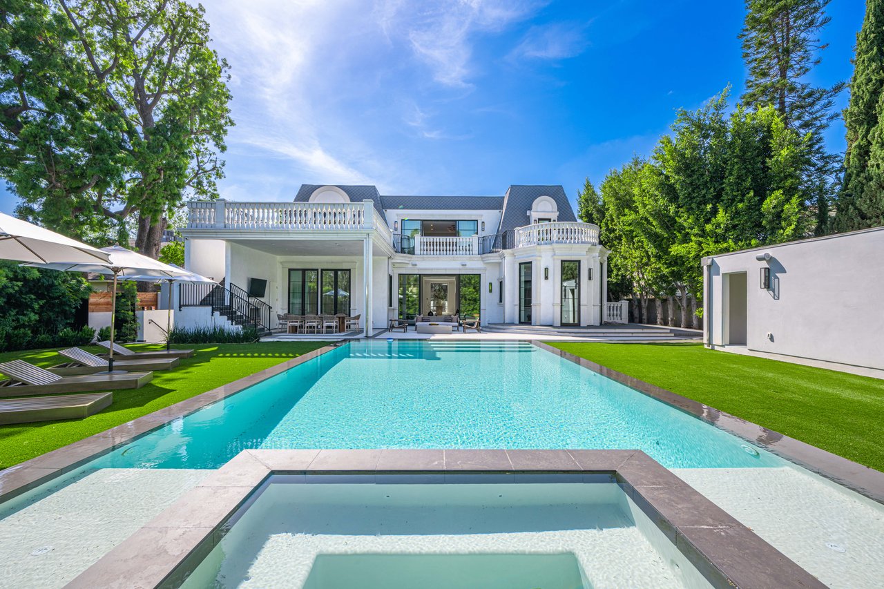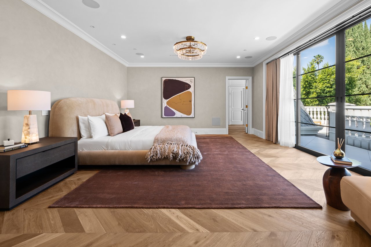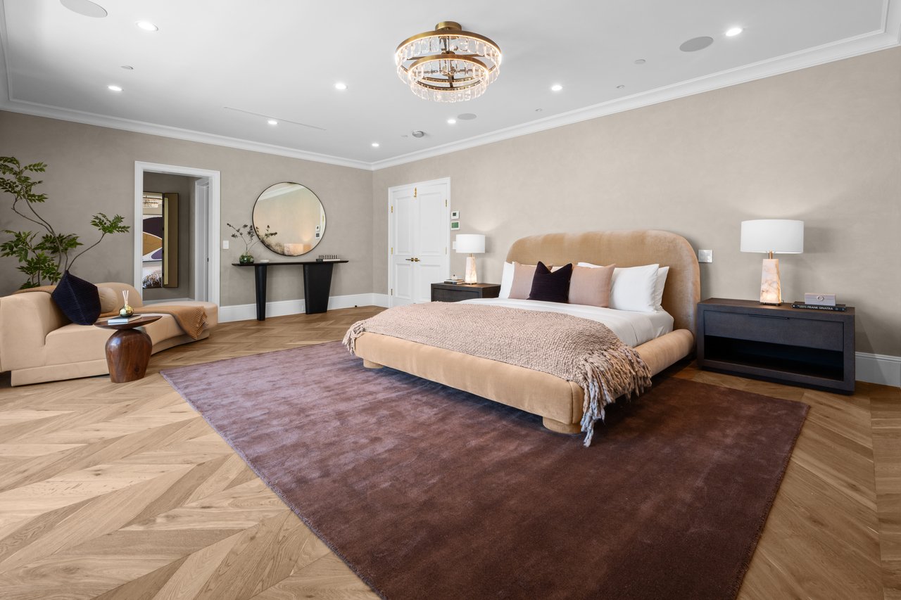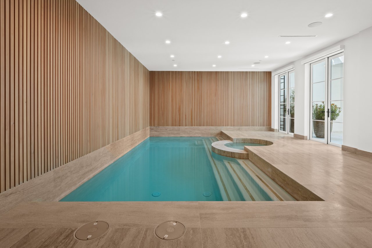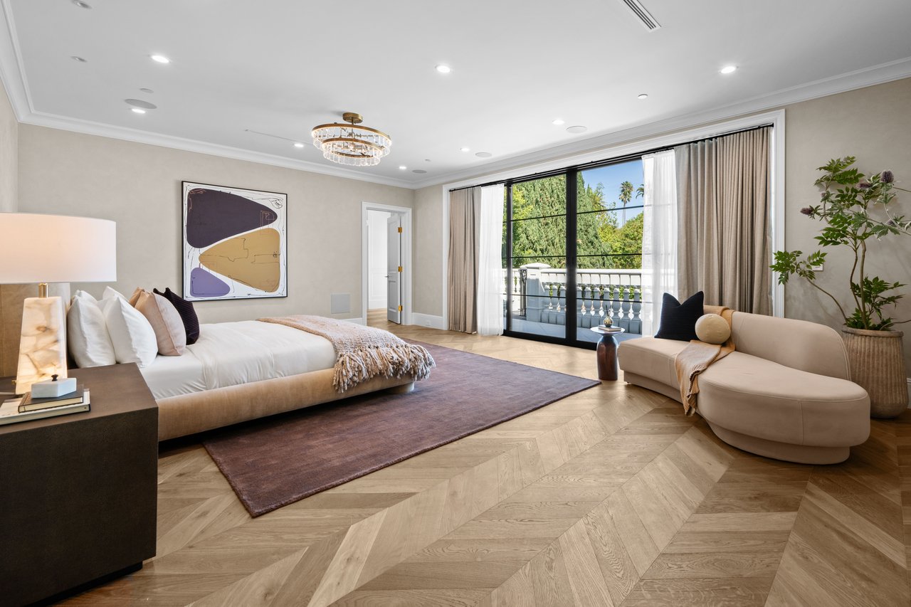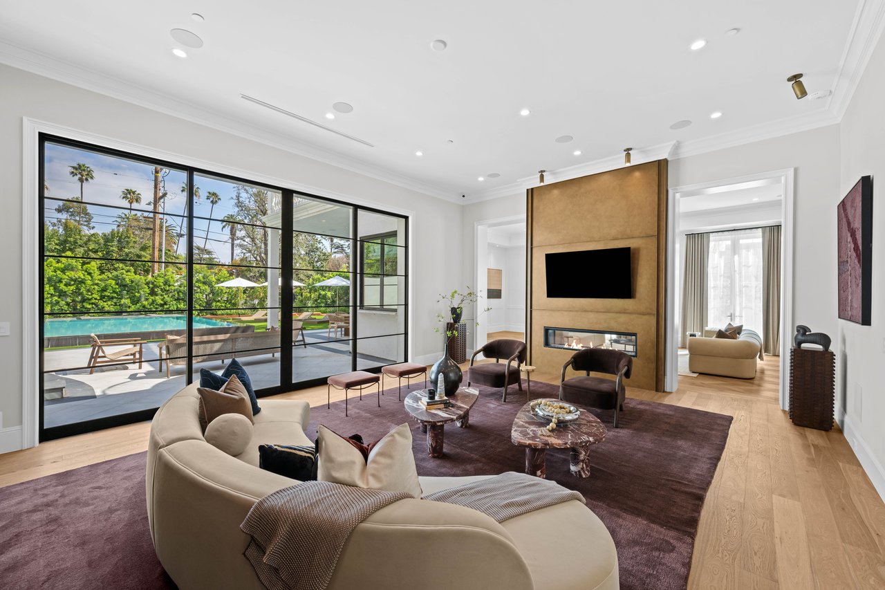 Newly built and fully furnished, this extraordinary Beverly Hills estate spans over 14,000 square feet across three levels, offering 8 bedrooms, 12 bathrooms, a private elevator, and a gated subterranean 10-car garage. A dramatic bridge entry creates a striking sense of arrival, while also allowing natural light to cascade into the lower level below. Defined by architectural elegance and exceptional custom craftsmanship, the home features select white oak flooring, Venetian plaster walls, bespoke lighting, a grand staircase, and a dramatic skylight. The formal dining room and showpiece kitchen are finished in exquisite Calacatta Viola stone, with the kitchen further appointed with Sub-Zero refrigeration, Wolf appliances, a Waterstone faucet, and custom cabinetry throughout. Thoughtfully designed for both refined entertaining and comfortable daily living, the residence includes a formal living room with bar, a den with a see-through fireplace, a richly finished paneled office, theater, and expansive lower-level entertainment spaces. All eight bedrooms offer en-suite baths and closets, including a stunning primary suite with dual bathrooms, dual walk-in closets, and a large private patio. Outdoors, a beautifully symmetrical infinity pool and jacuzzi align with the home’s central axis, complemented by an outdoor fireplace and beautifully designed terraces. With a second pool and jacuzzi on the lower level, curated furnishings, original art, and bespoke finishes throughout, this is a rare offering of scale, warmth, and modern luxury in one of Beverly Hills’ most coveted settings.