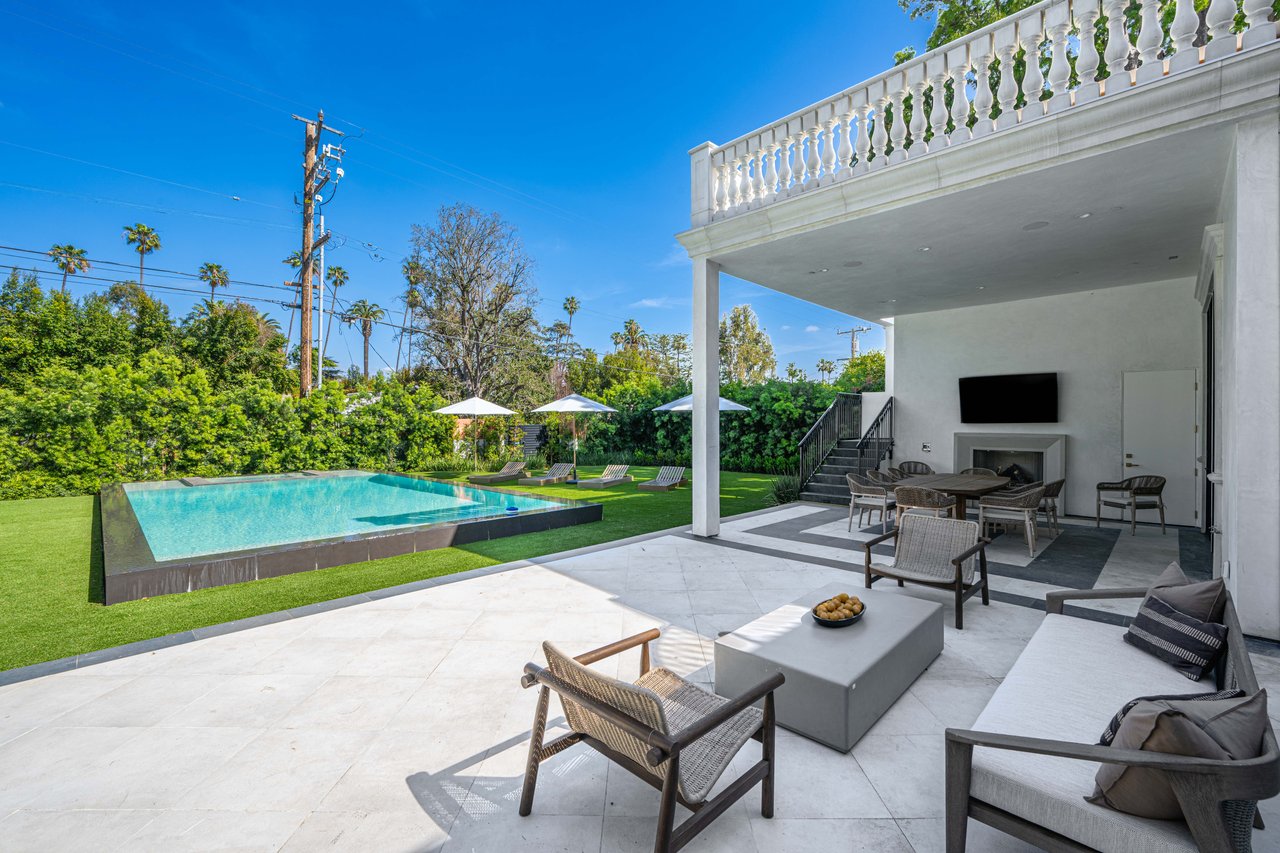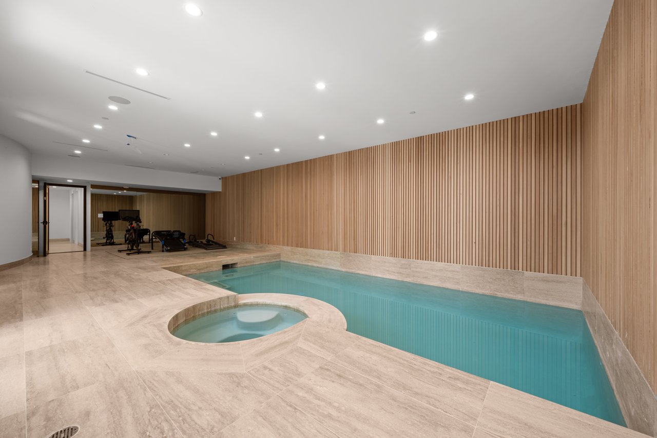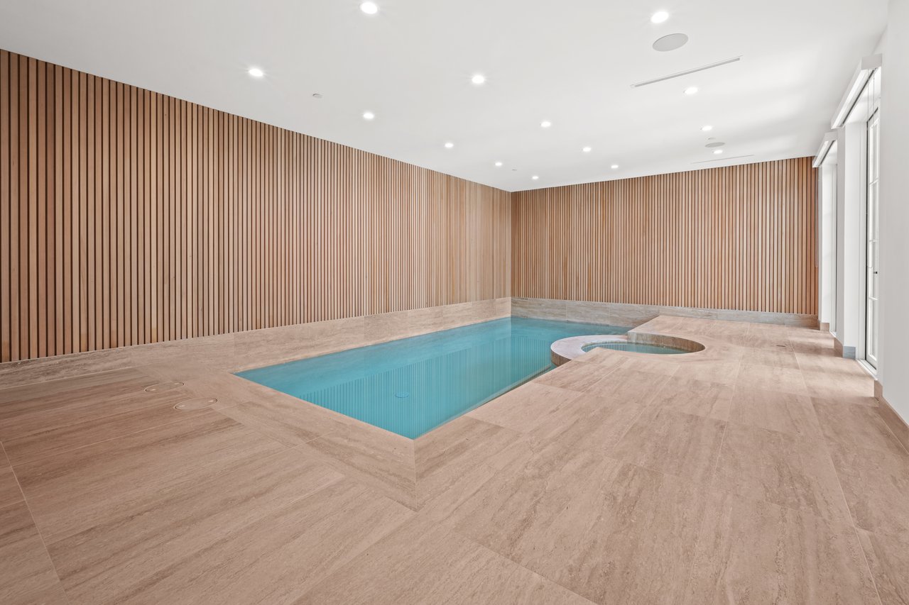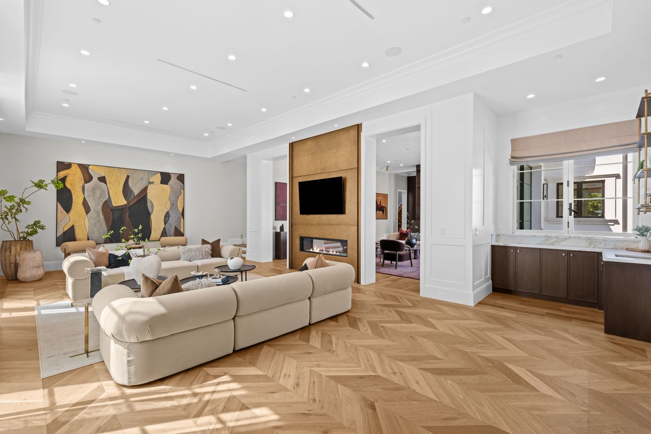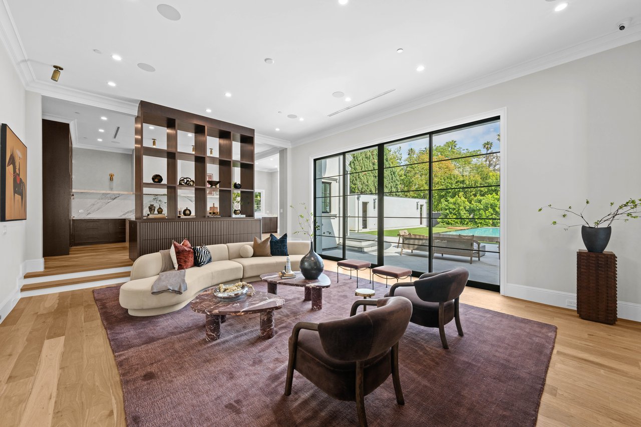 Newly built and fully furnished, this extraordinary Beverly Hills estate spans over 14,000 square feet across three levels, offering 8 bedrooms, 12 bathrooms, a private elevator, and a gated subterranean 10-car garage. A dramatic bridge entry creates a striking sense of arrival, while also allowing natural light to cascade into the lower level below. Defined by architectural elegance and exceptional custom craftsmanship, the home features select white oak flooring, Venetian plaster walls, bespoke lighting, a grand staircase, and a dramatic skylight. The formal dining room and showpiece kitchen are finished in exquisite Calacatta Viola stone, with the kitchen further appointed with Sub-Zero refrigeration, Wolf appliances, a Waterstone faucet, and custom cabinetry throughout. Thoughtfully designed for both refined entertaining and comfortable daily living, the residence includes a formal living room with bar, a den with a see-through fireplace, a richly finished paneled office, theater, and expansive lower-level entertainment spaces. All eight bedrooms offer en-suite baths and closets, including a stunning primary suite with dual bathrooms, dual walk-in closets, and a large private patio. Outdoors, a beautifully symmetrical infinity pool and jacuzzi align with the home’s central axis, complemented by an outdoor fireplace and beautifully designed terraces. With a second pool and jacuzzi on the lower level, curated furnishings, original art, and bespoke finishes throughout, this is a rare offering of scale, warmth, and modern luxury in one of Beverly Hills’ most coveted settings.