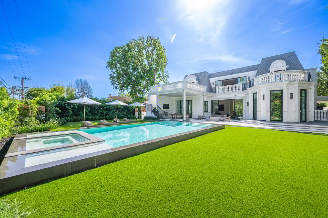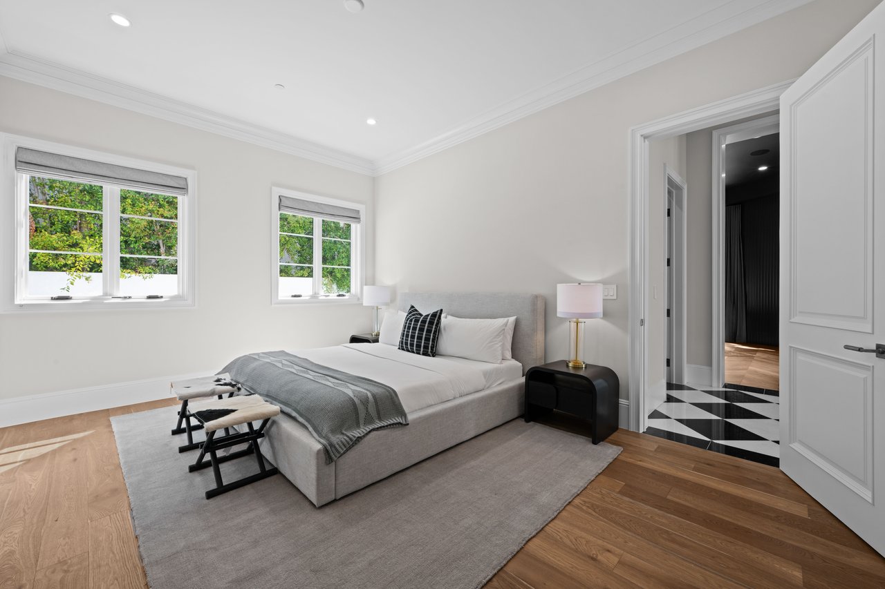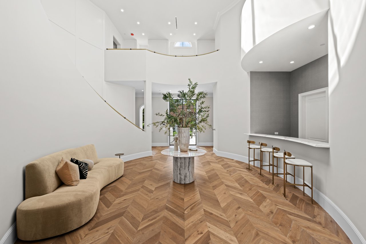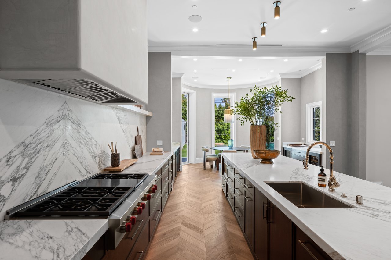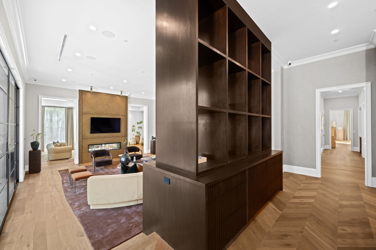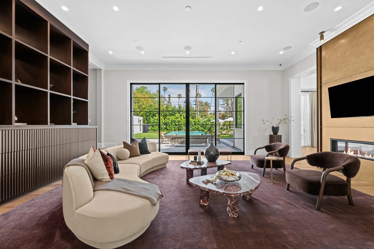 Newly built and fully furnished, this extraordinary Beverly Hills estate spans over 14,000 square feet across three levels, offering 8 bedrooms, 12 bathrooms, a private elevator, and a gated subterranean 10-car garage. A dramatic bridge entry creates a striking sense of arrival, while also allowing natural light to cascade into the lower level below. Defined by architectural elegance and exceptional custom craftsmanship, the home features select white oak flooring, Venetian plaster walls, bespoke lighting, a grand staircase, and a dramatic skylight. The formal dining room and showpiece kitchen are finished in exquisite Calacatta Viola stone, with the kitchen further appointed with Sub-Zero refrigeration, Wolf appliances, a Waterstone faucet, and custom cabinetry throughout. Thoughtfully designed for both refined entertaining and comfortable daily living, the residence includes a formal living room with bar, a den with a see-through fireplace, a richly finished paneled office, theater, and expansive lower-level entertainment spaces. All eight bedrooms offer en-suite baths and closets, including a stunning primary suite with dual bathrooms, dual walk-in closets, and a large private patio. Outdoors, a beautifully symmetrical infinity pool and jacuzzi align with the home’s central axis, complemented by an outdoor fireplace and beautifully designed terraces. With a second pool and jacuzzi on the lower level, curated furnishings, original art, and bespoke finishes throughout, this is a rare offering of scale, warmth, and modern luxury in one of Beverly Hills’ most coveted settings.