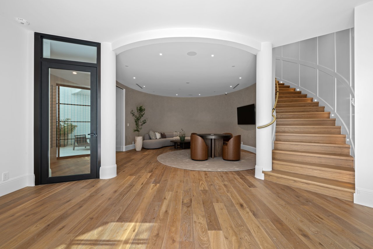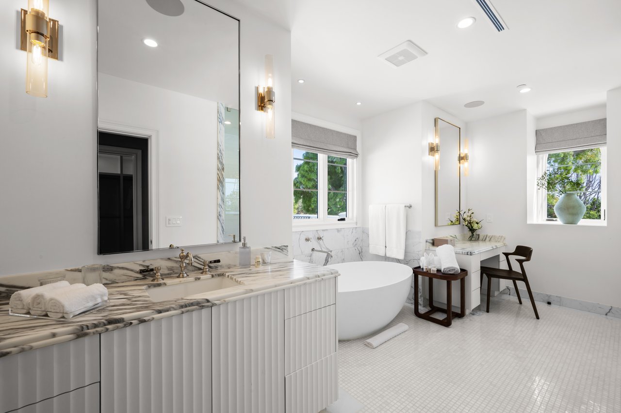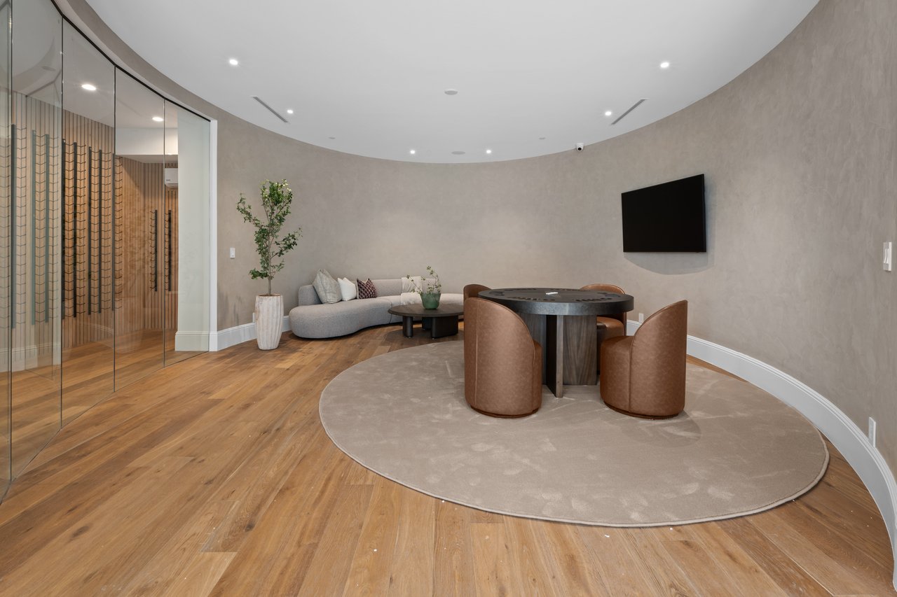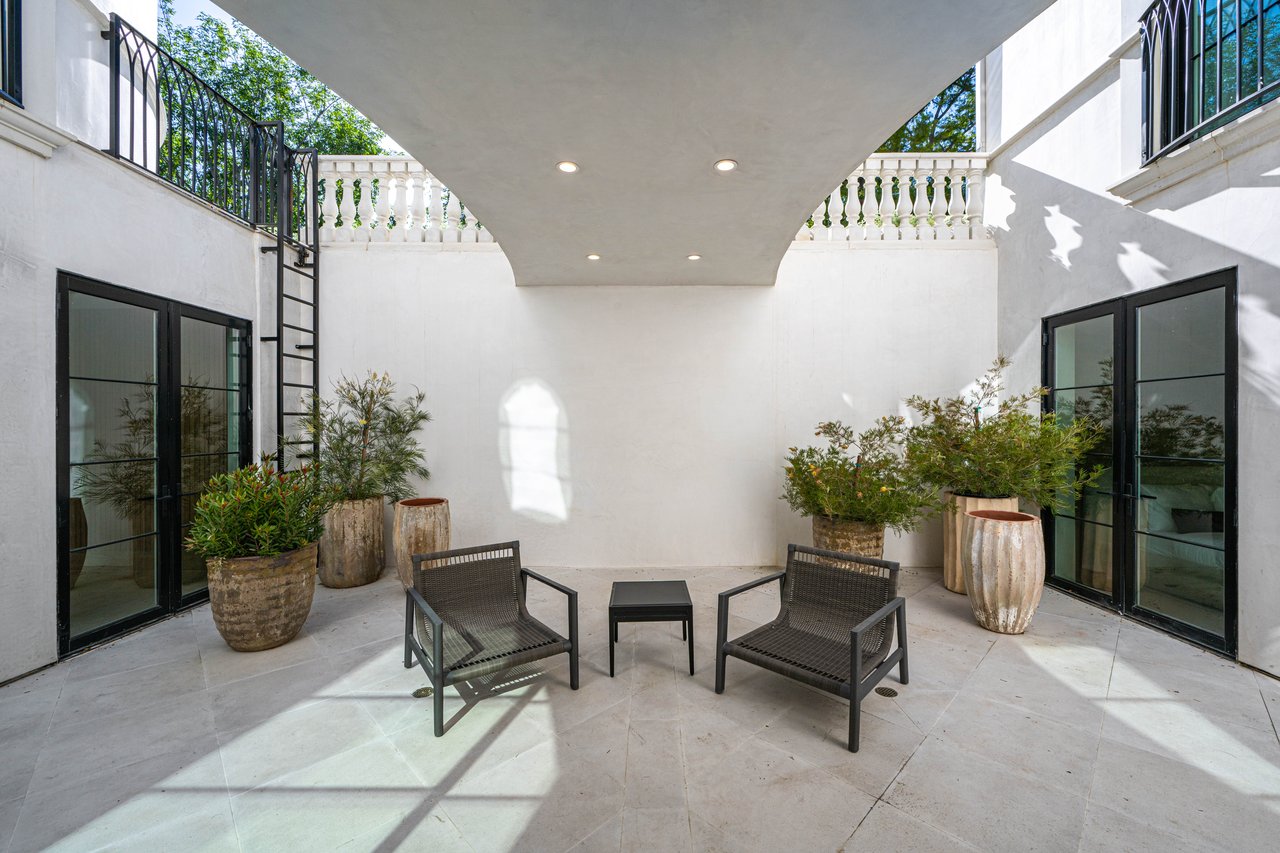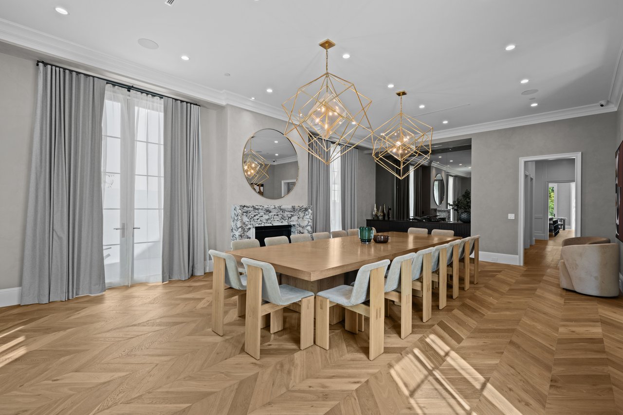 Newly built and fully furnished, this extraordinary Beverly Hills estate spans over 14,000 square feet across three levels, offering 8 bedrooms, 12 bathrooms, a private elevator, and a gated subterranean 10-car garage. A dramatic bridge entry creates a striking sense of arrival, while also allowing natural light to cascade into the lower level below. Defined by architectural elegance and exceptional custom craftsmanship, the home features select white oak flooring, Venetian plaster walls, bespoke lighting, a grand staircase, and a dramatic skylight. The formal dining room and showpiece kitchen are finished in exquisite Calacatta Viola stone, with the kitchen further appointed with Sub-Zero refrigeration, Wolf appliances, a Waterstone faucet, and custom cabinetry throughout. Thoughtfully designed for both refined entertaining and comfortable daily living, the residence includes a formal living room with bar, a den with a see-through fireplace, a richly finished paneled office, theater, and expansive lower-level entertainment spaces. All eight bedrooms offer en-suite baths and closets, including a stunning primary suite with dual bathrooms, dual walk-in closets, and a large private patio. Outdoors, a beautifully symmetrical infinity pool and jacuzzi align with the home’s central axis, complemented by an outdoor fireplace and beautifully designed terraces. With a second pool and jacuzzi on the lower level, curated furnishings, original art, and bespoke finishes throughout, this is a rare offering of scale, warmth, and modern luxury in one of Beverly Hills’ most coveted settings.