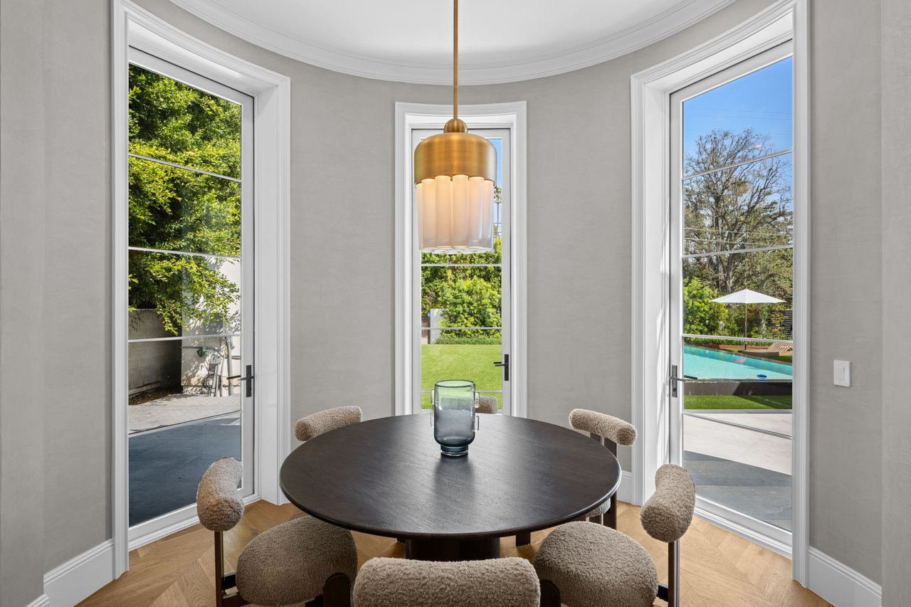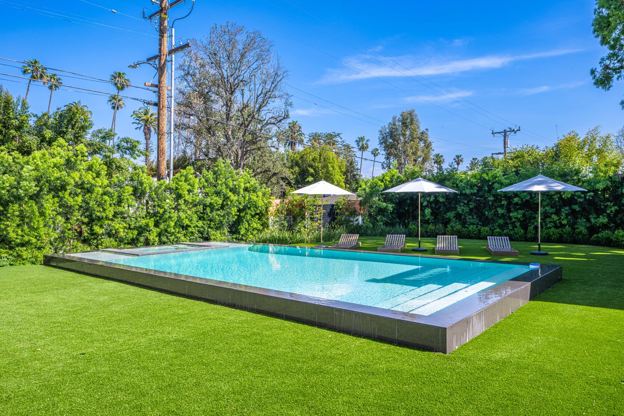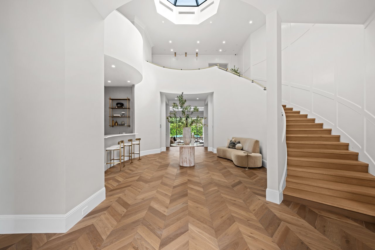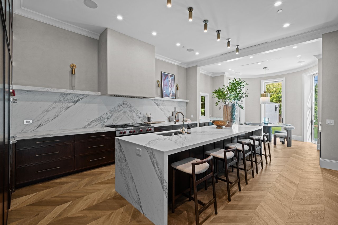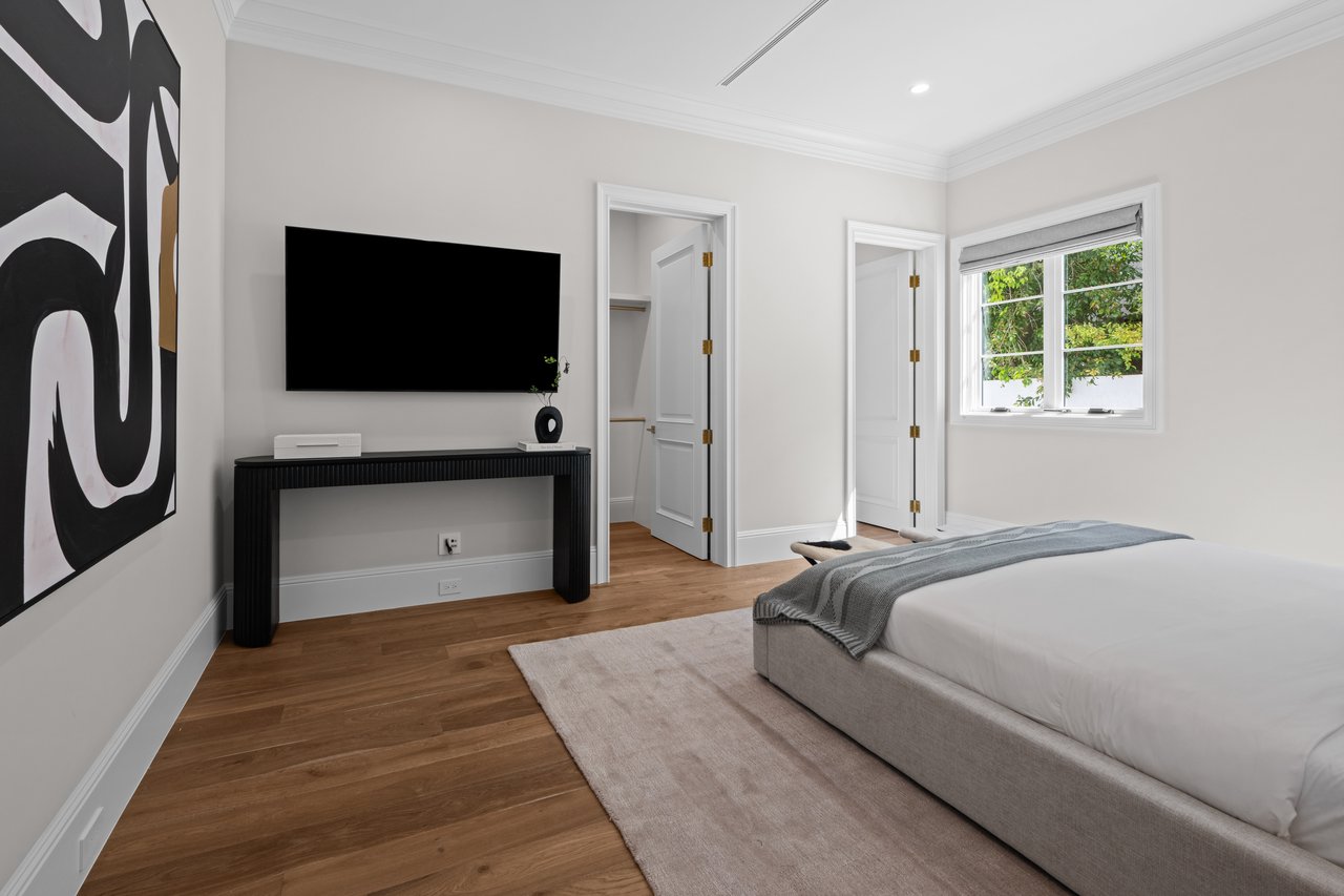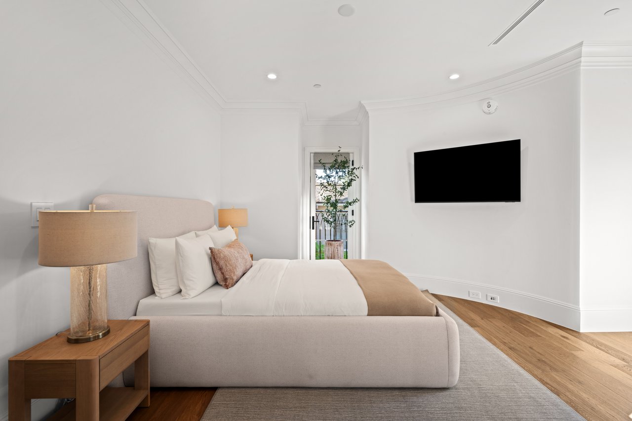 Newly built and fully furnished, this extraordinary Beverly Hills estate spans over 14,000 square feet across three levels, offering 8 bedrooms, 12 bathrooms, a private elevator, and a gated subterranean 10-car garage. A dramatic bridge entry creates a striking sense of arrival, while also allowing natural light to cascade into the lower level below. Defined by architectural elegance and exceptional custom craftsmanship, the home features select white oak flooring, Venetian plaster walls, bespoke lighting, a grand staircase, and a dramatic skylight. The formal dining room and showpiece kitchen are finished in exquisite Calacatta Viola stone, with the kitchen further appointed with Sub-Zero refrigeration, Wolf appliances, a Waterstone faucet, and custom cabinetry throughout. Thoughtfully designed for both refined entertaining and comfortable daily living, the residence includes a formal living room with bar, a den with a see-through fireplace, a richly finished paneled office, theater, and expansive lower-level entertainment spaces. All eight bedrooms offer en-suite baths and closets, including a stunning primary suite with dual bathrooms, dual walk-in closets, and a large private patio. Outdoors, a beautifully symmetrical infinity pool and jacuzzi align with the home’s central axis, complemented by an outdoor fireplace and beautifully designed terraces. With a second pool and jacuzzi on the lower level, curated furnishings, original art, and bespoke finishes throughout, this is a rare offering of scale, warmth, and modern luxury in one of Beverly Hills’ most coveted settings.